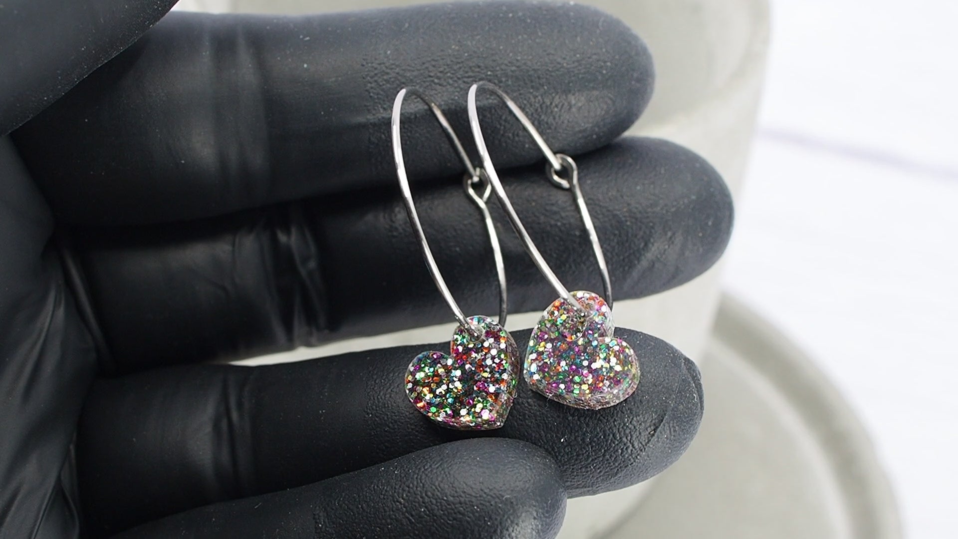 Acrylic mixed glitter heart dangles.