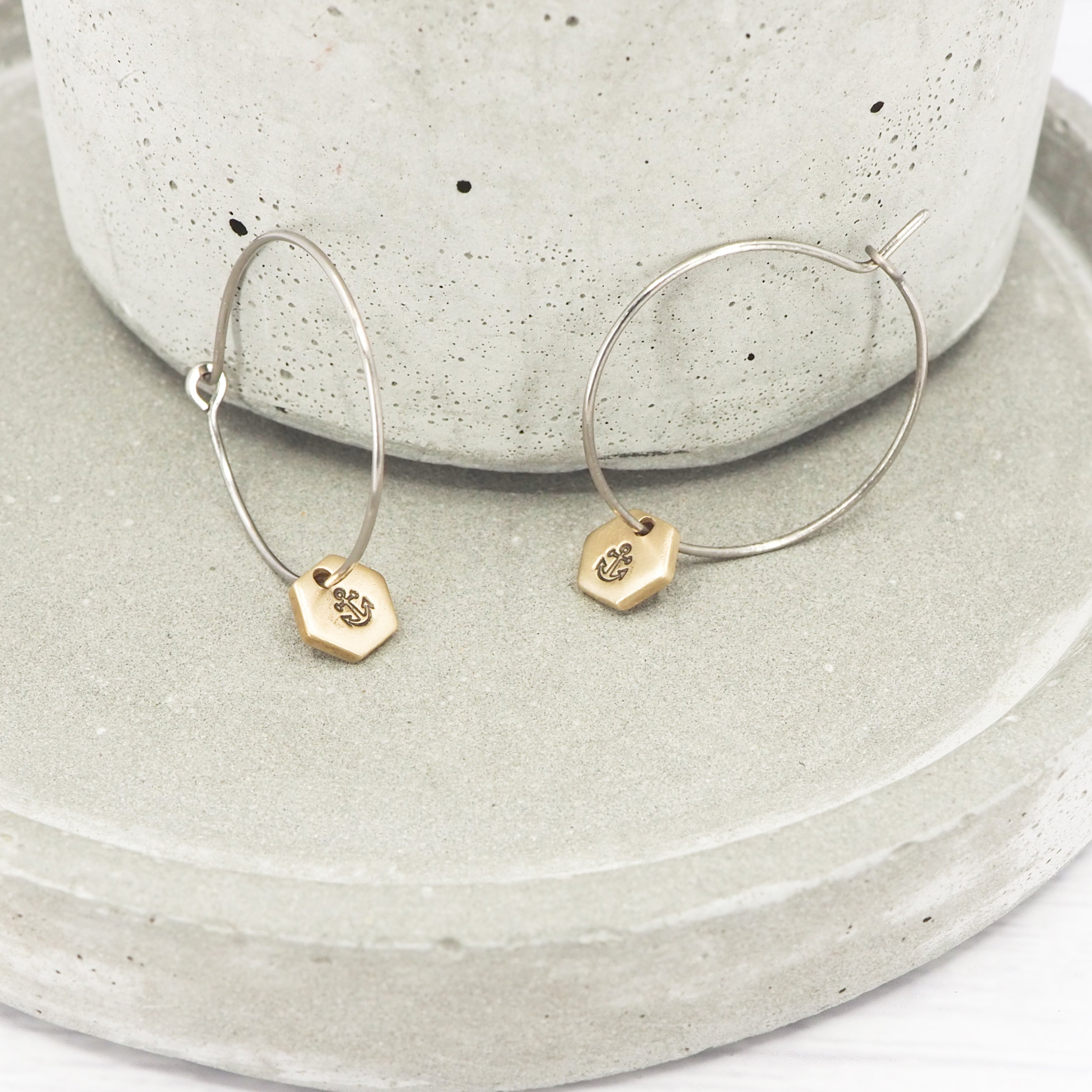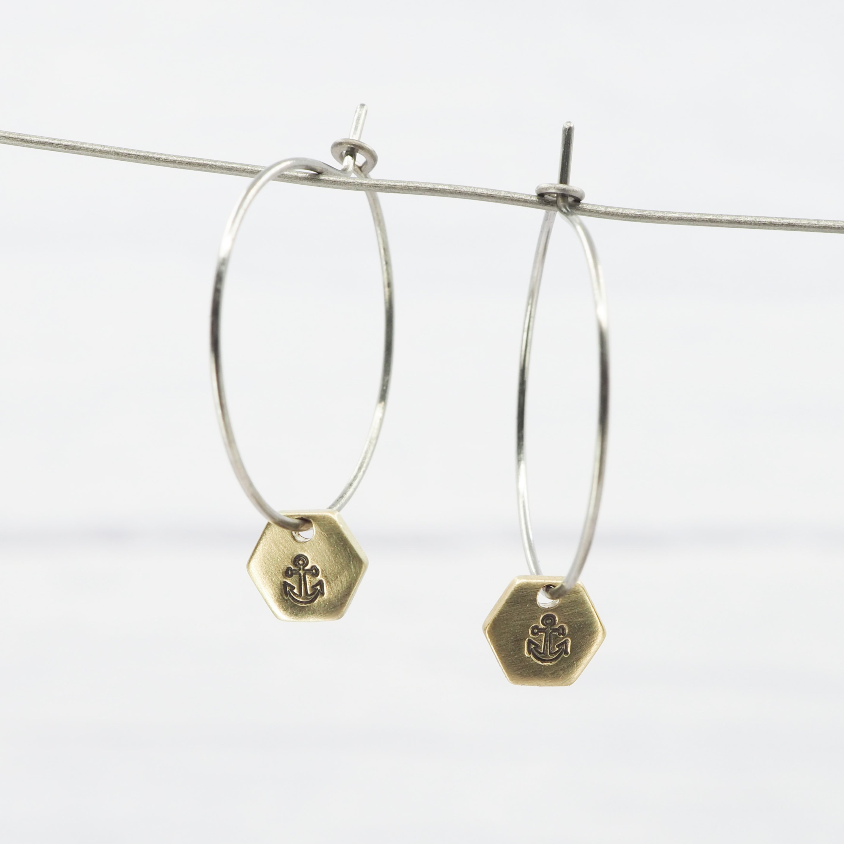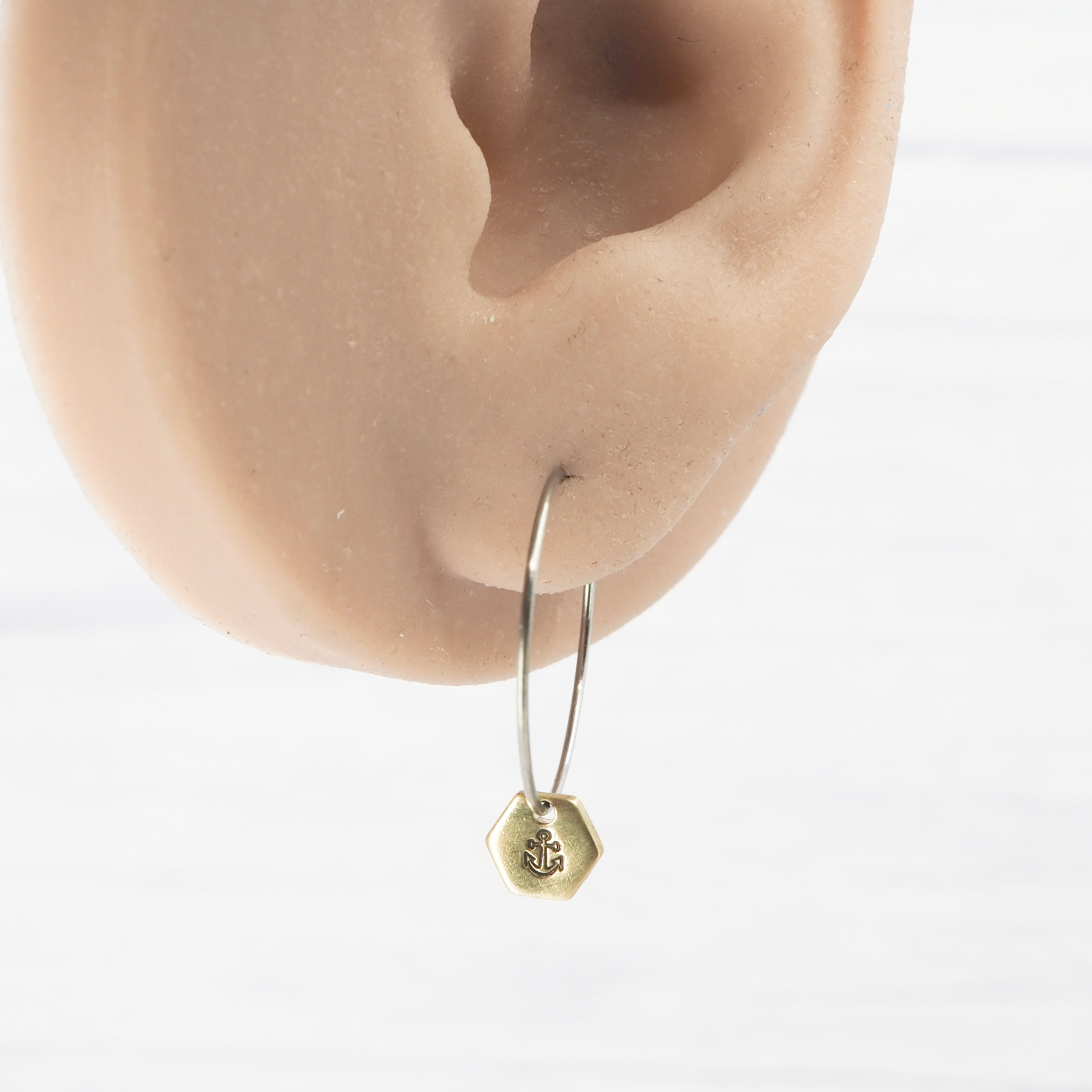 Brass hexagon charm, Anchor stamp dangle 1-inch hoop earrings.