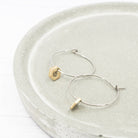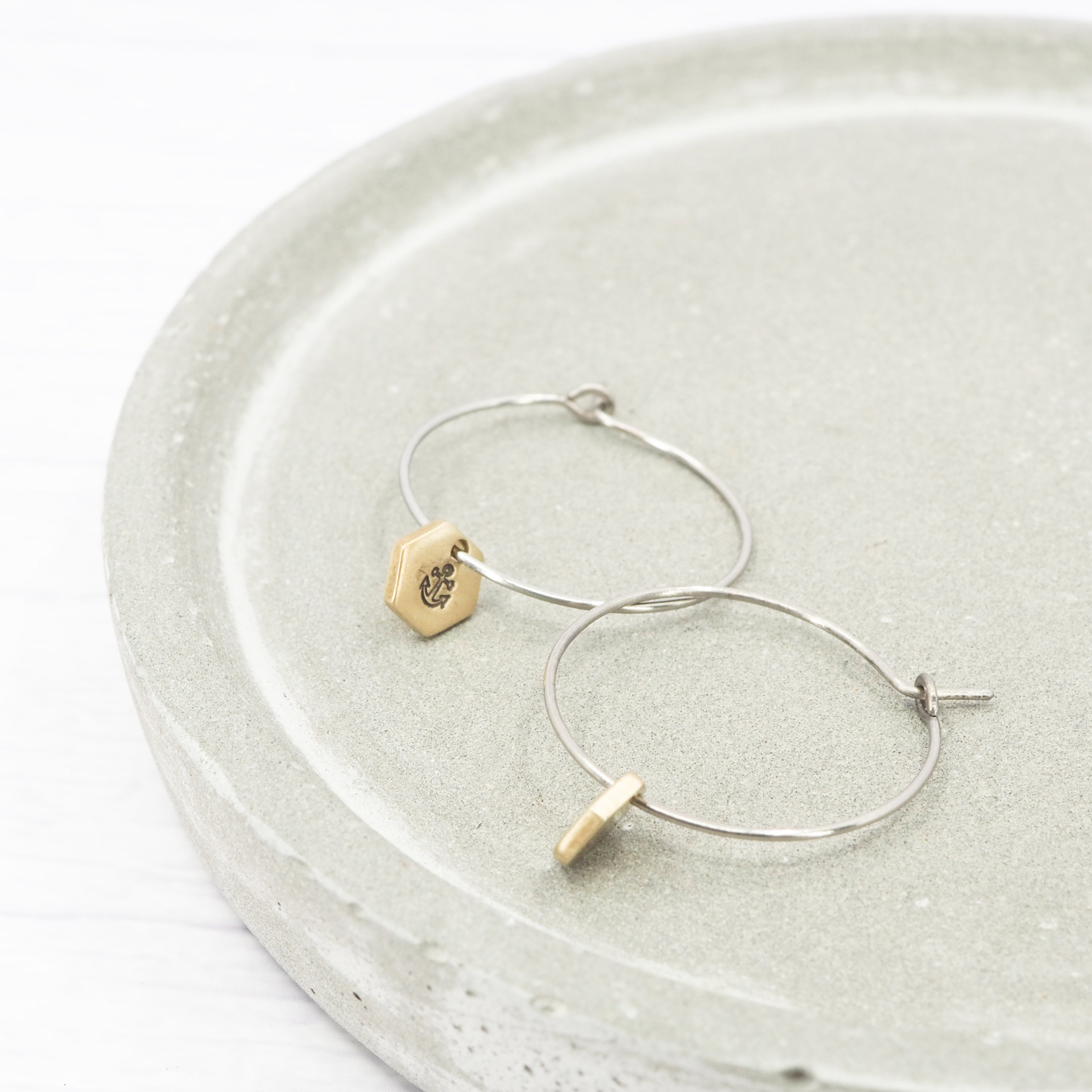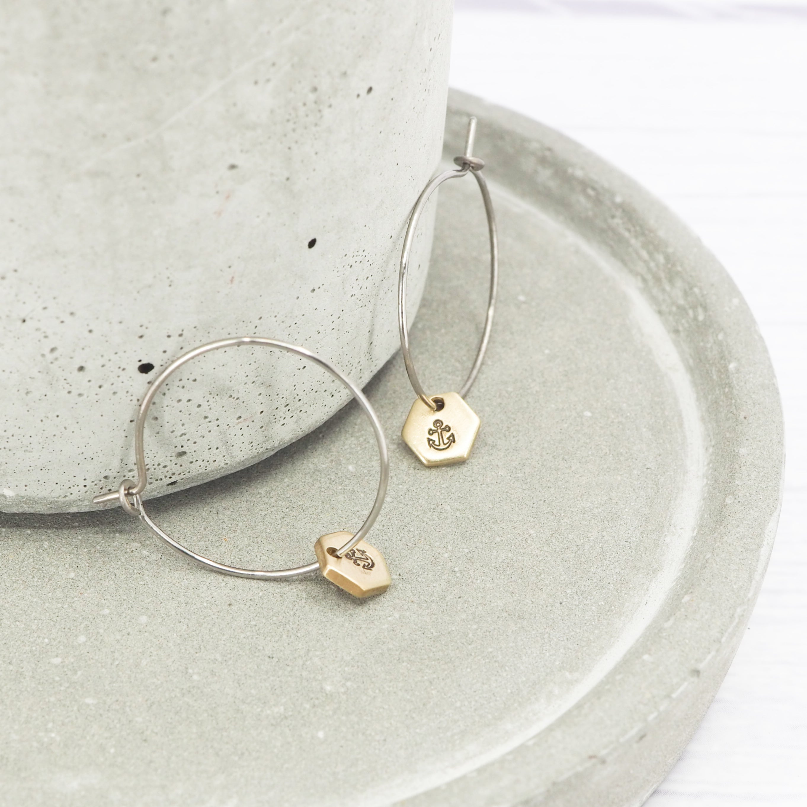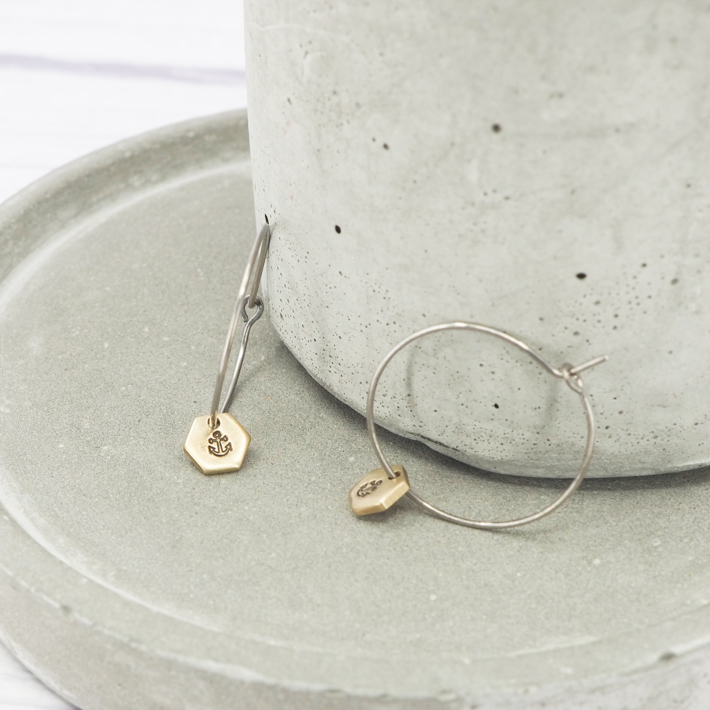 Brass hexagon charm, Anchor stamp dangle 1-inch hoop earrings.