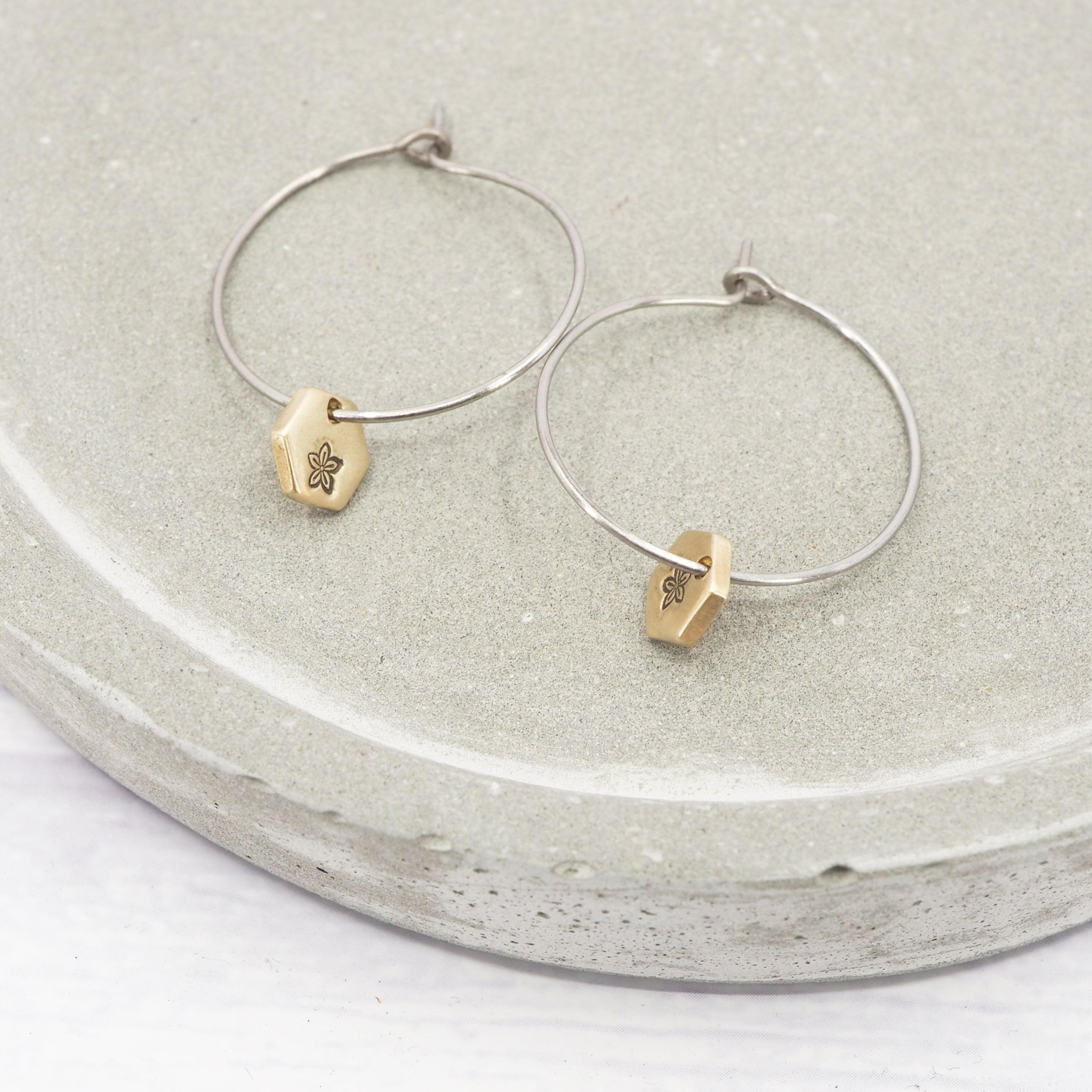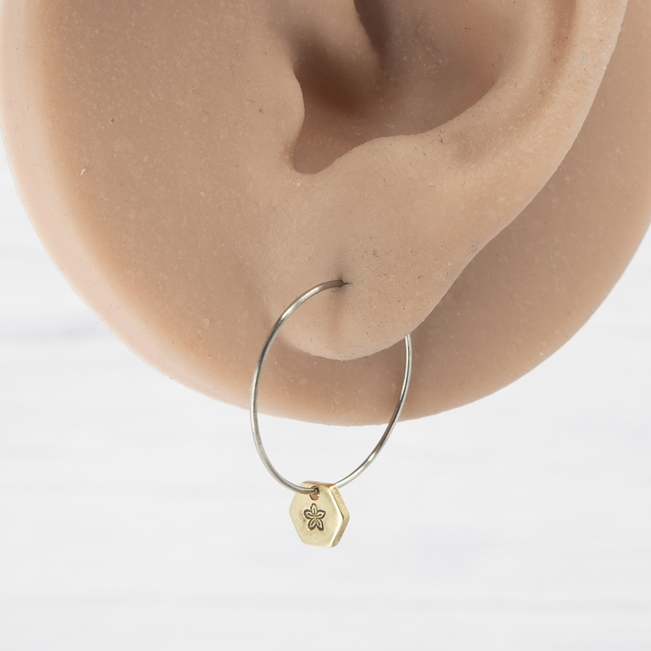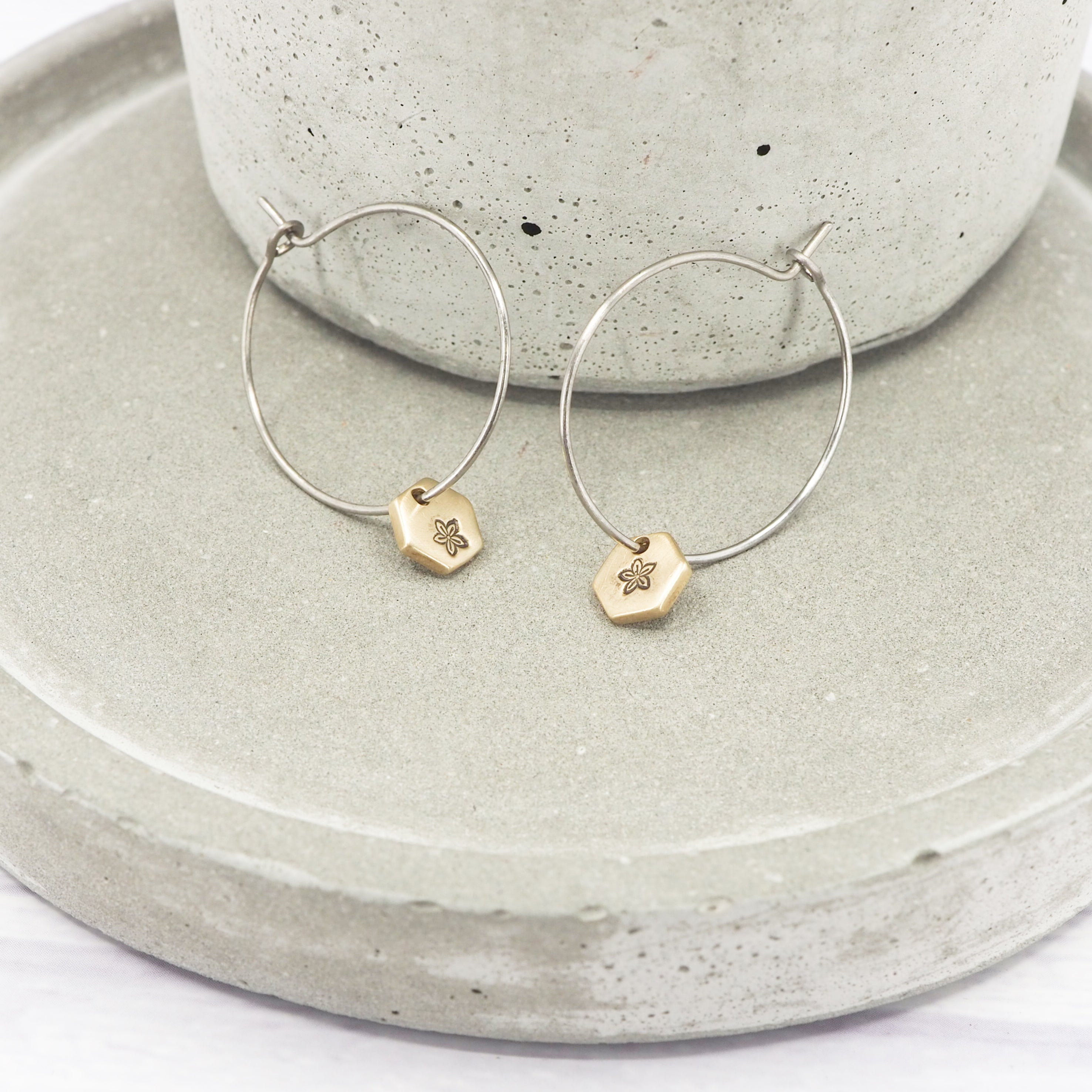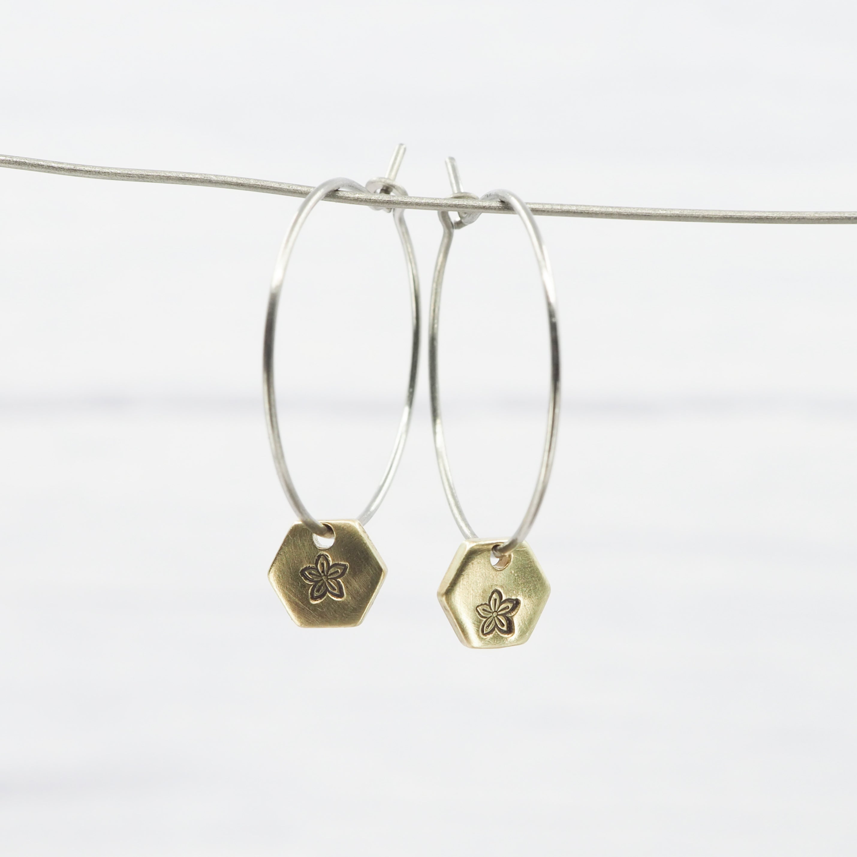 Brass hexagon charm, Flower stamp dangle 1-inch hoop earrings.