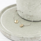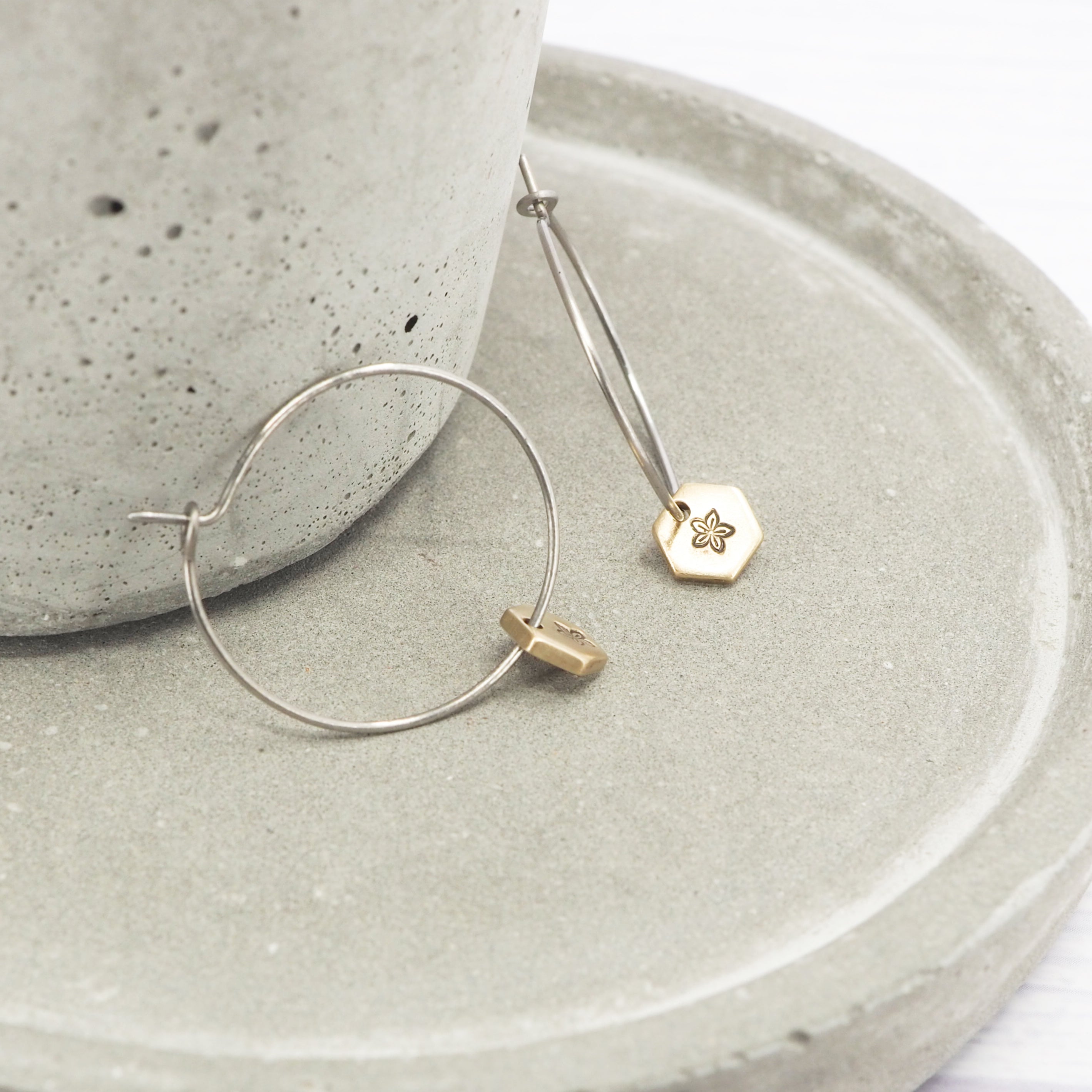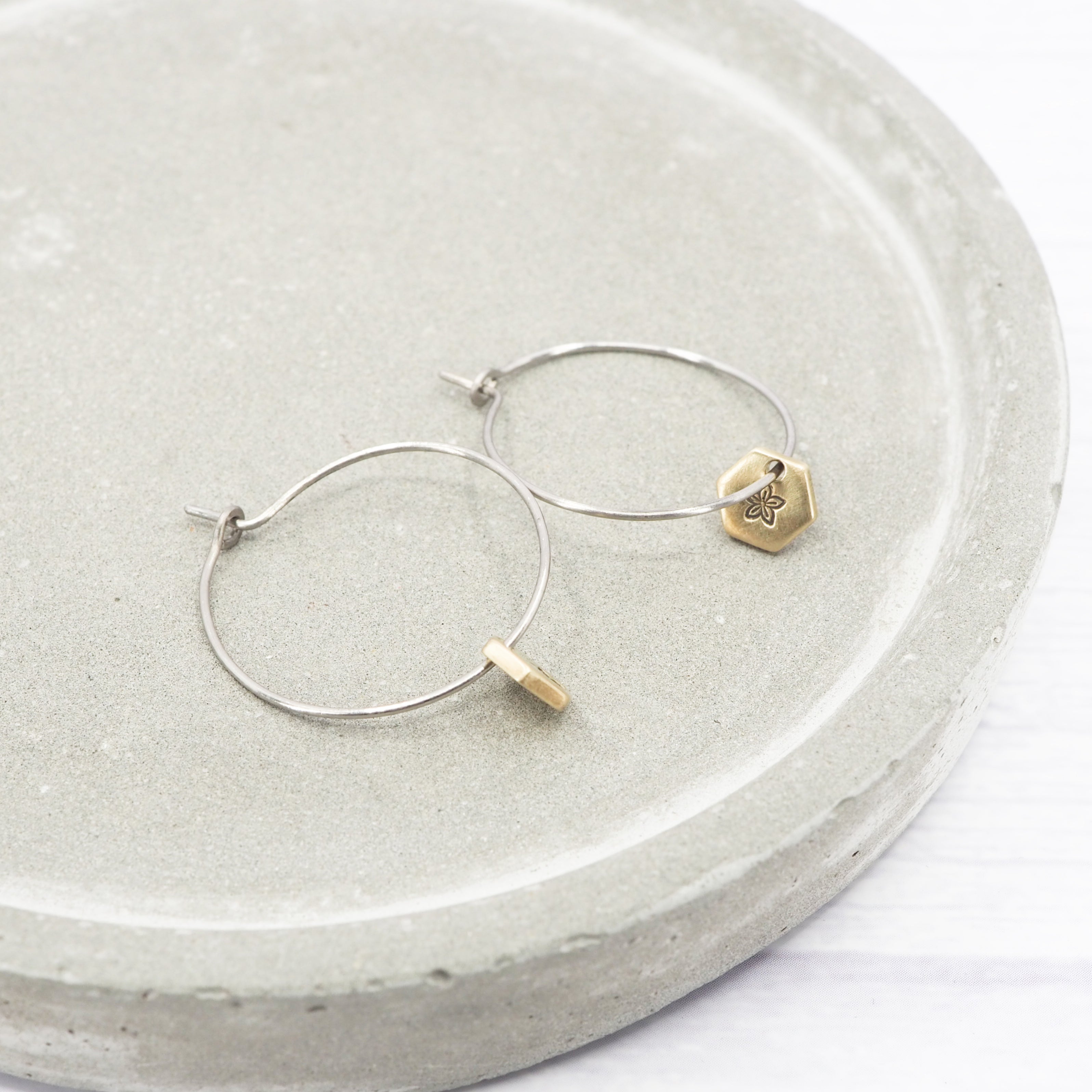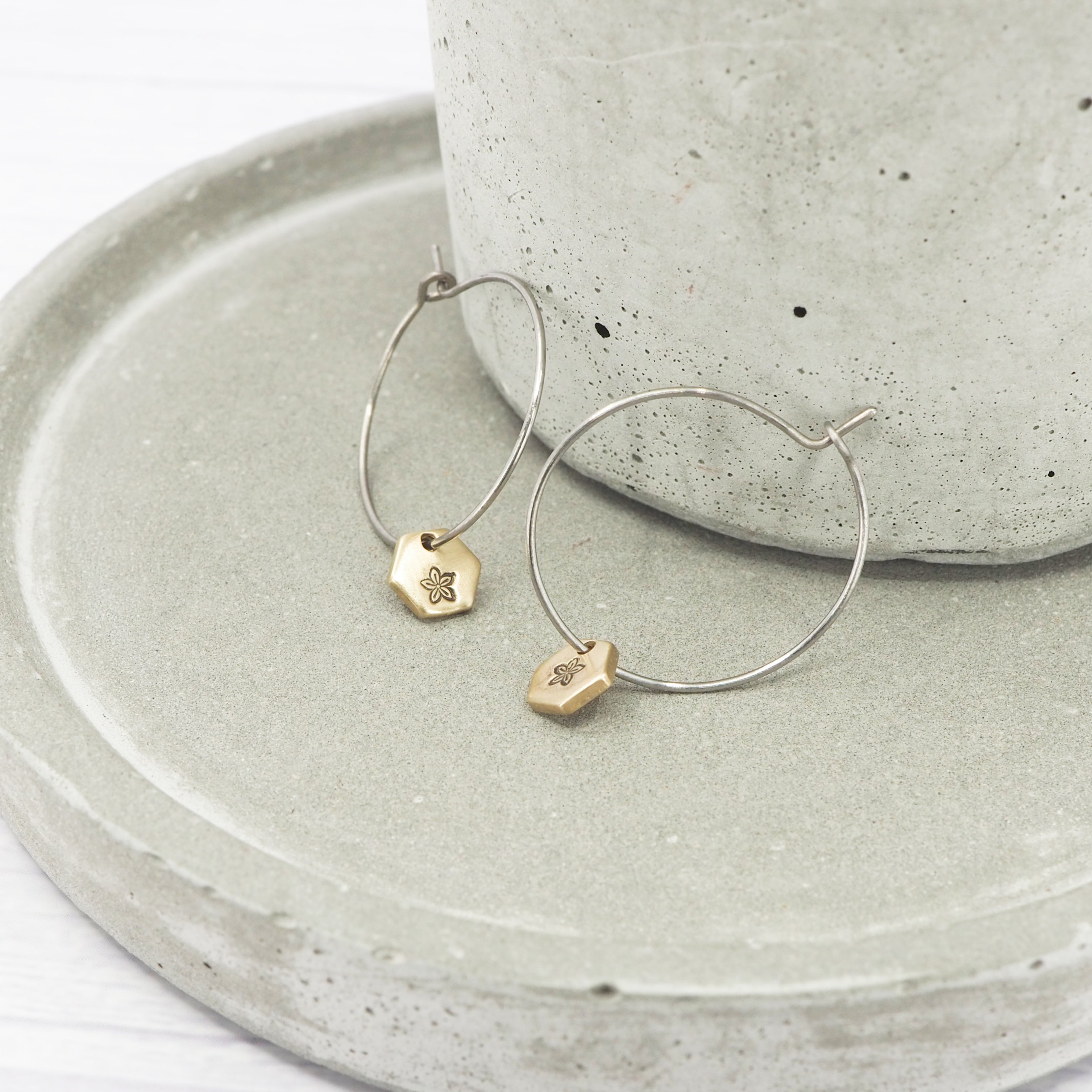 Brass hexagon charm, Flower stamp dangle 1-inch hoop earrings.