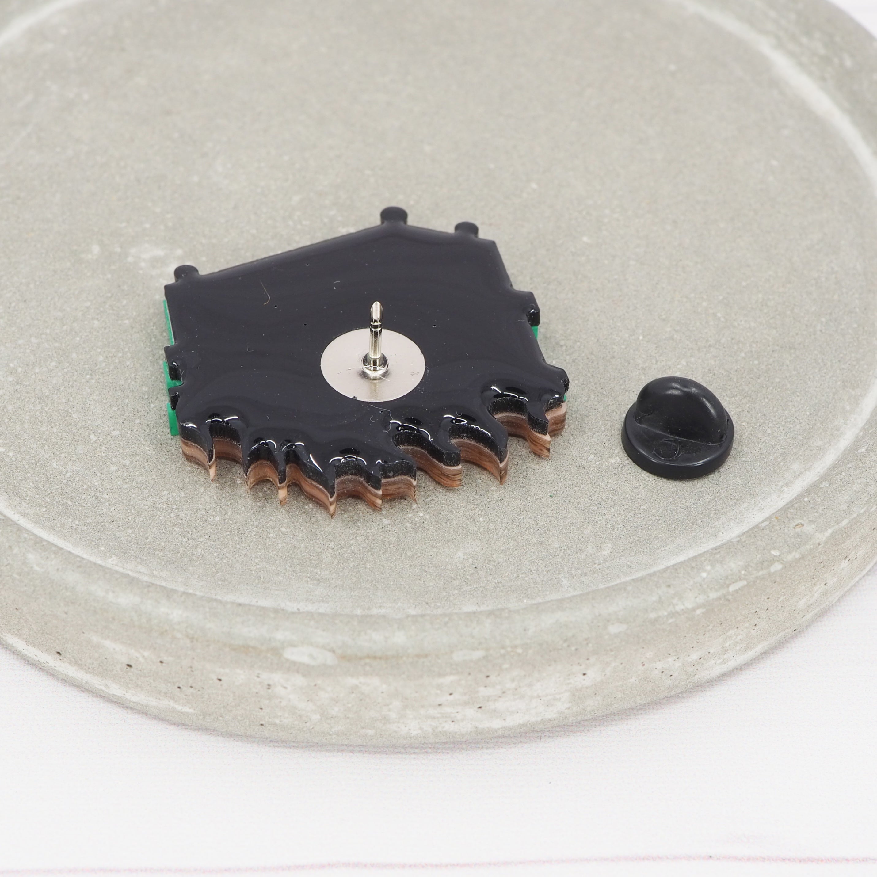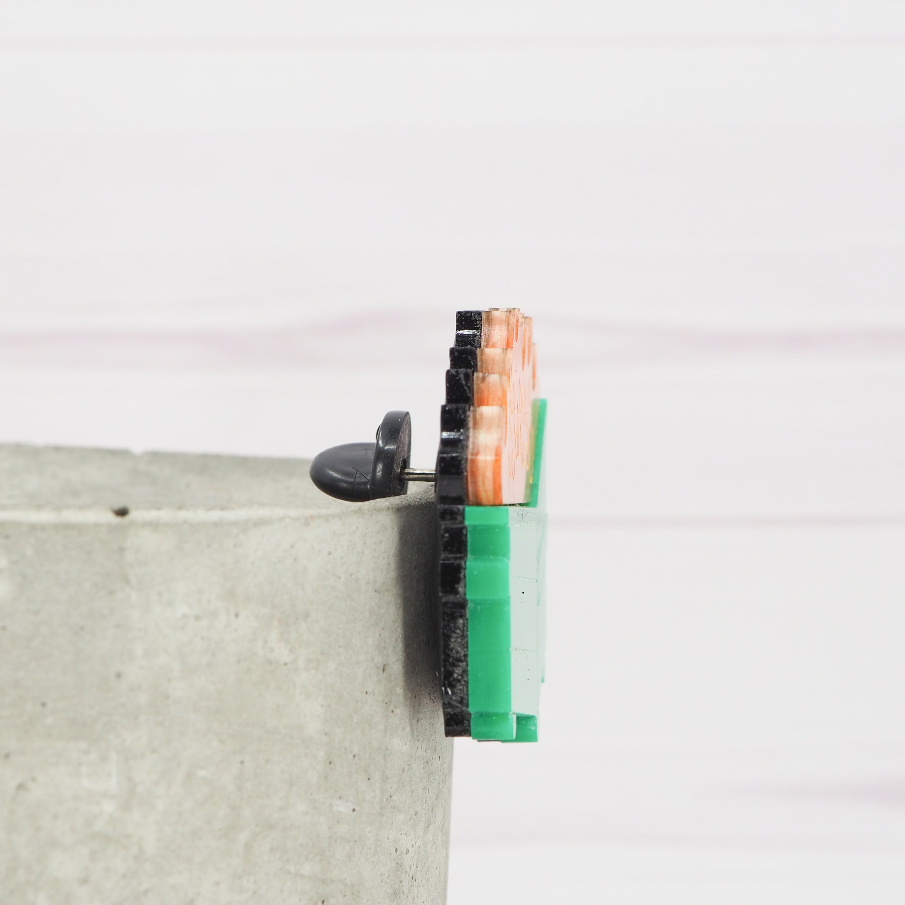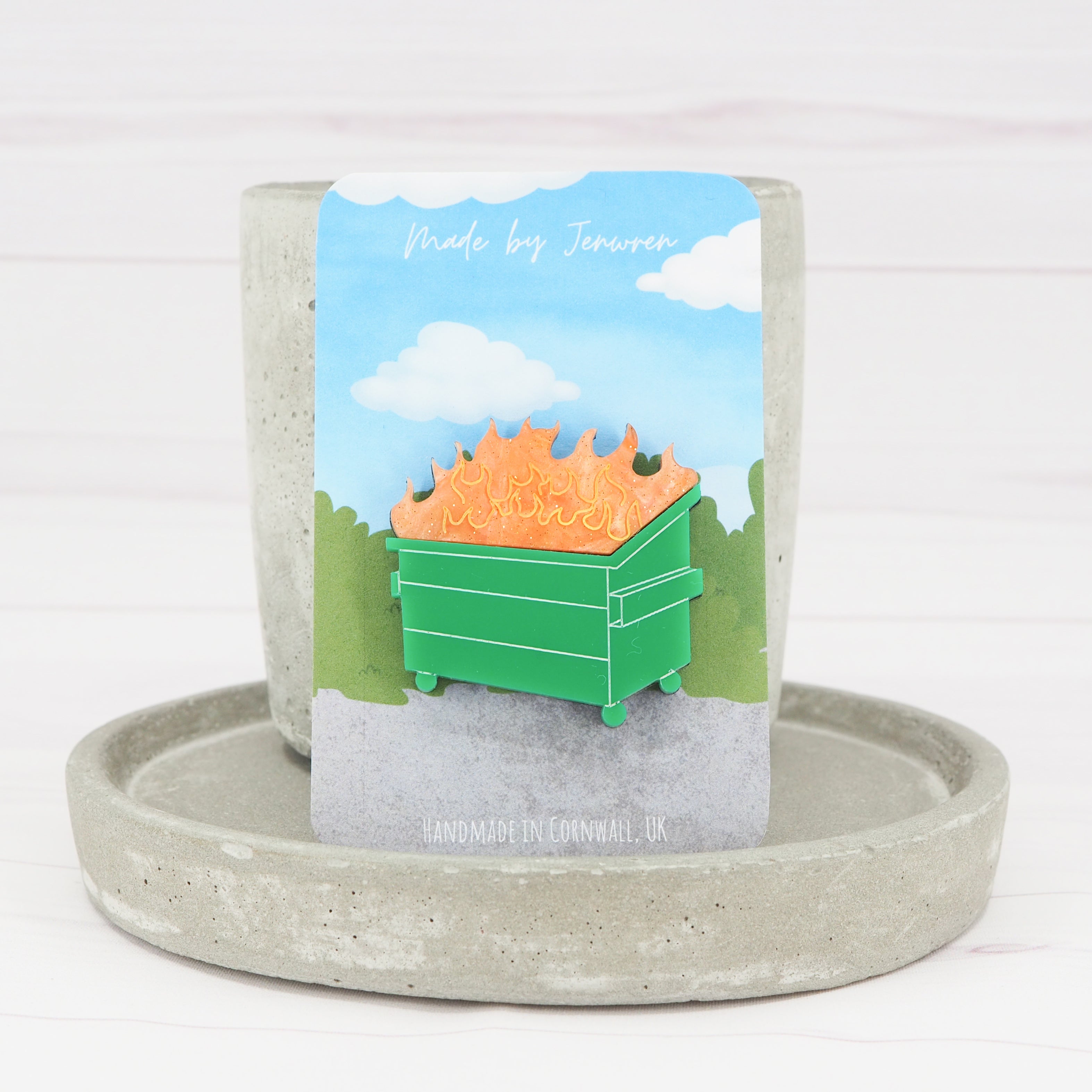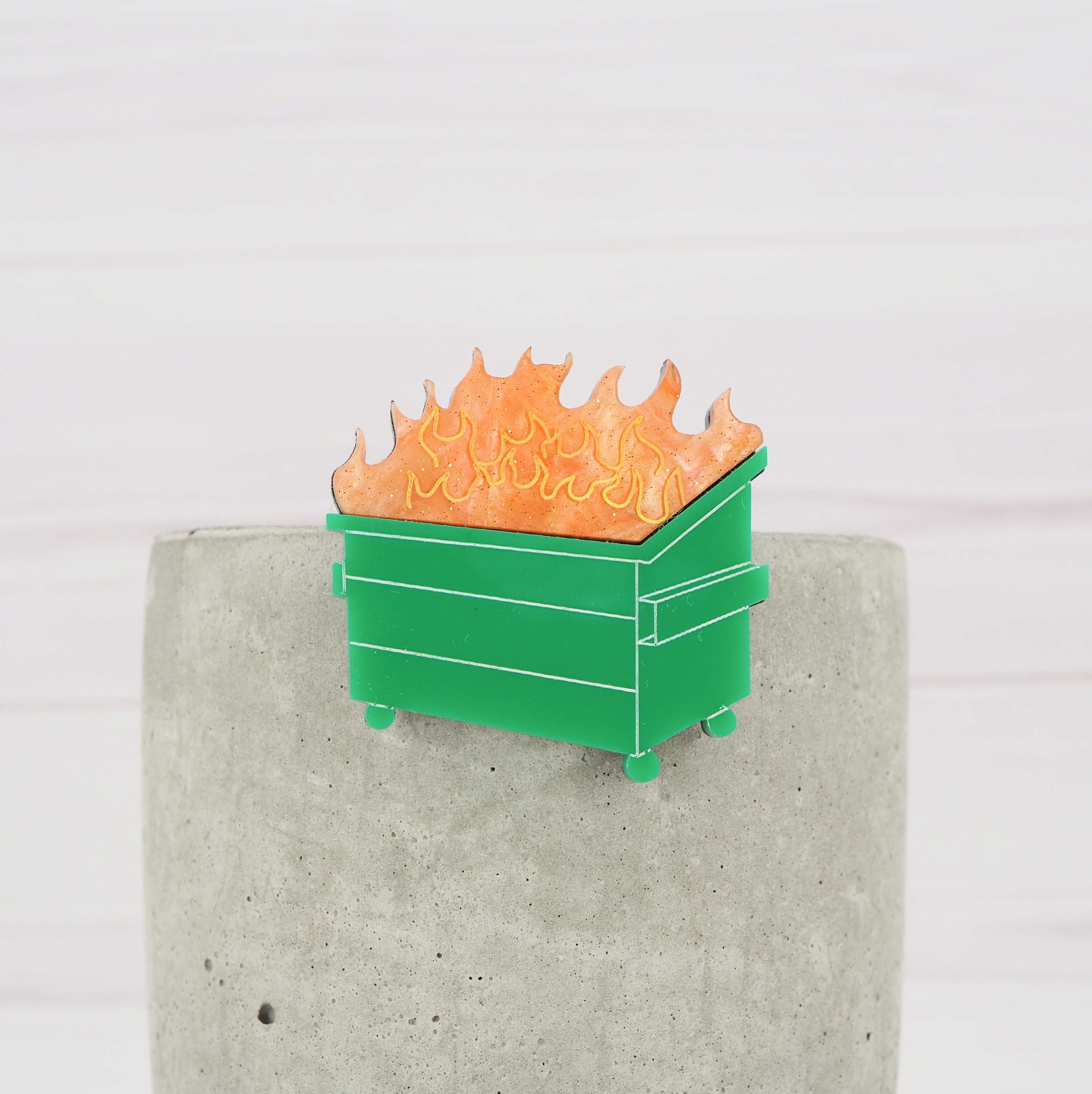 Green and Orange galaxy acrylic dumpster fire brooch.