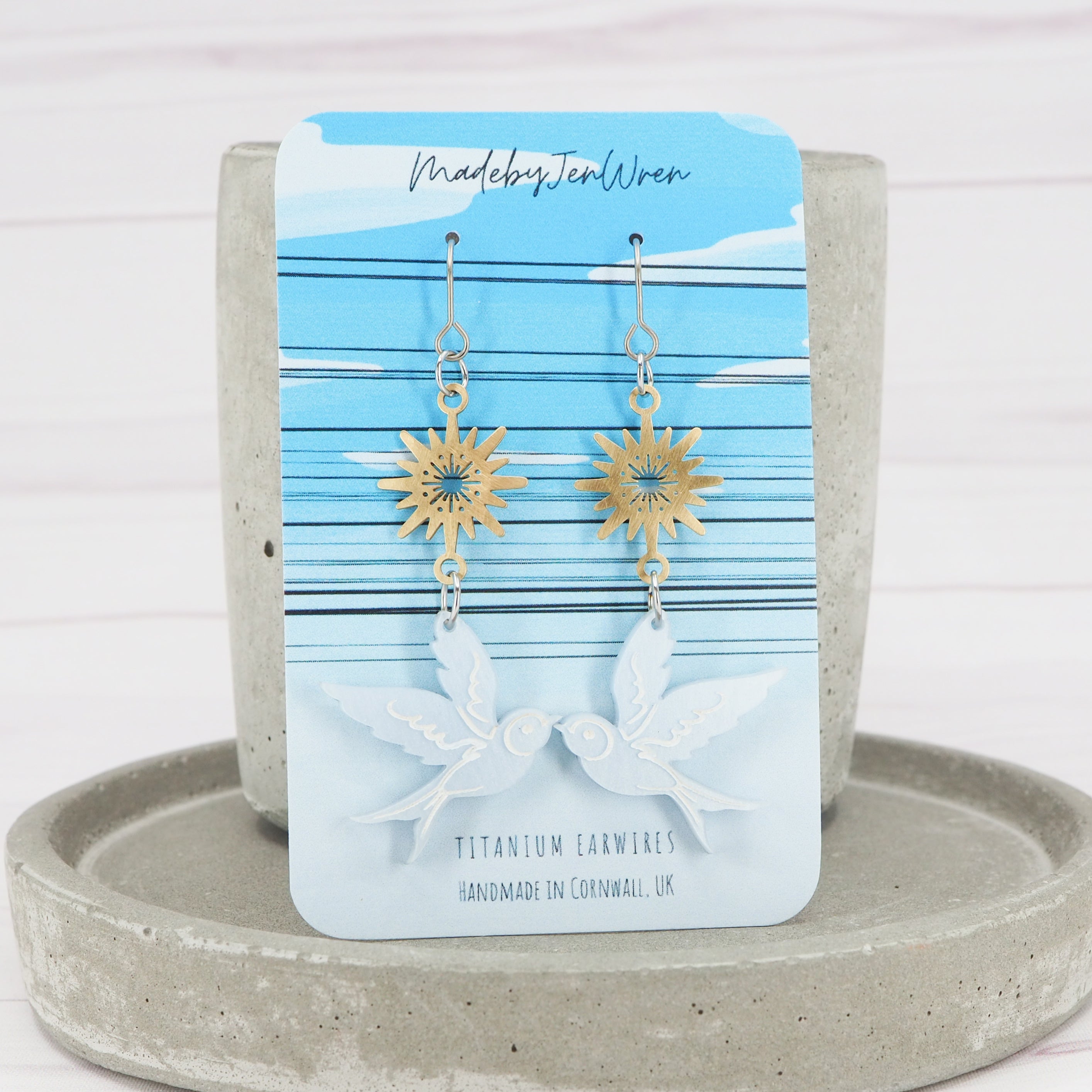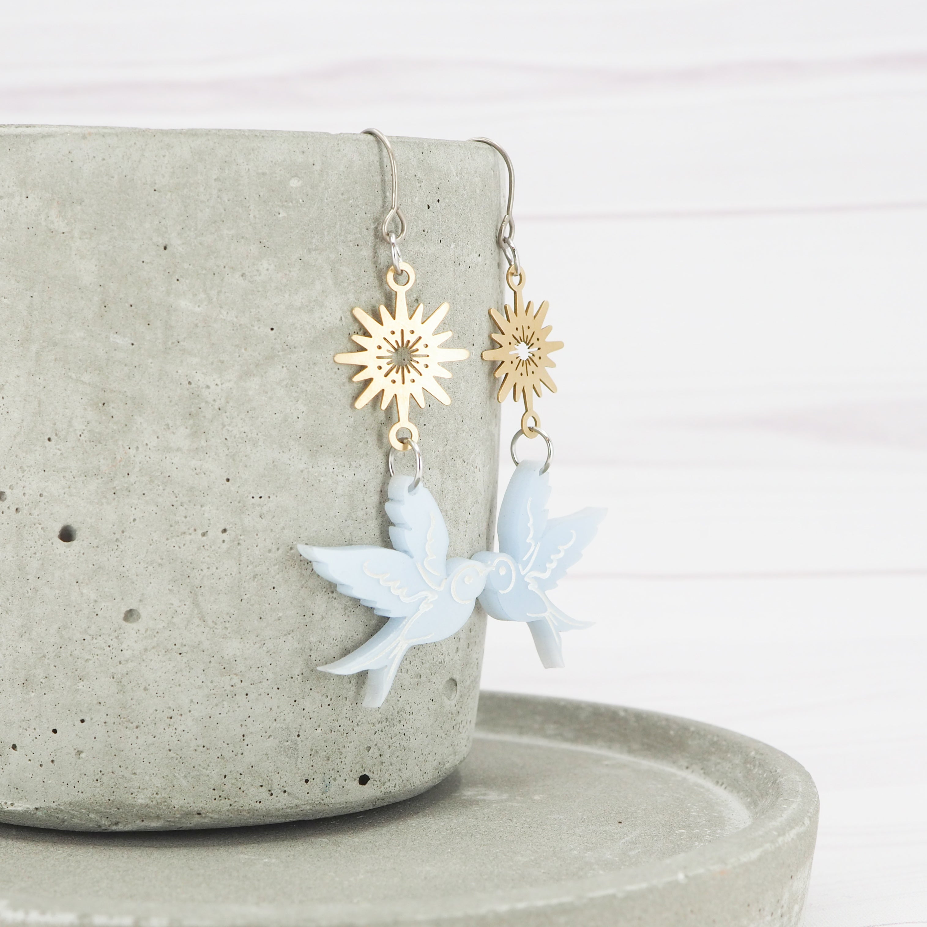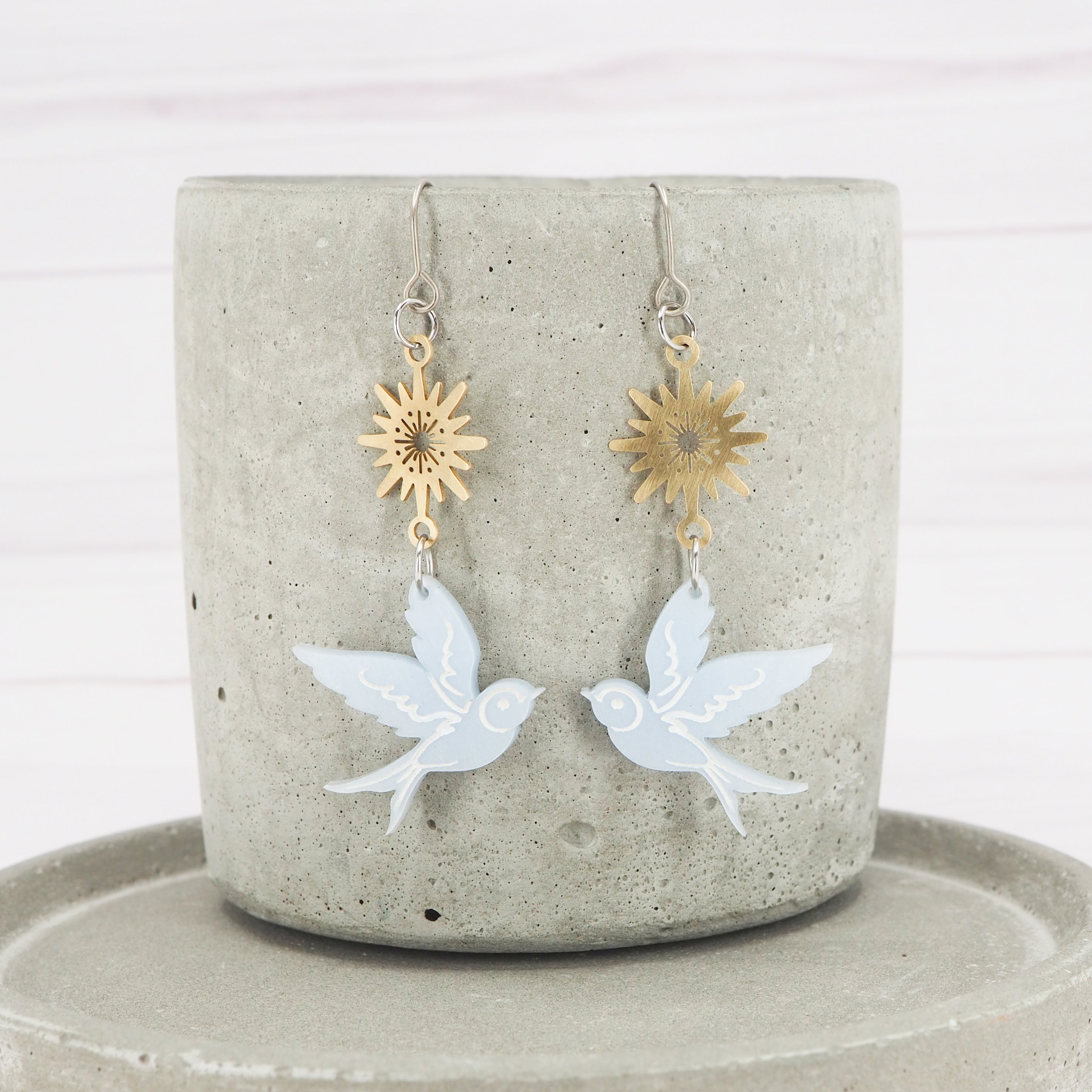 Light blue acrylic folk engraved bird dangle earrings with starburst brass detail.