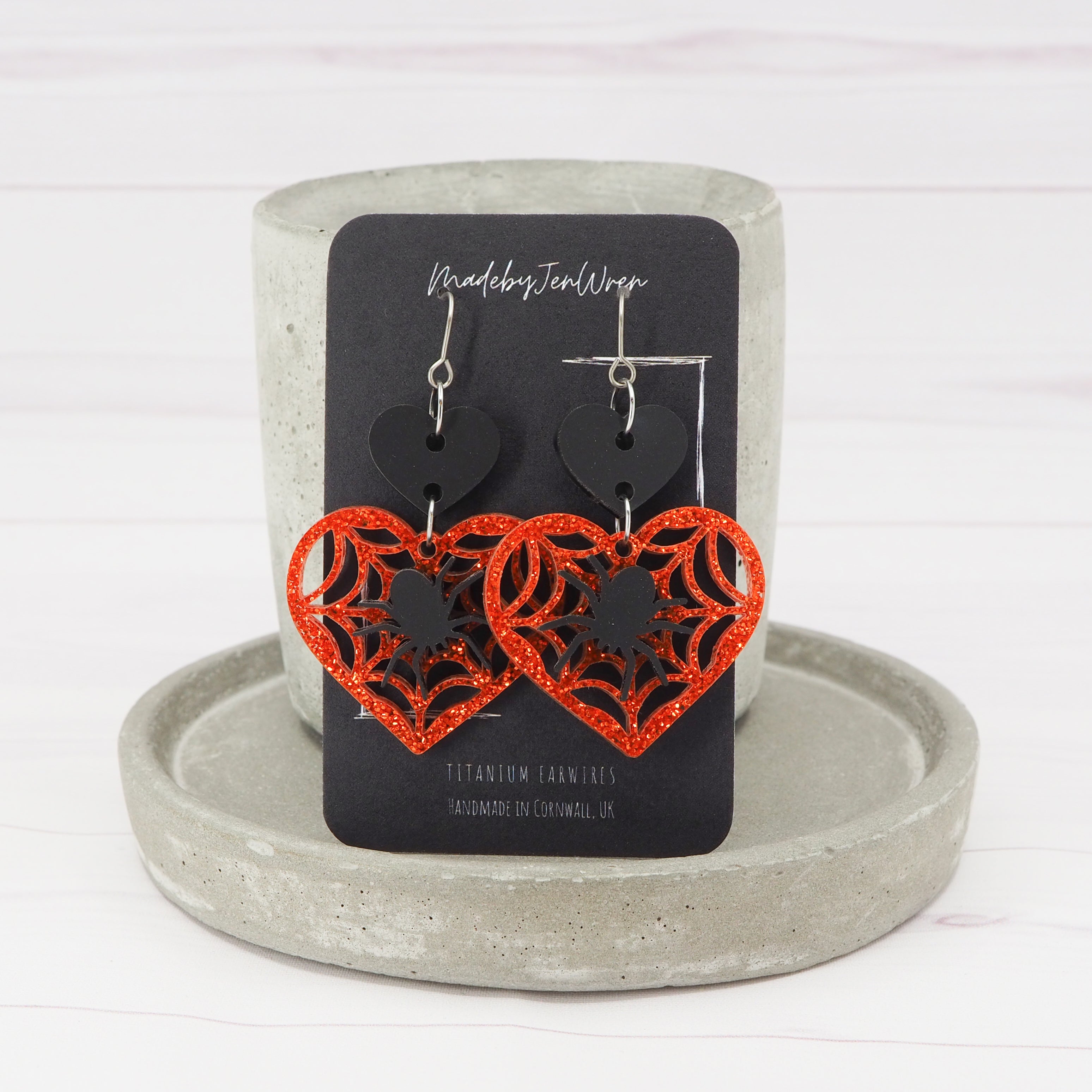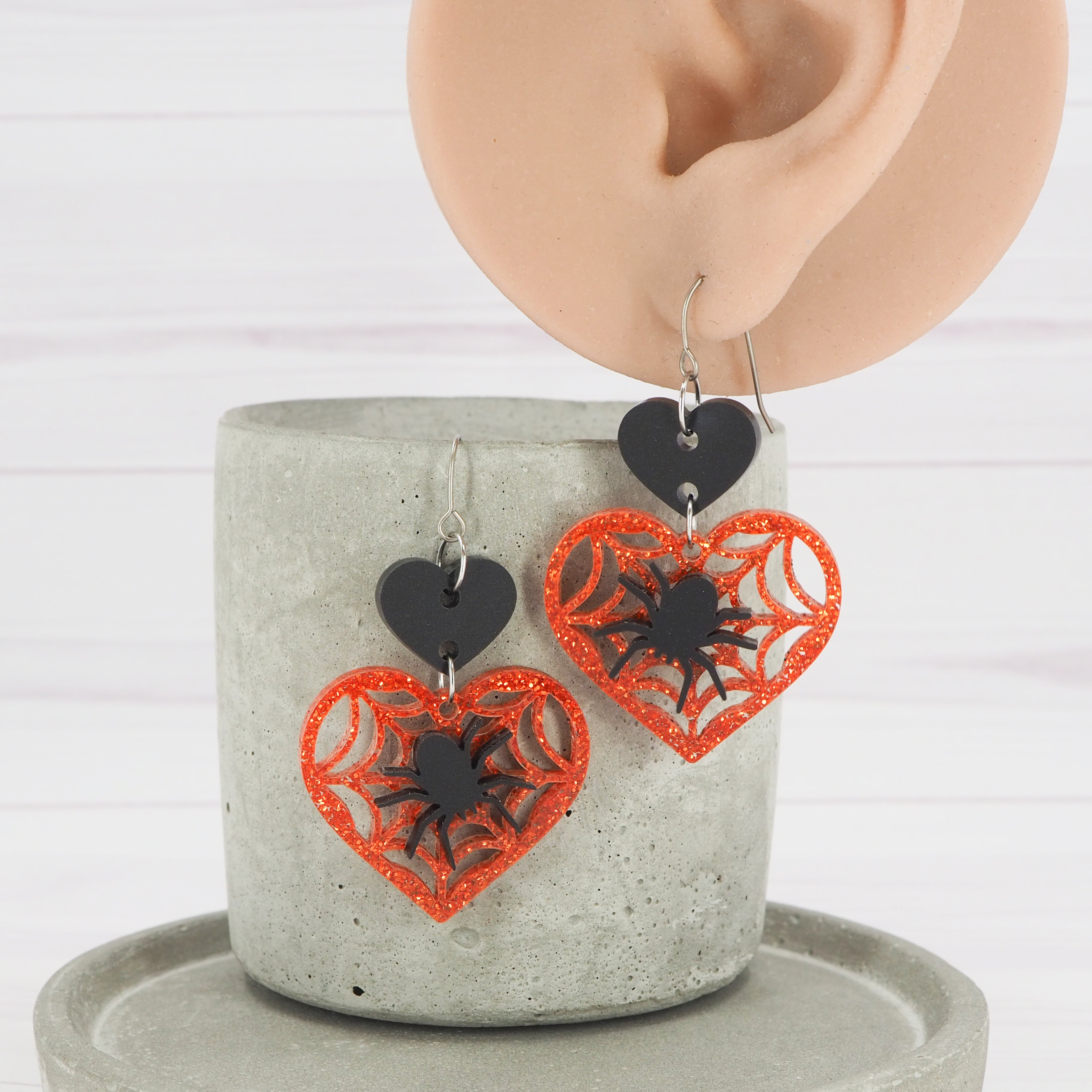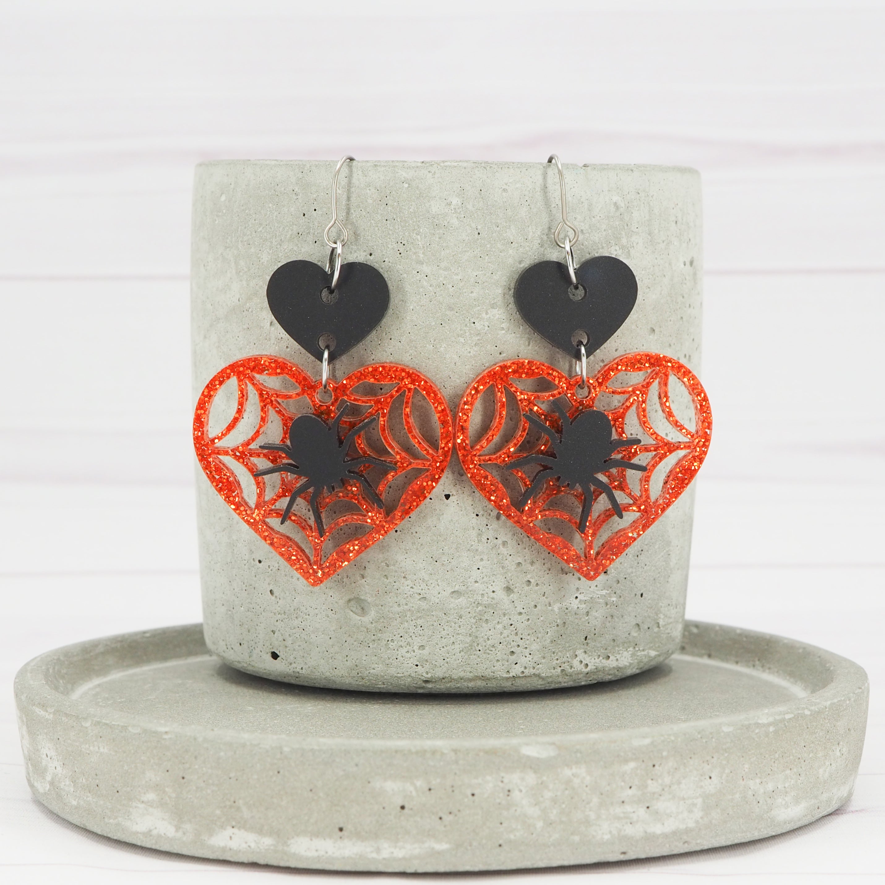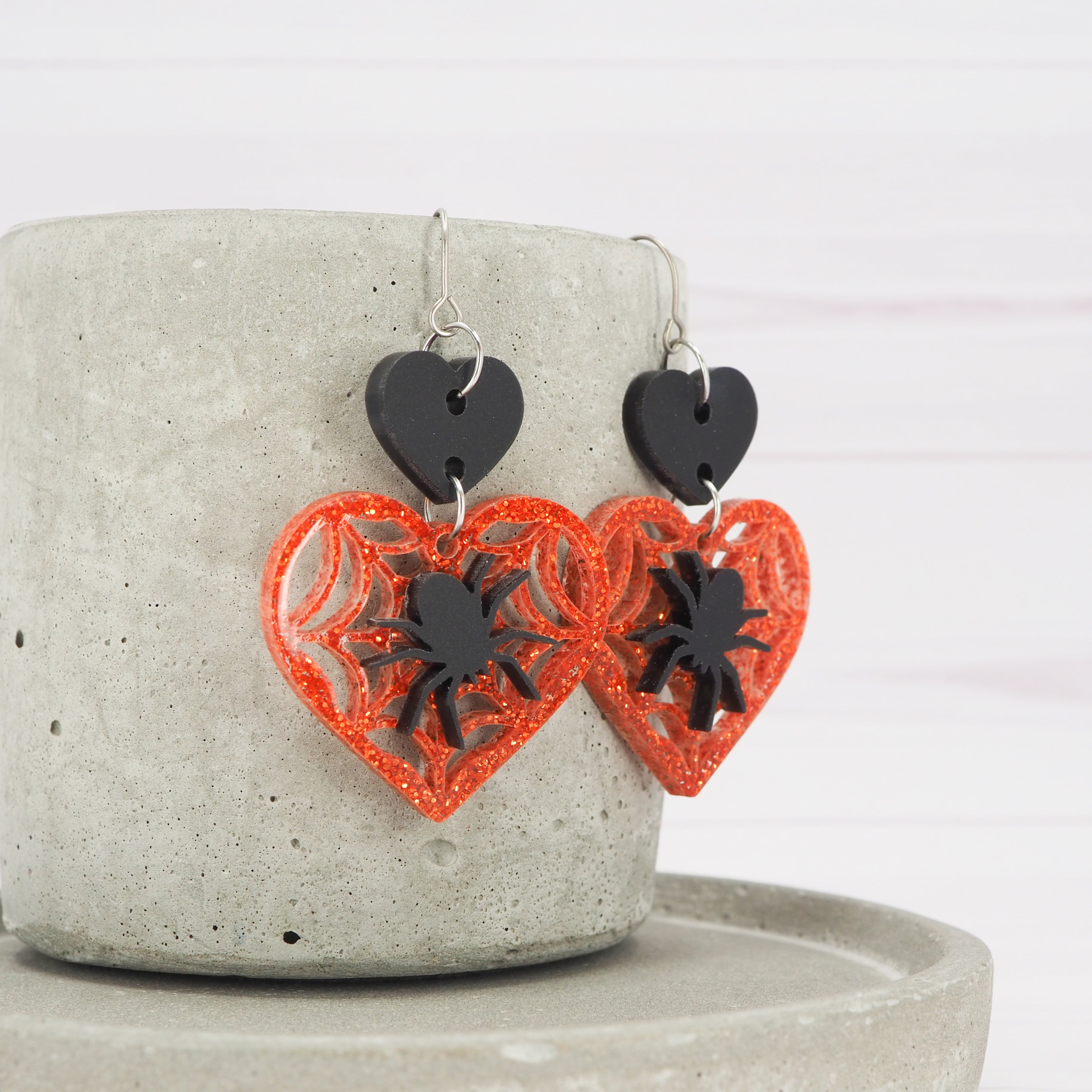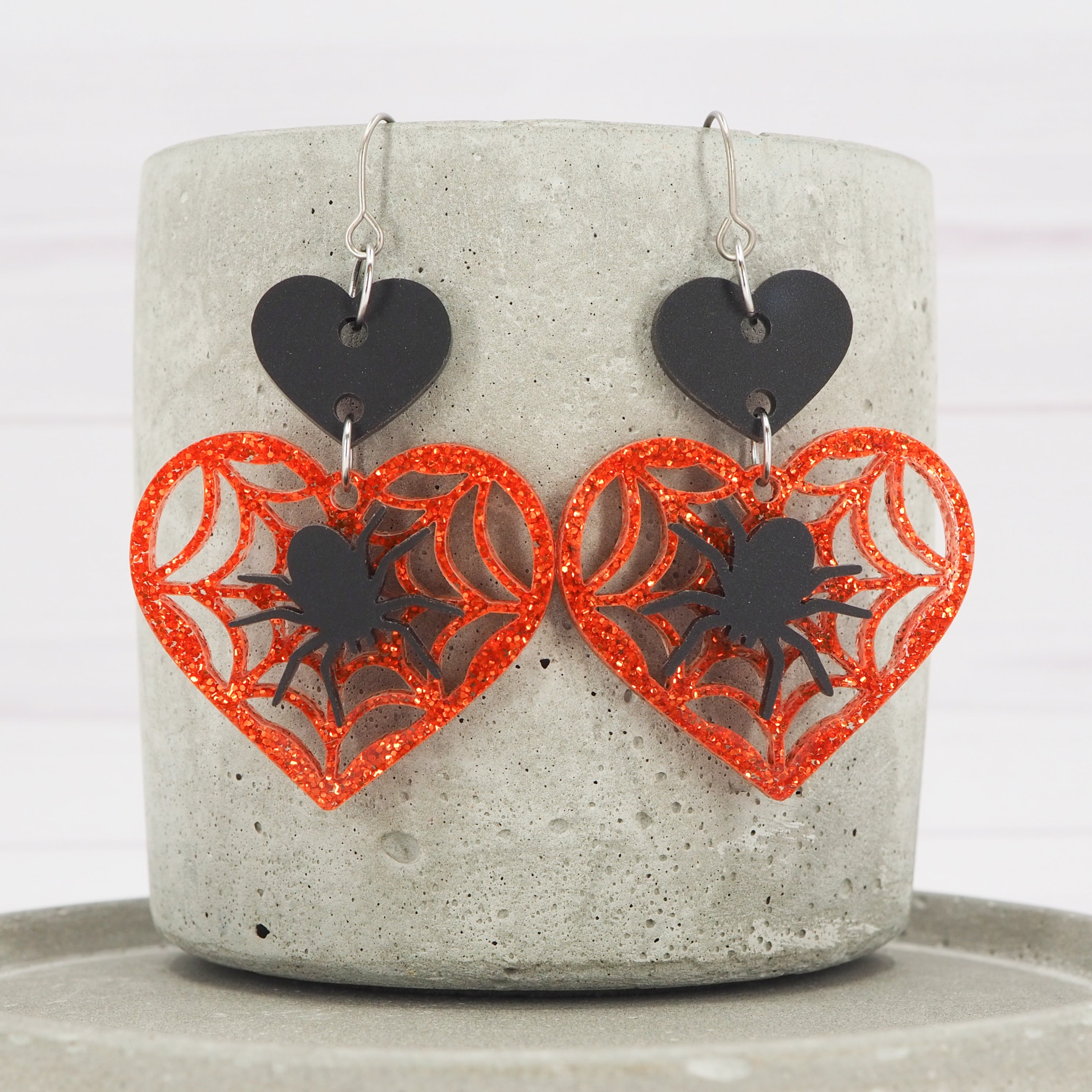 Matte Black and orange glitter Spider and web heart acrylic dangle earrings