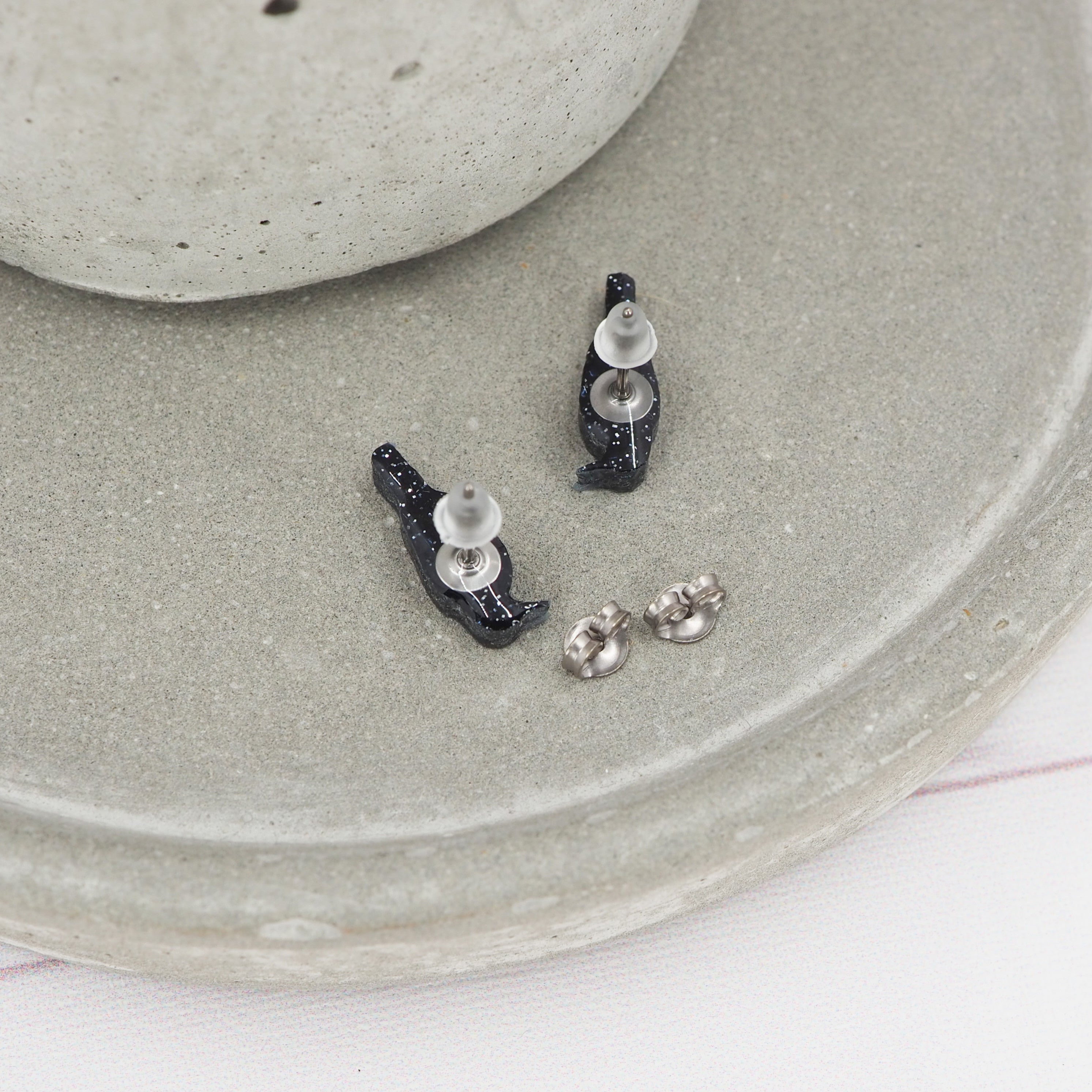 Mini Black glitter bird stud earrings.