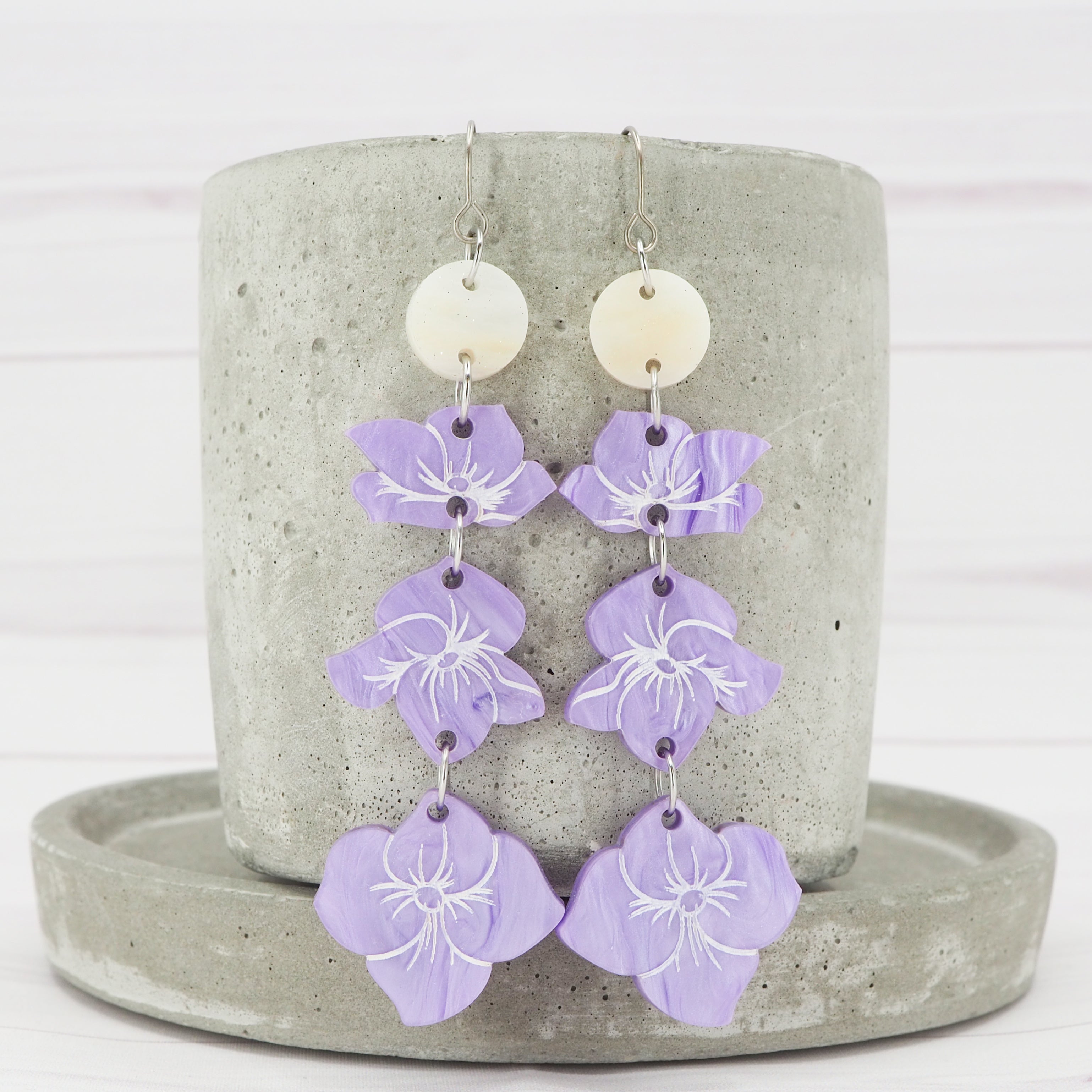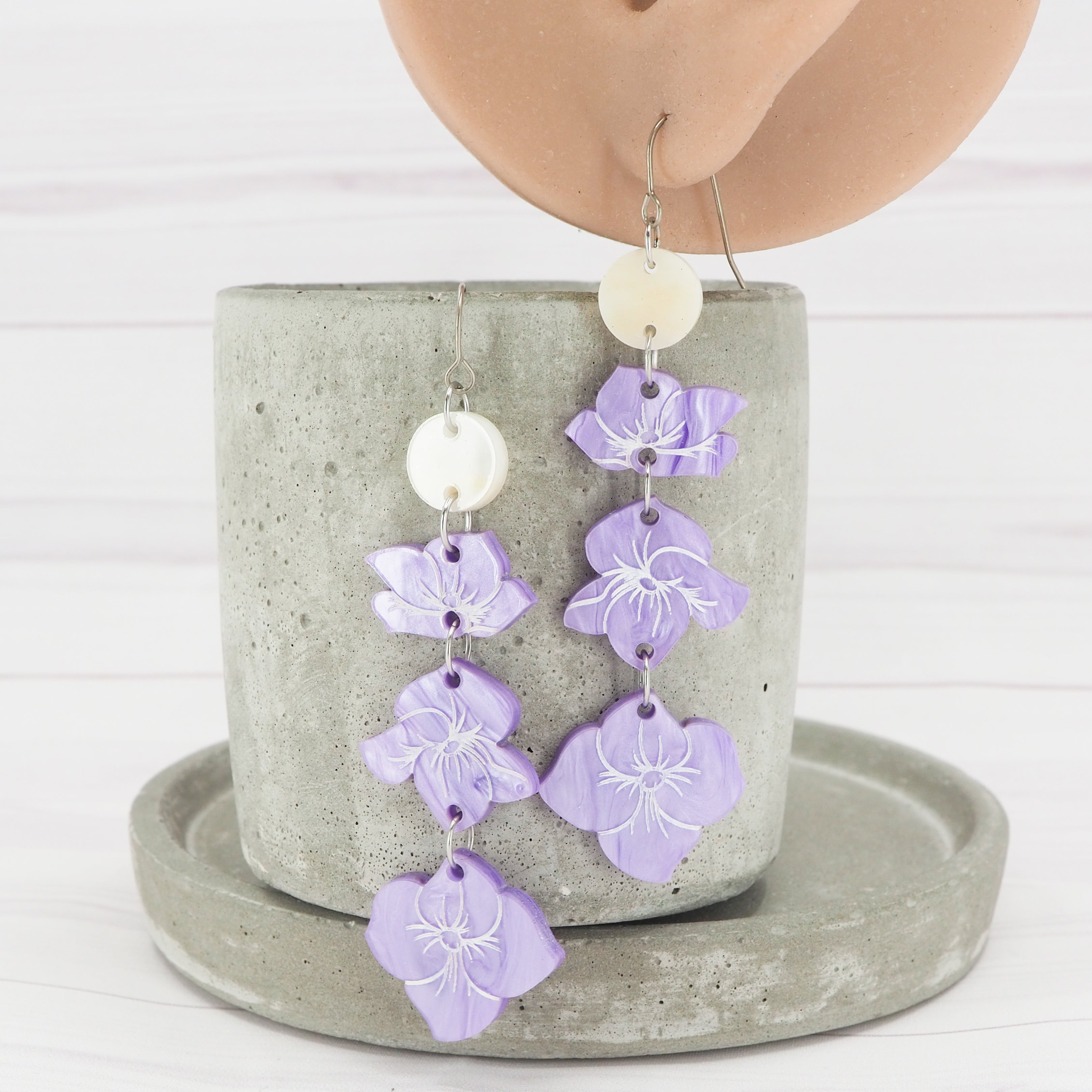 The earrings have a total drop length of 3.6" (9cm) from the top of the hook to the bottom of the flowers.