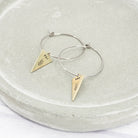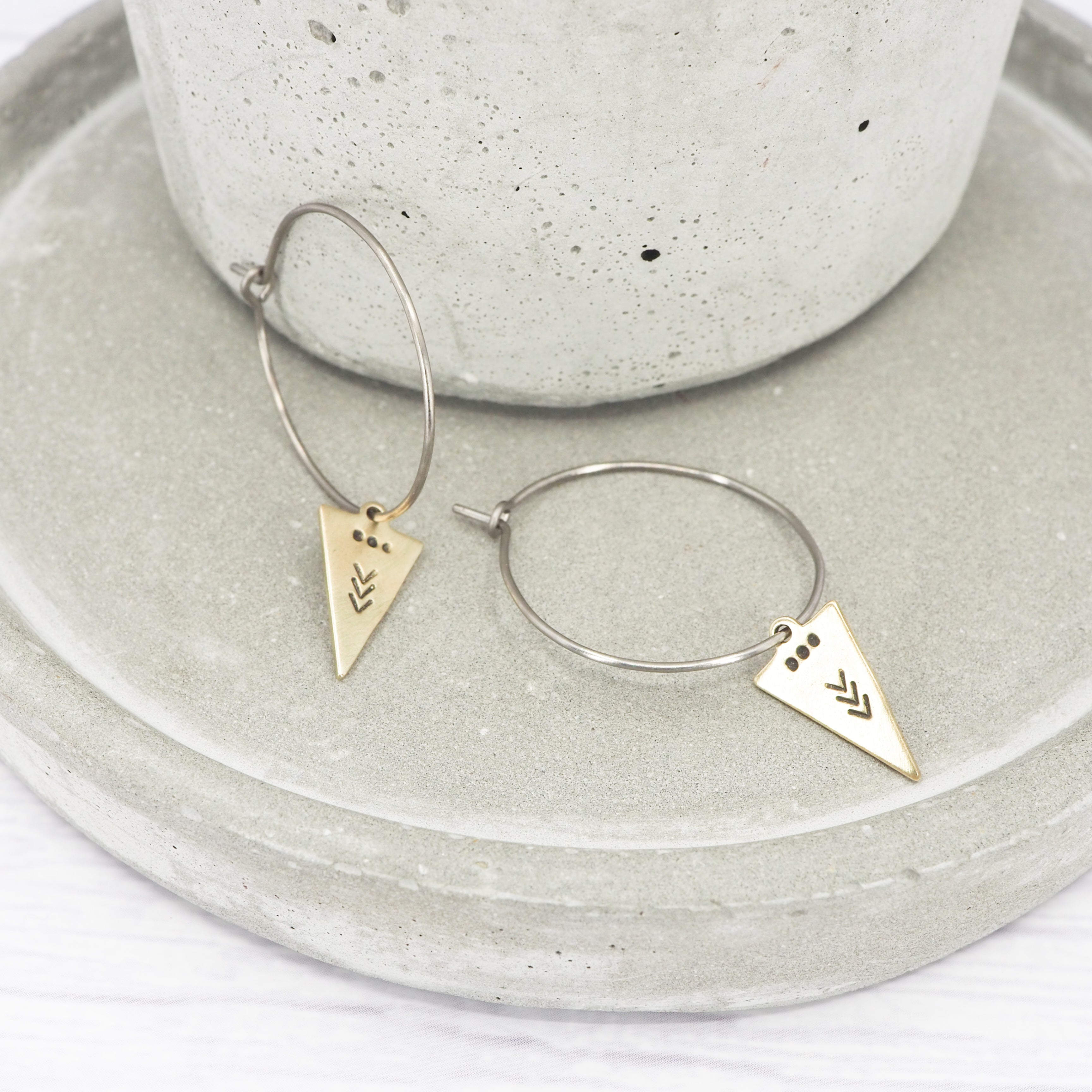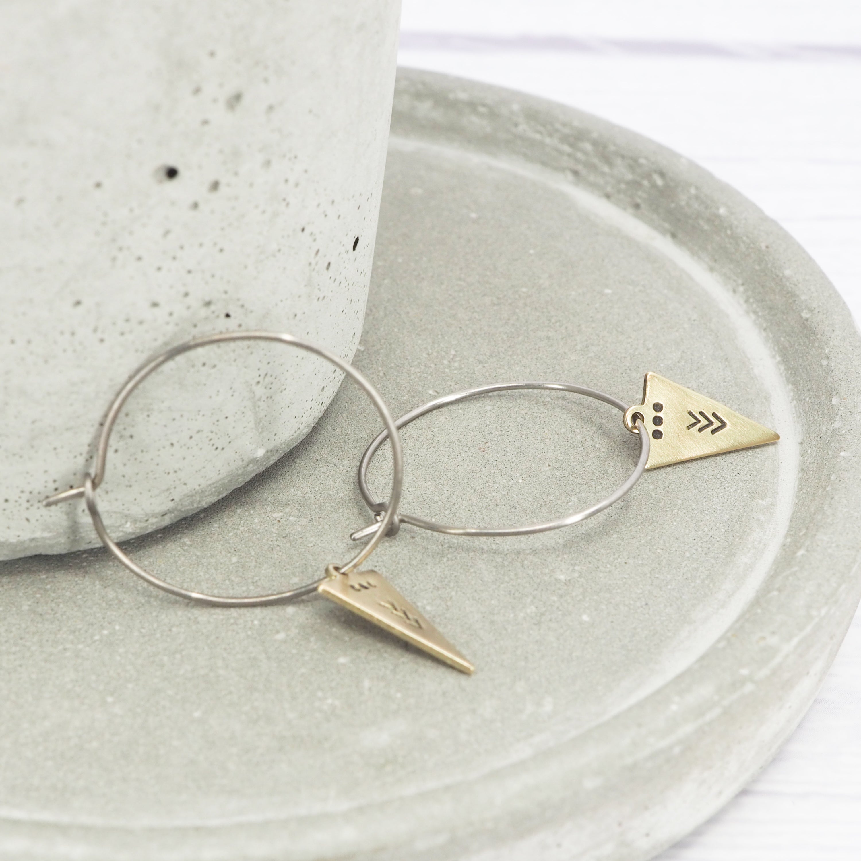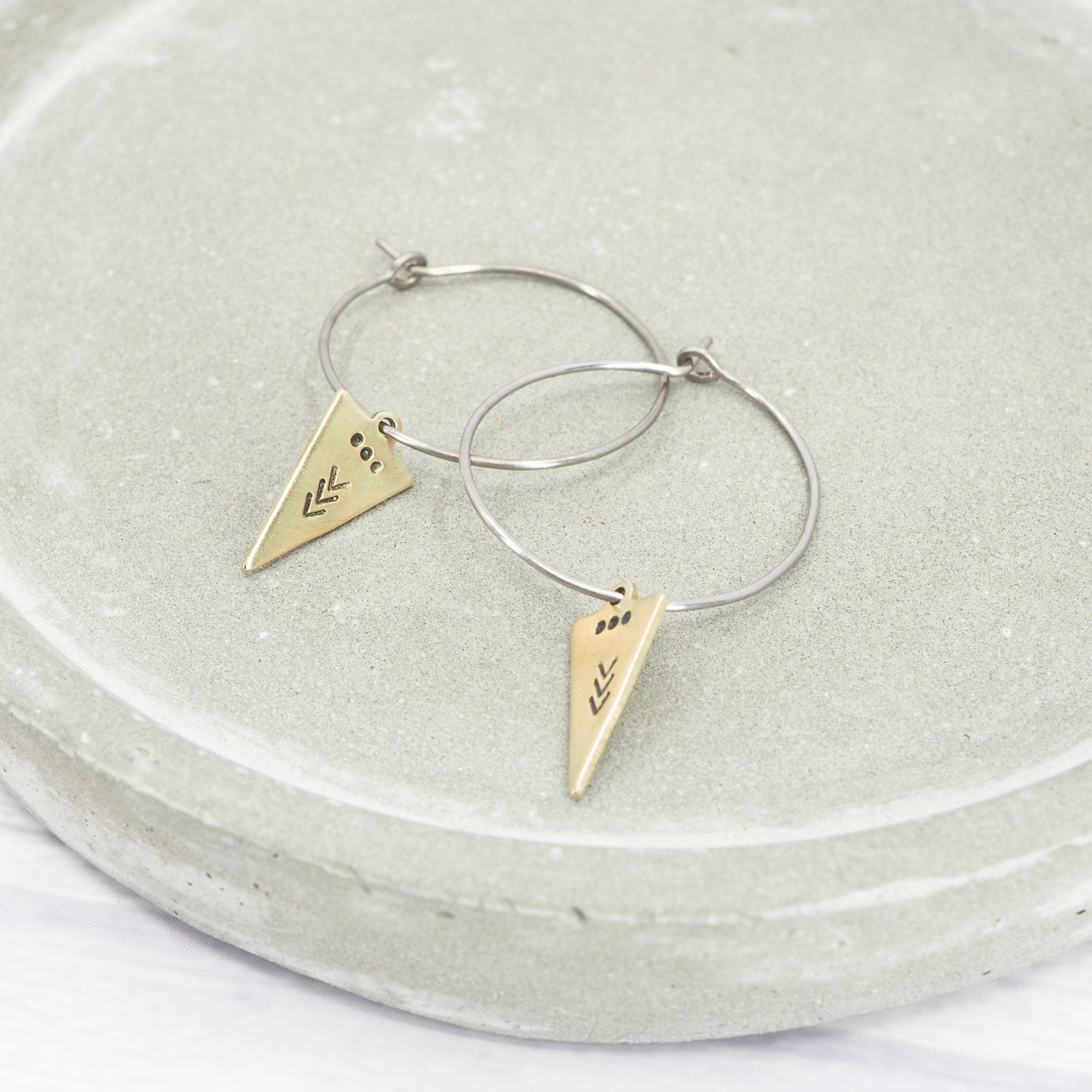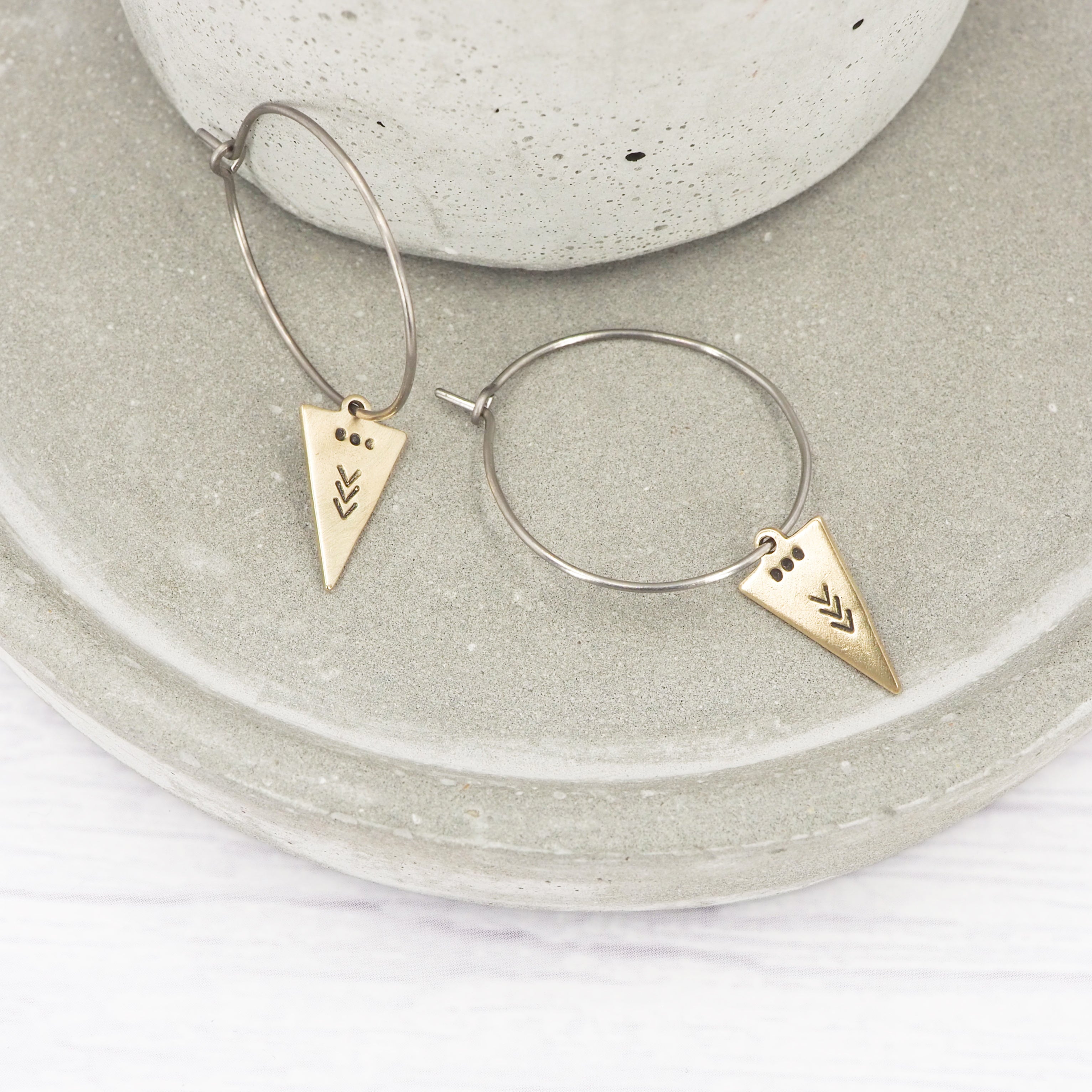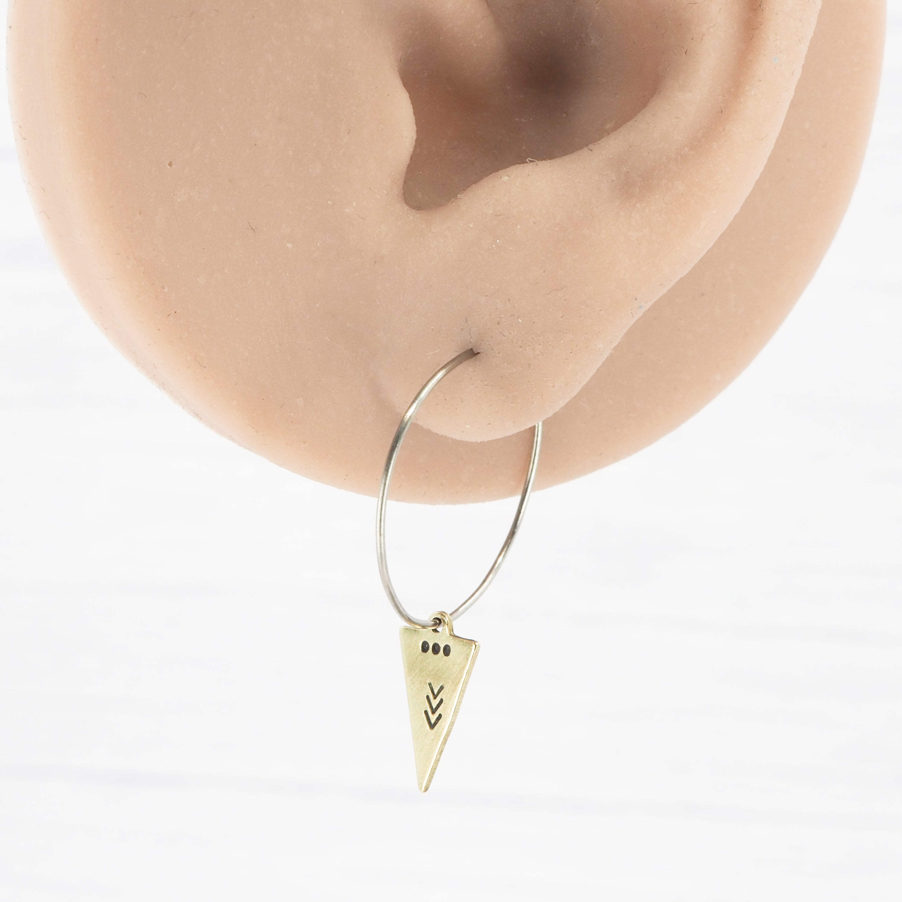 Brass arrowhead hand-stamped dangle hoop earrings.