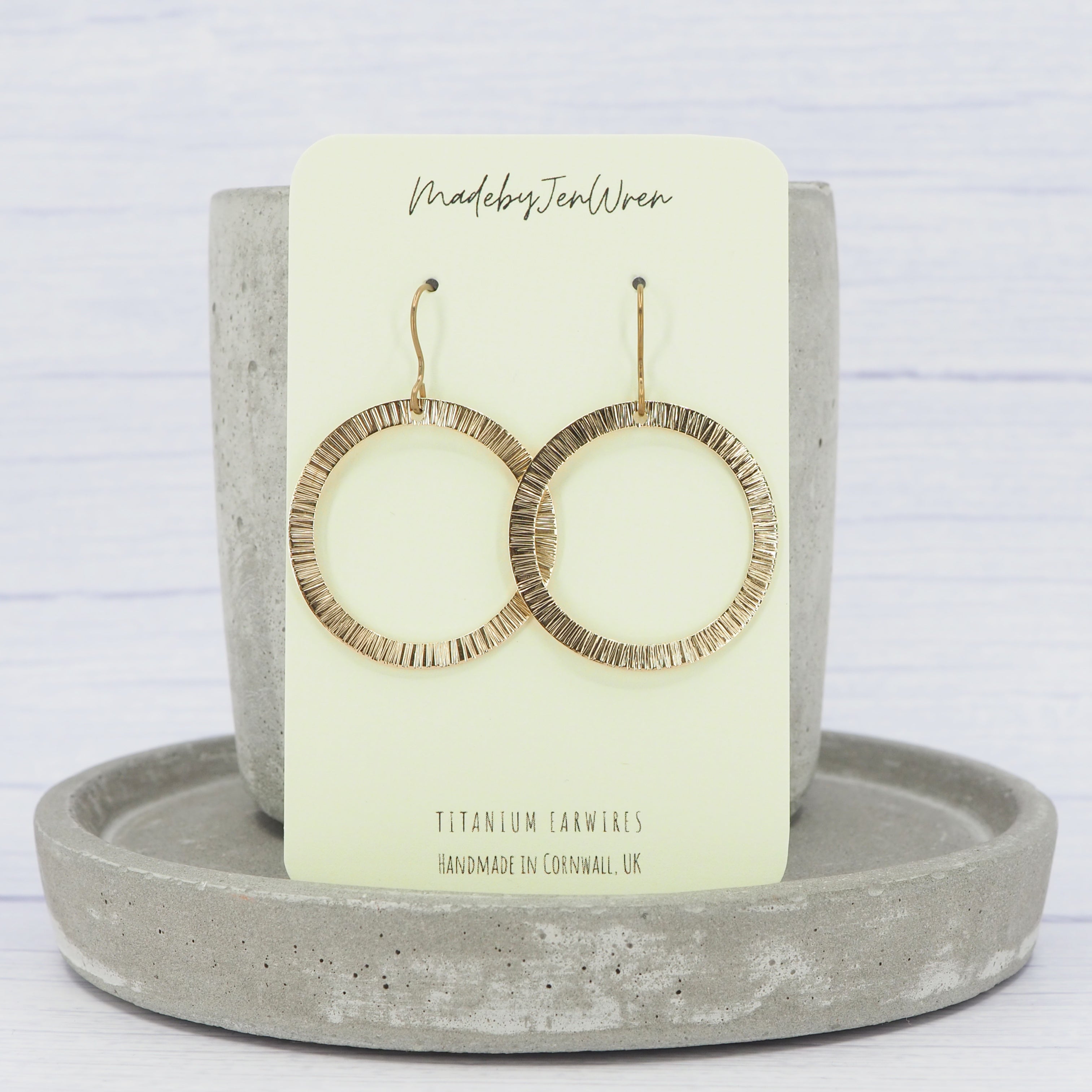 The ear wires are made from solid grade 1 titanium (0.7mm / 21ga) round wire.