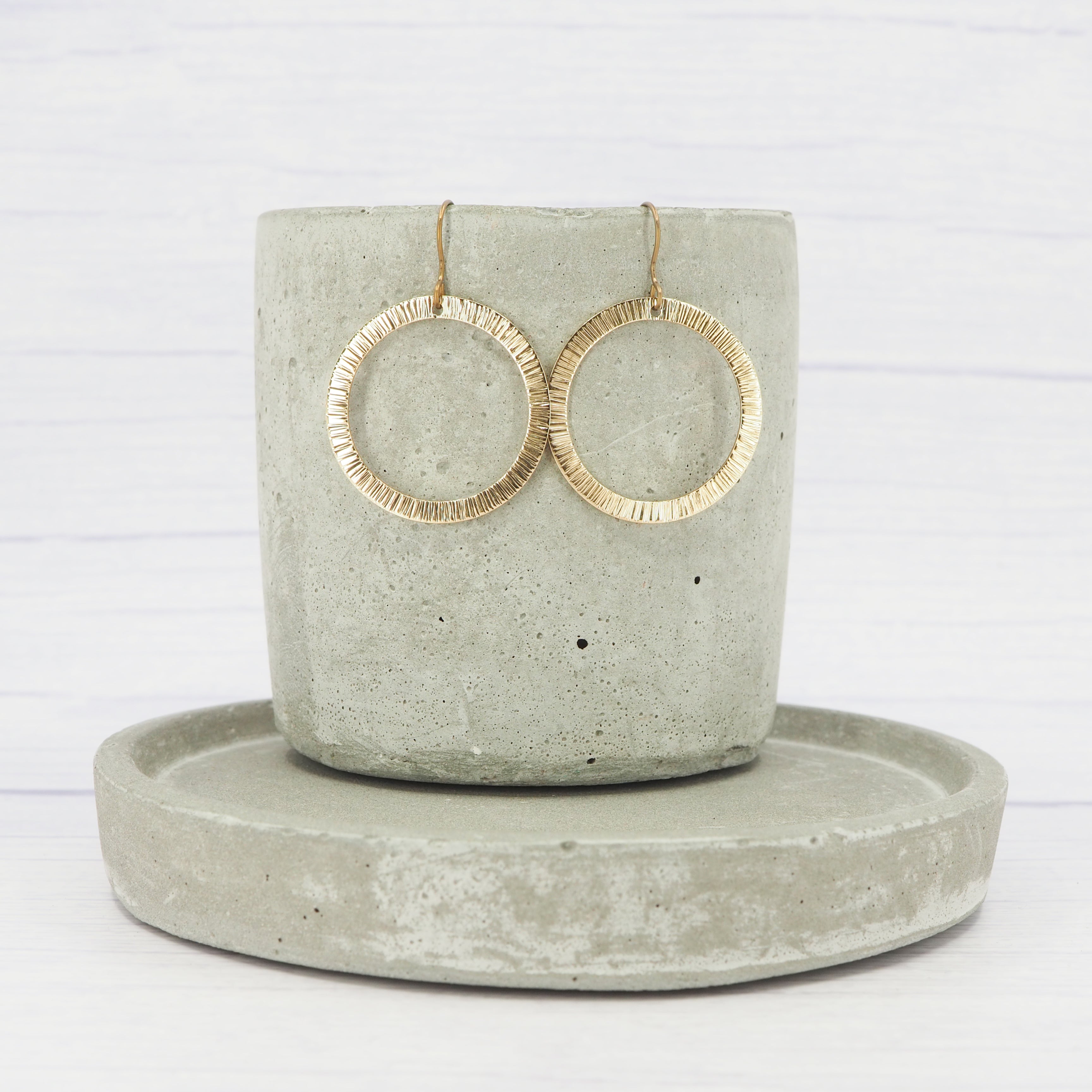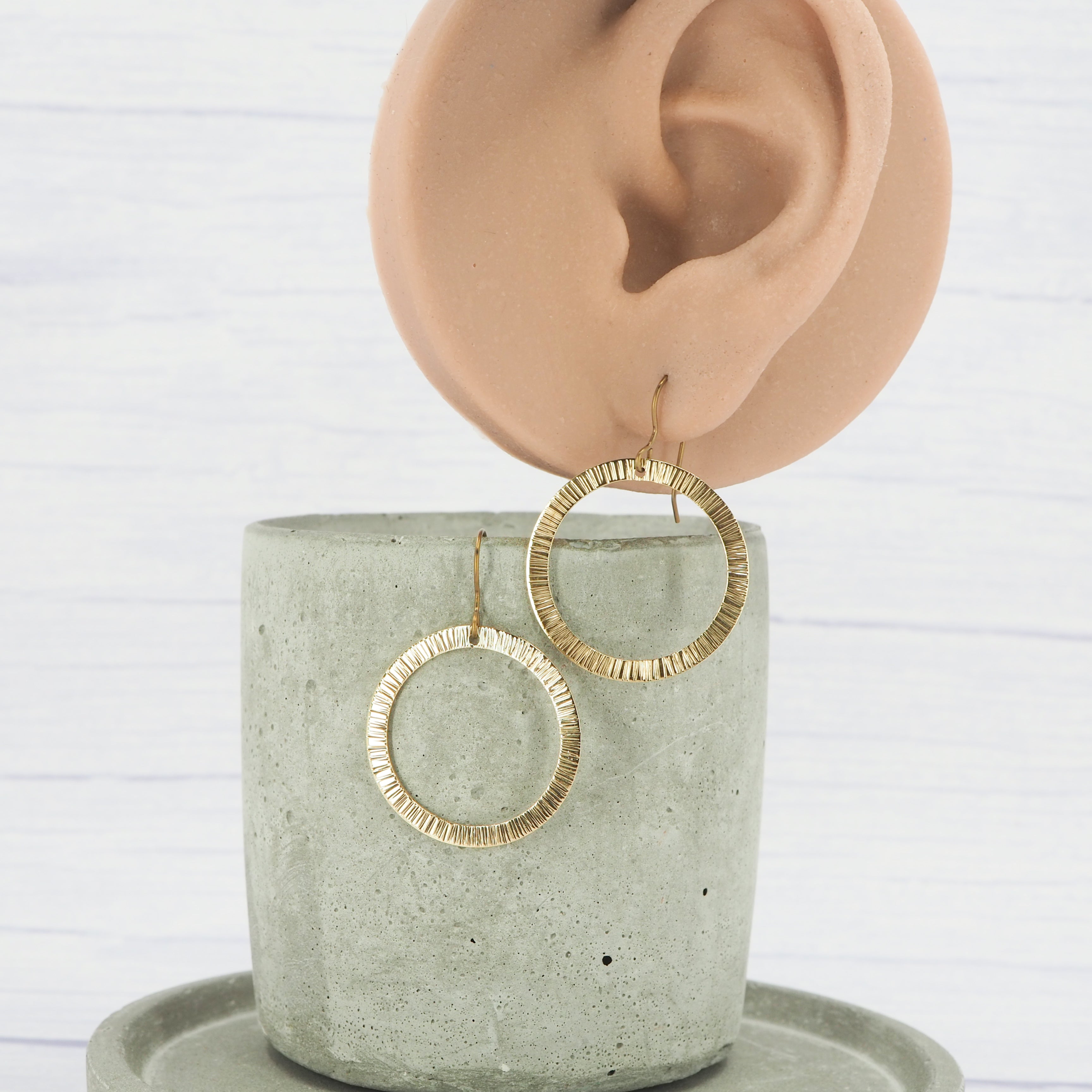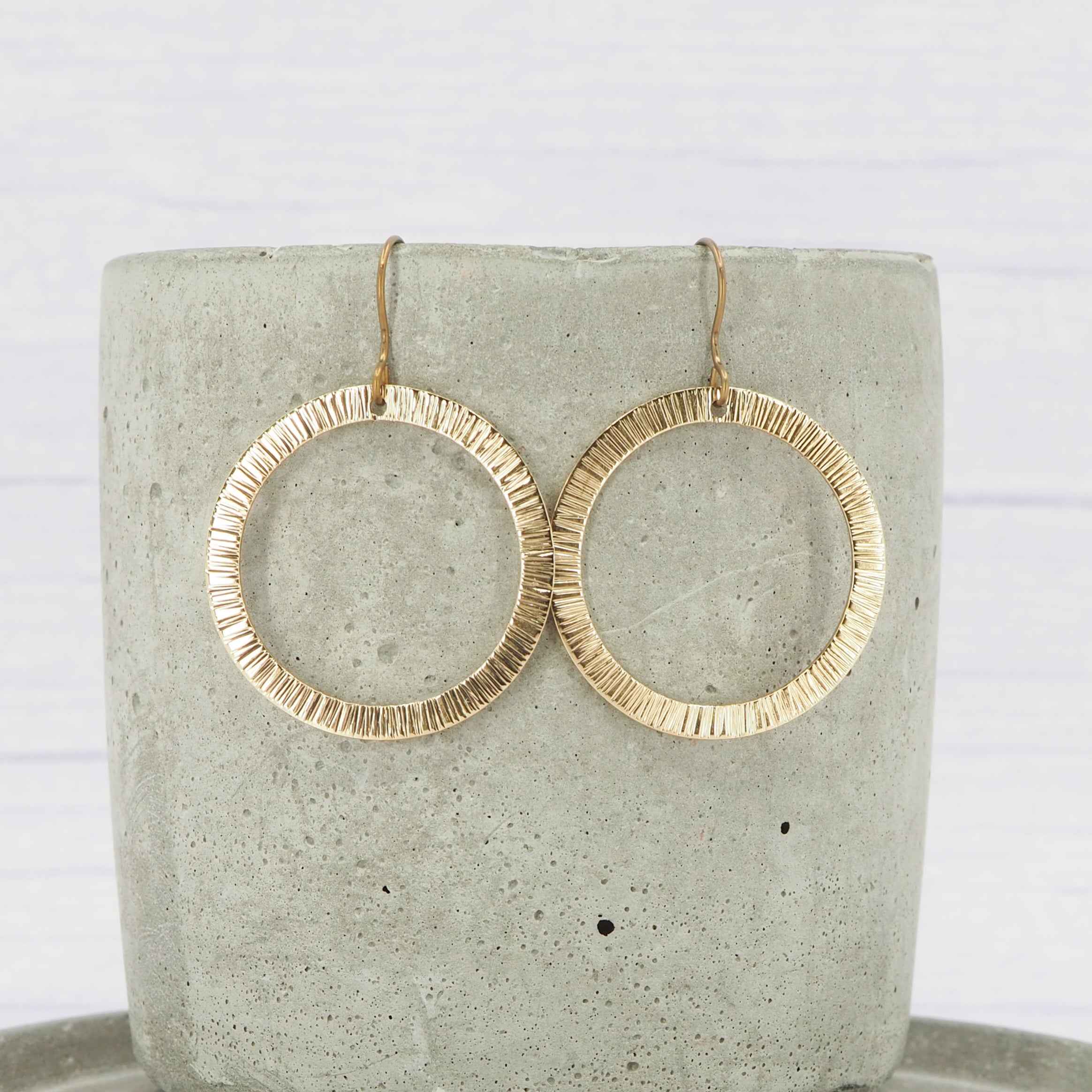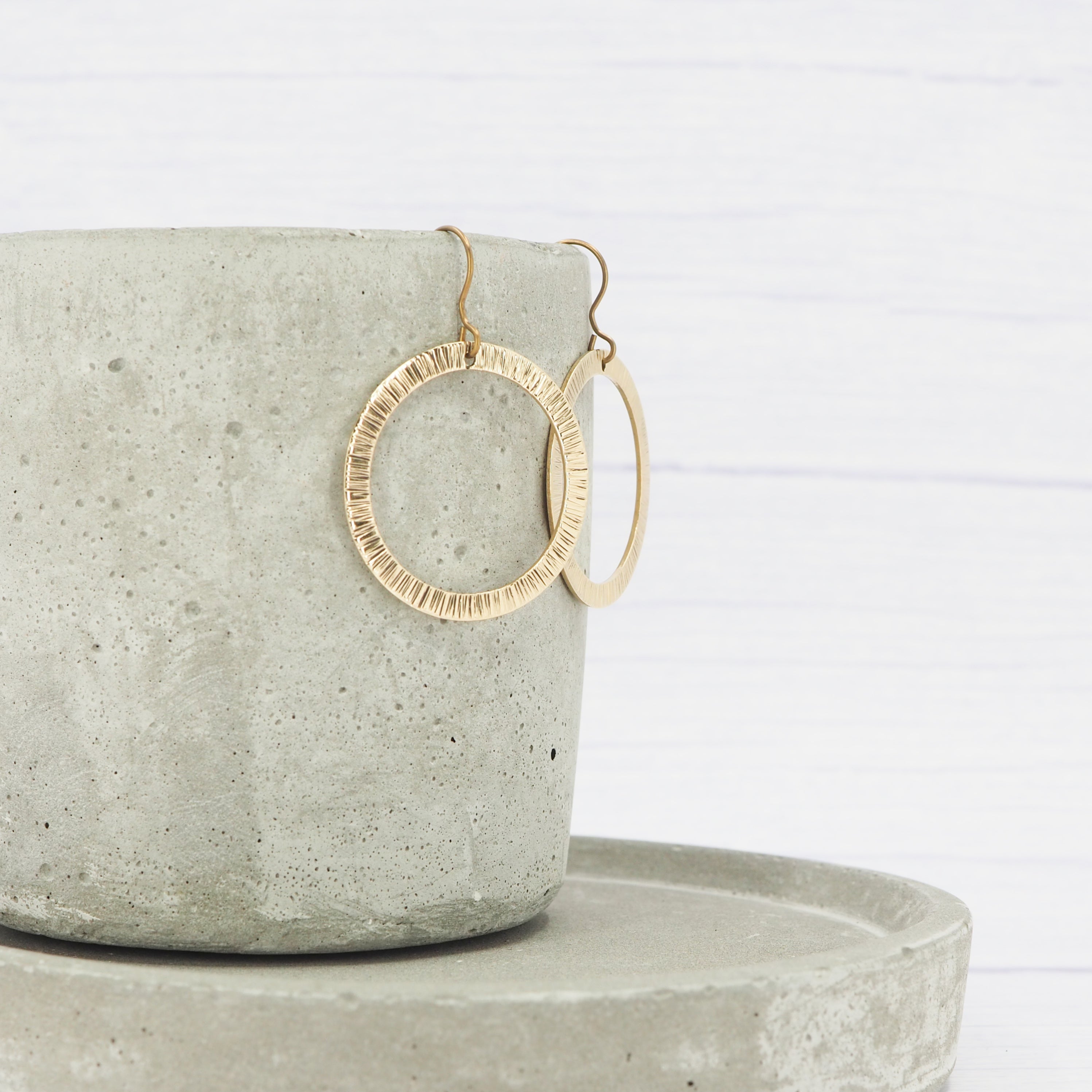 Brass bark textured hammered ring dangle earrings