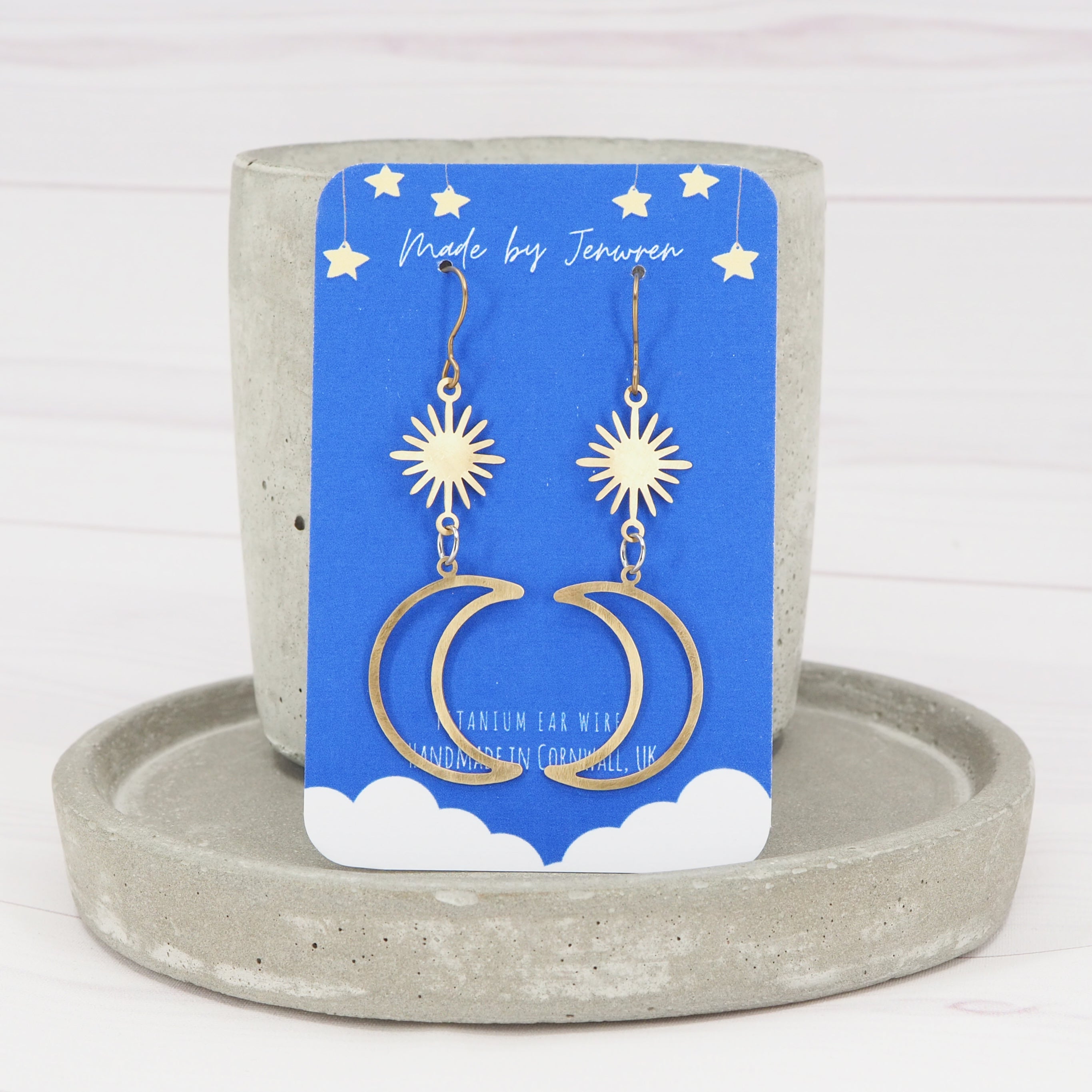 and the earrings have a total drop length of 2.4" (6cm) from the top of the ear wire to the bottom of the moons.