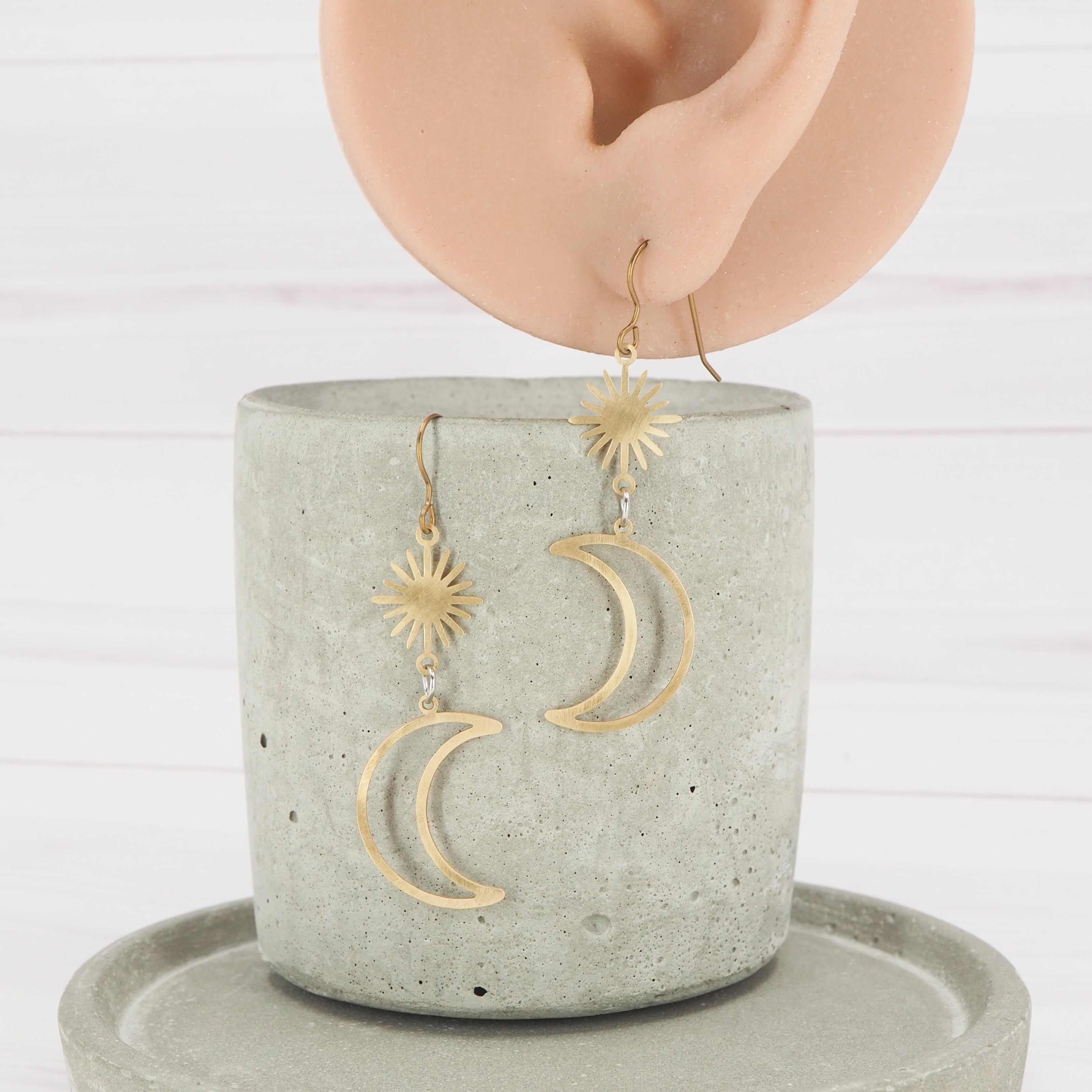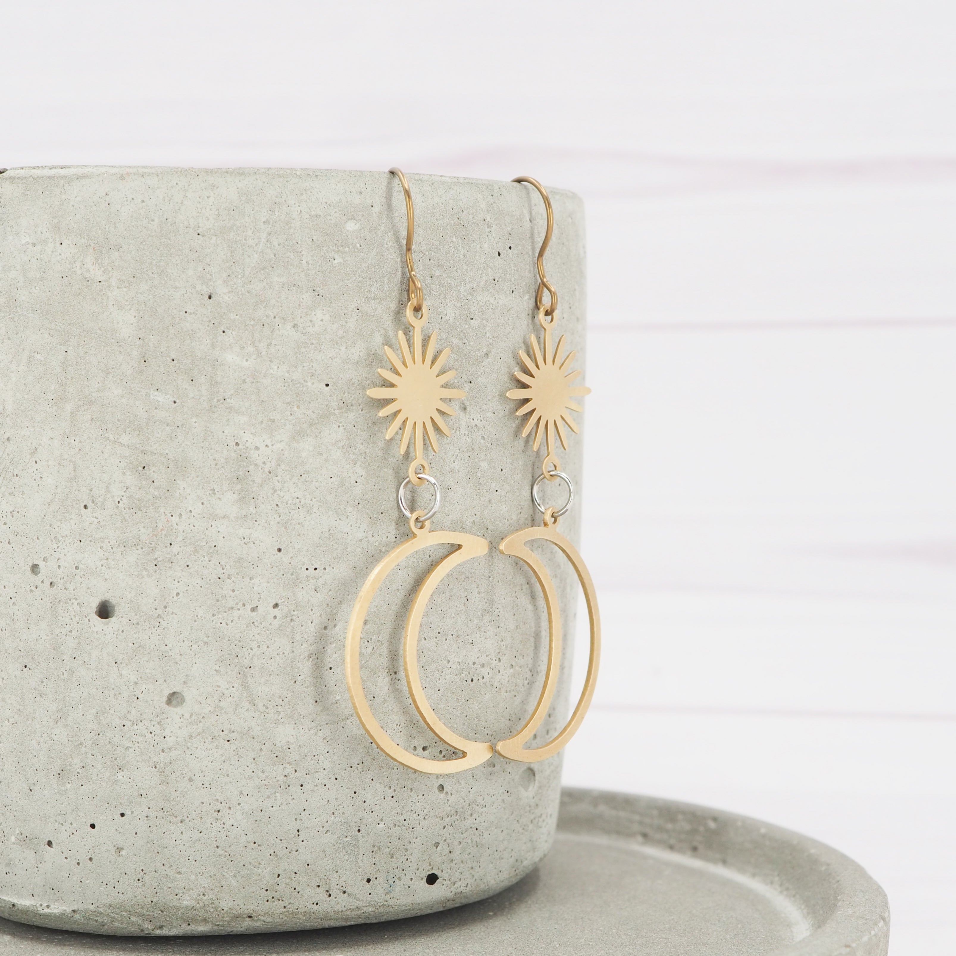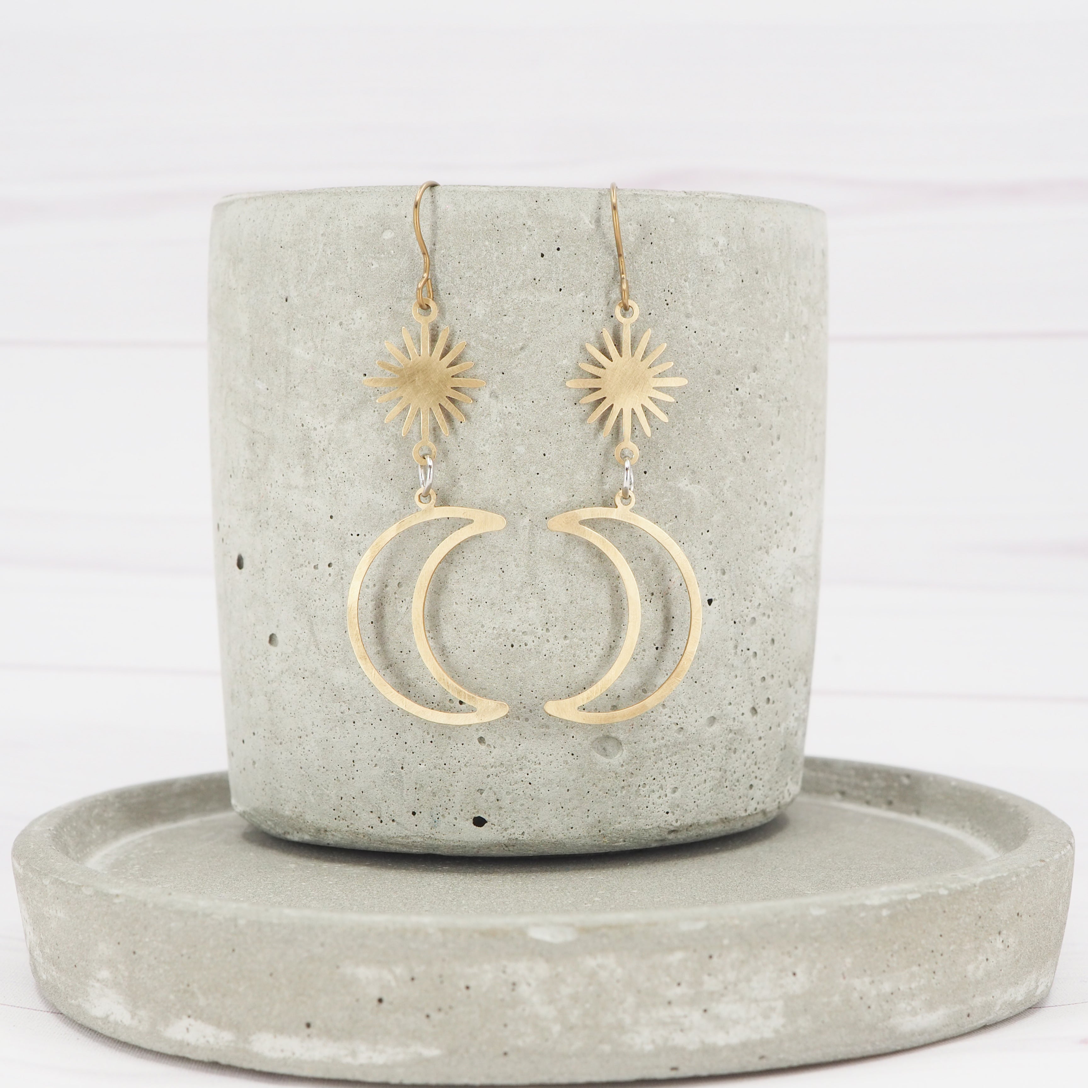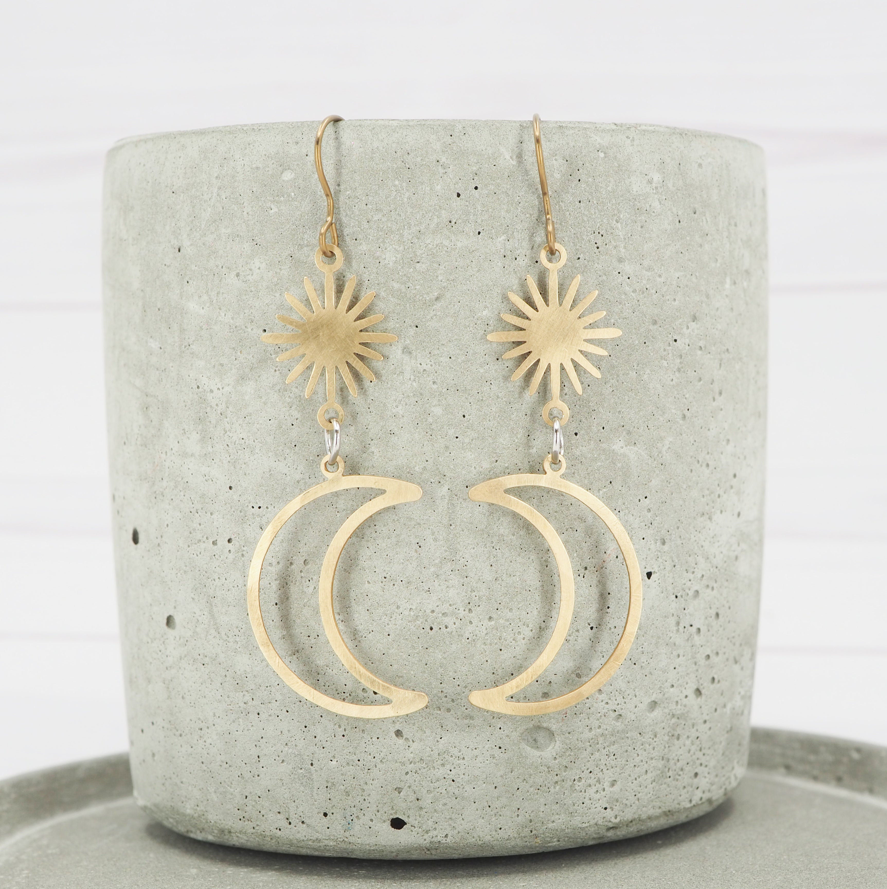 Brass crescent moon and sun dangle earrings