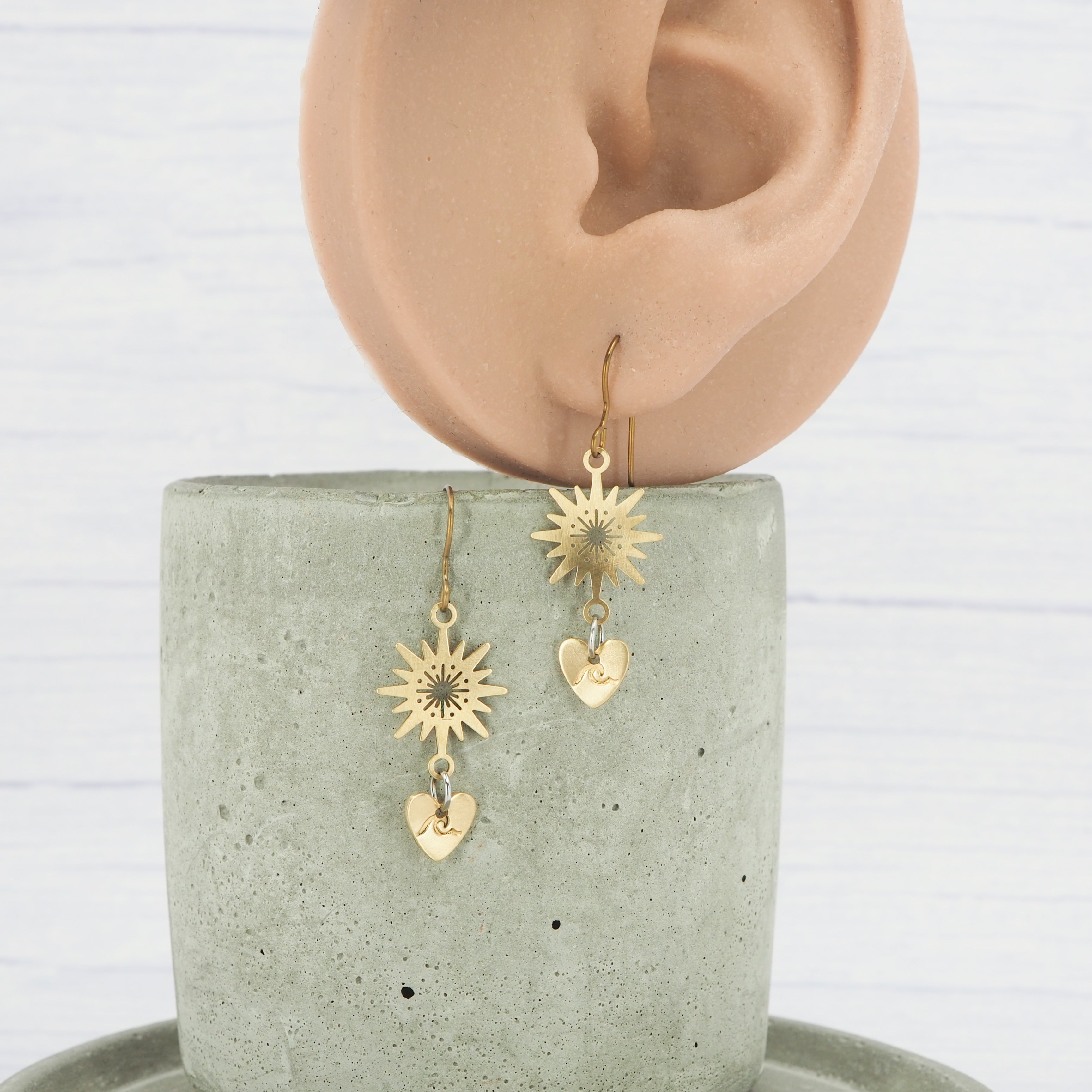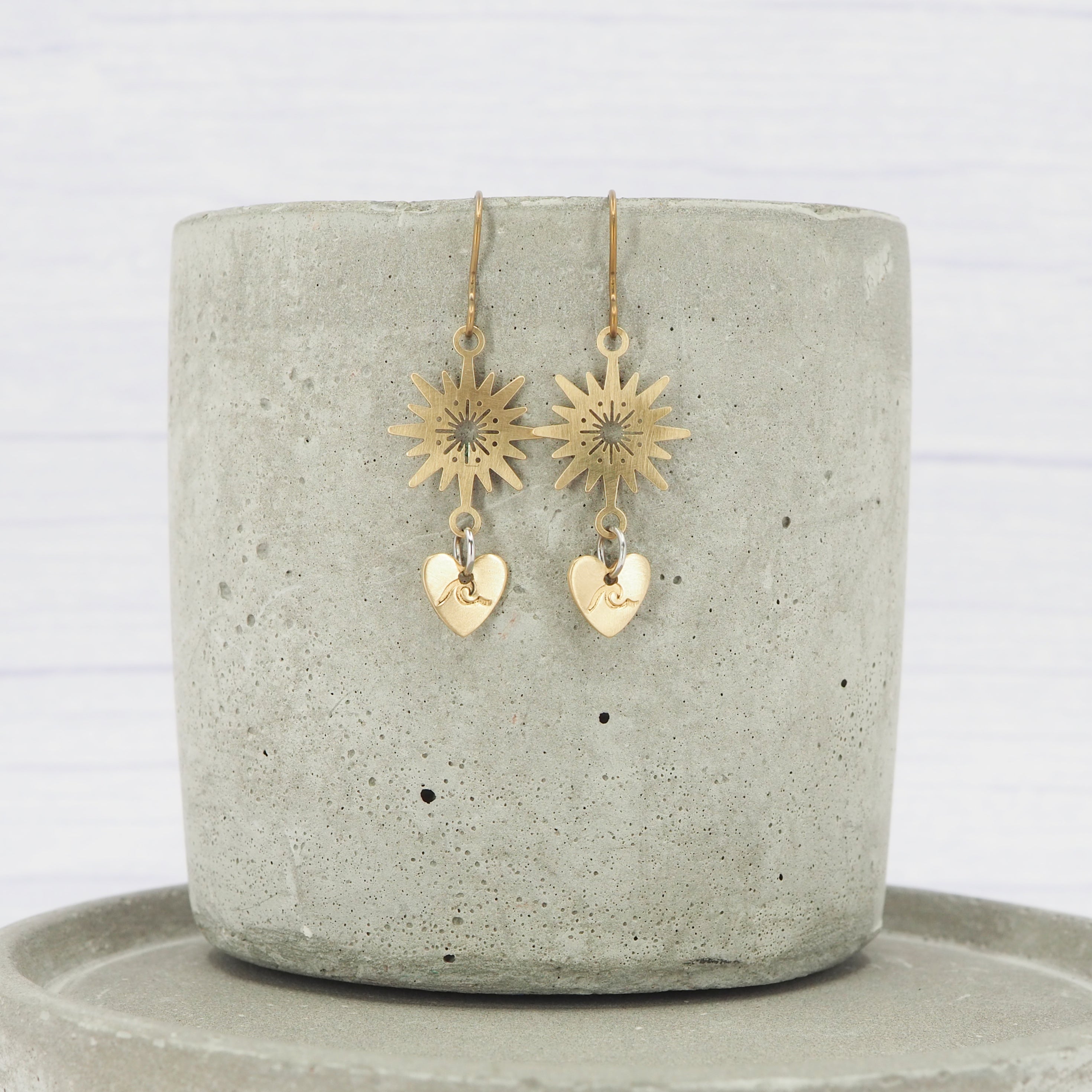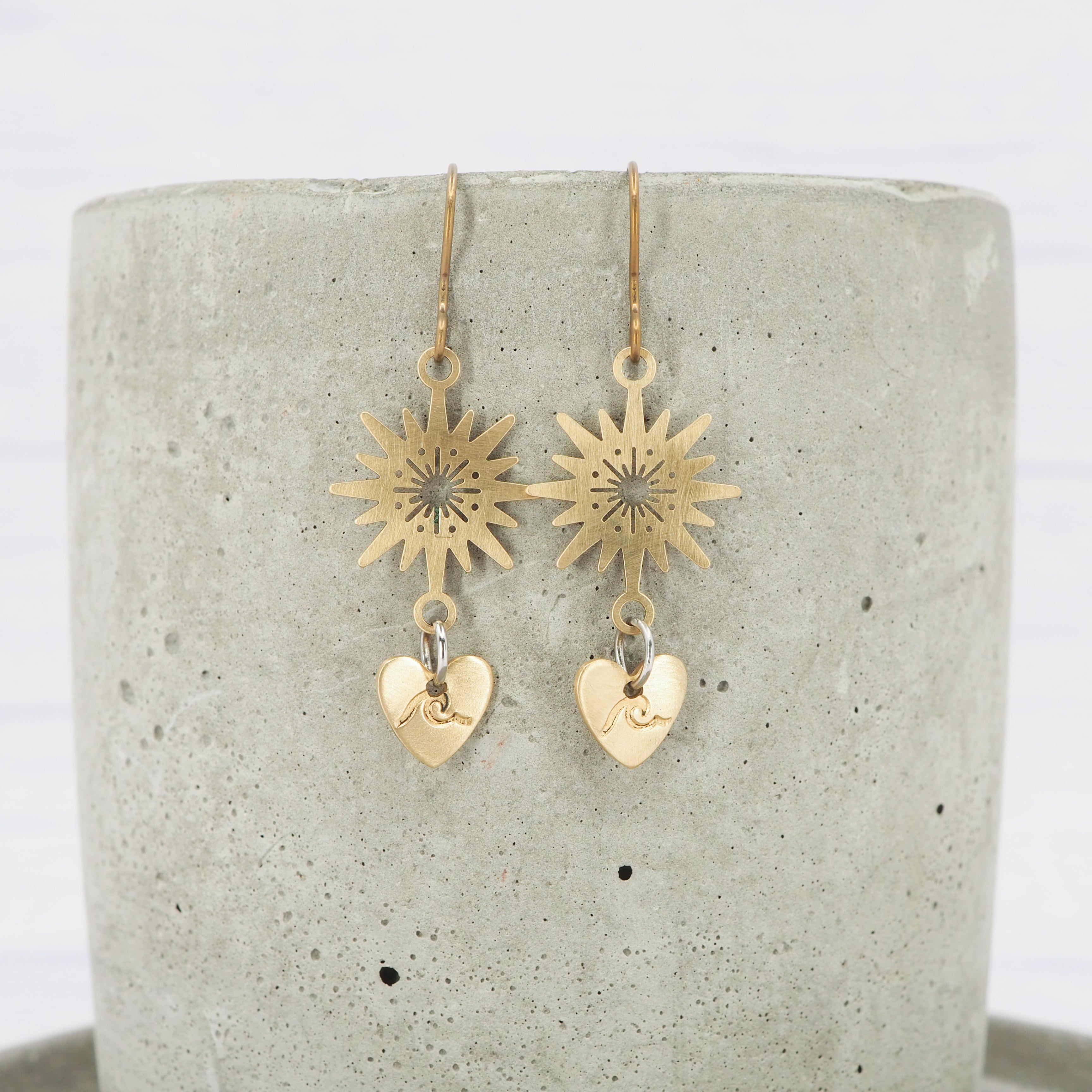 Brass Hand hammered sunburst, heart, wave stamped dangle earring