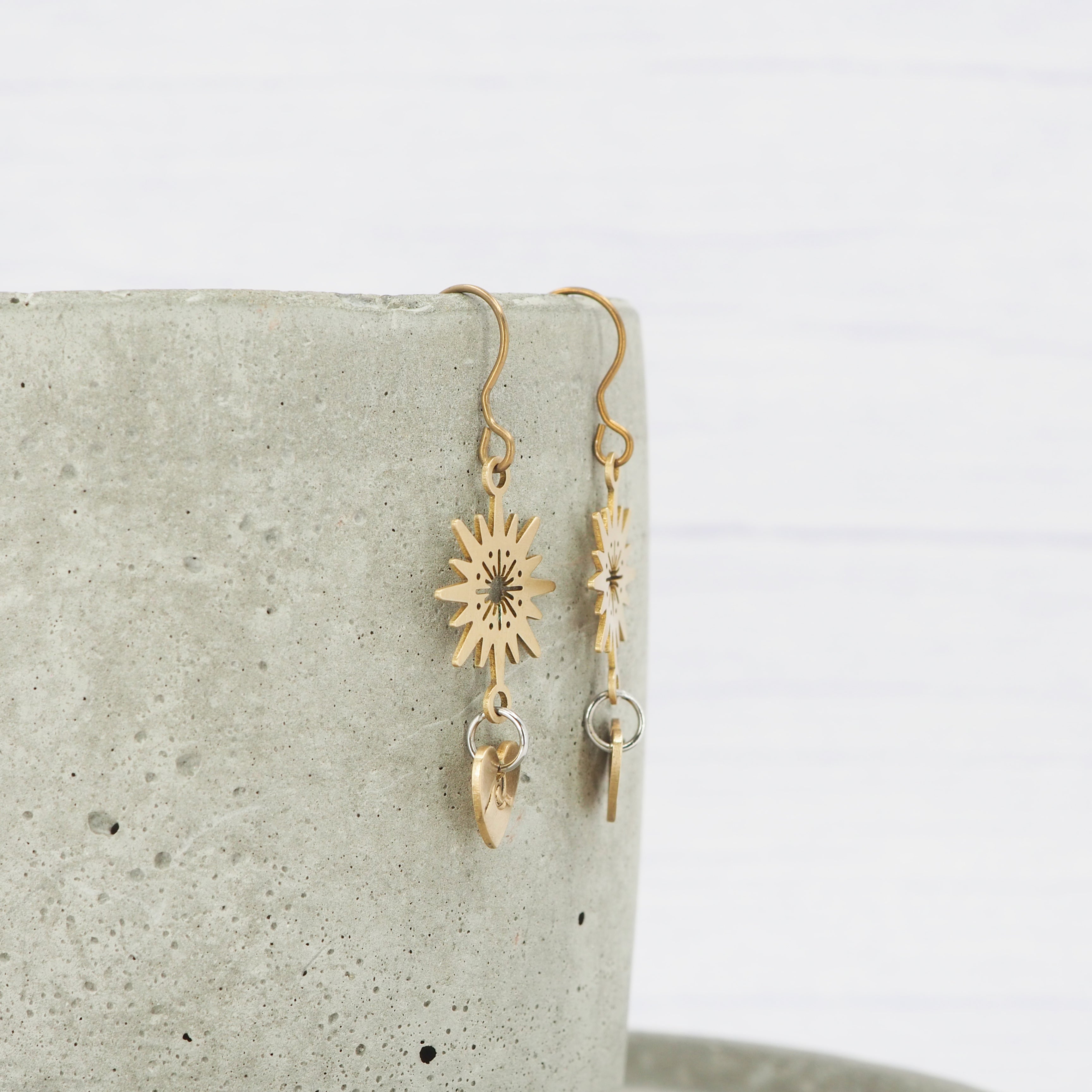 Brass Hand hammered sunburst, heart, wave stamped dangle earrings