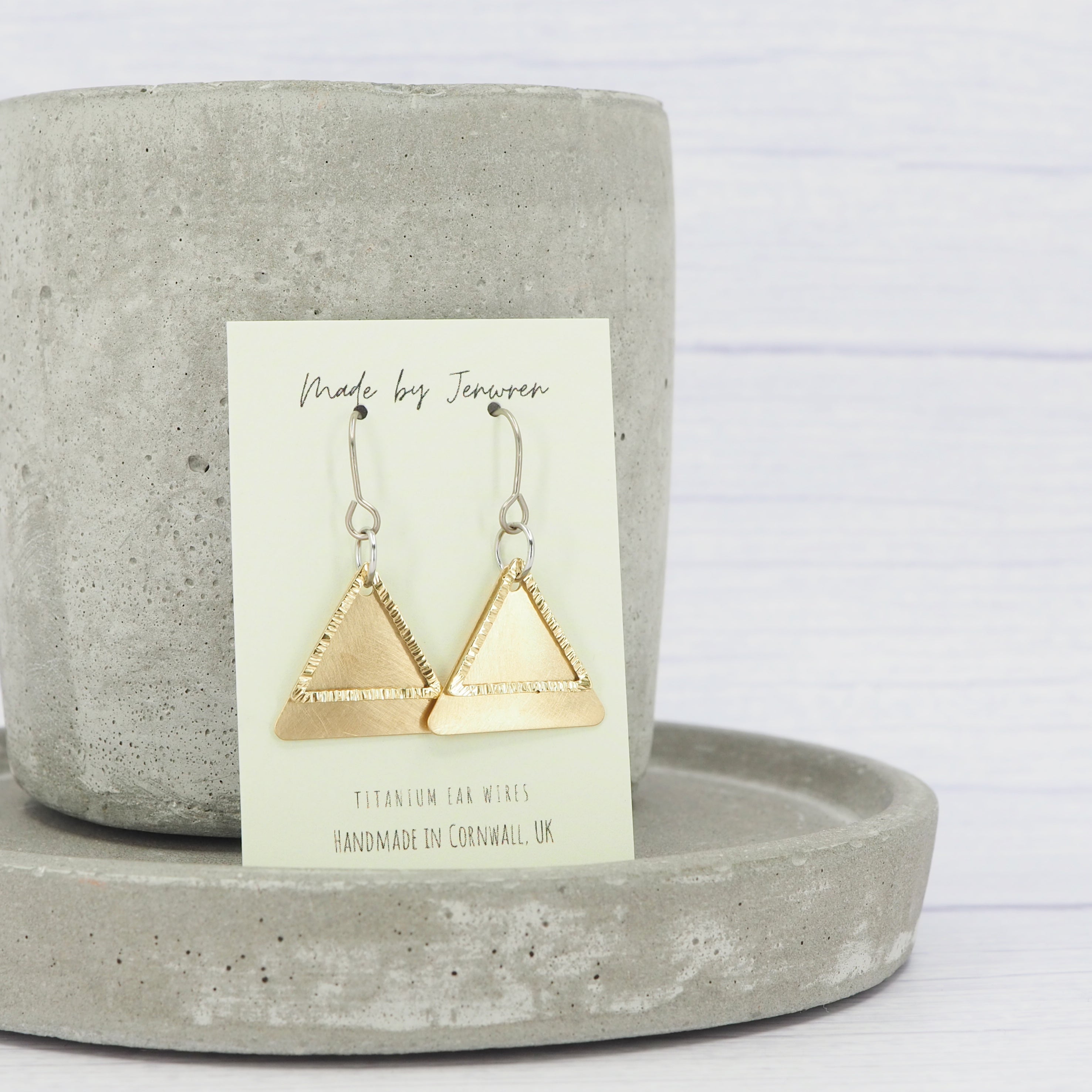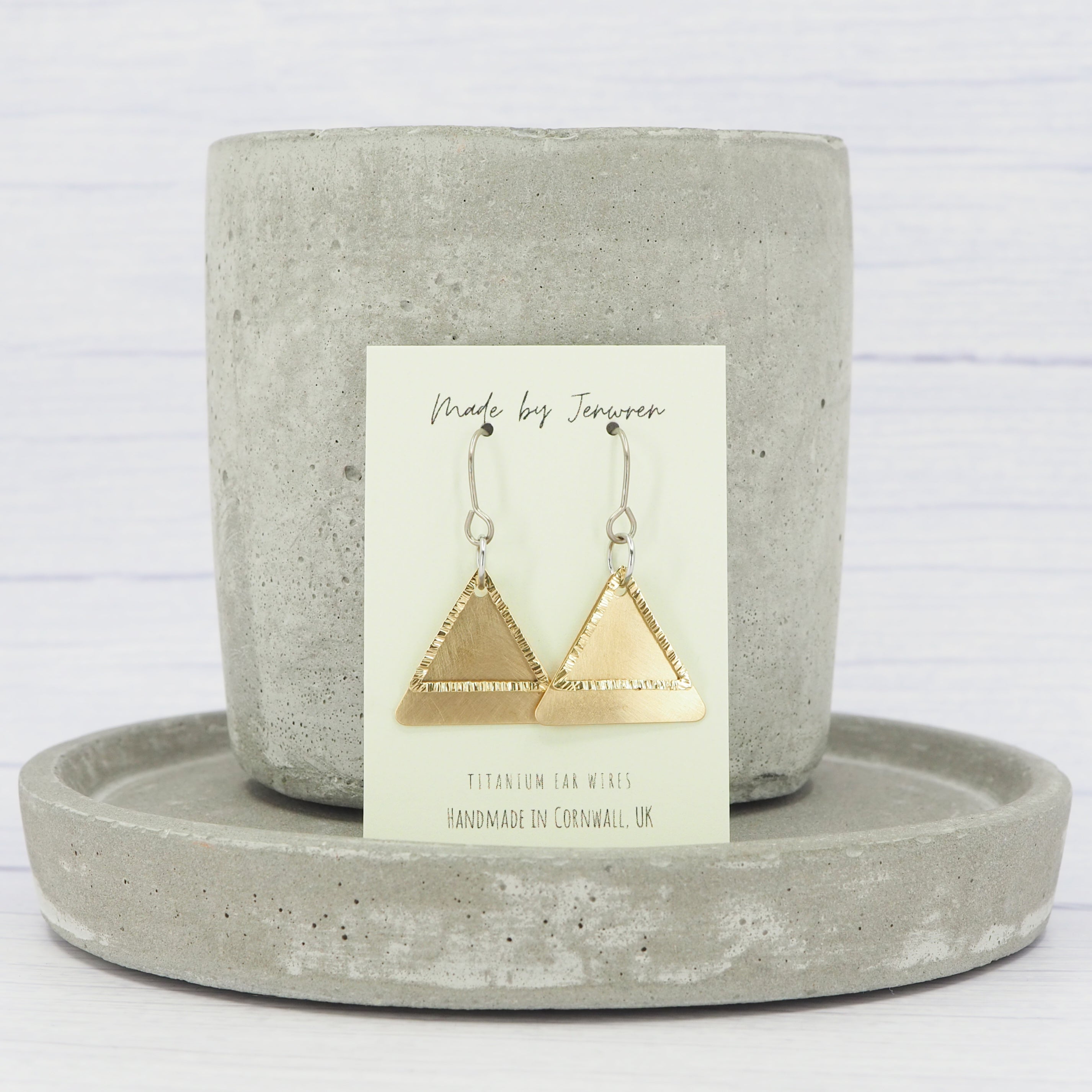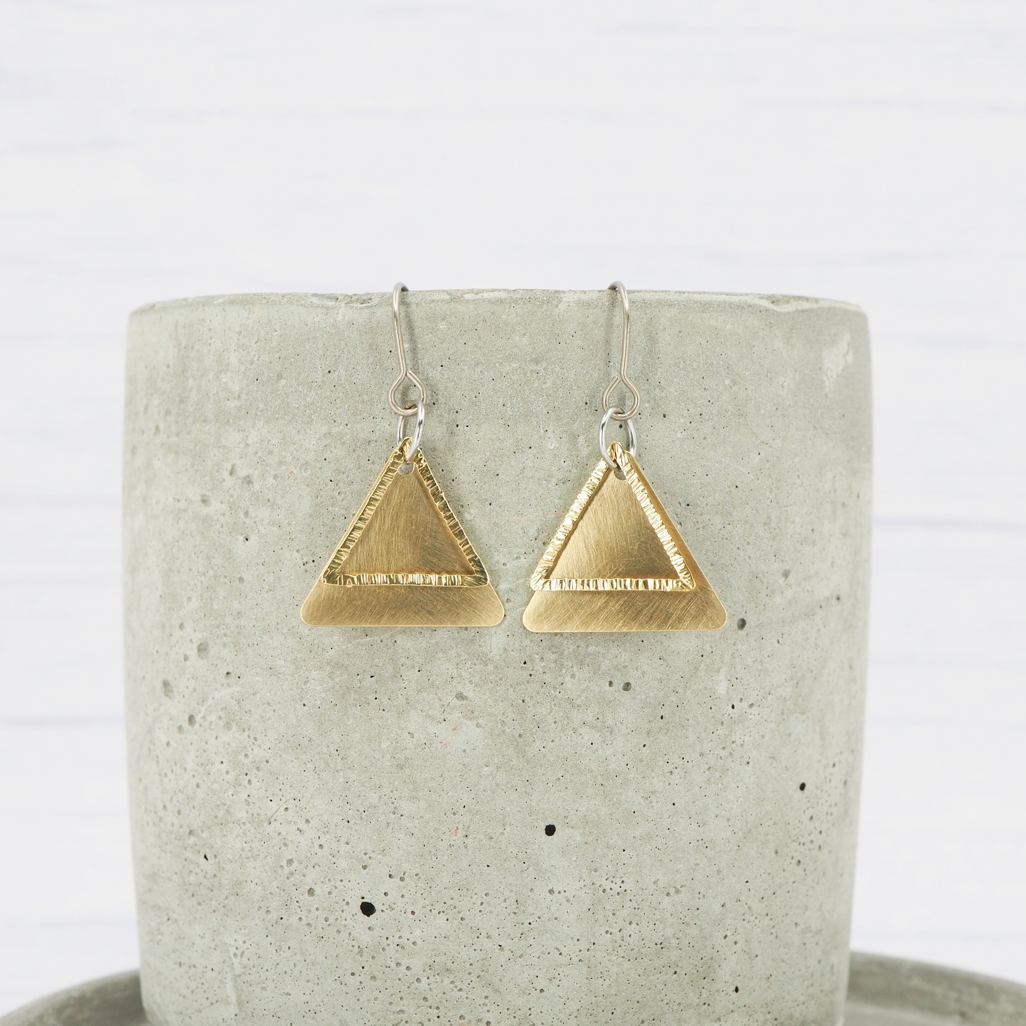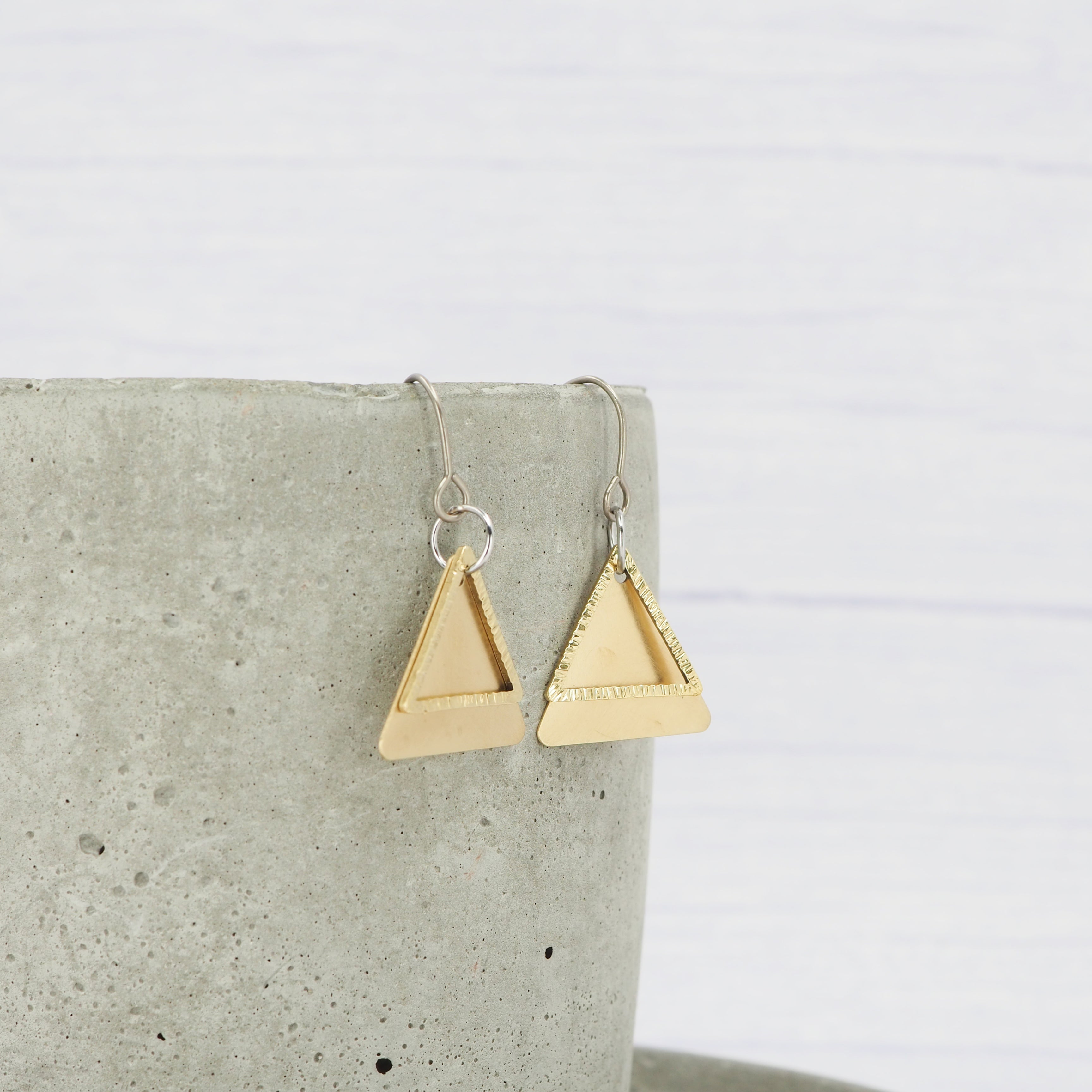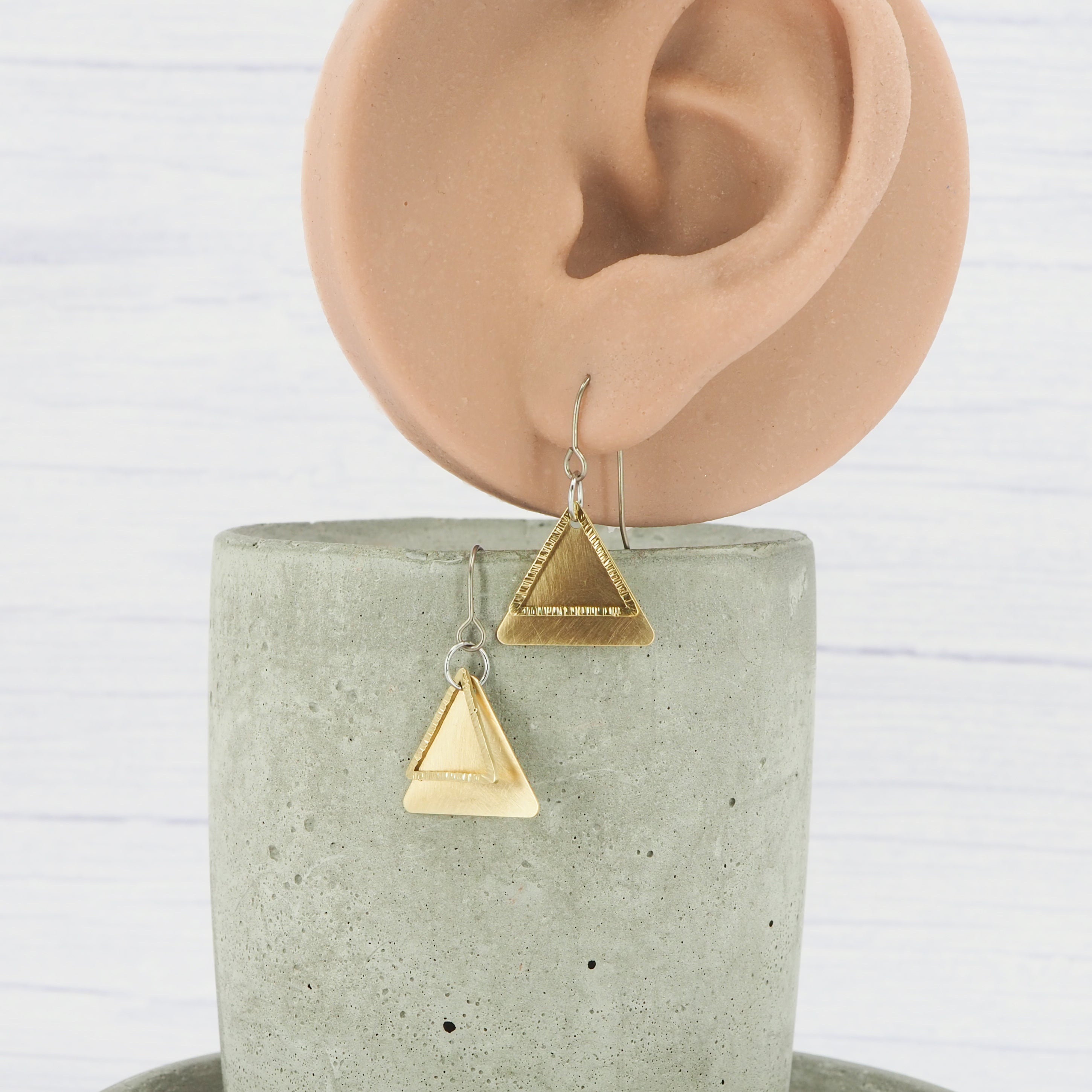 Double Brass hammered triangle dangle earrings. Great for all occasions.