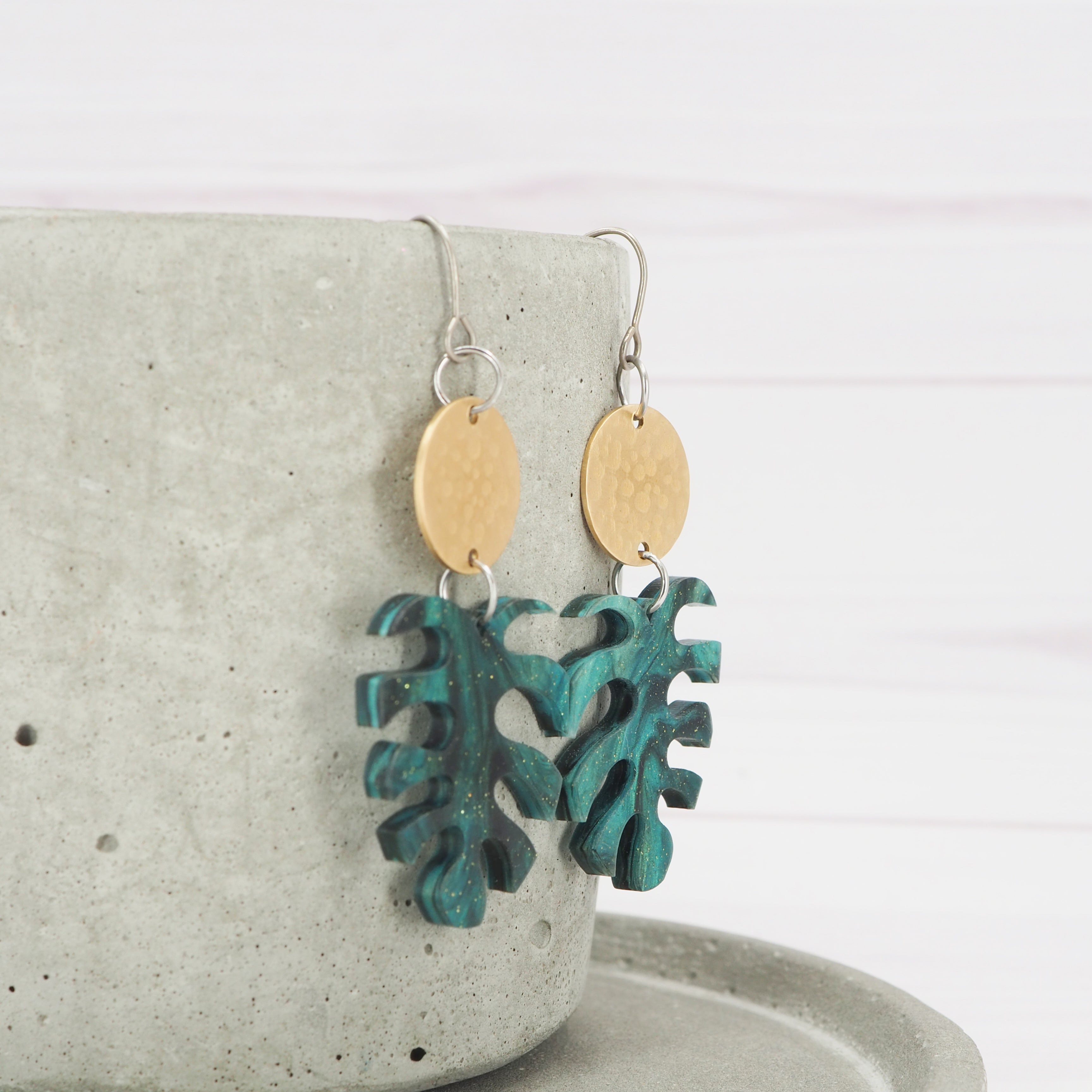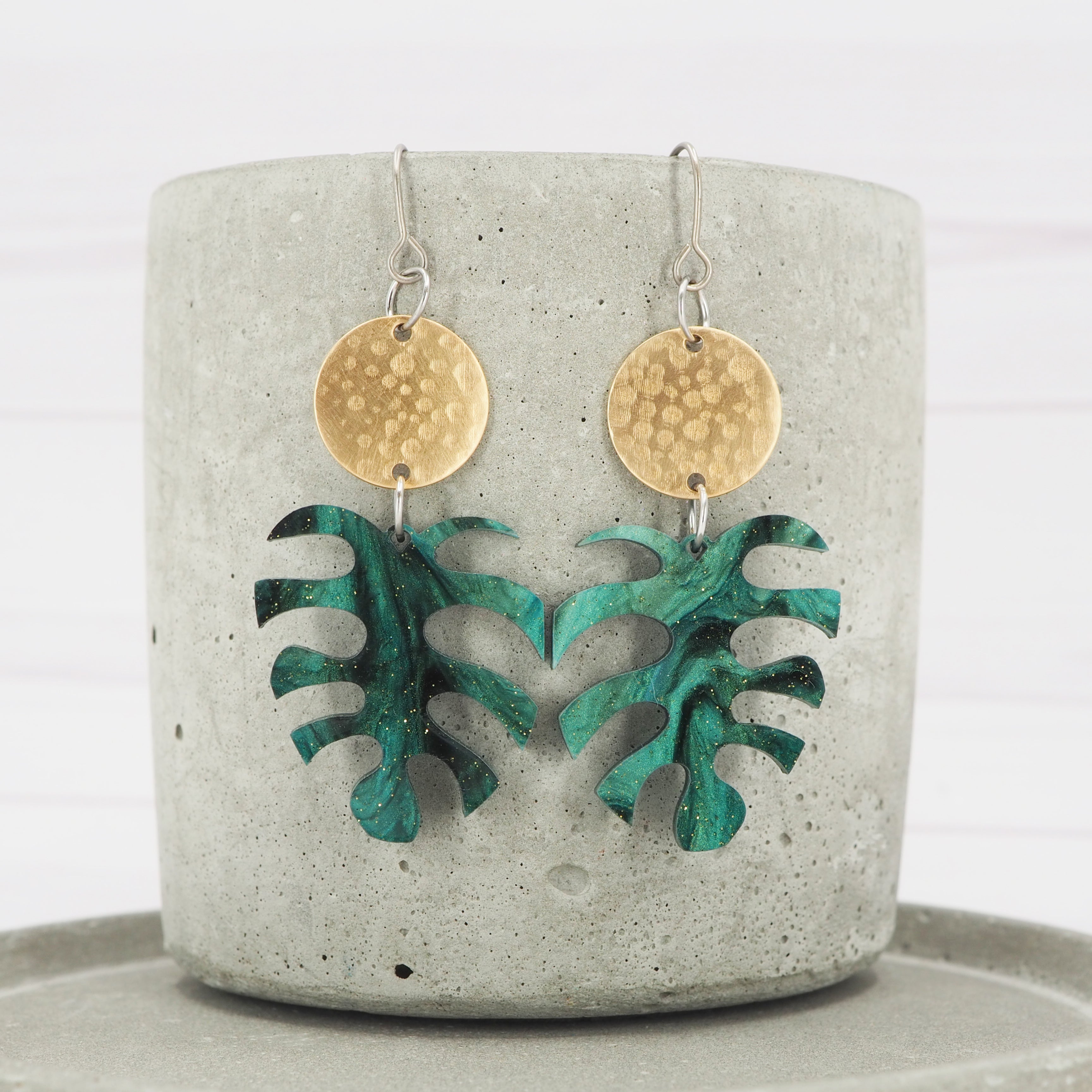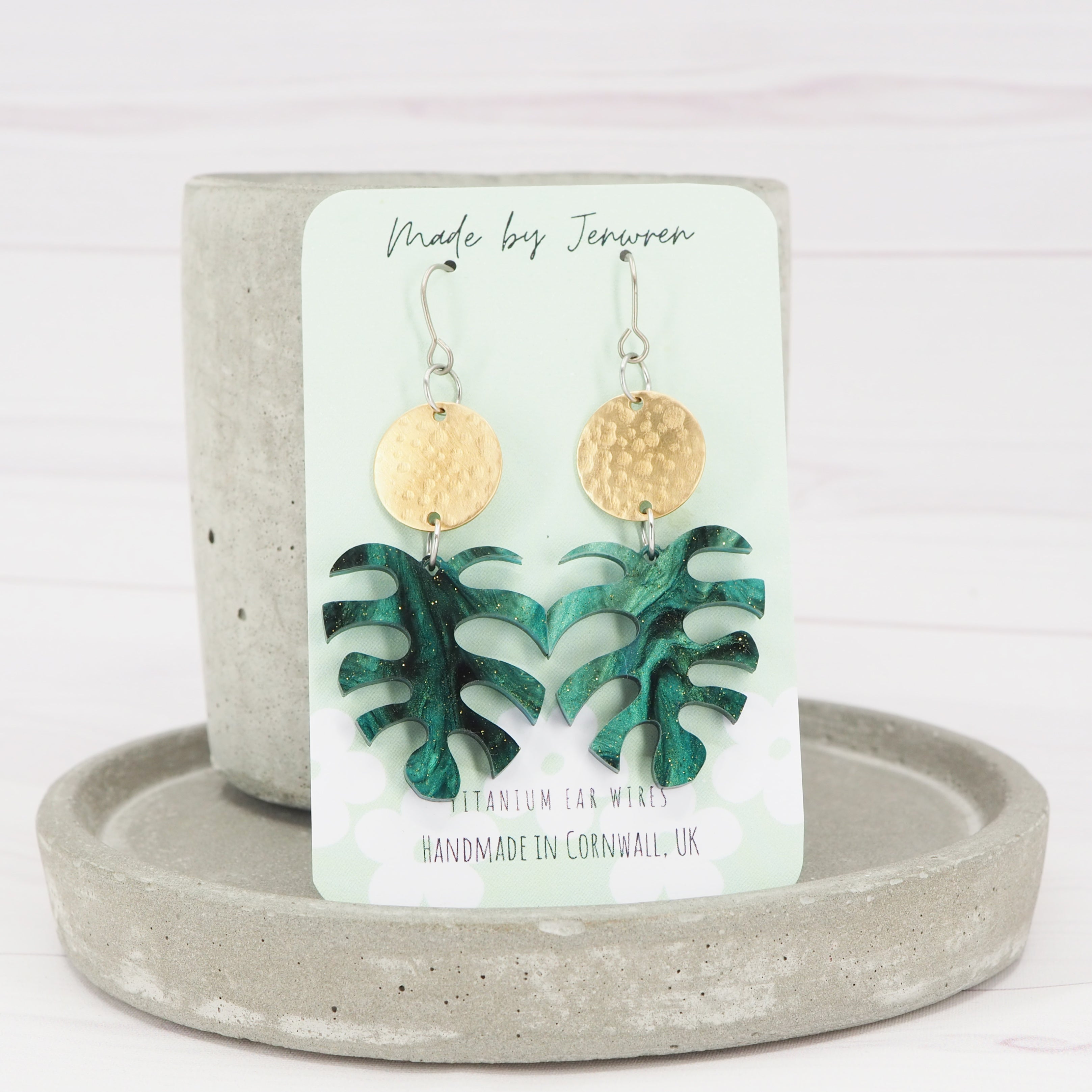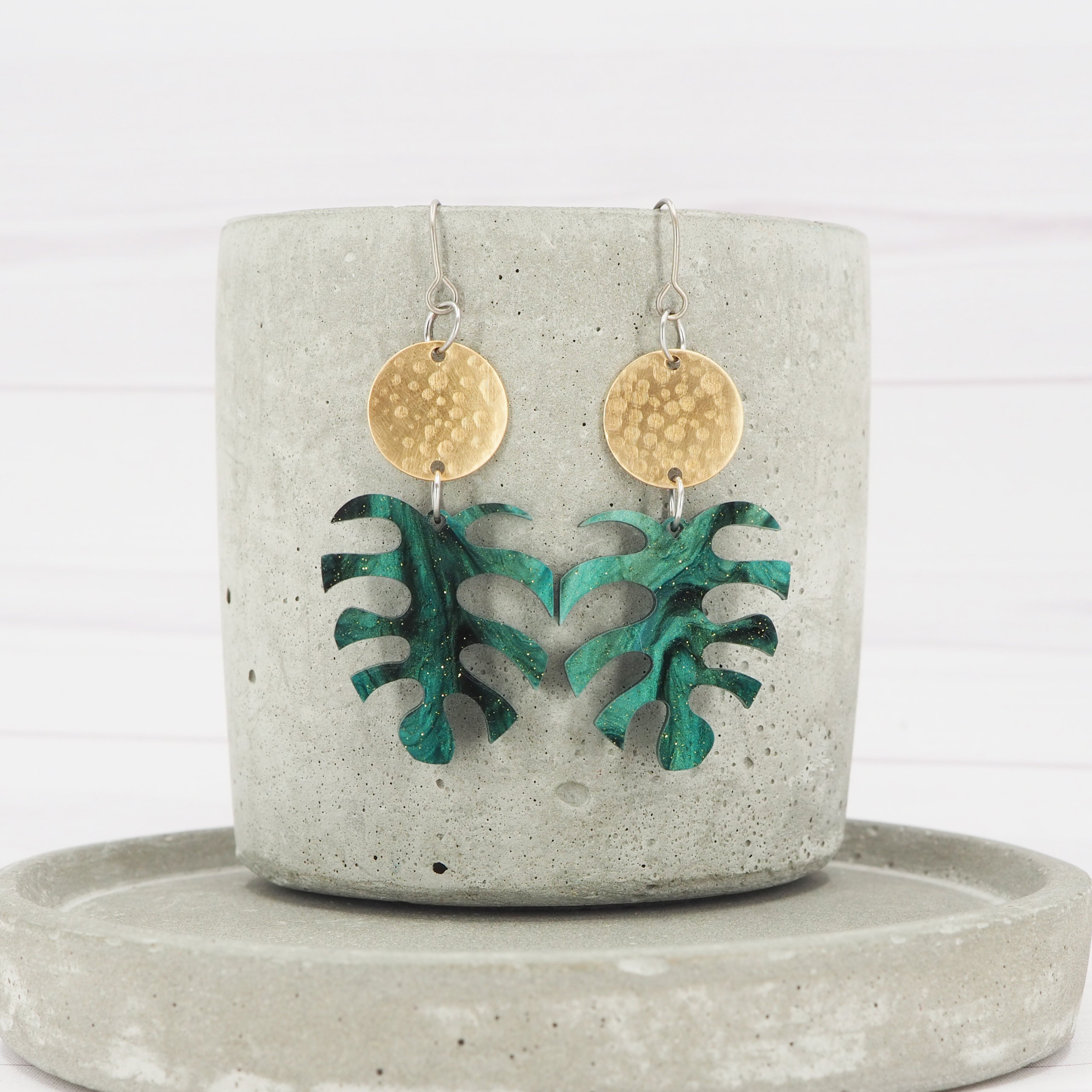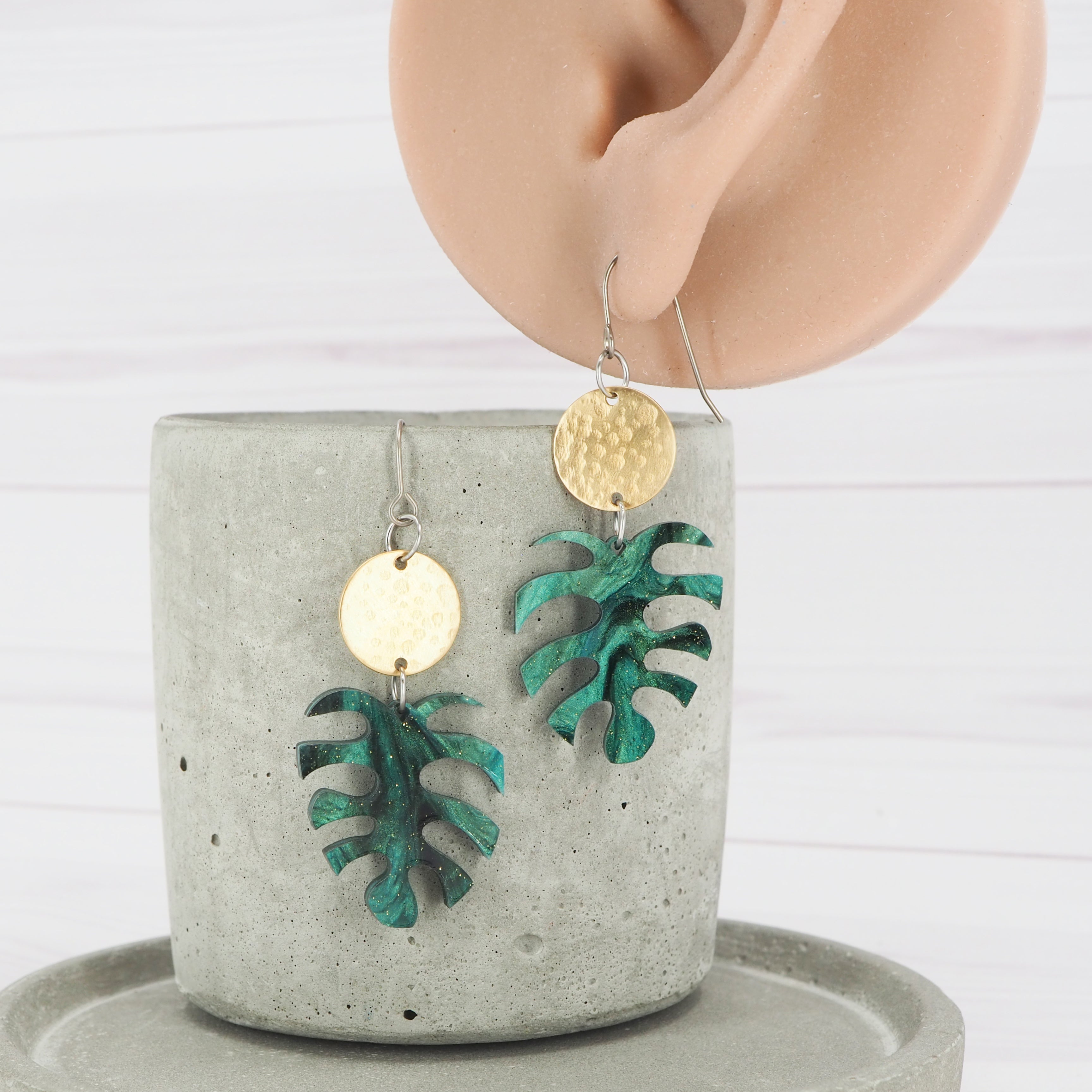Green galaxy acrylic Monstera leaf dangle earrings.