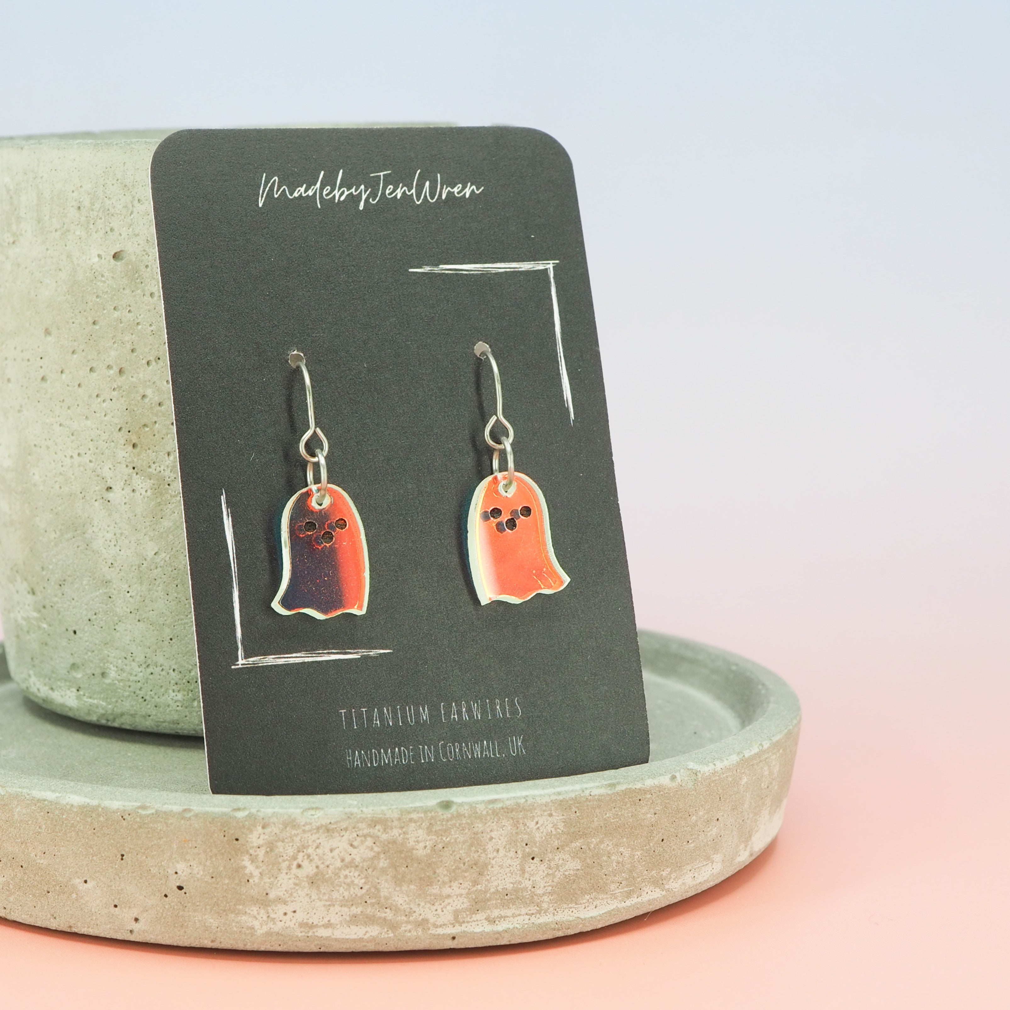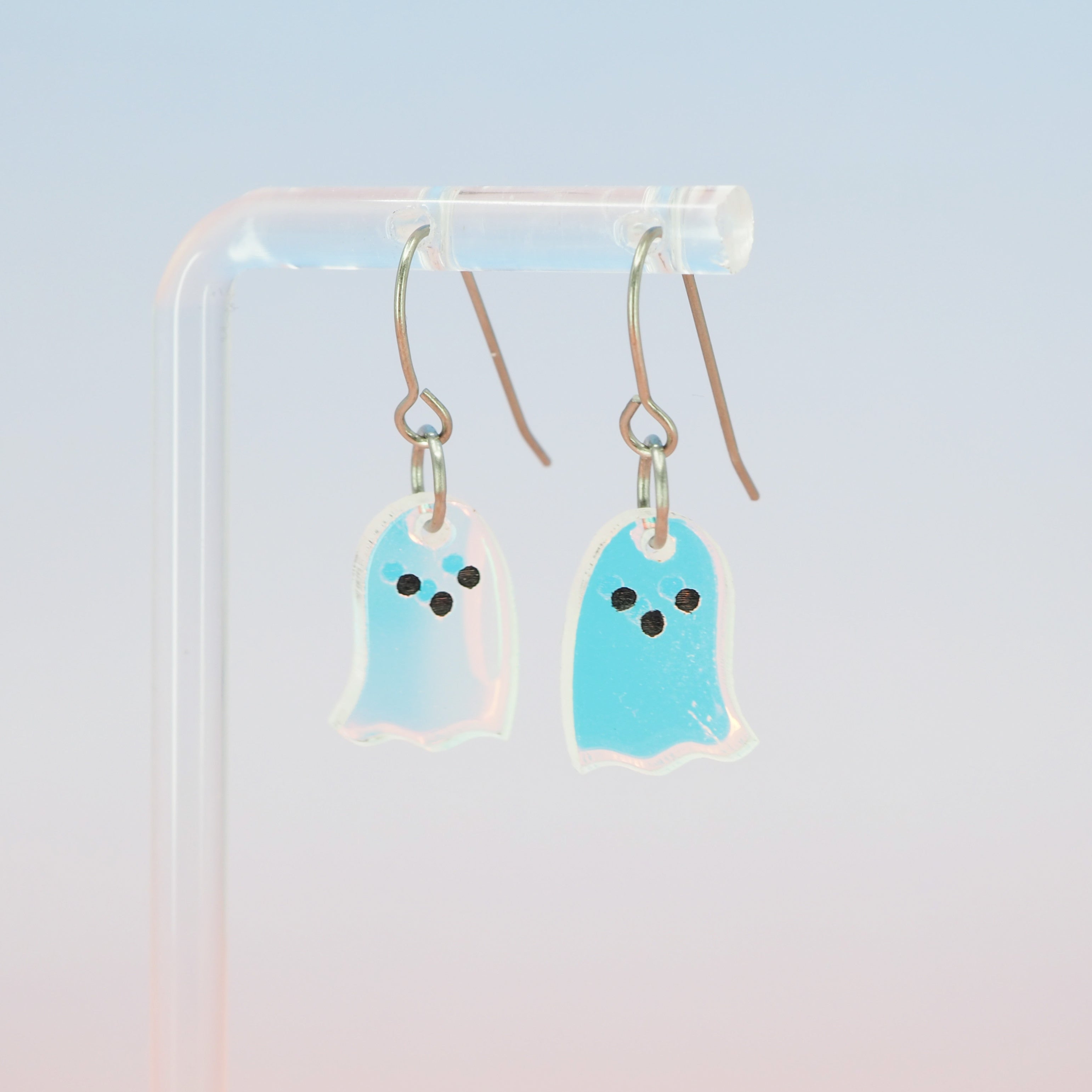Acrylic iridescent ghost dangles with Grade 1 titanium ear wires.