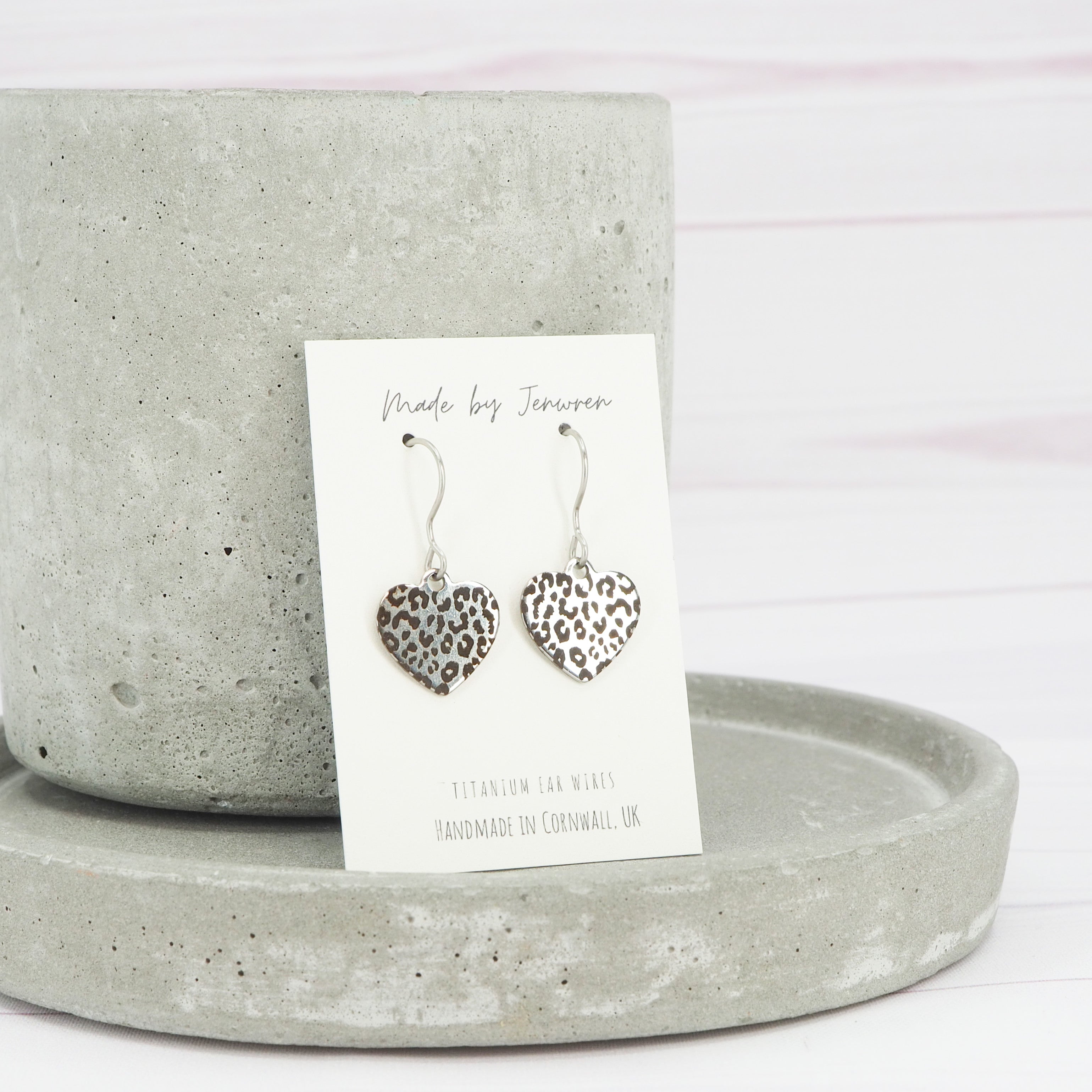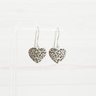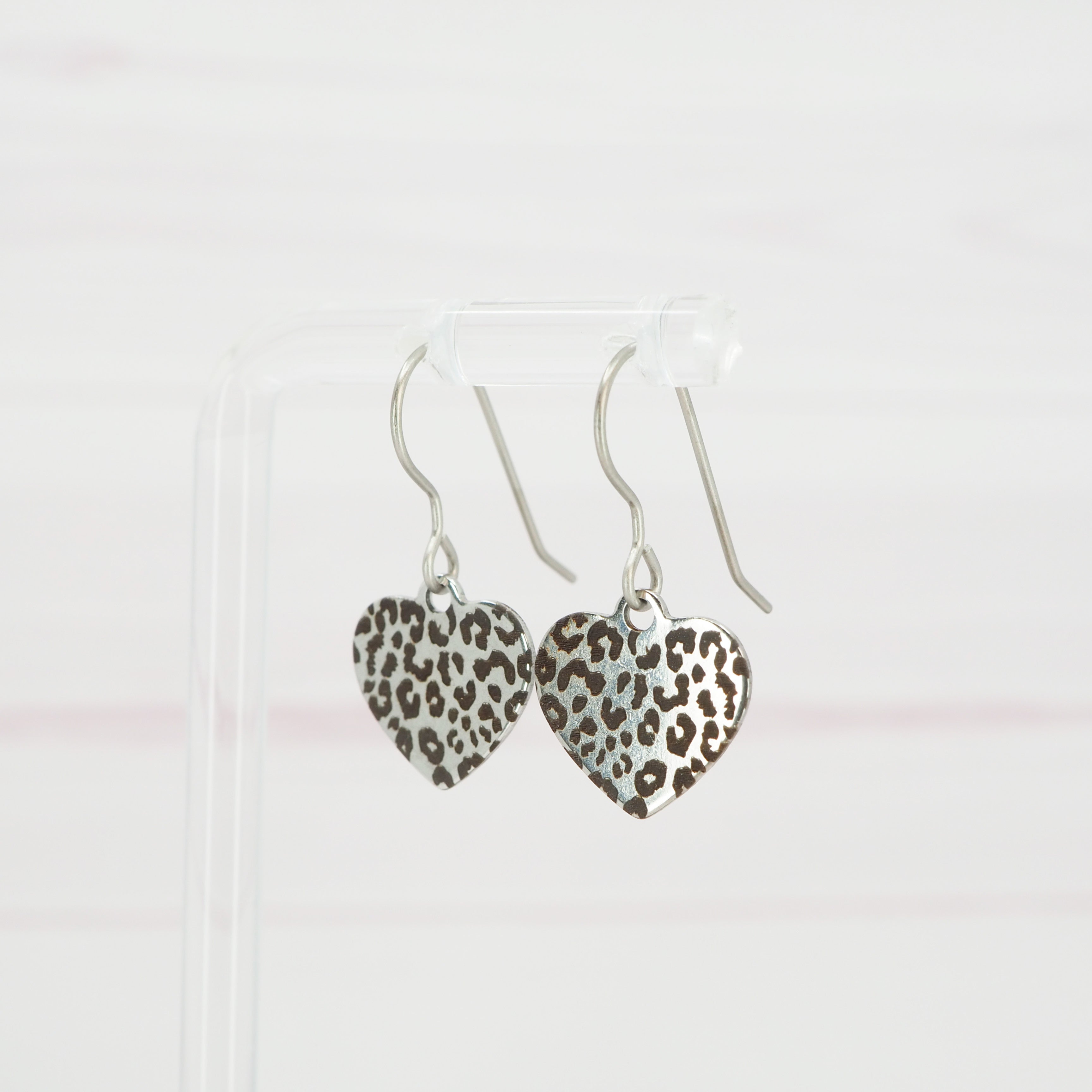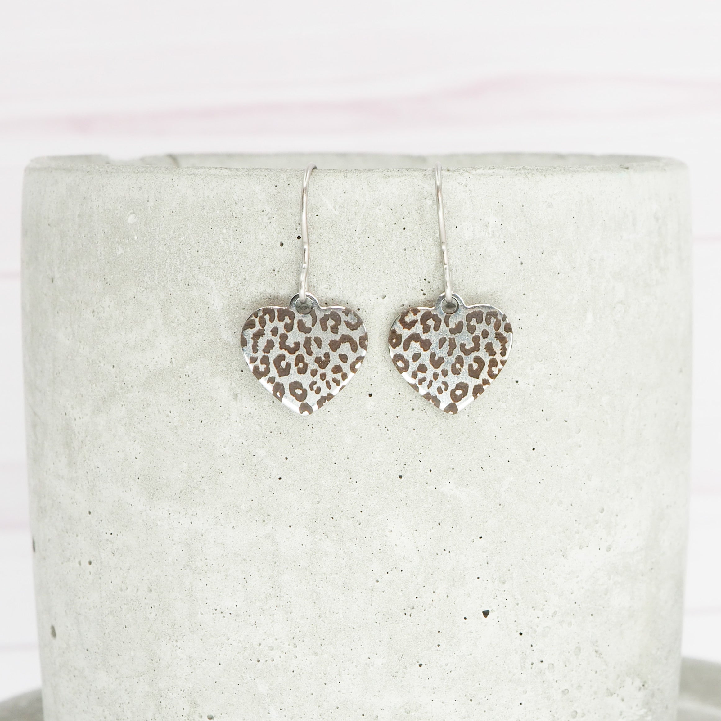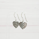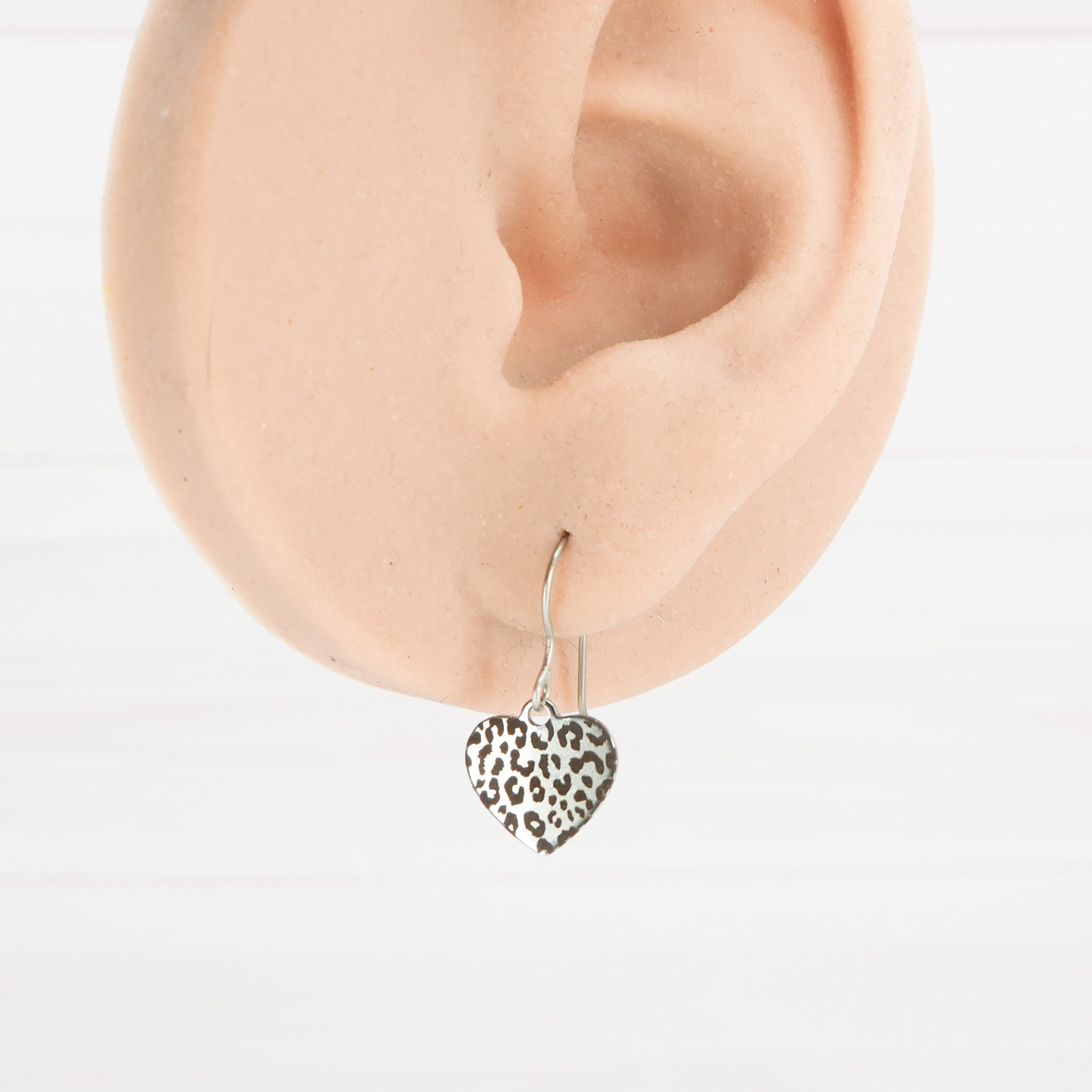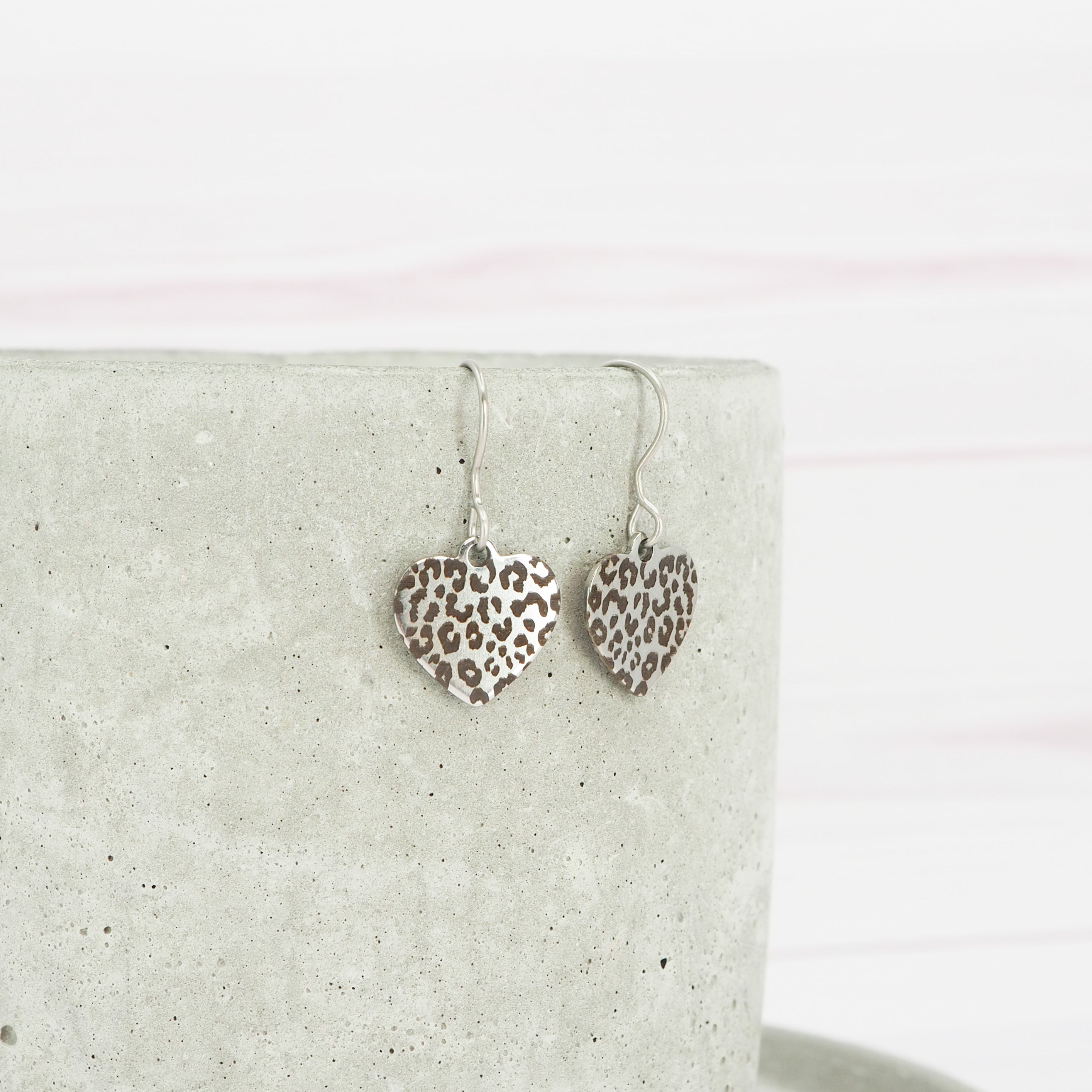 Leopard print etched stainless steel heart dangle earrings.