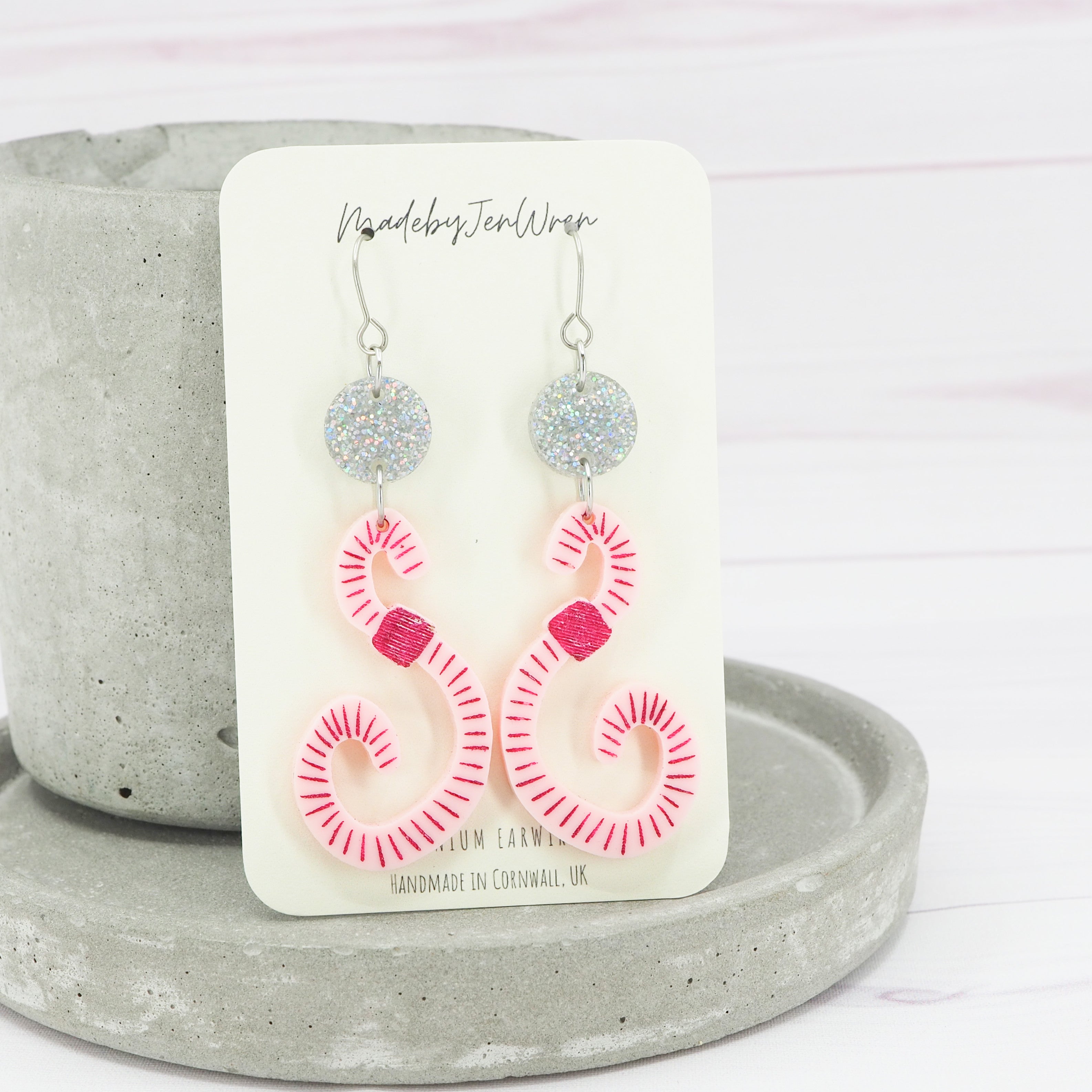The earrings have a total drop length of 2.75" (7cm) from the top of the ear wire to the bottom of the Worms.