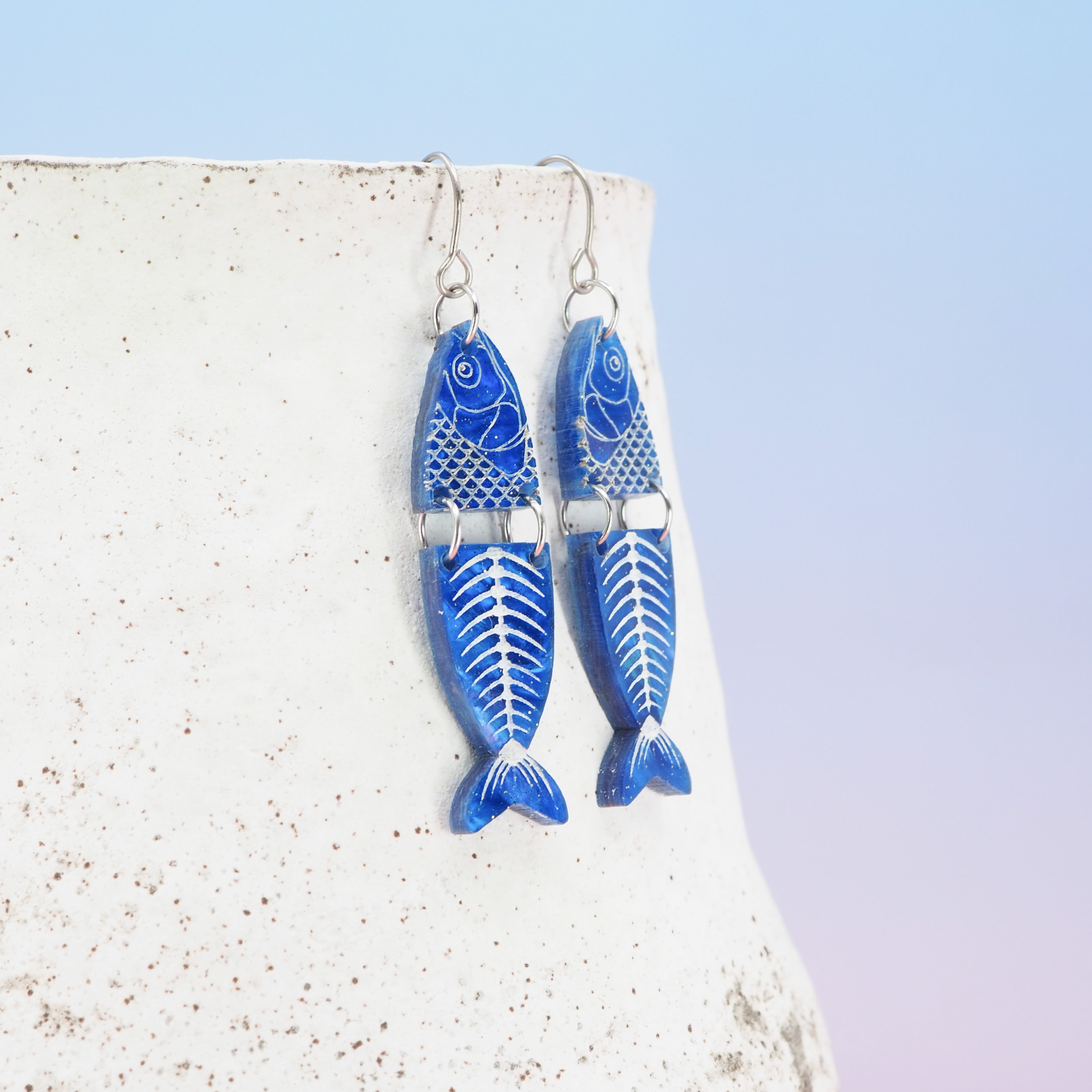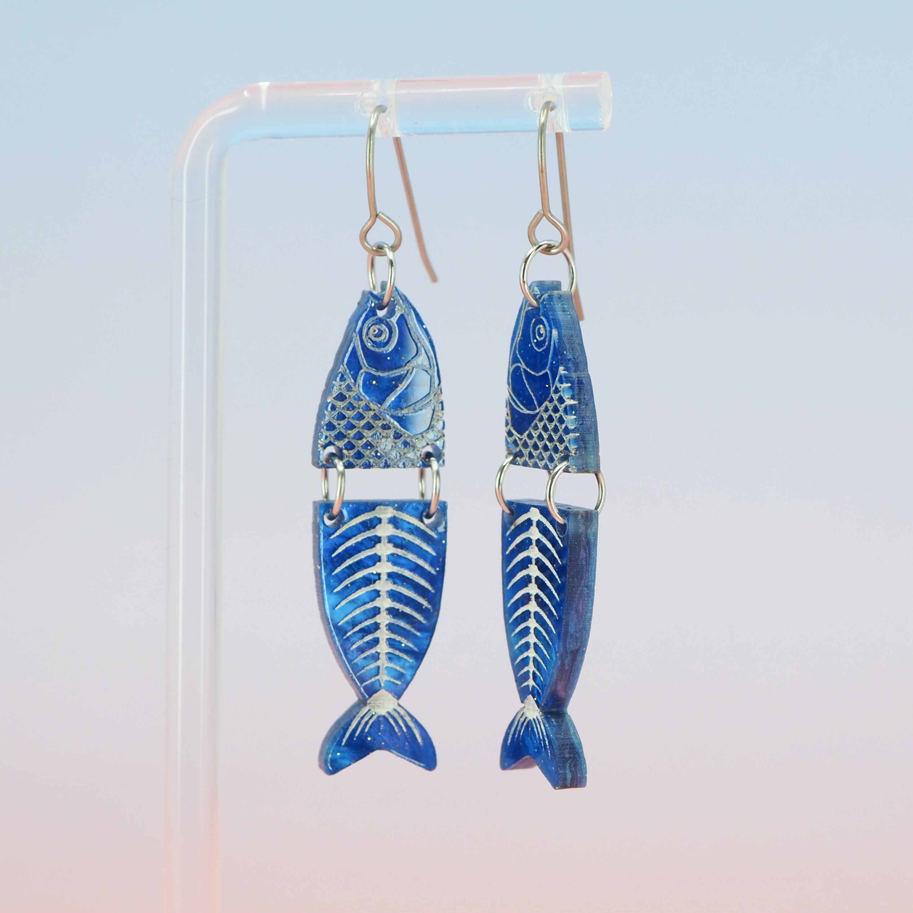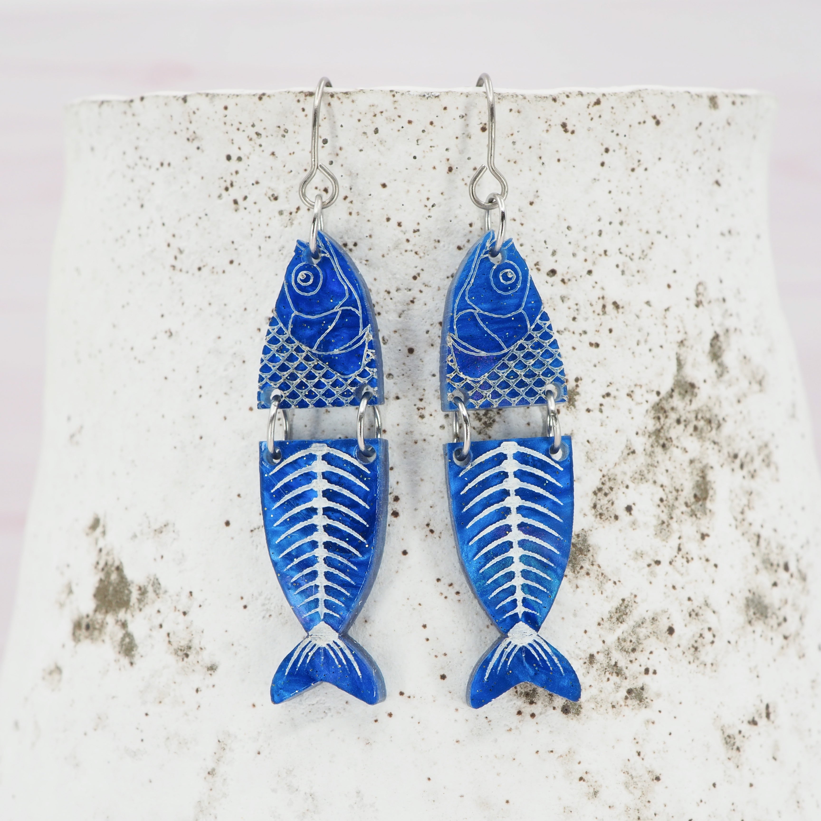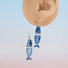 Marbled blue glitter fish dangle earrings