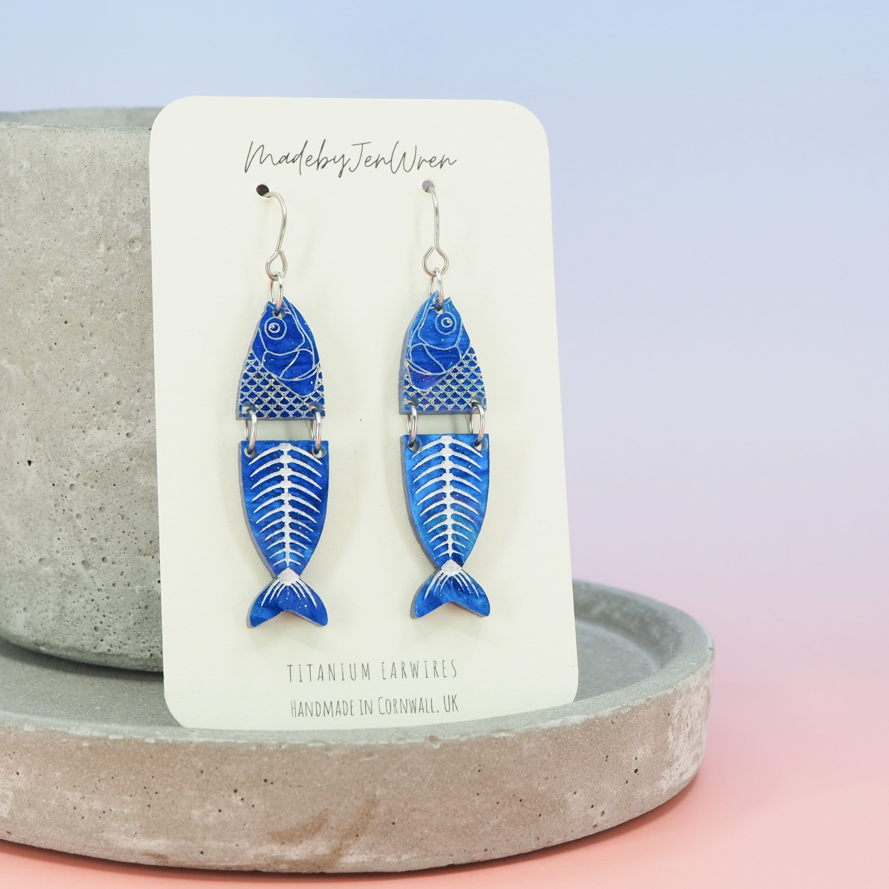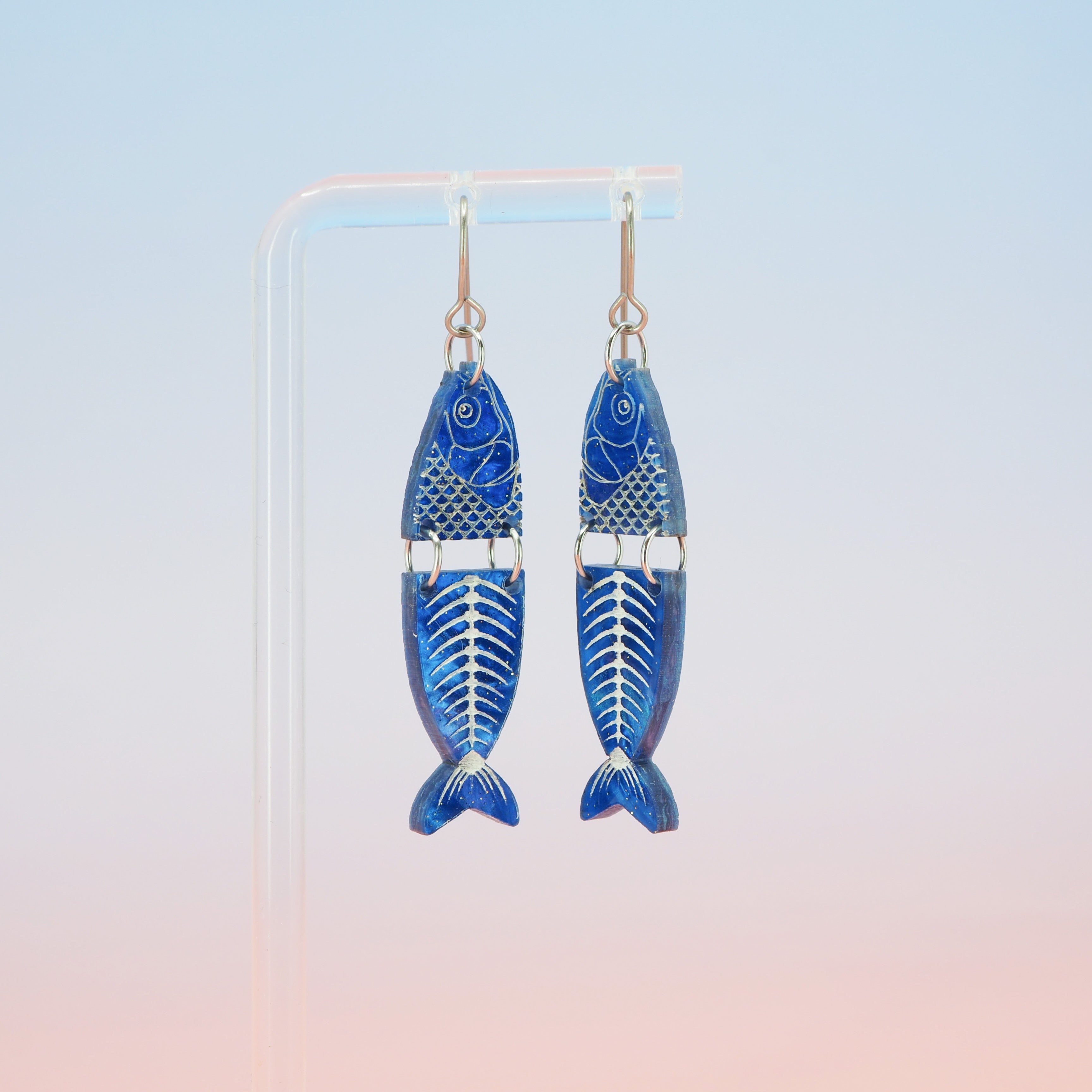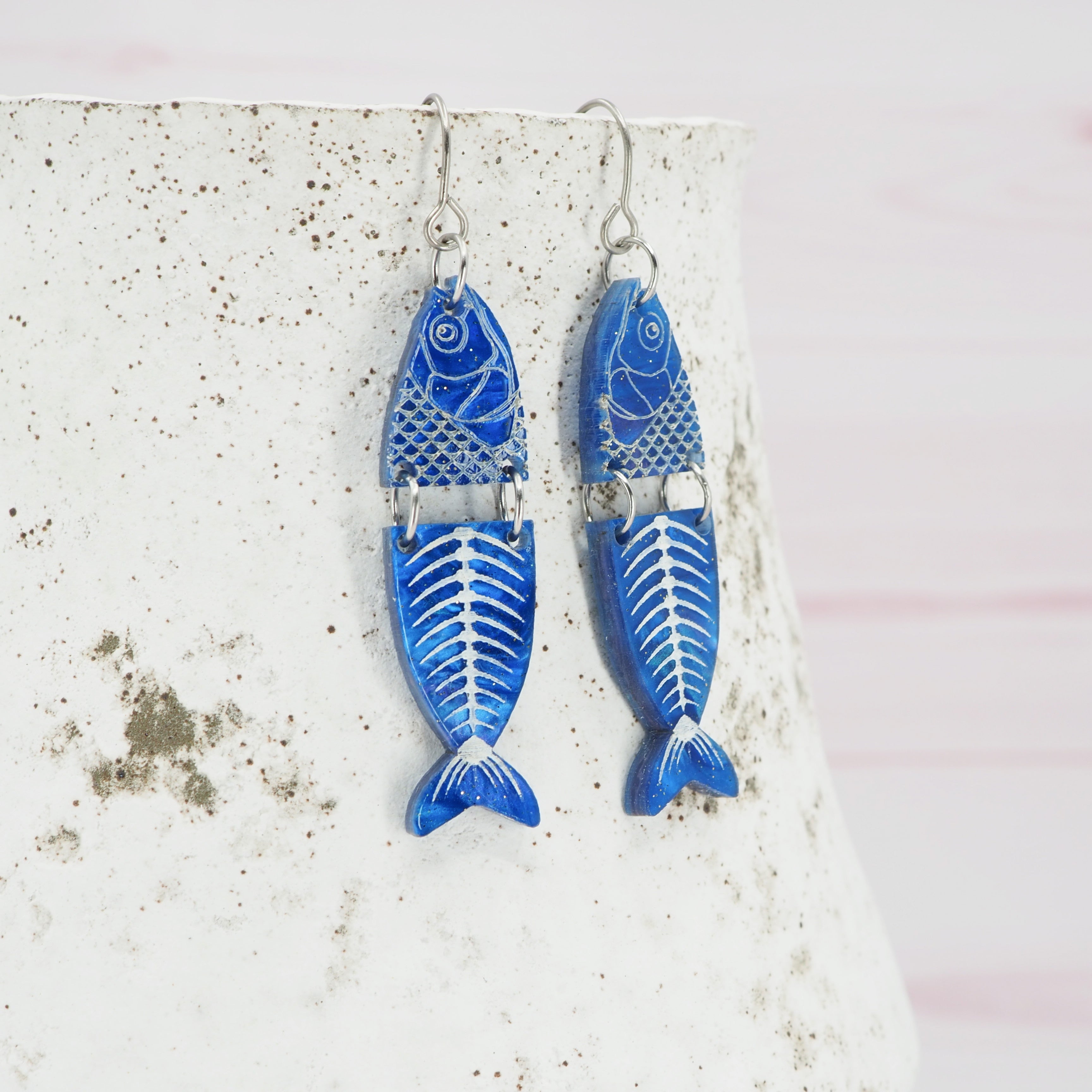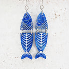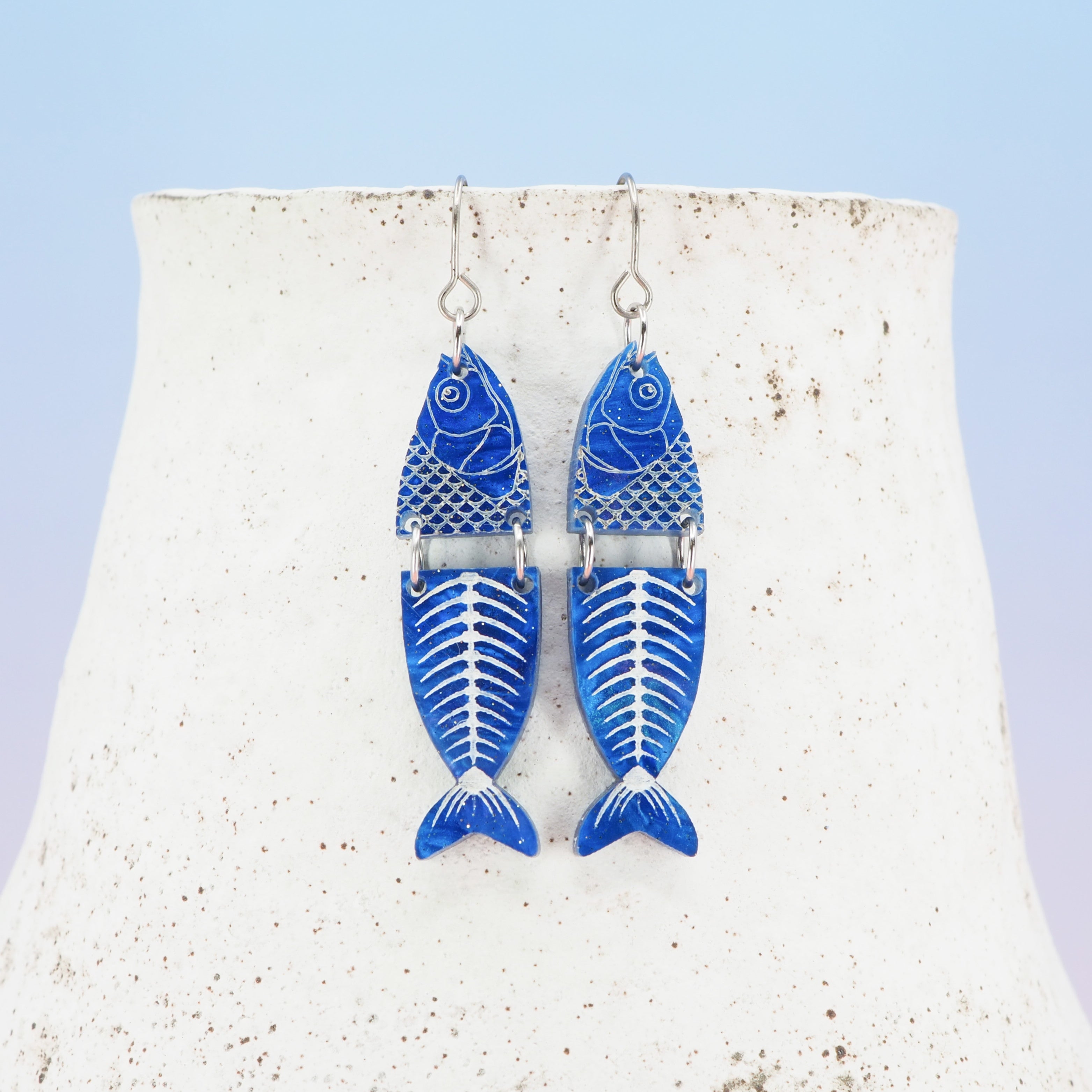 Marbled blue glitter fish dangle earrings