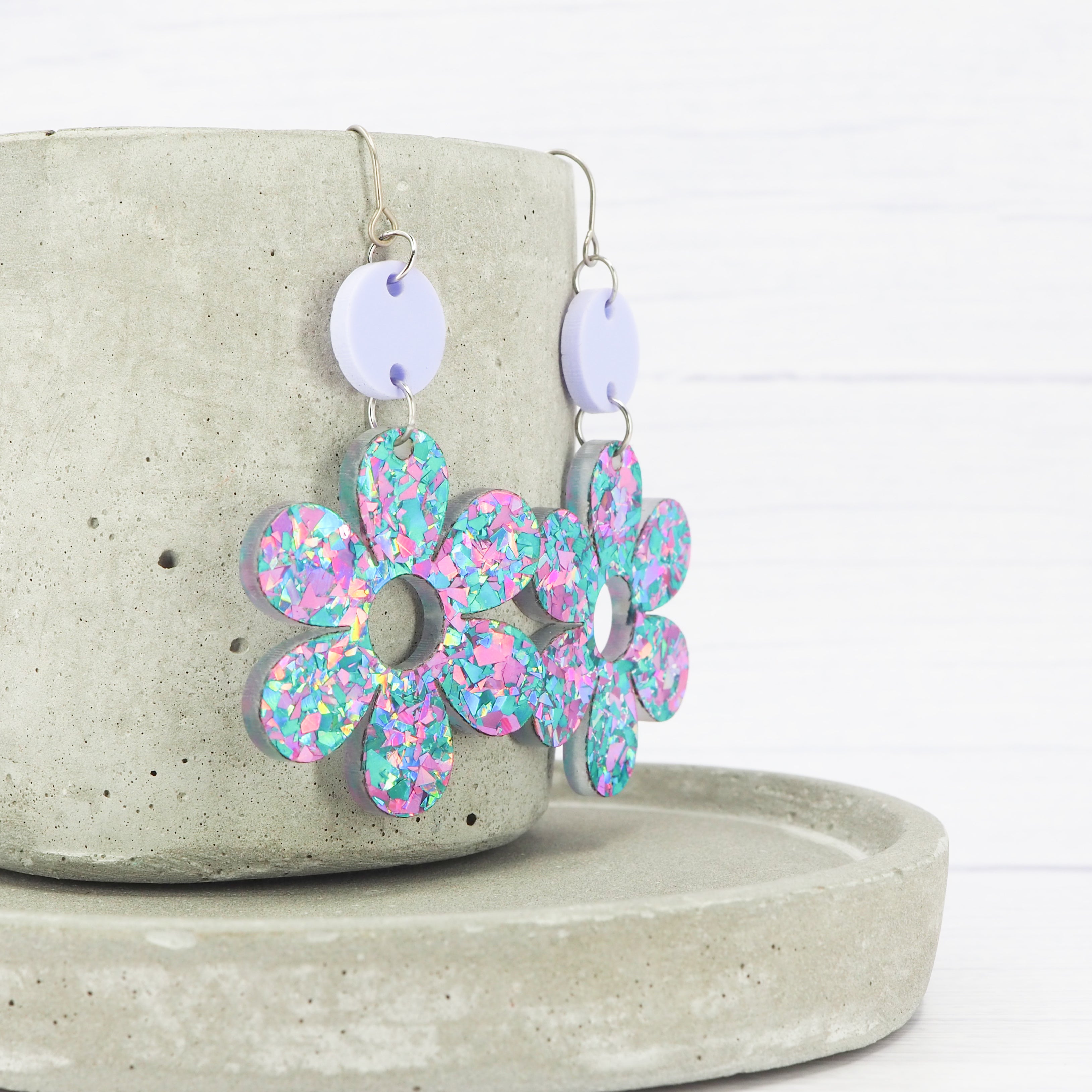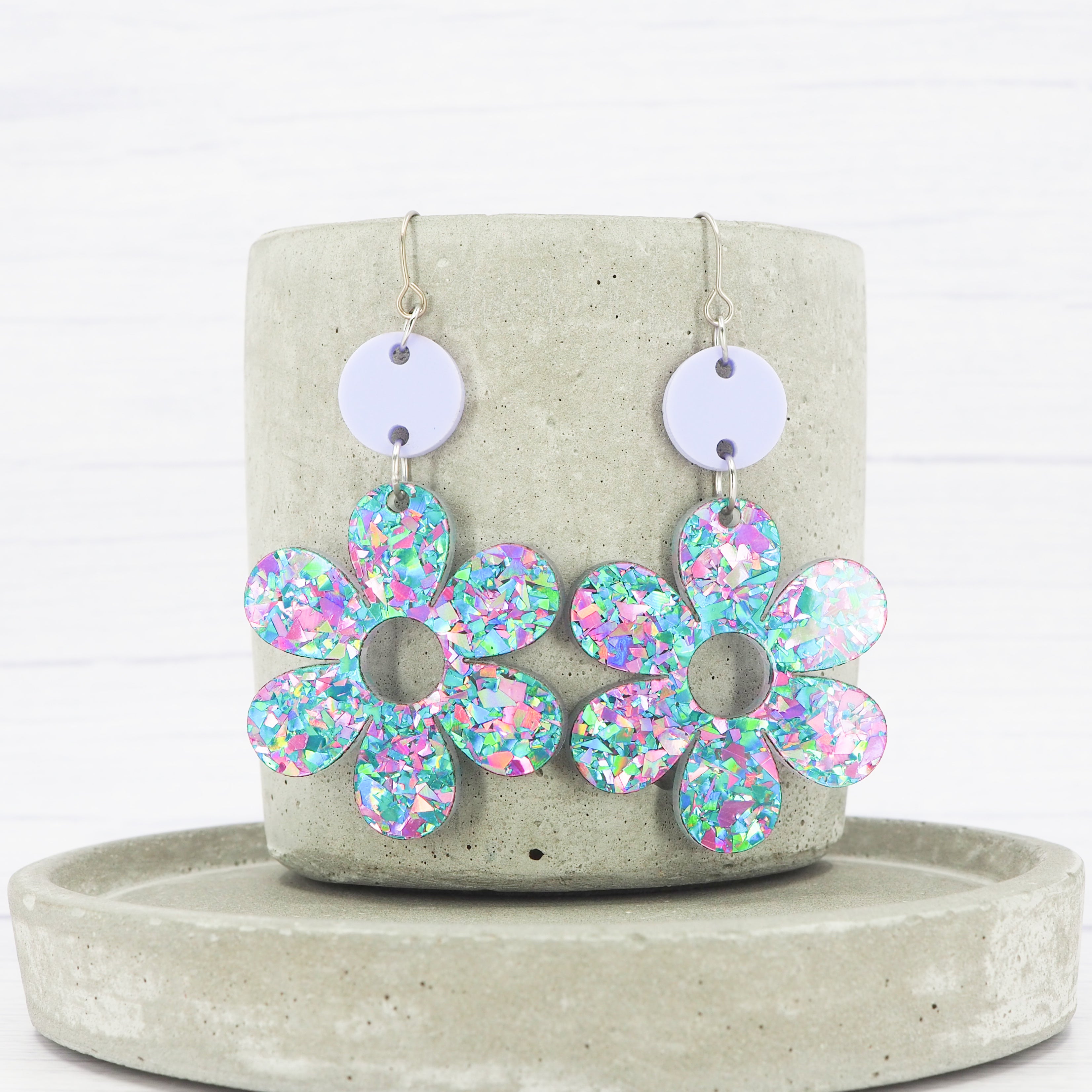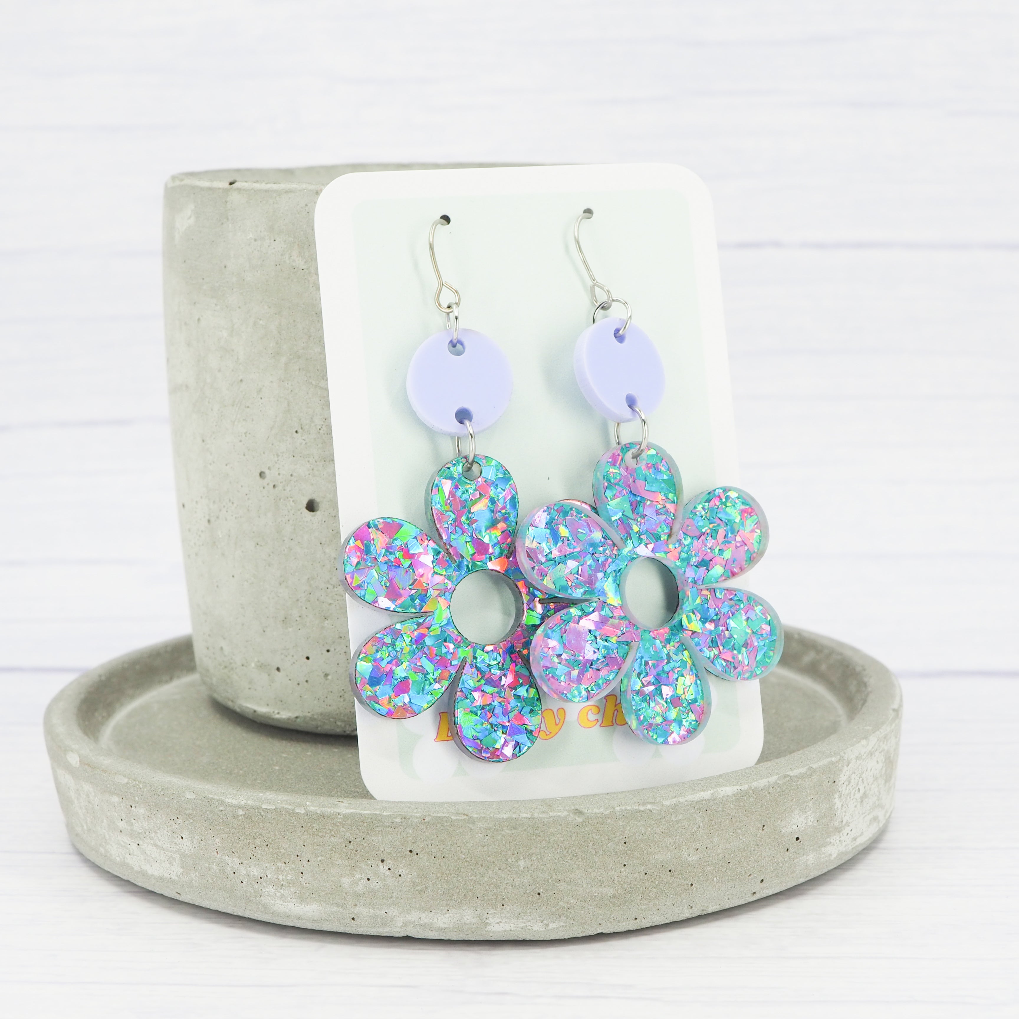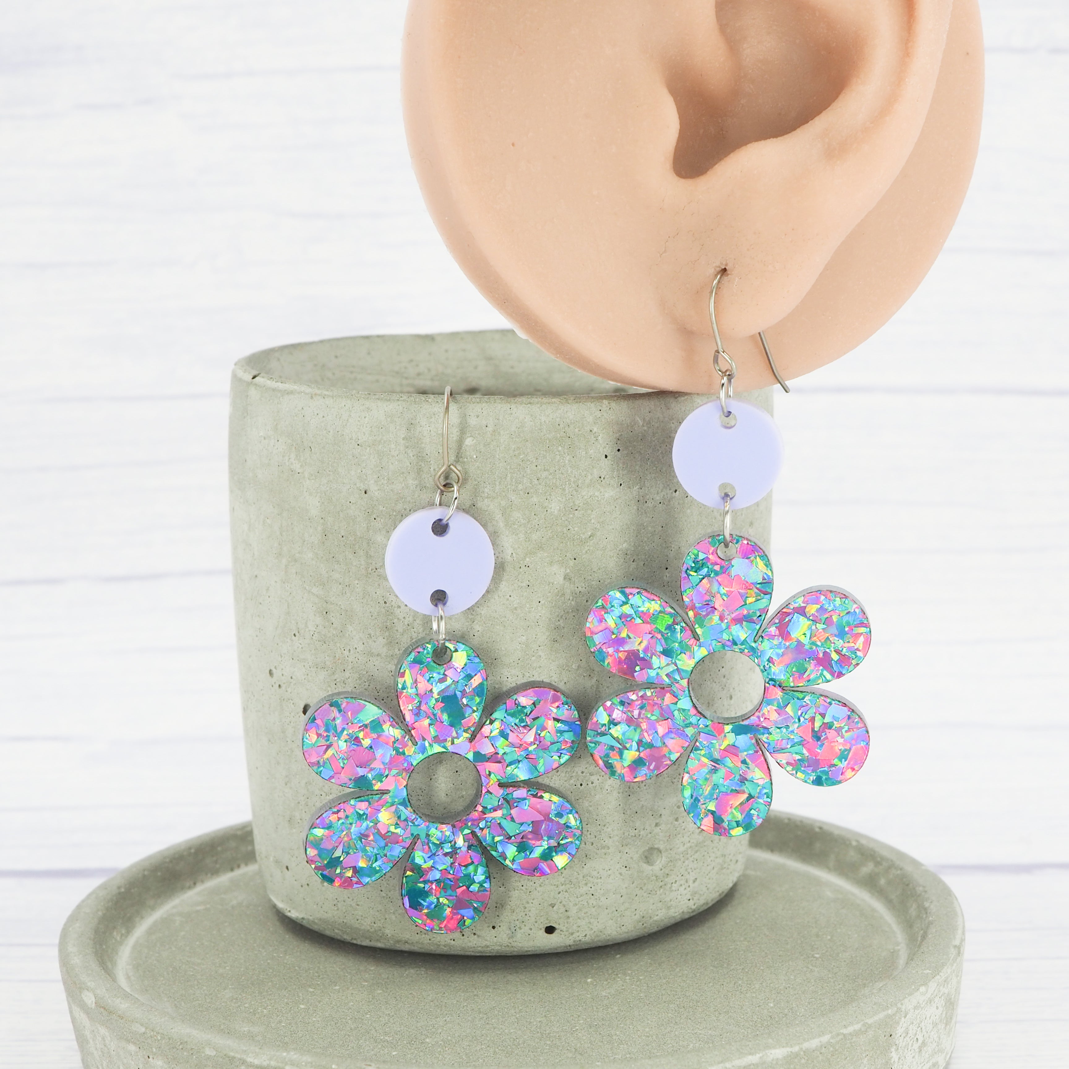 The earrings have a total drop length of 2.9" (7.3cm) from the top of the ear wire to the bottom of the flowers.