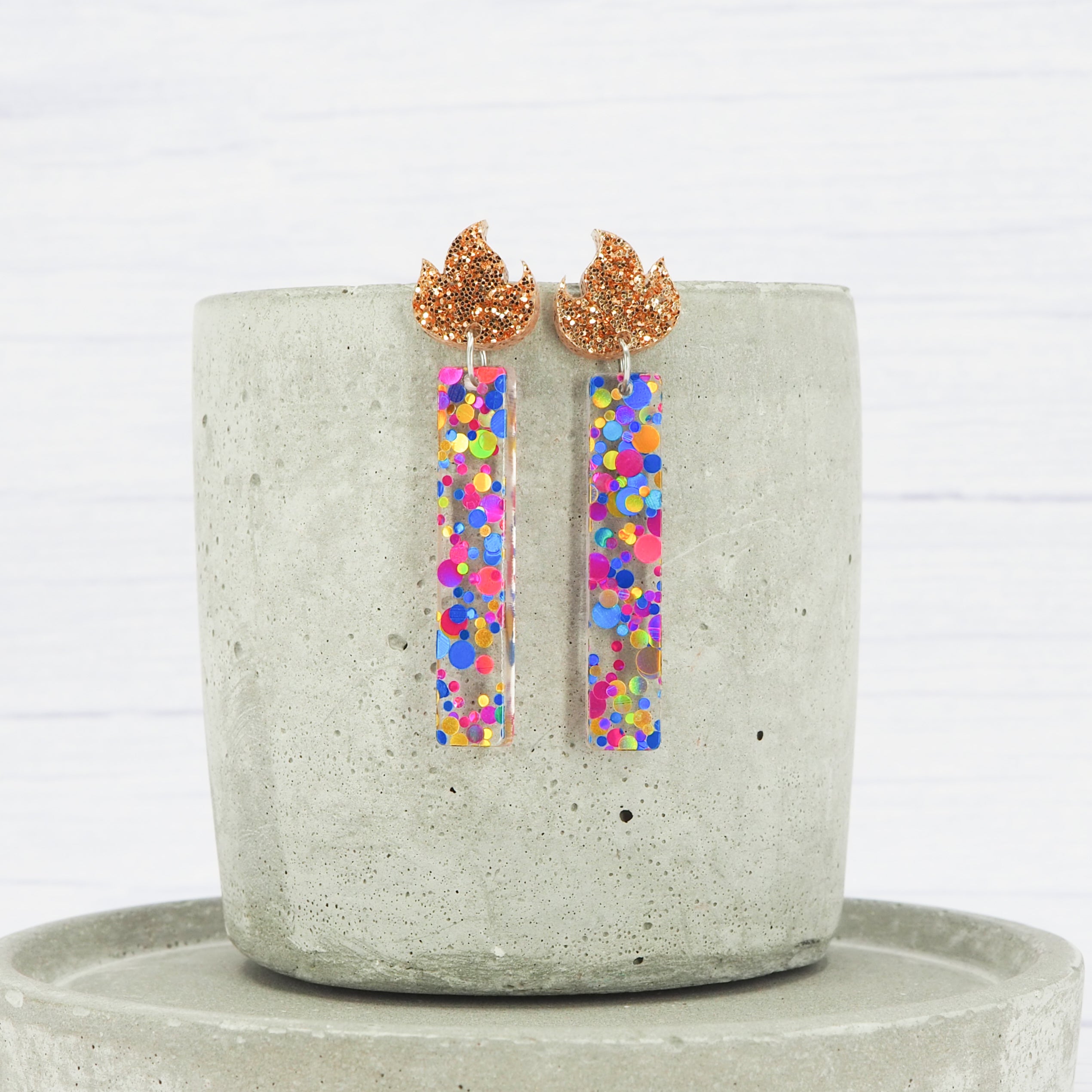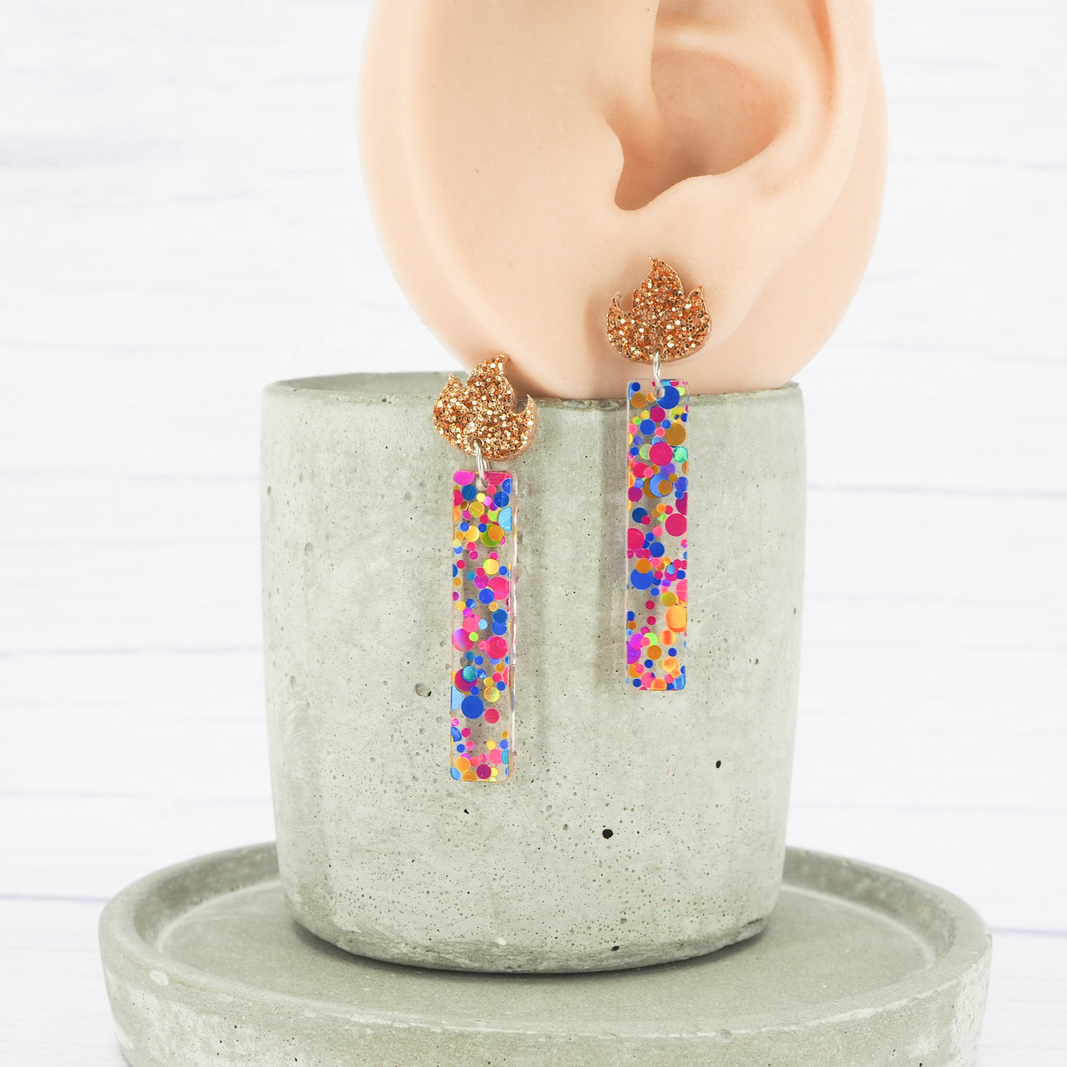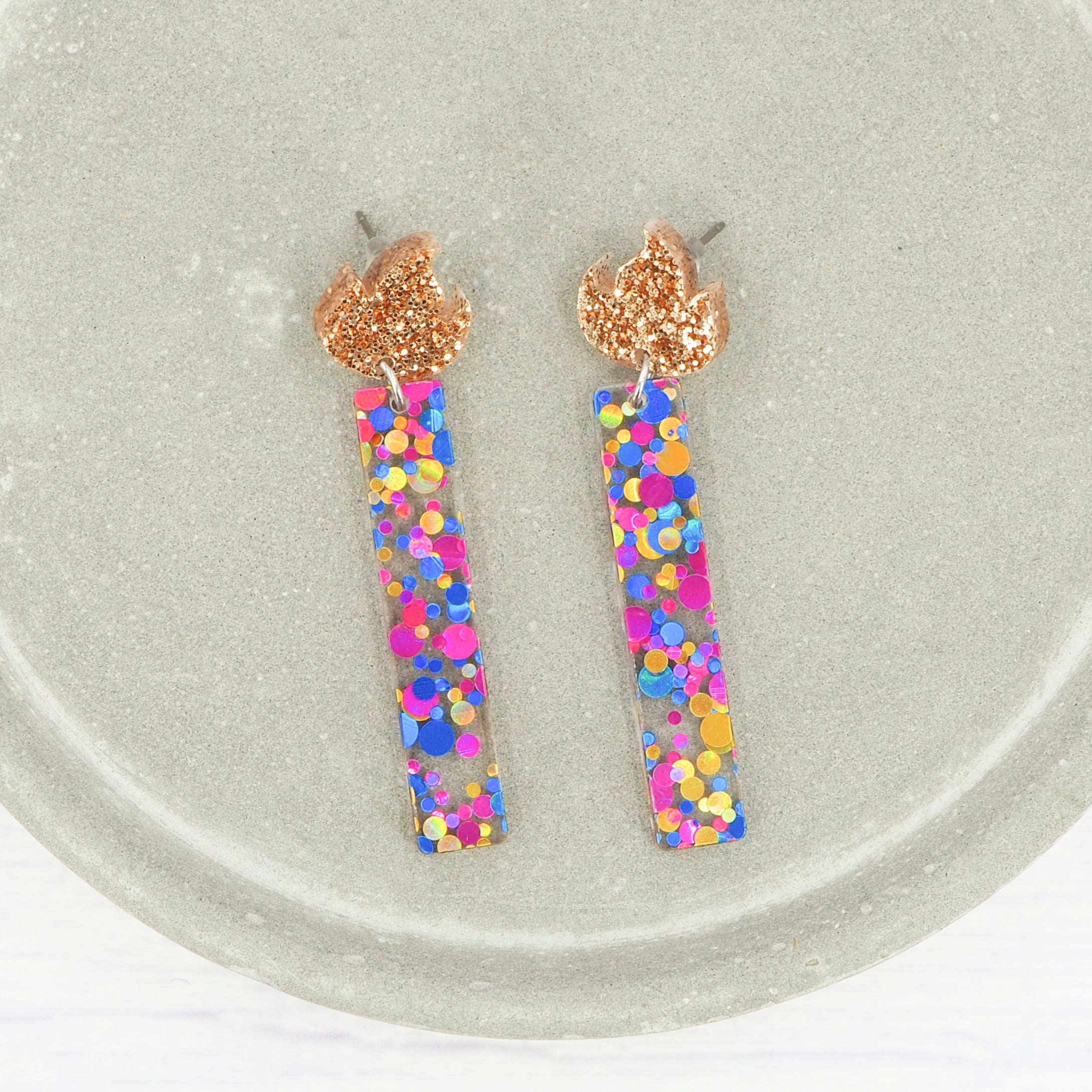 The earrings have a total drop length of 2.2" (5.5cm) from the top of the flame to the bottom of the candle.