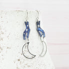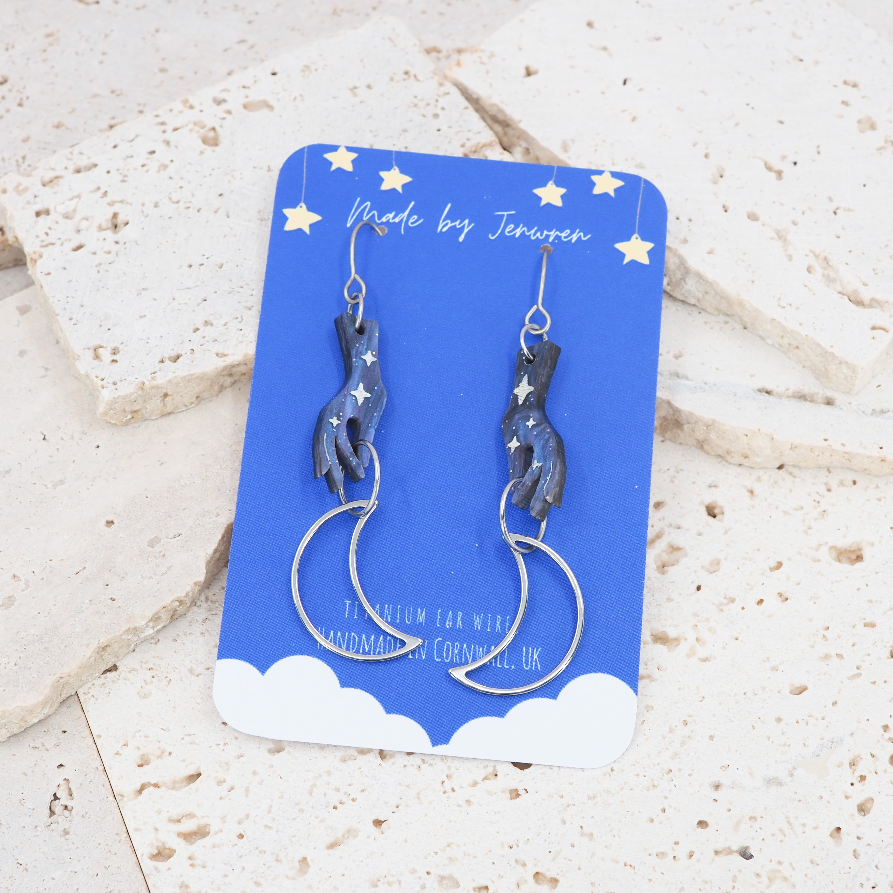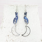 Purple galaxy Mystic hand and stainless steel crescent dangle earrings