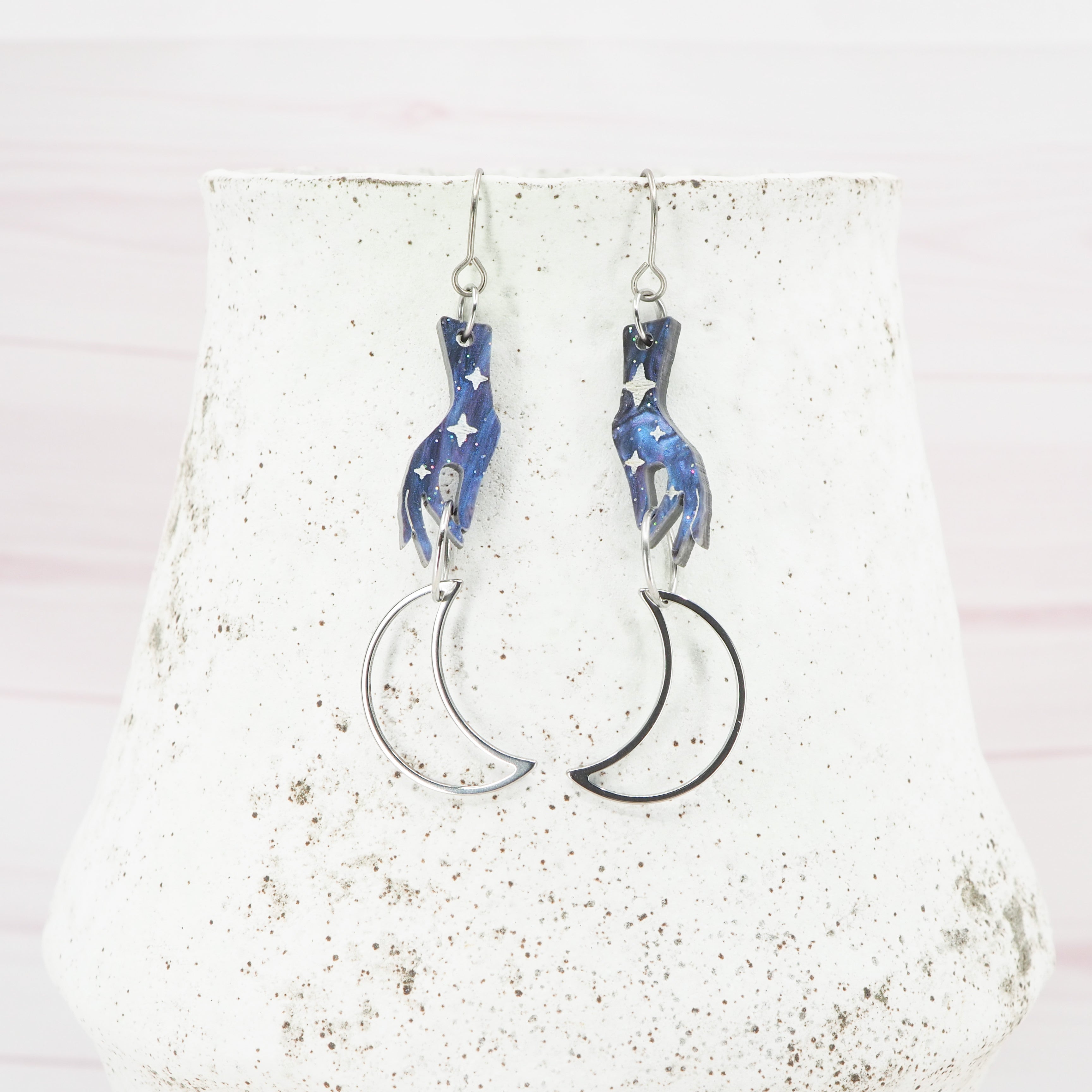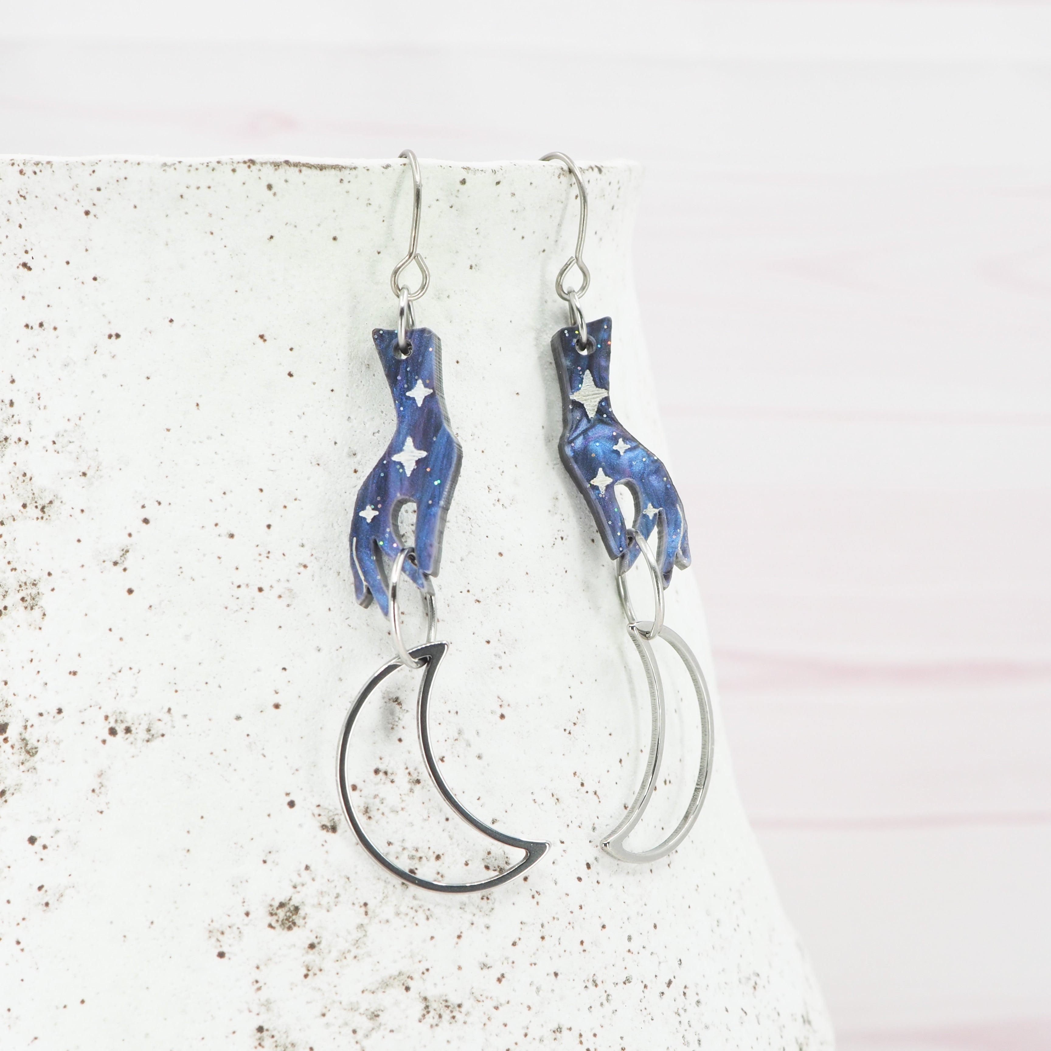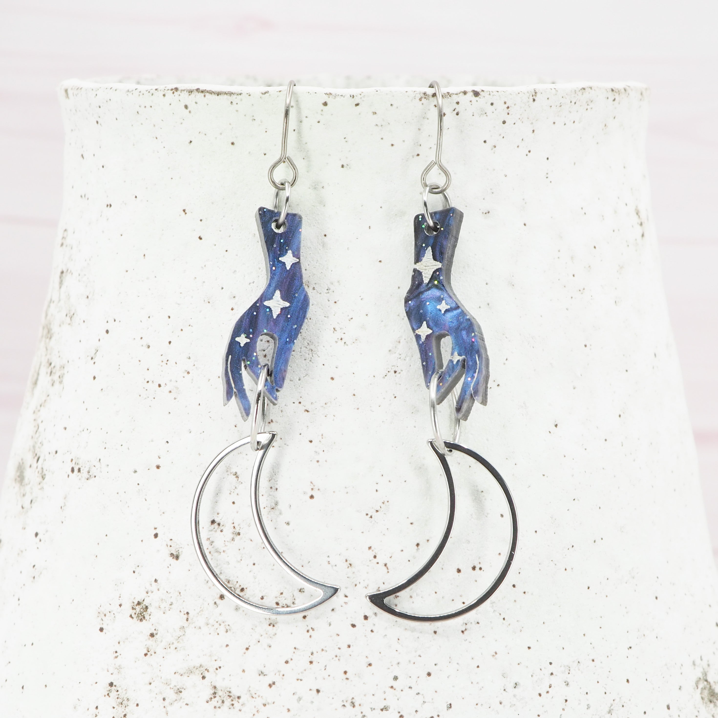 Purple galaxy acrylic Mystic hand and stainless steel crescent dangle earrings