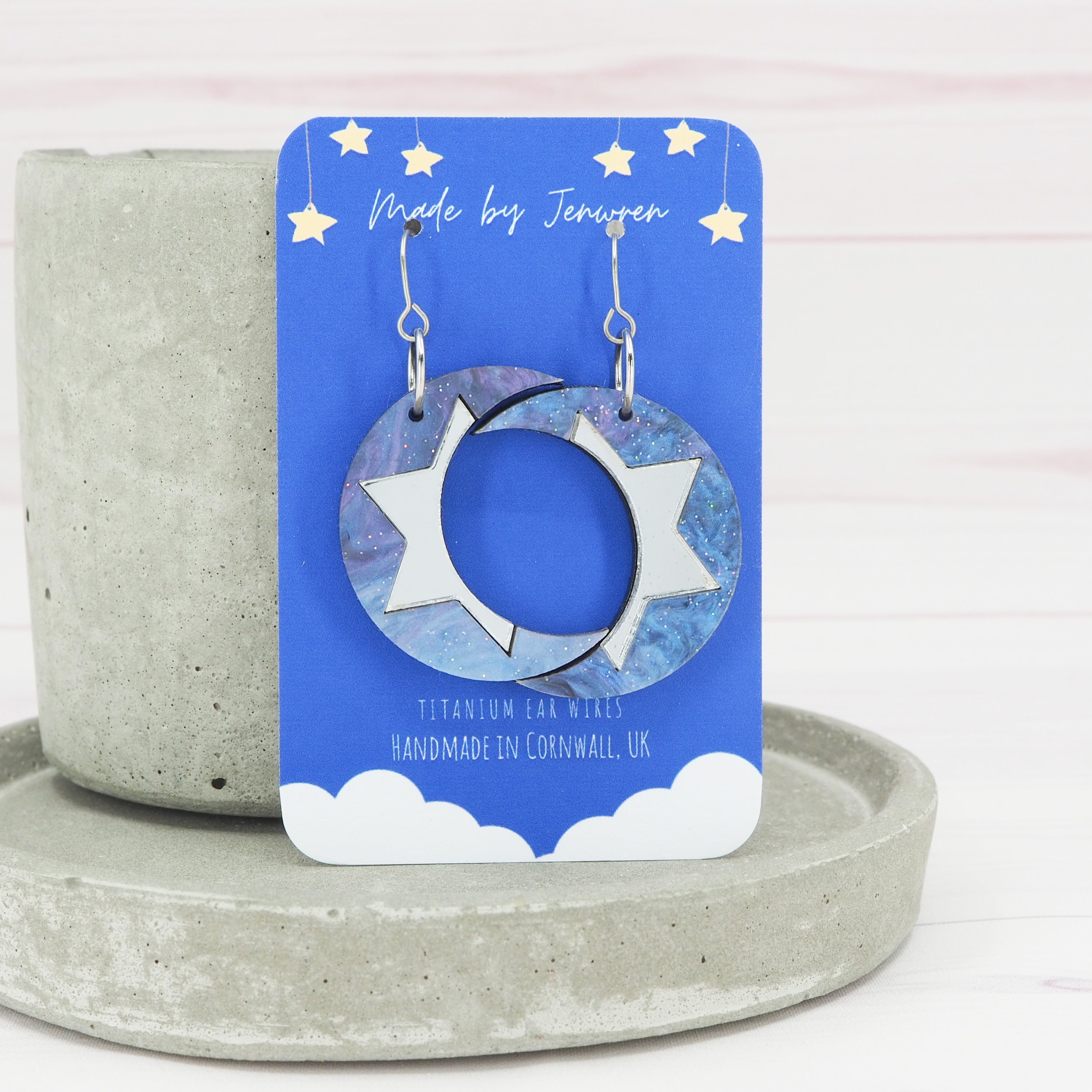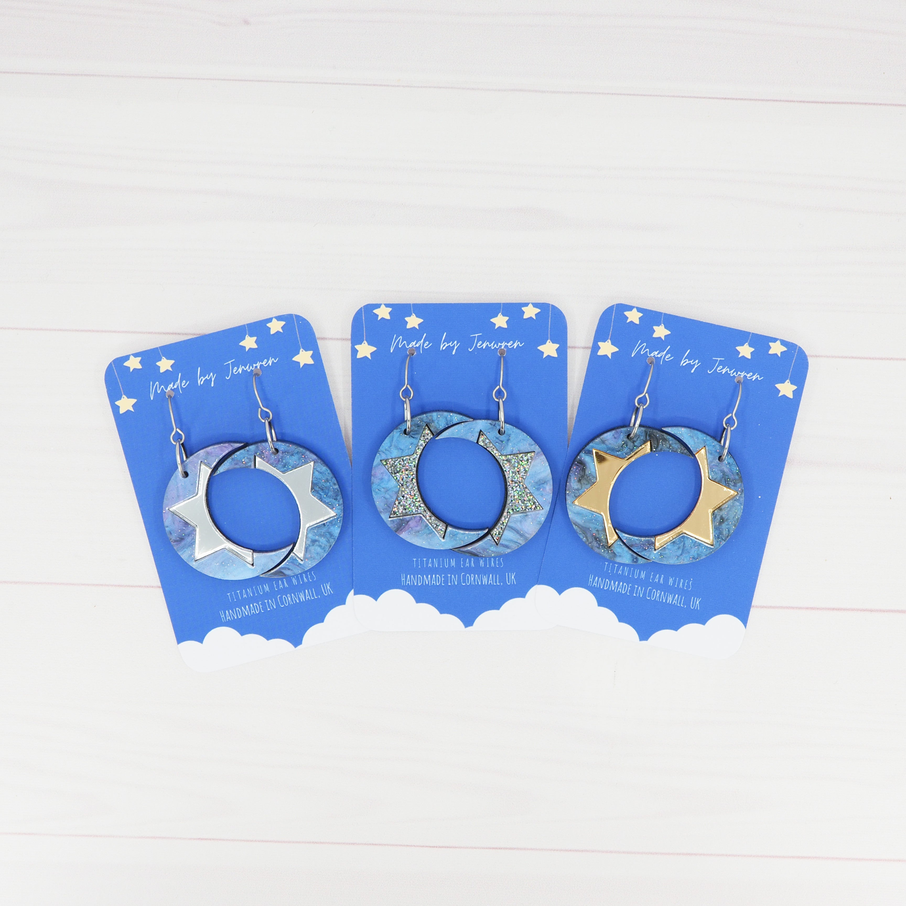 The earrings have a total drop length of 2" (5cm) from the top of the ear wire to the bottom of the crescents.