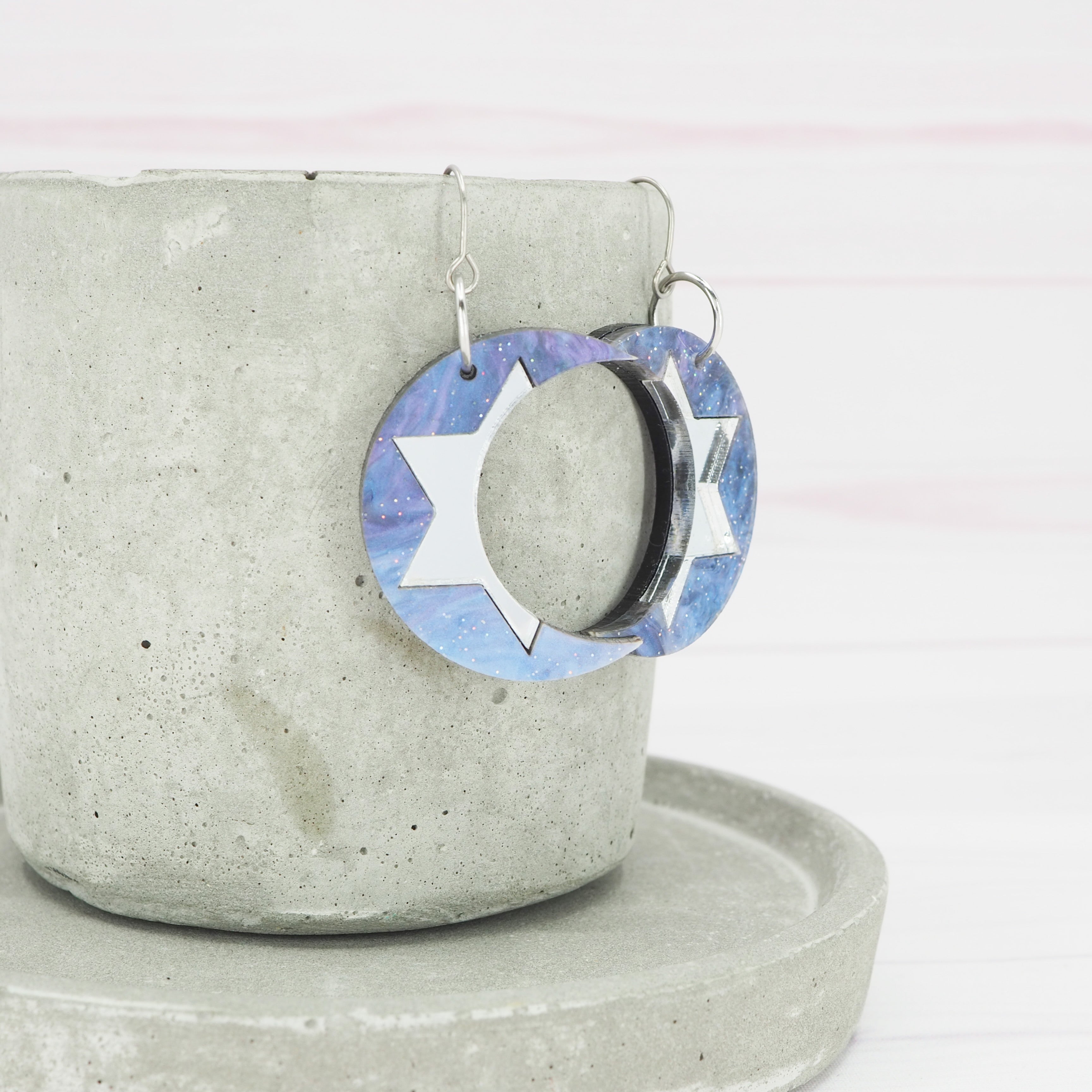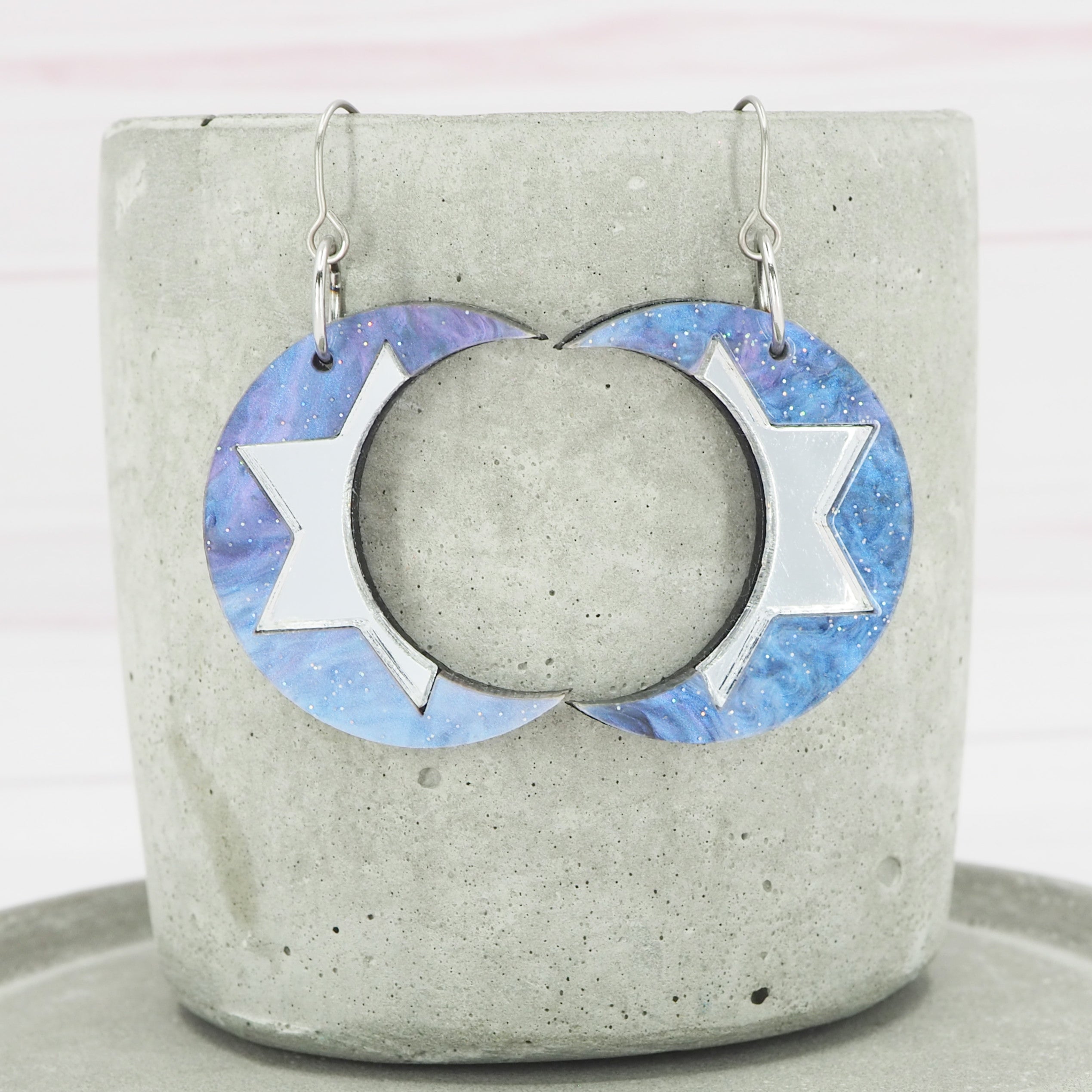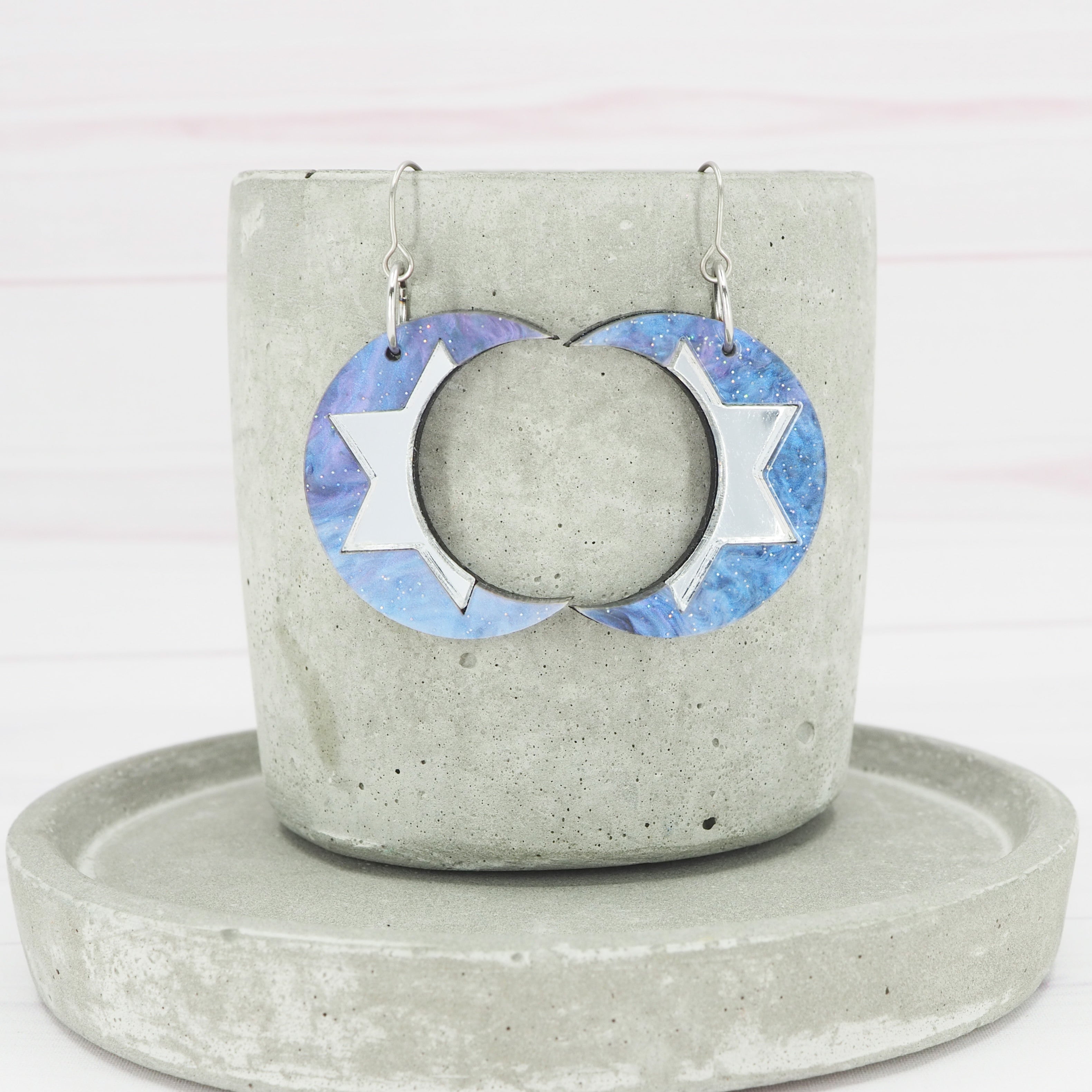 Purple galaxy, Silver mirror crescent moon dangle earrings