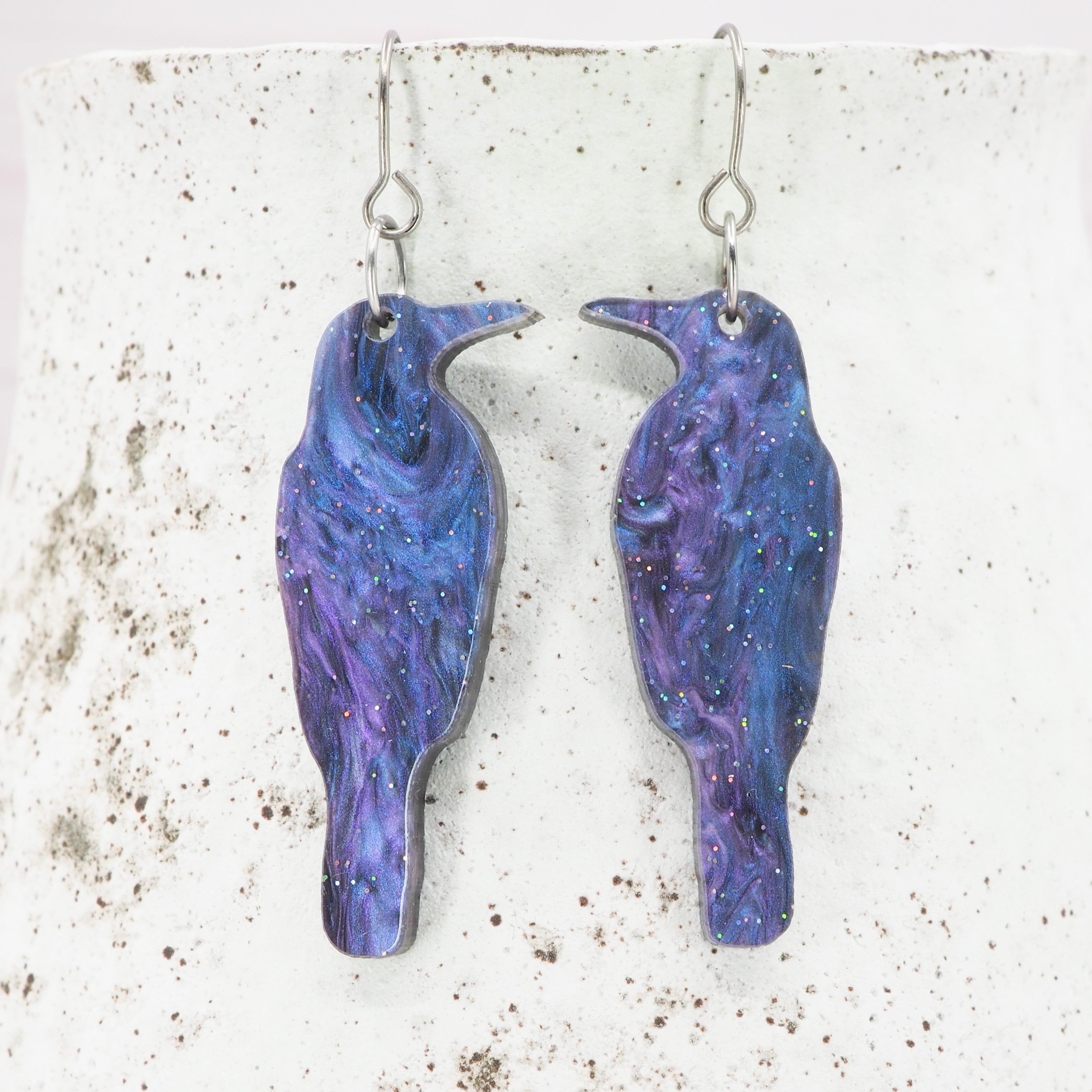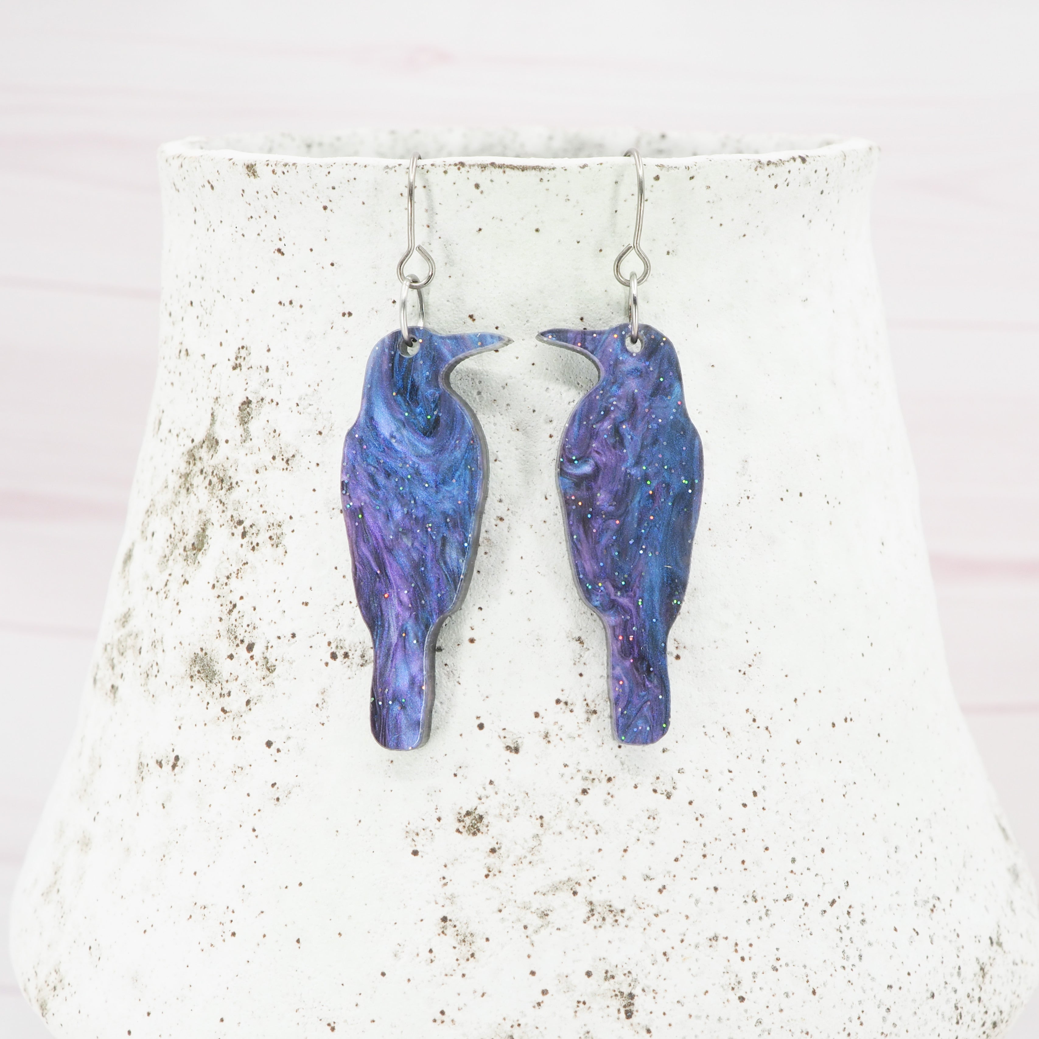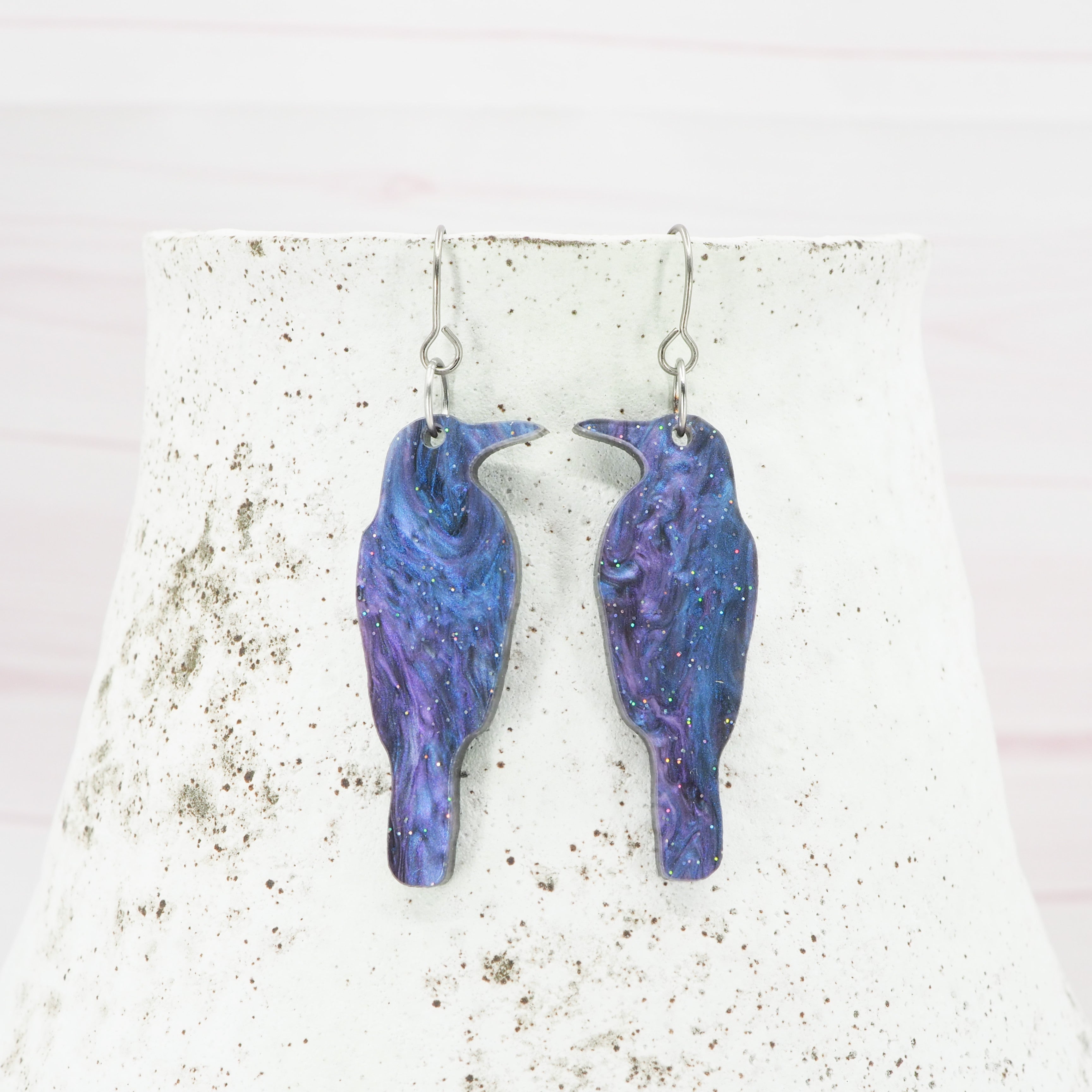Purple galaxy with holo glitter crow acrylic dangle earrings