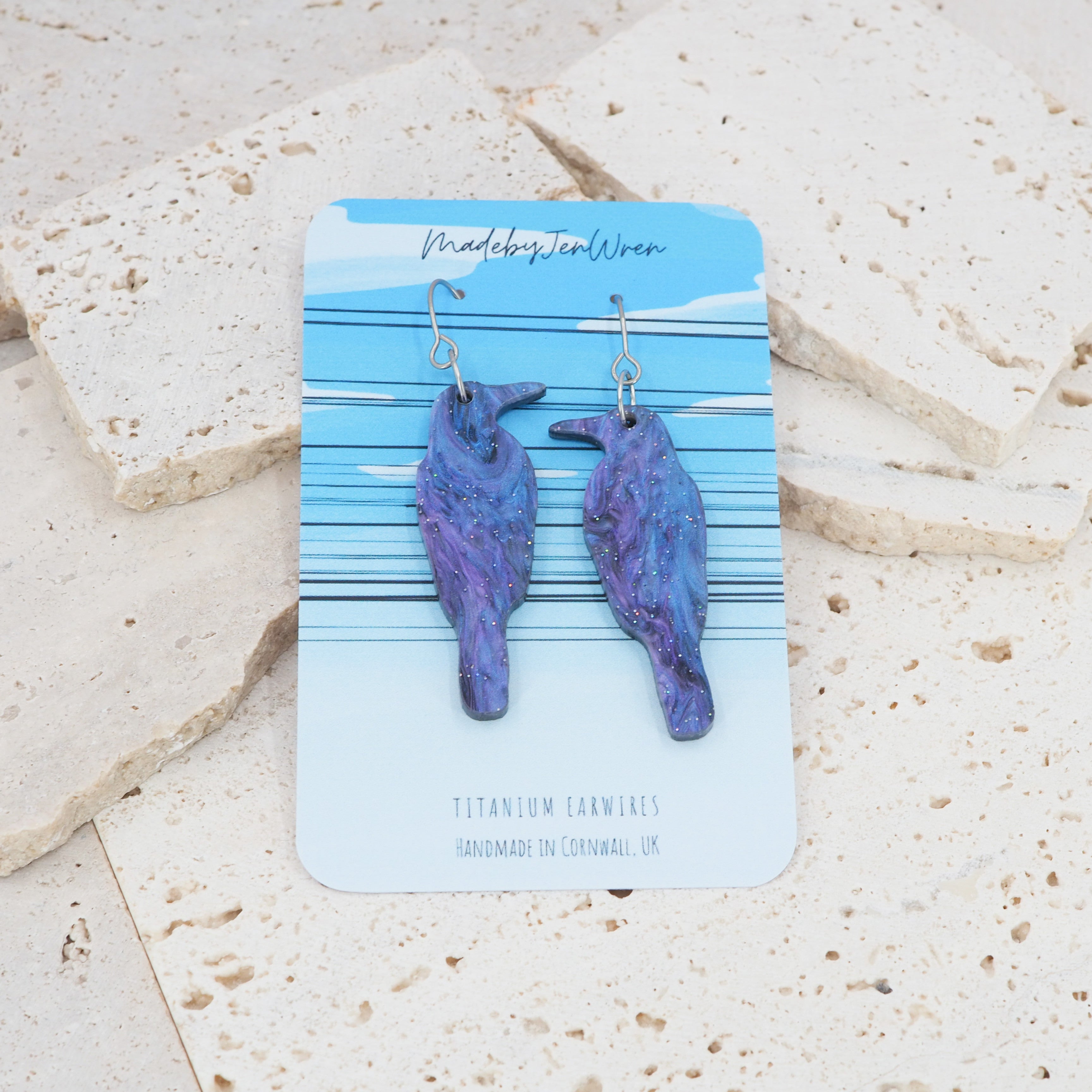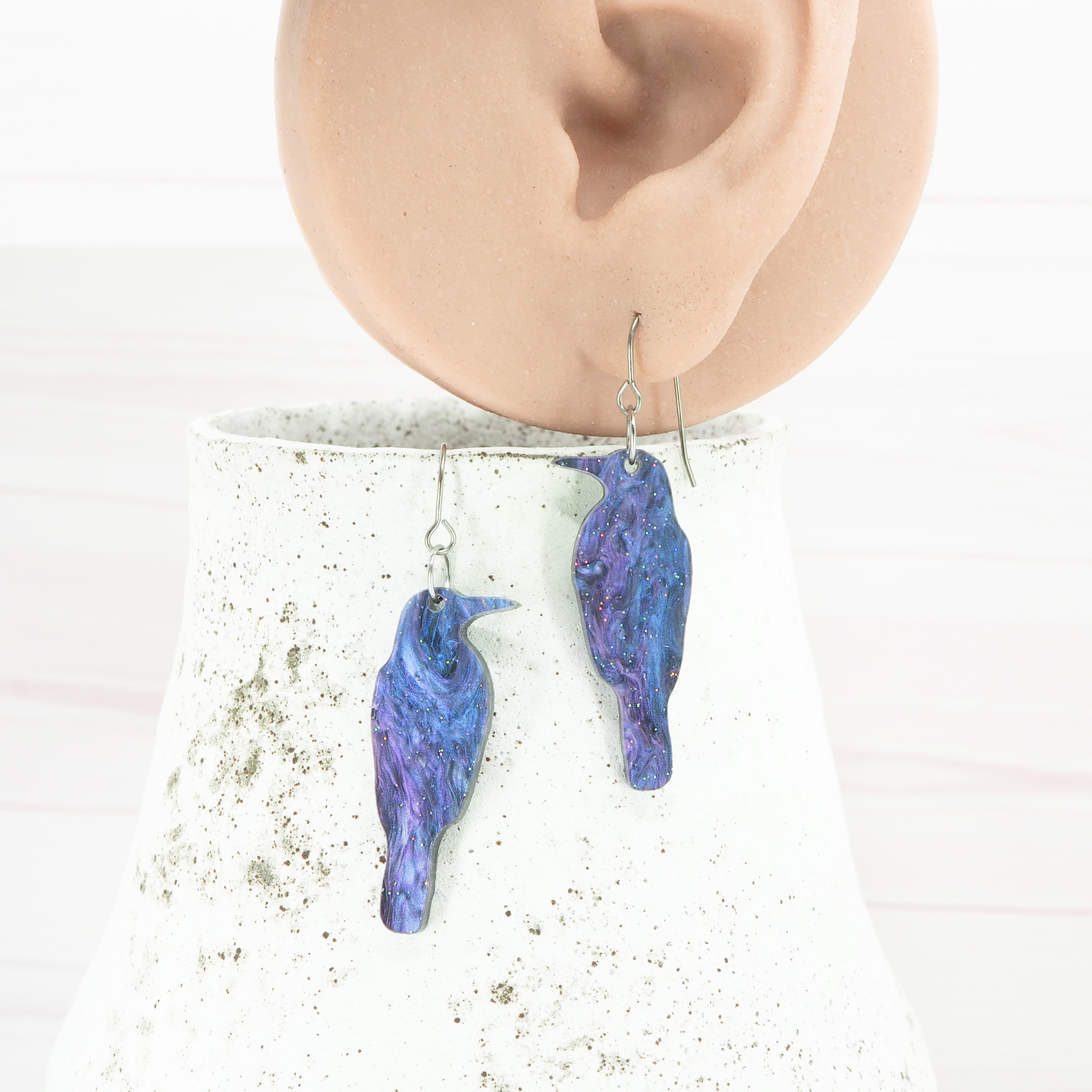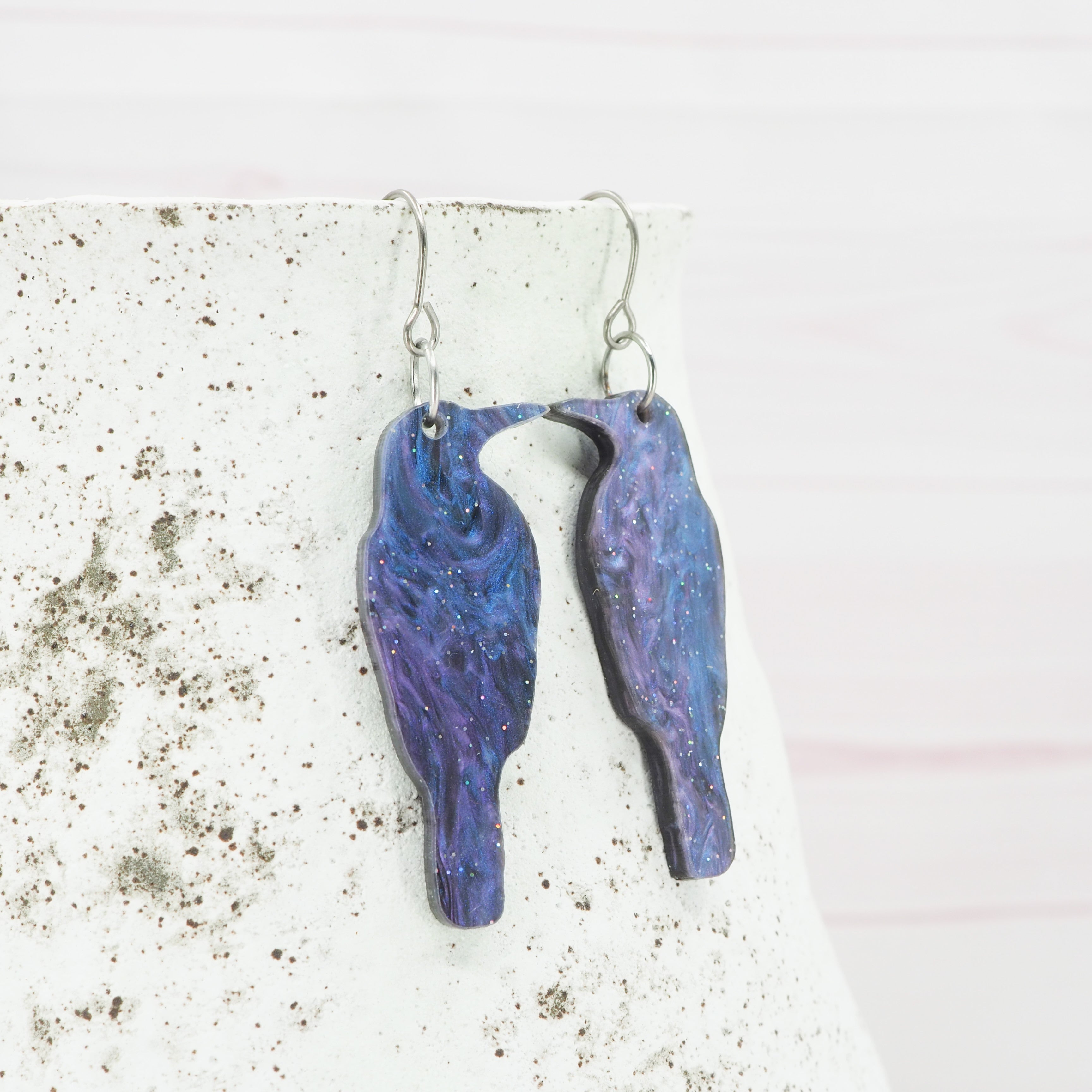 Purple galaxy with holo glitter crow acrylic dangle earrings