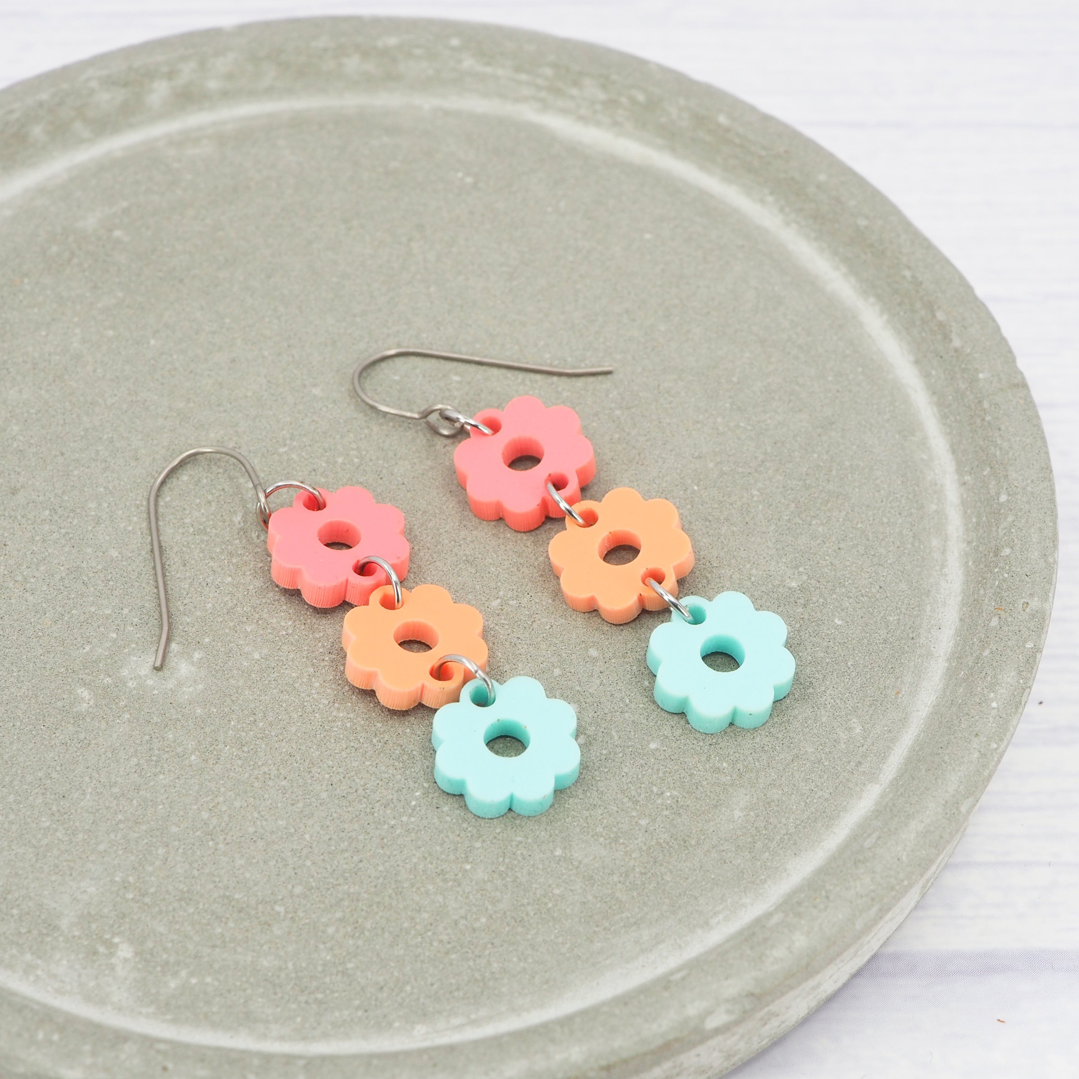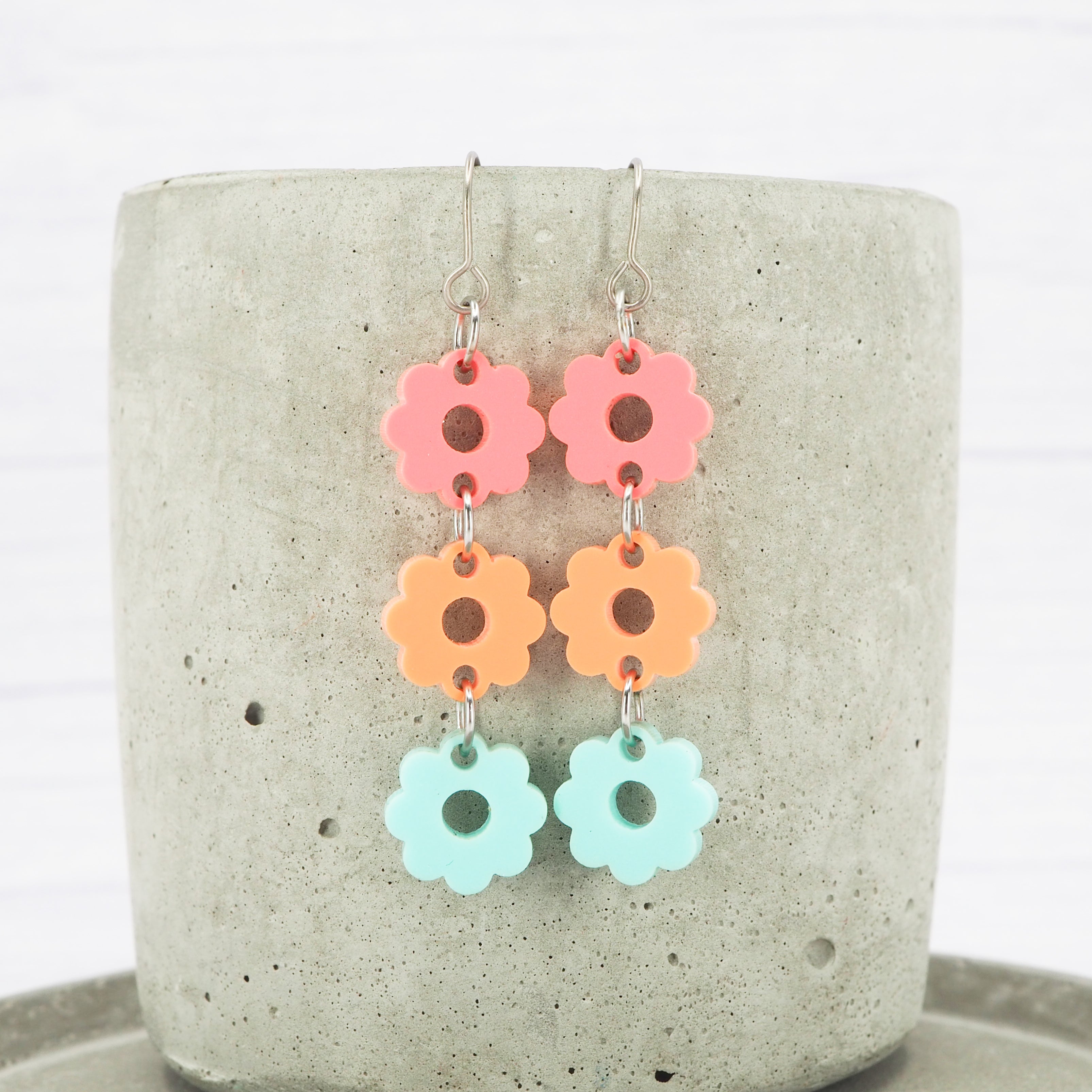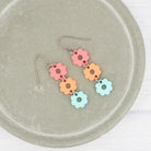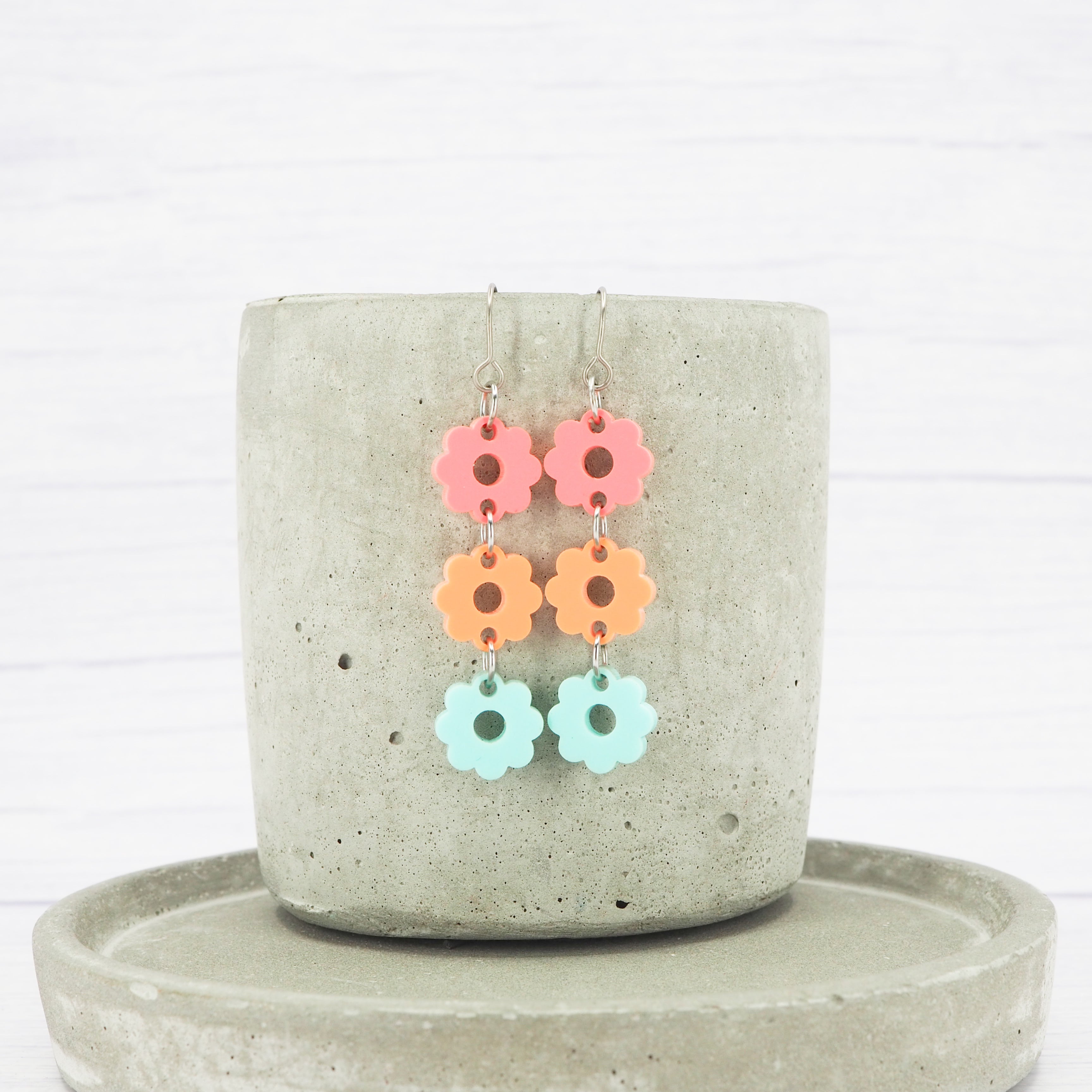 Raspberry, Orange, Blue - Retro matte pastel flower dangle earrings