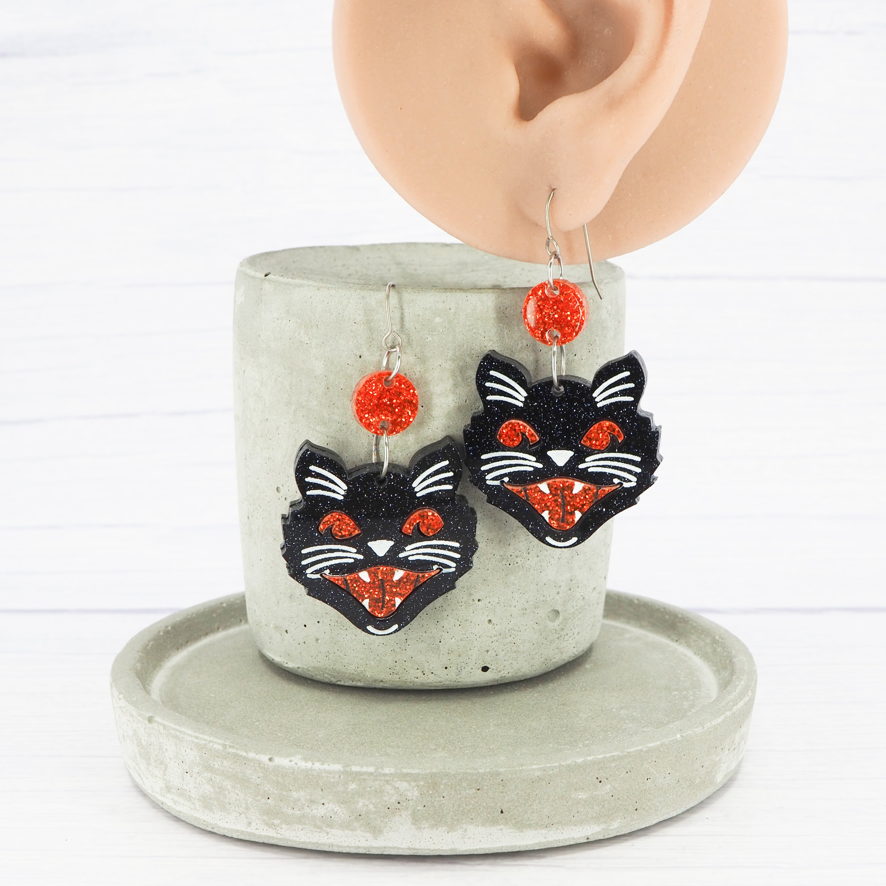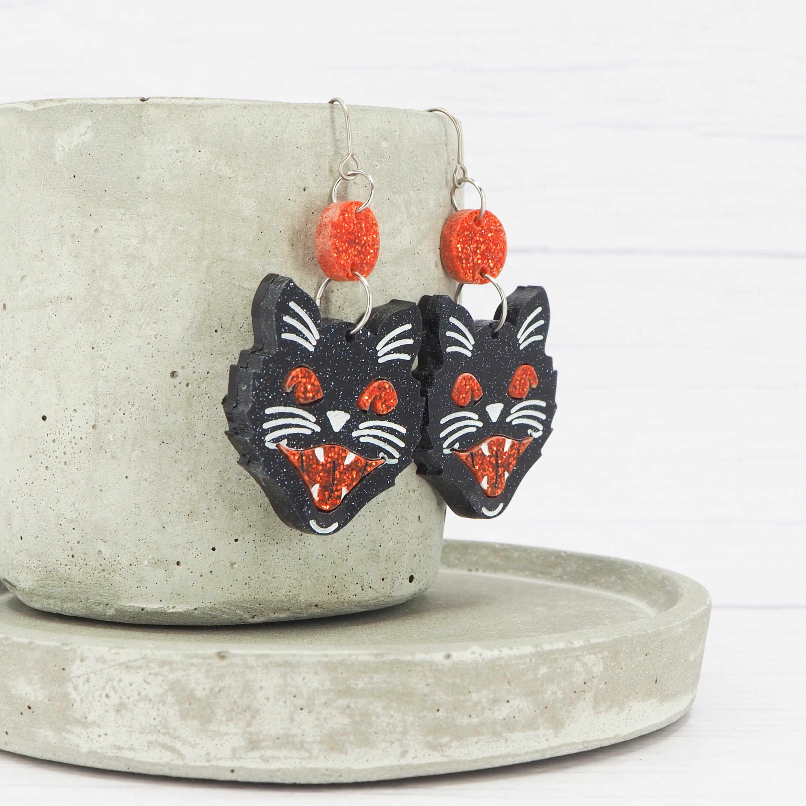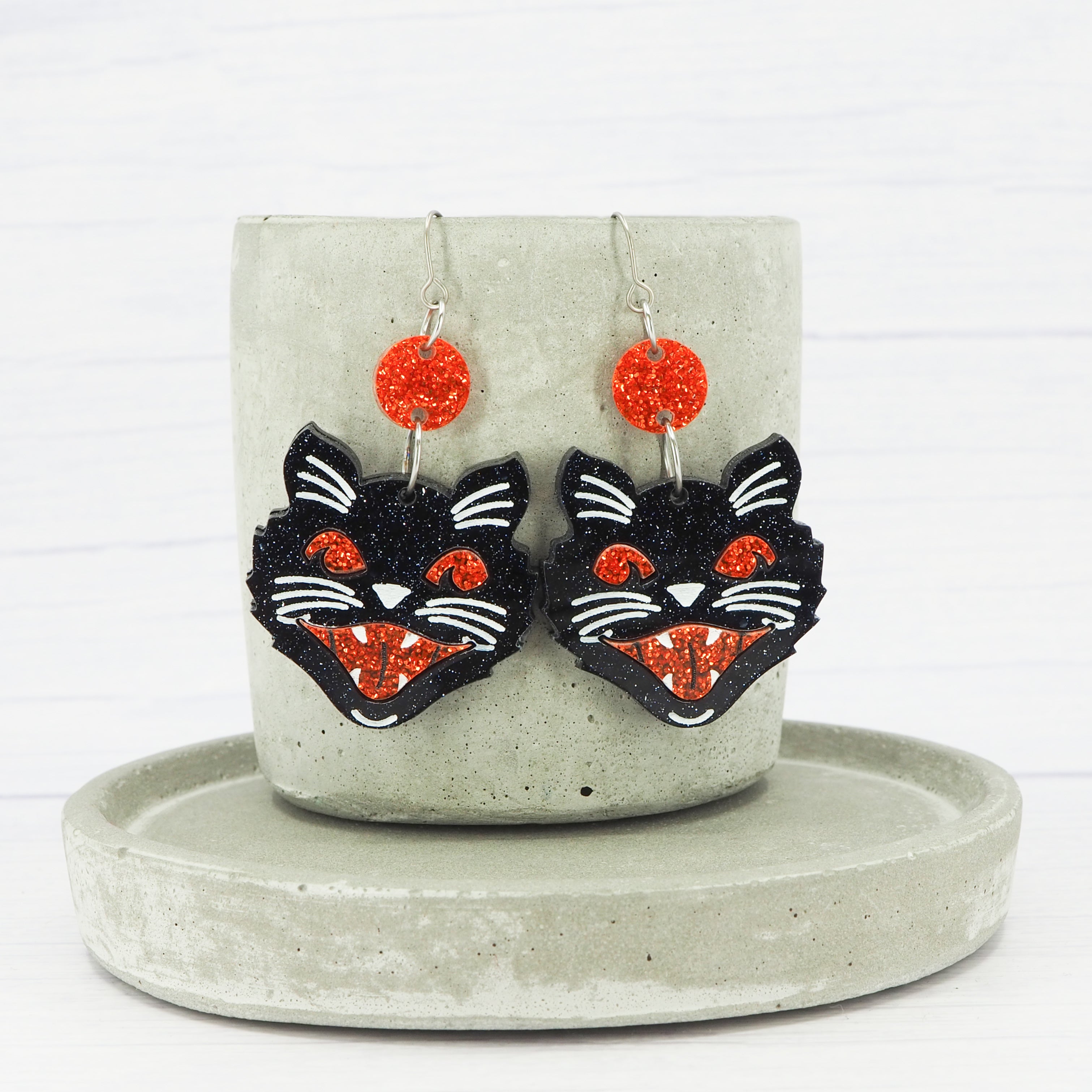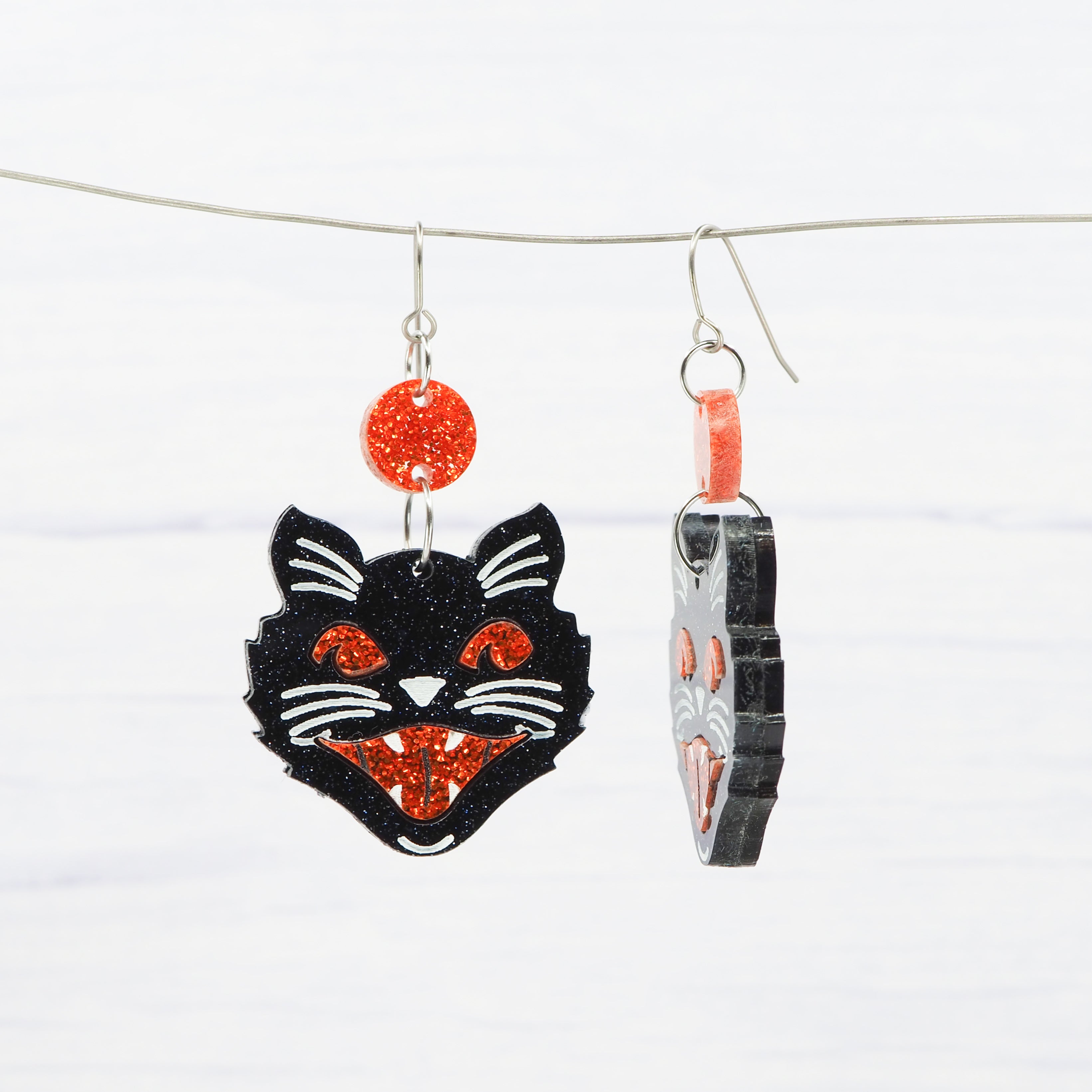 Retro cat head dangles, Black Glitter with Orange Glitter detail.