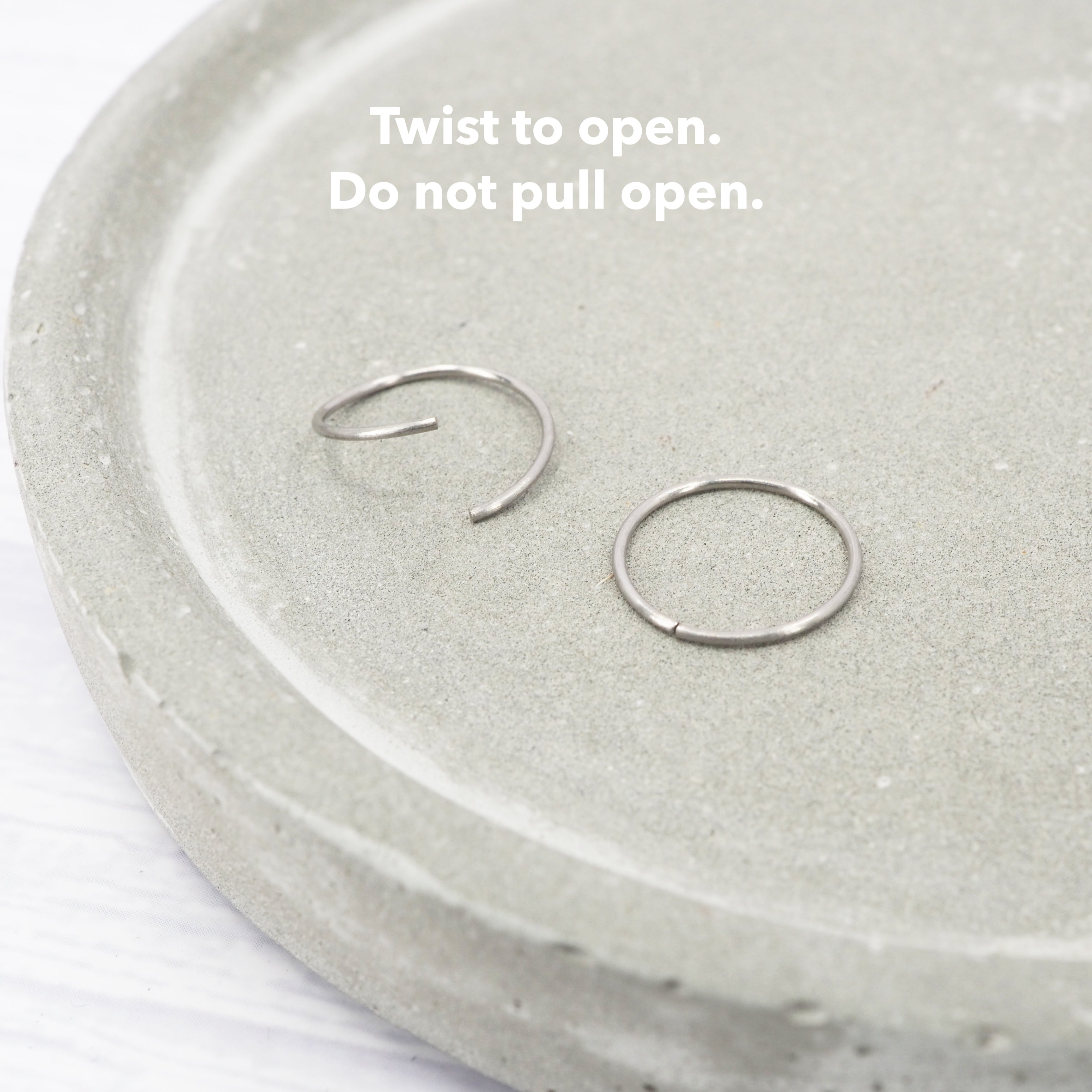 The hoops twist open as shown in the pictures above so they can be slipped through the piercing easily. Then simply twist them shut again to close.