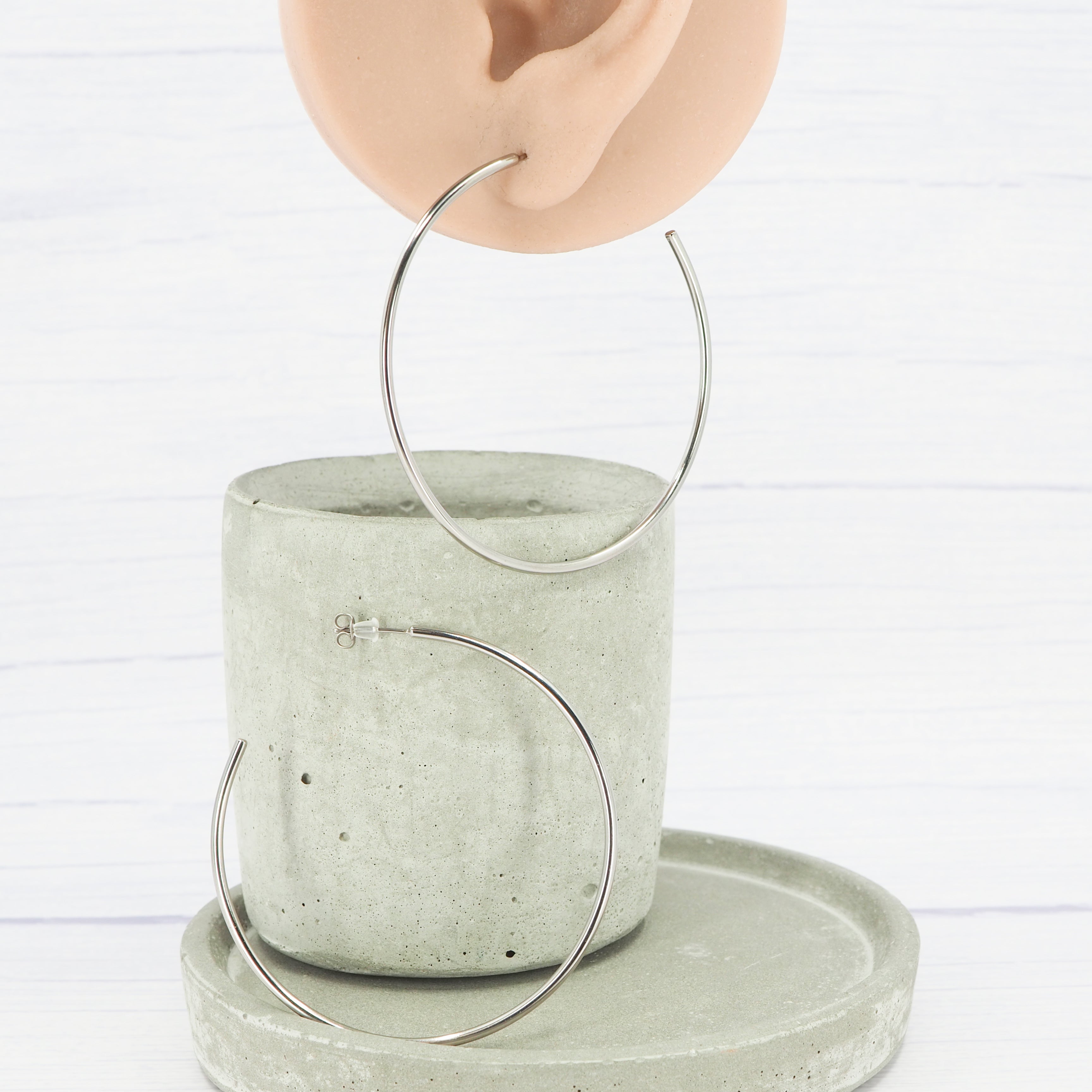 Solid 2.75-inch titanium hoop earrings. 0.8mm hypoallergenic titanium ear wires.