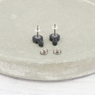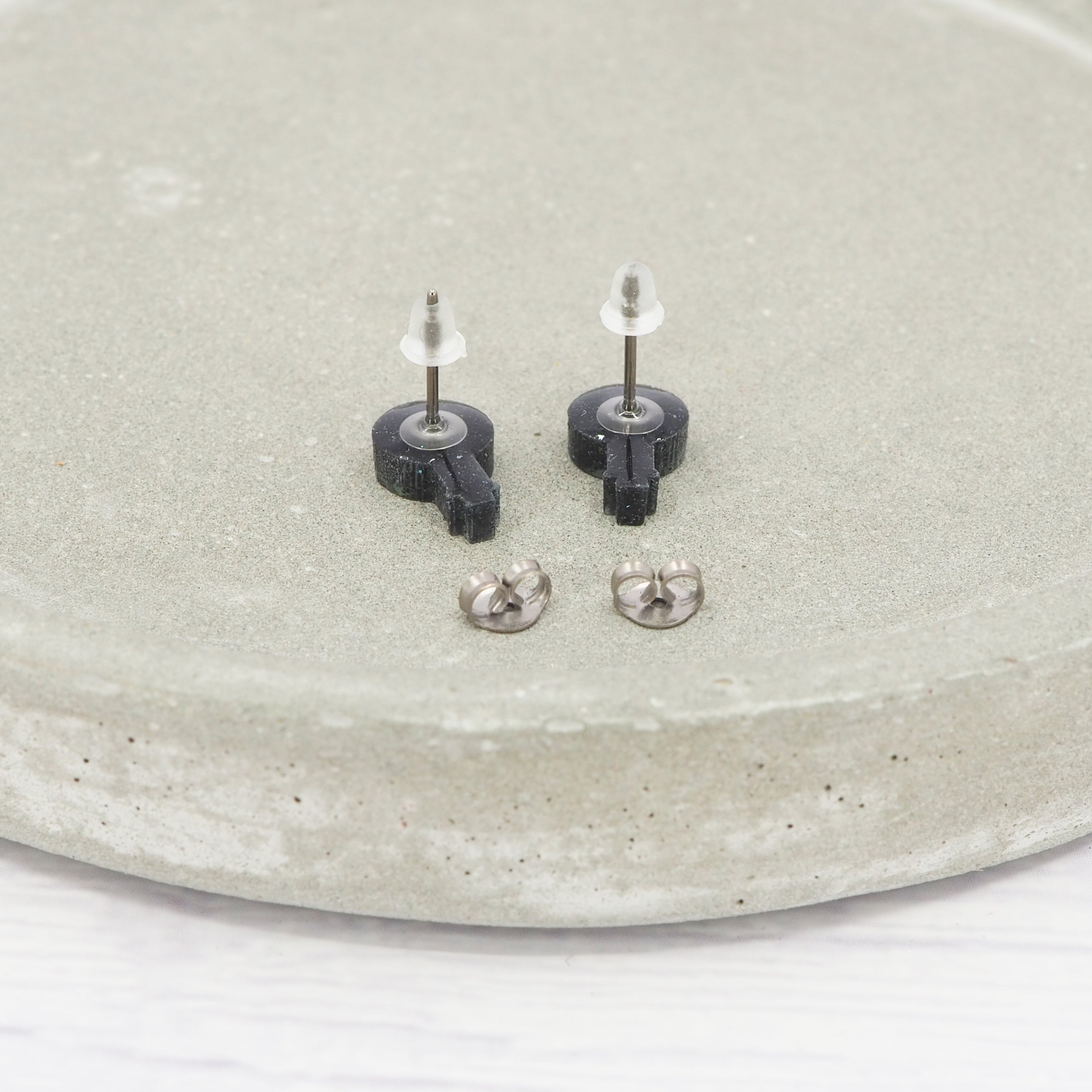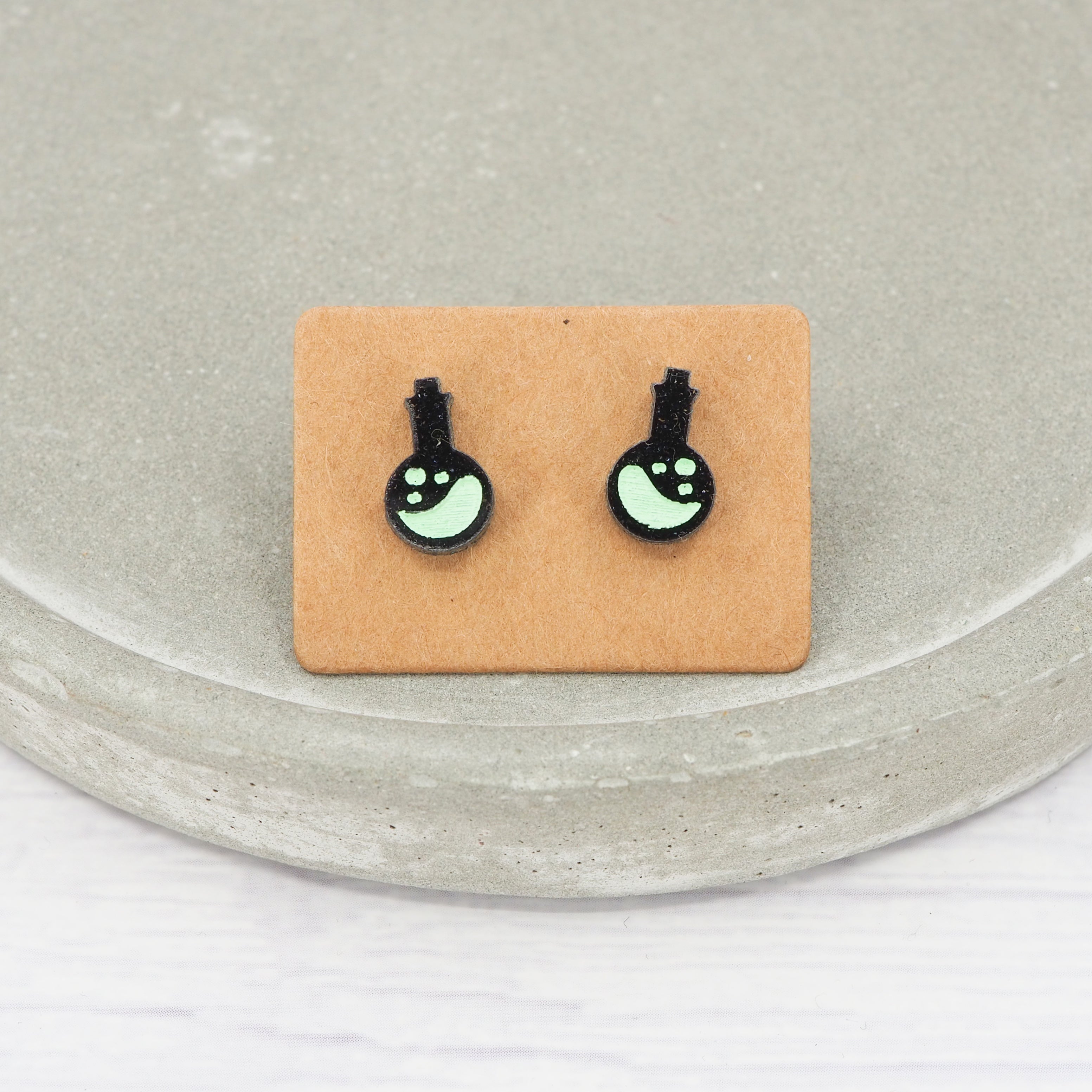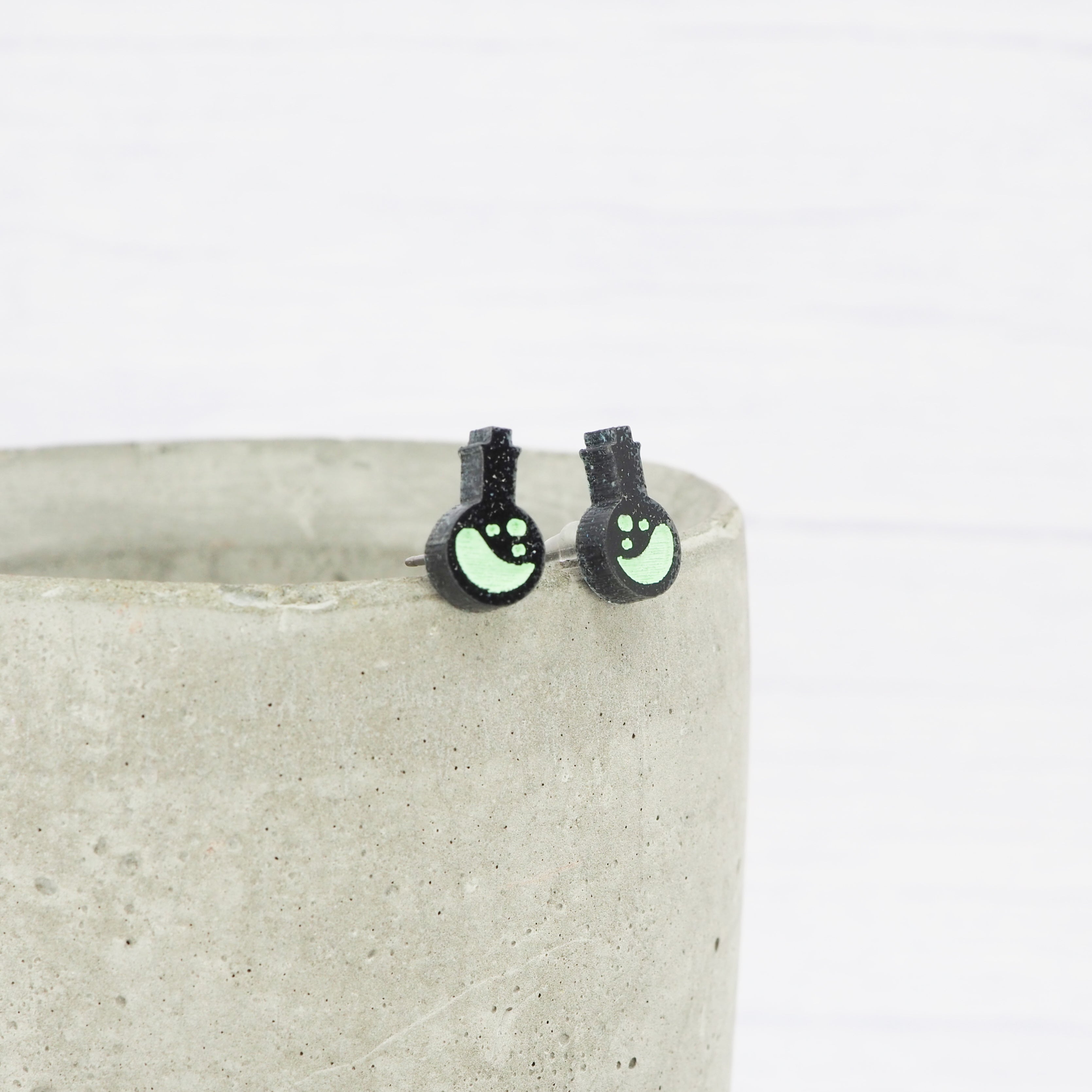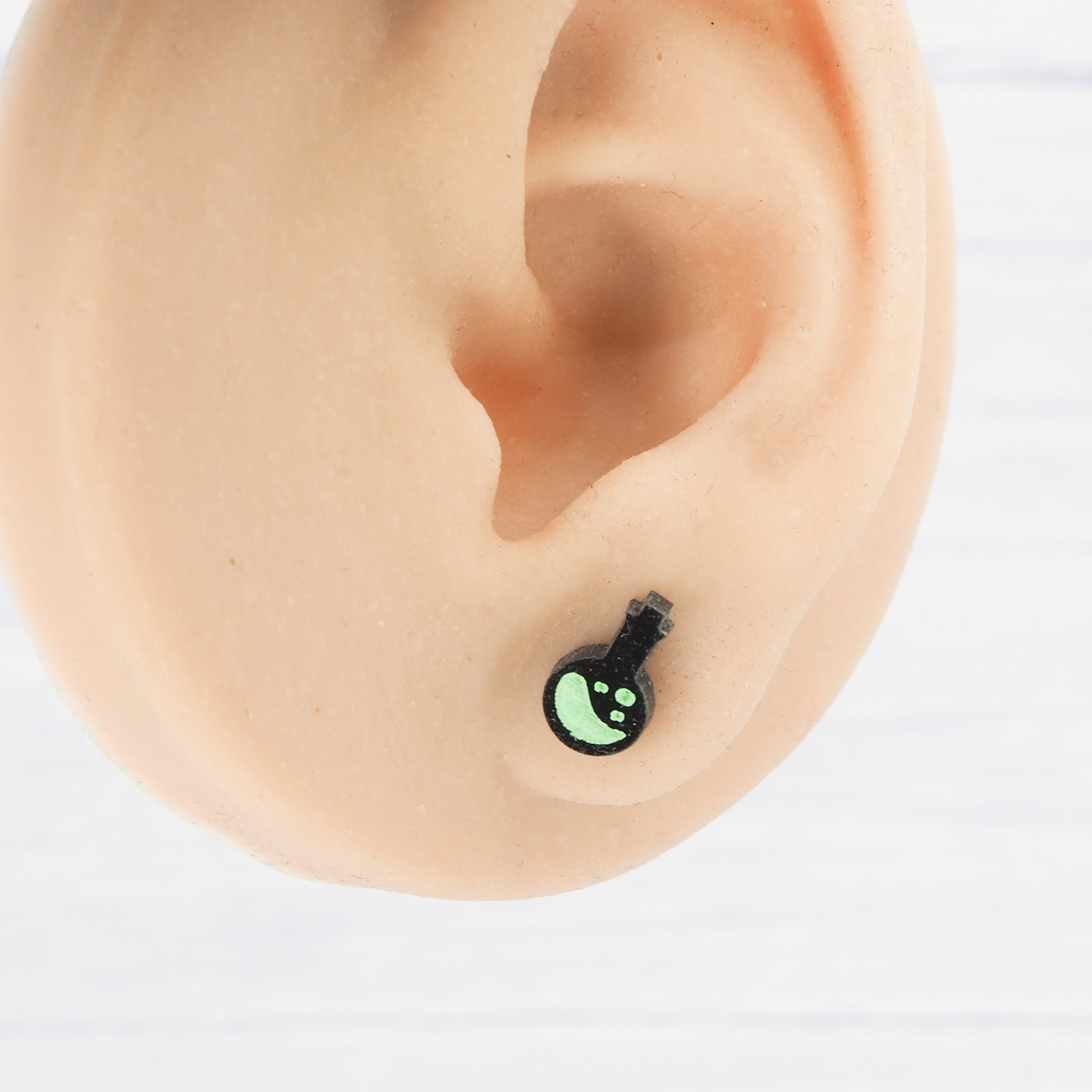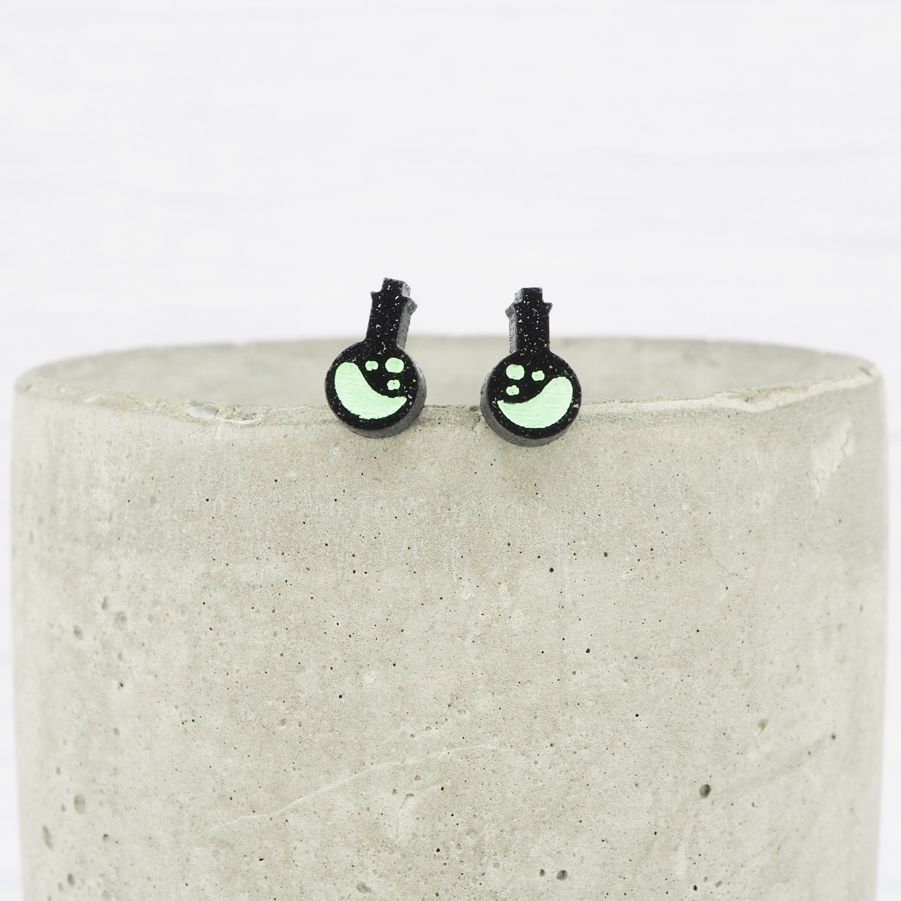 Black potion bottle with splash detail stud earrings with 0.7mm titanium ear stems.