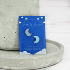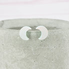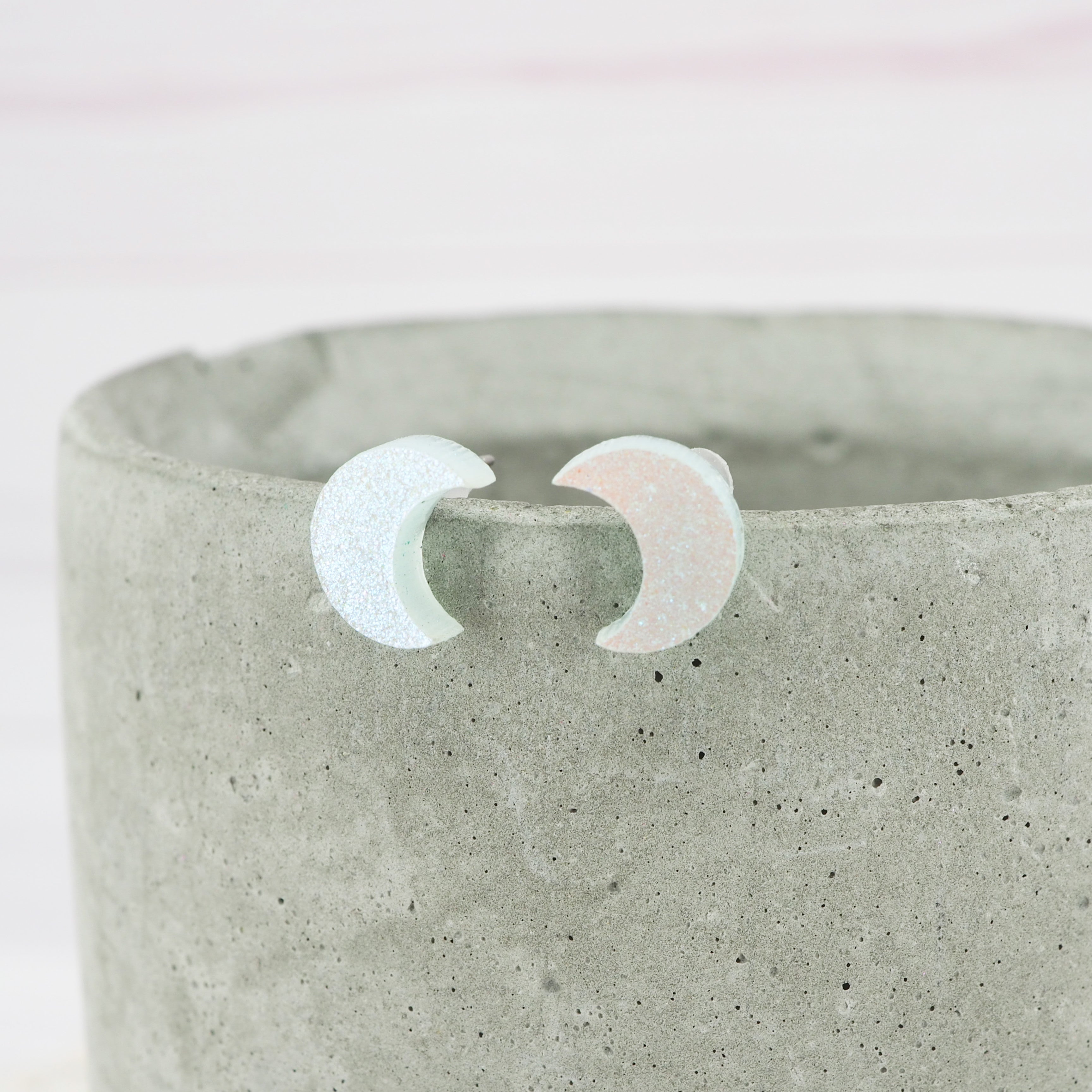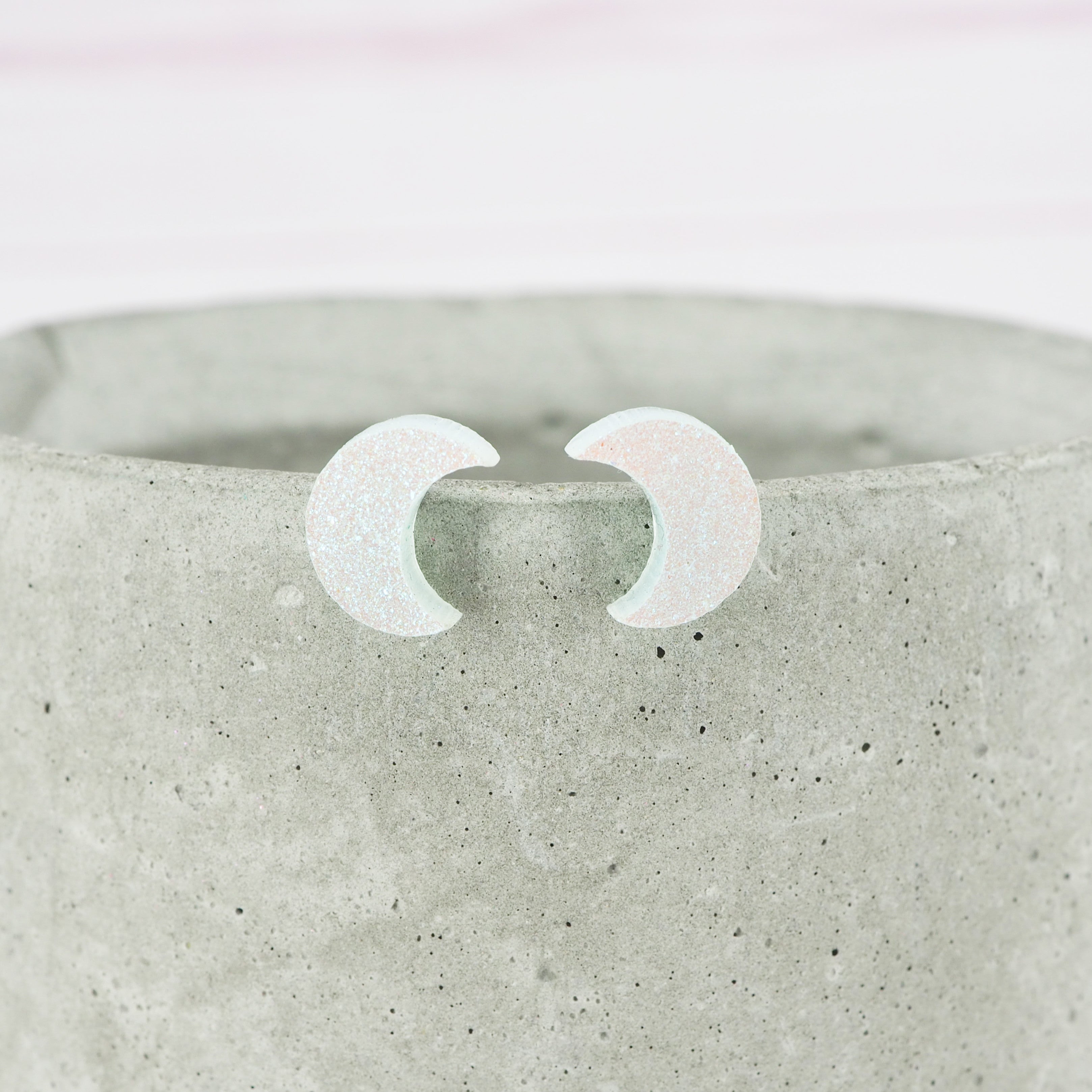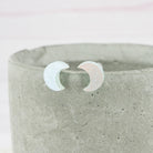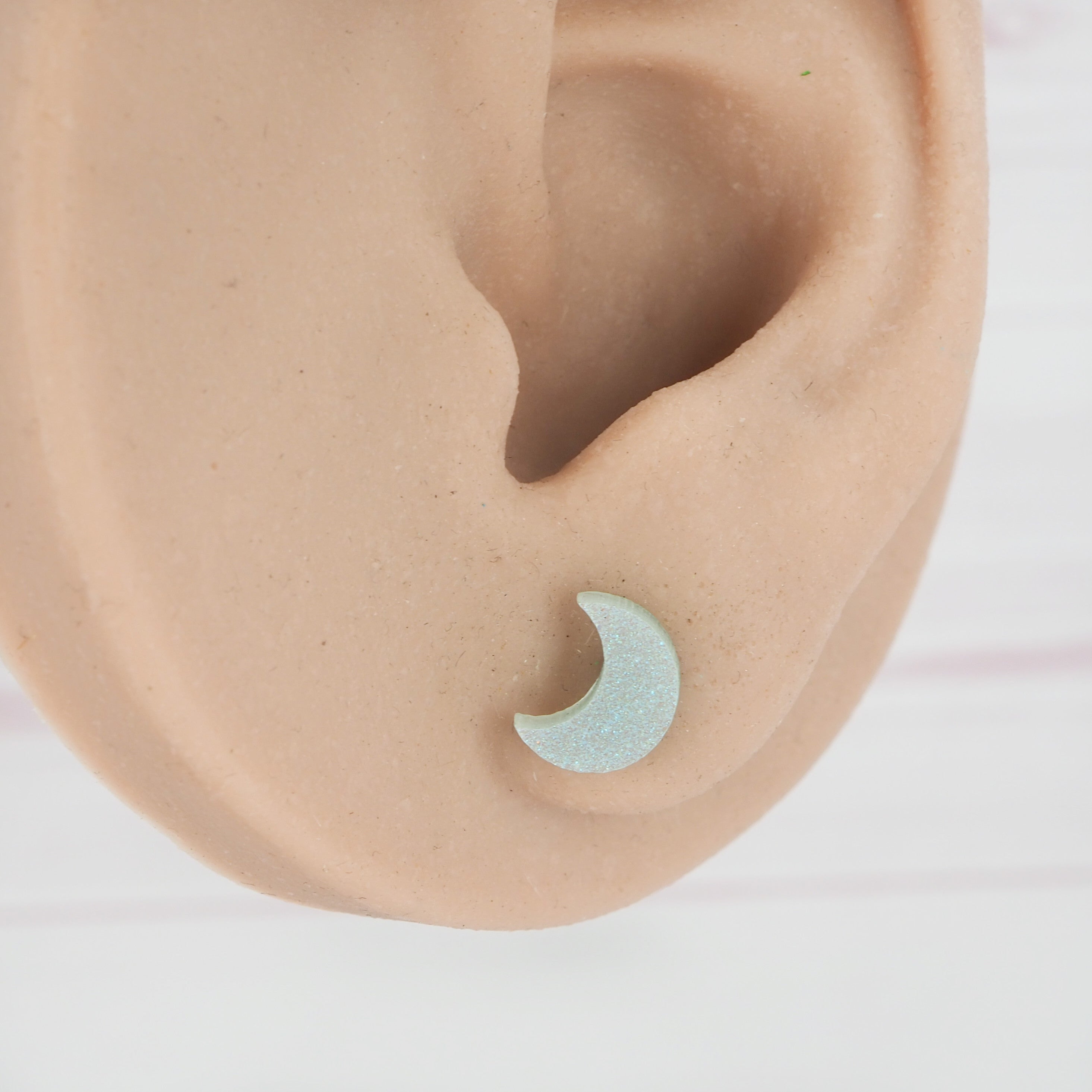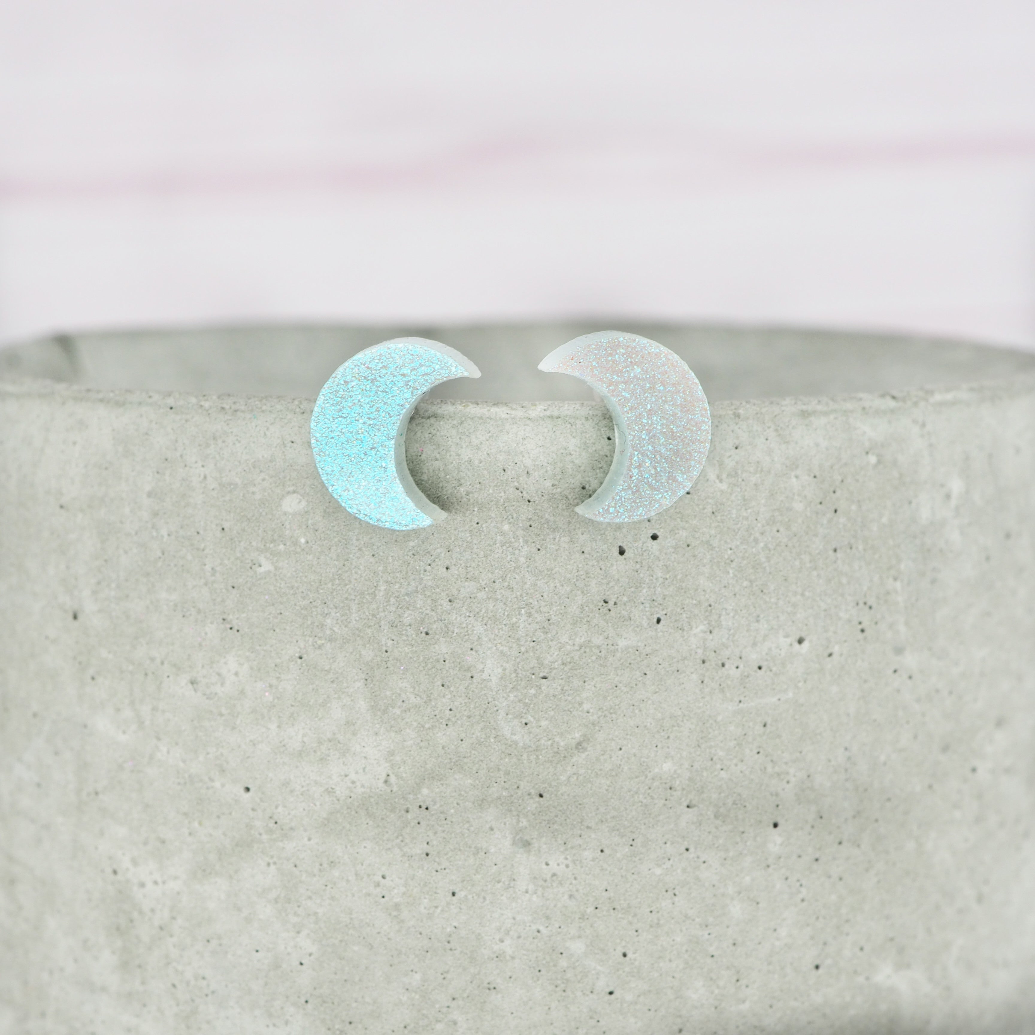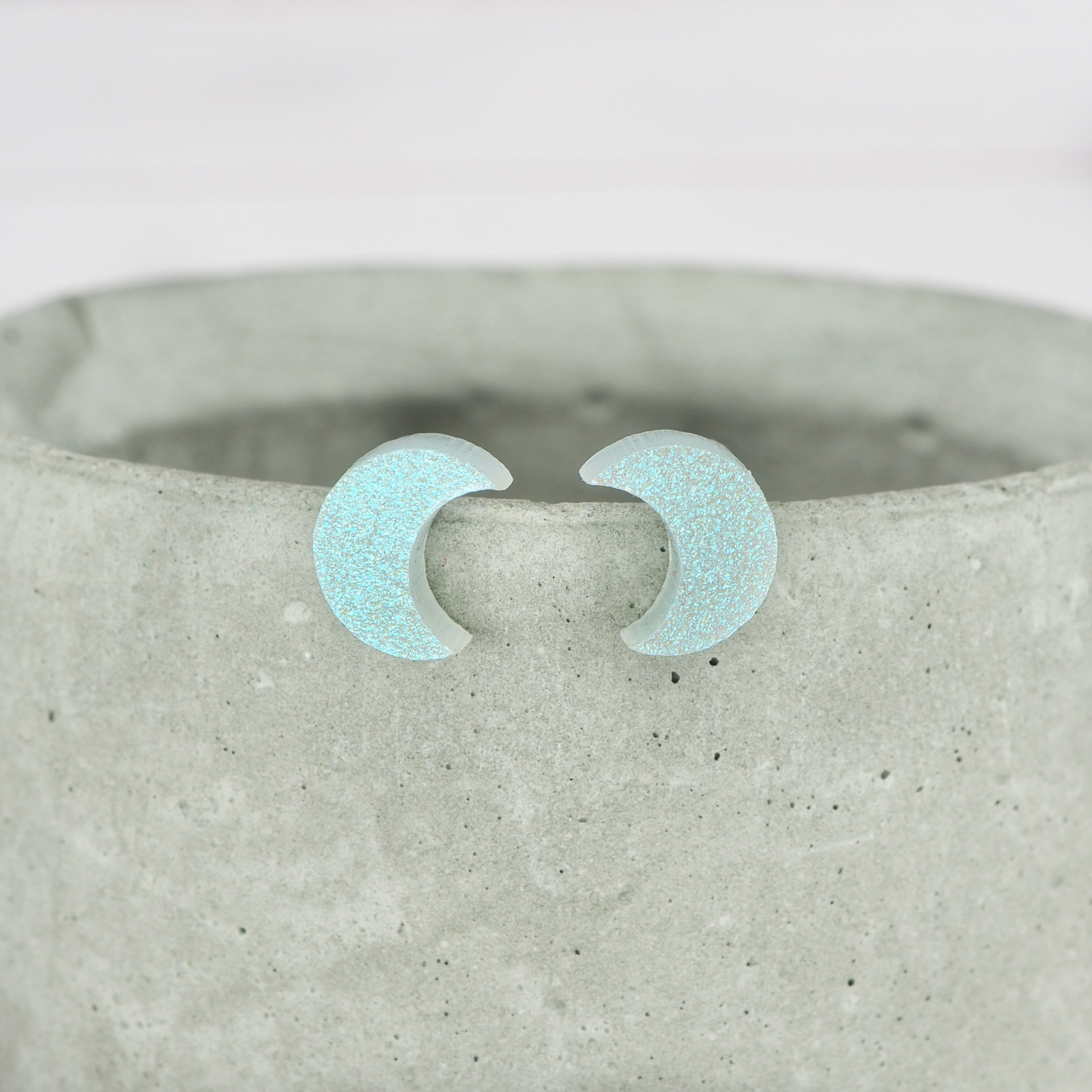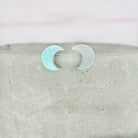 Blue lustre crescent moon studs with 0.7mm ear stems.