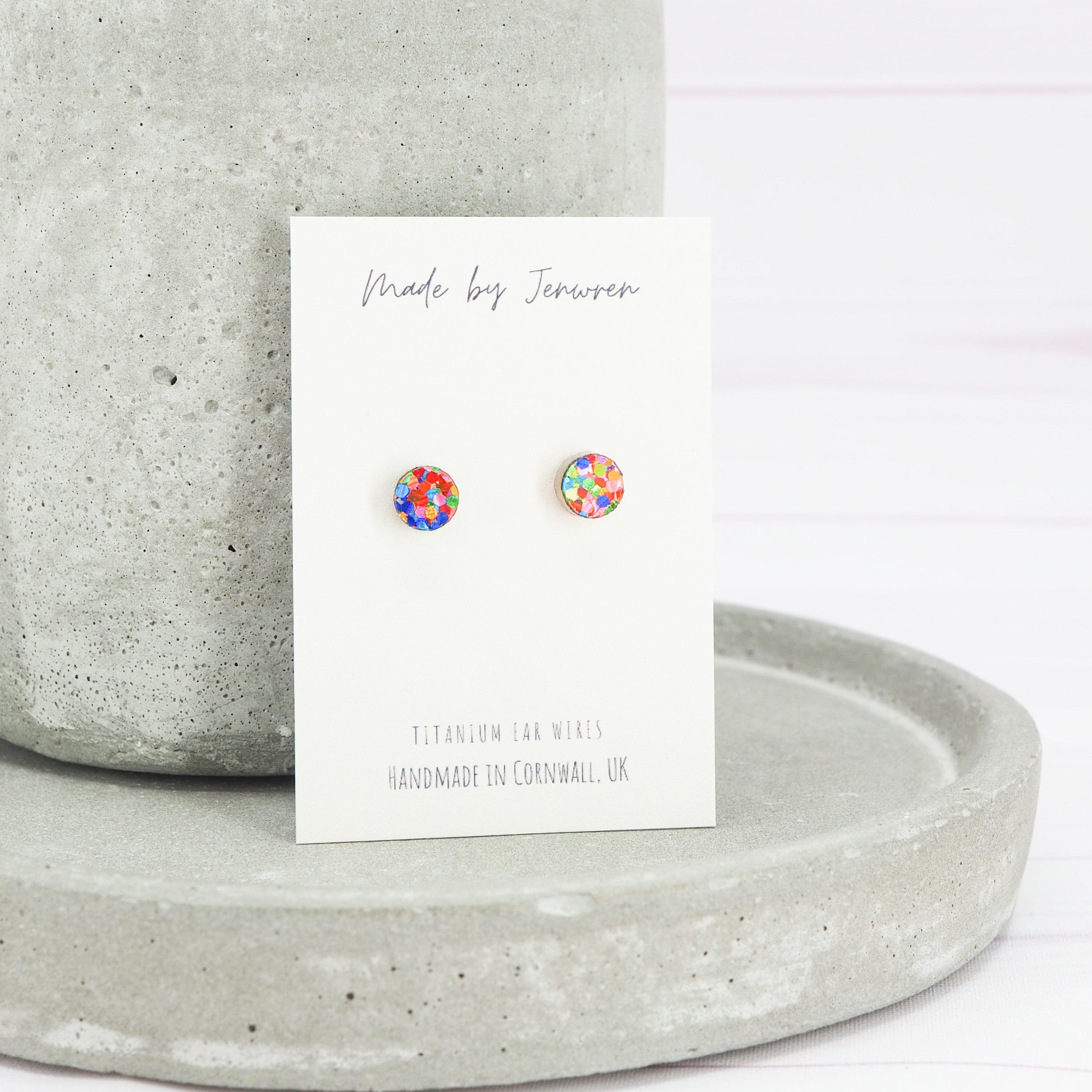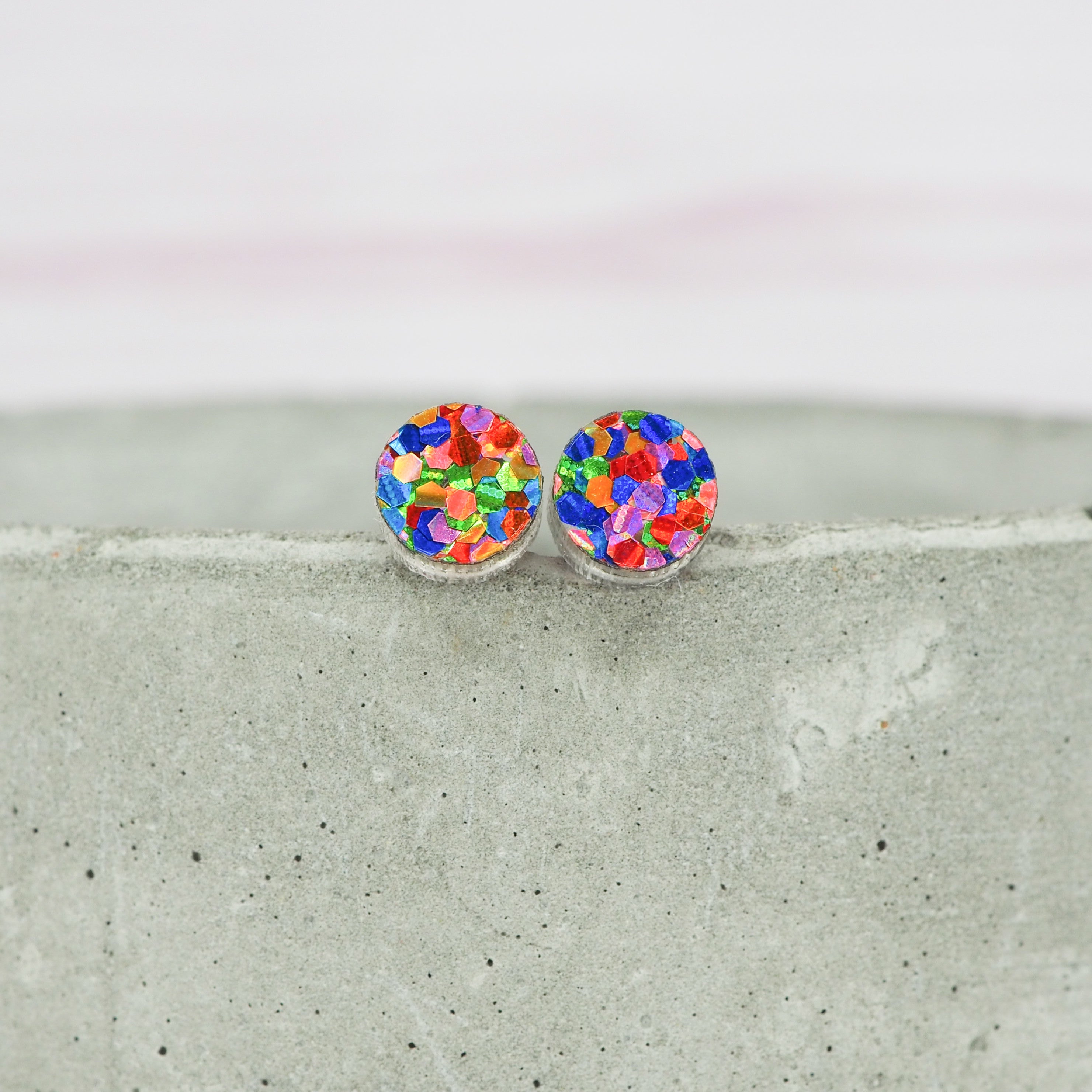 Mixed glitter acrylic dot studs with 0.7mm ear stems.