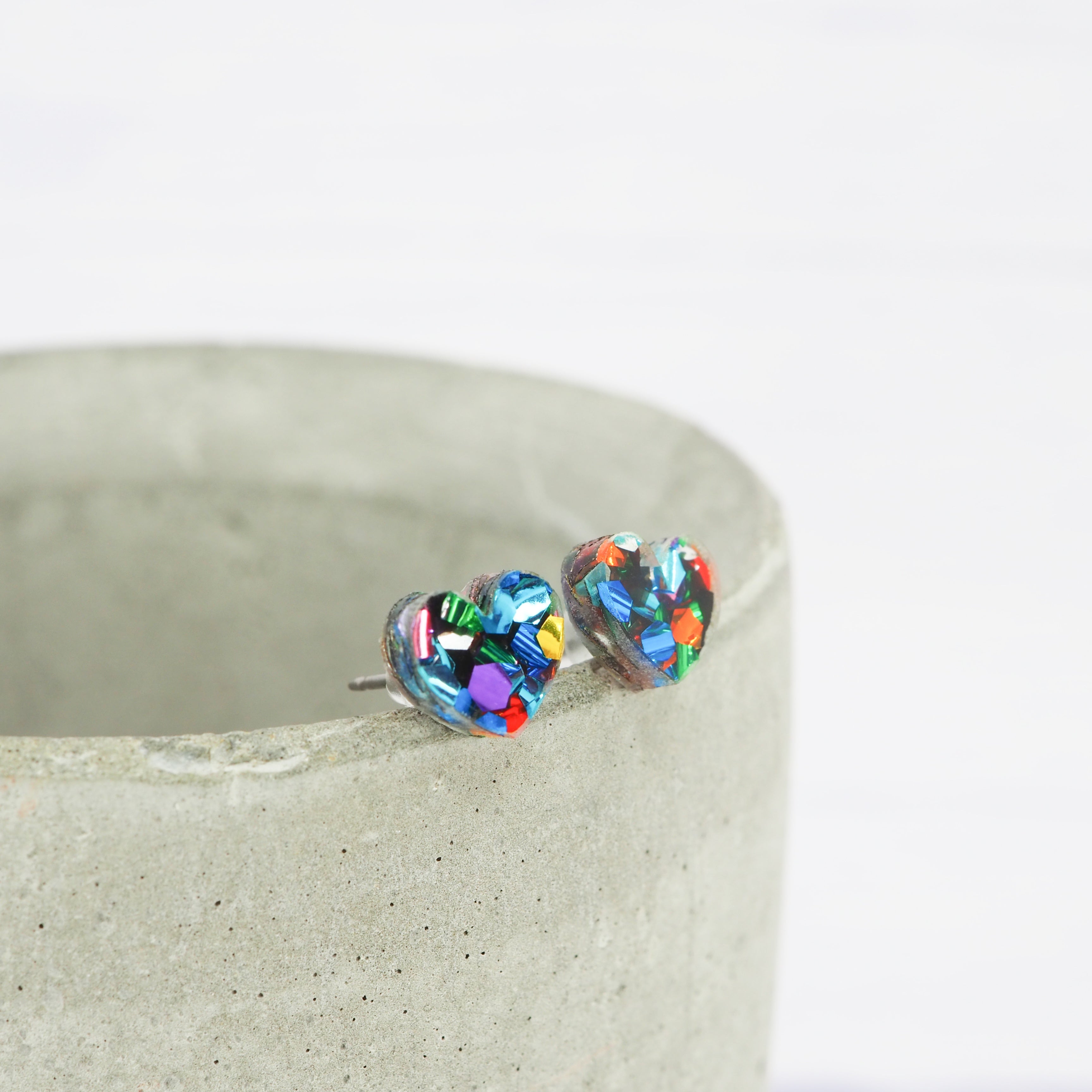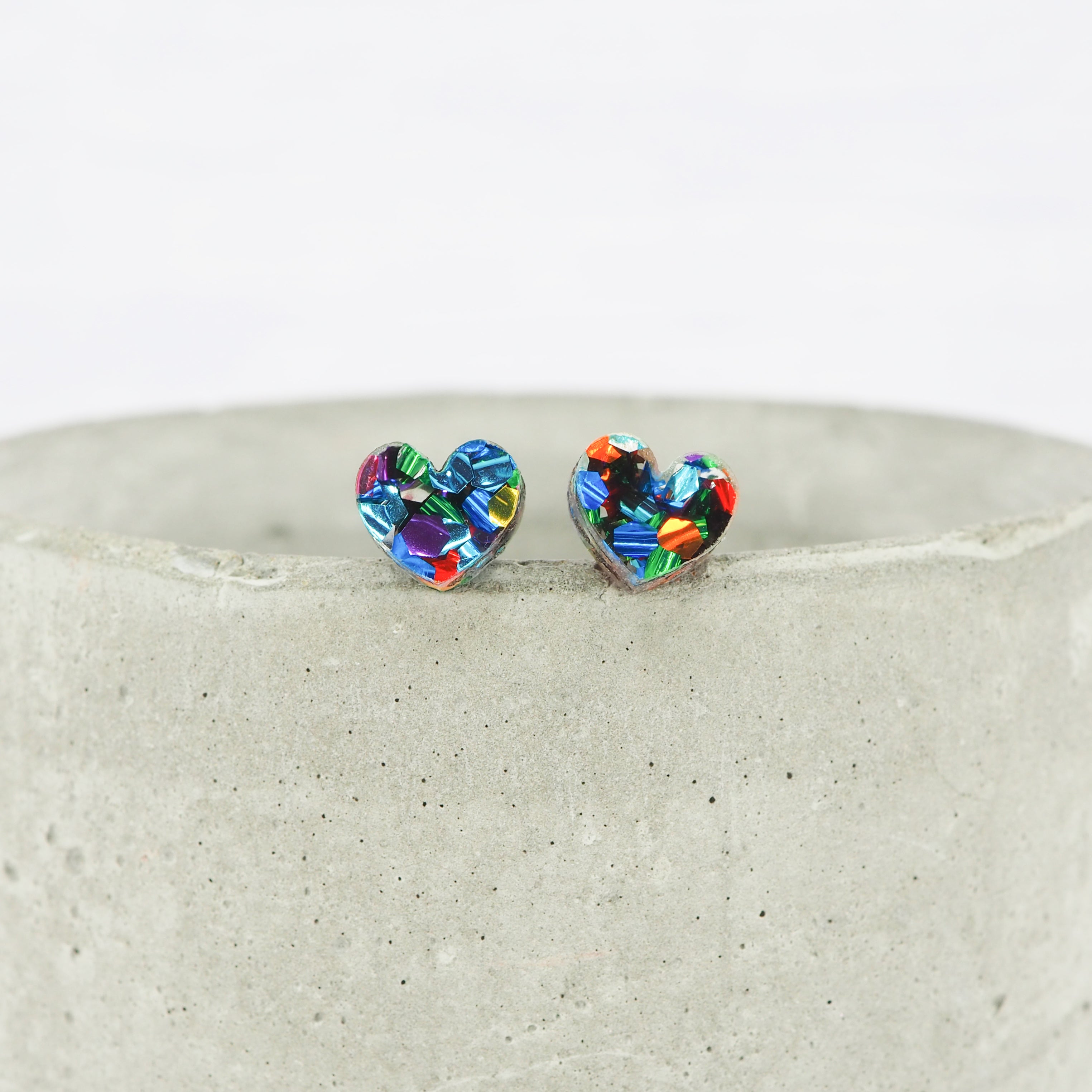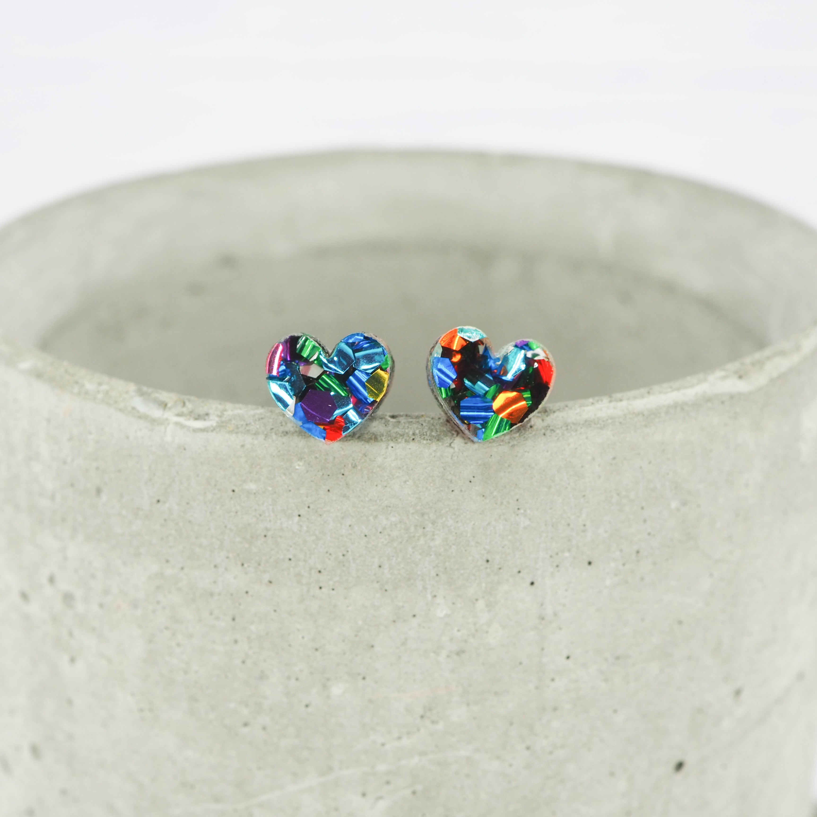 Chunky mixed glitter small heart acrylic studs with 0.7mm ear stems.