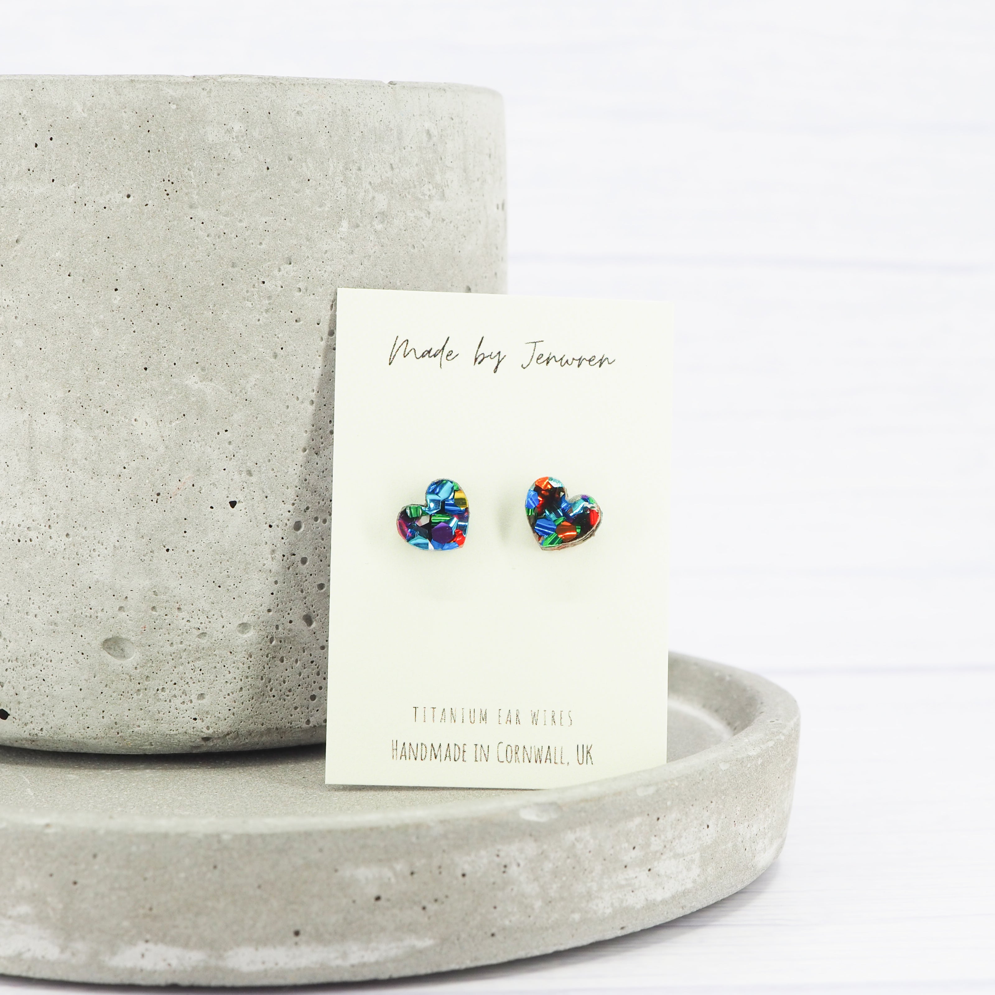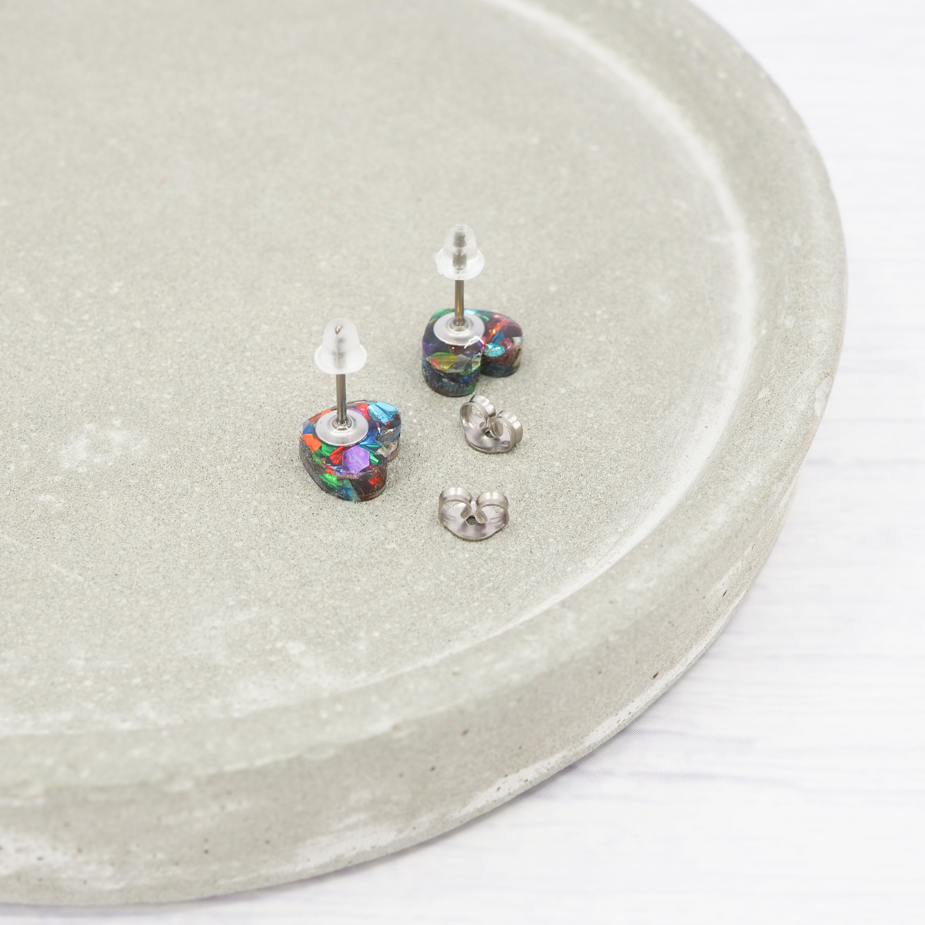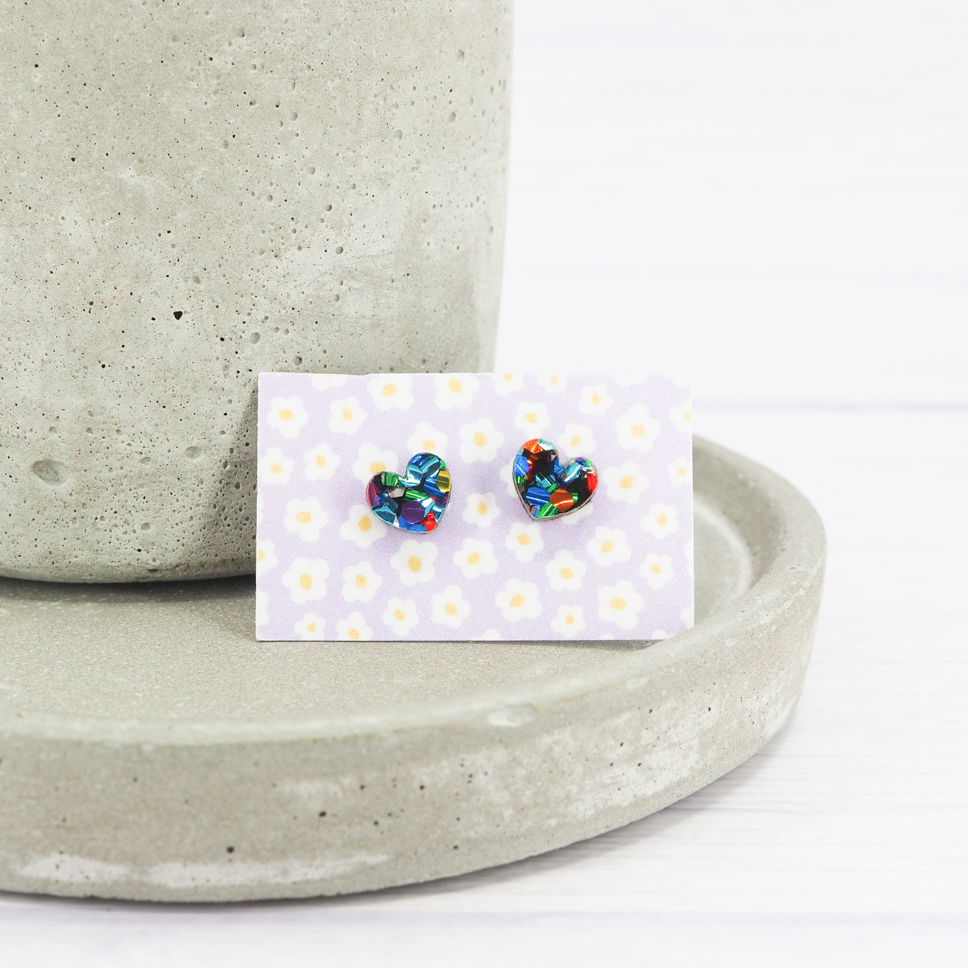 Chunky mixed glitter small heart acrylic studs with 0.7mm ear stems.
