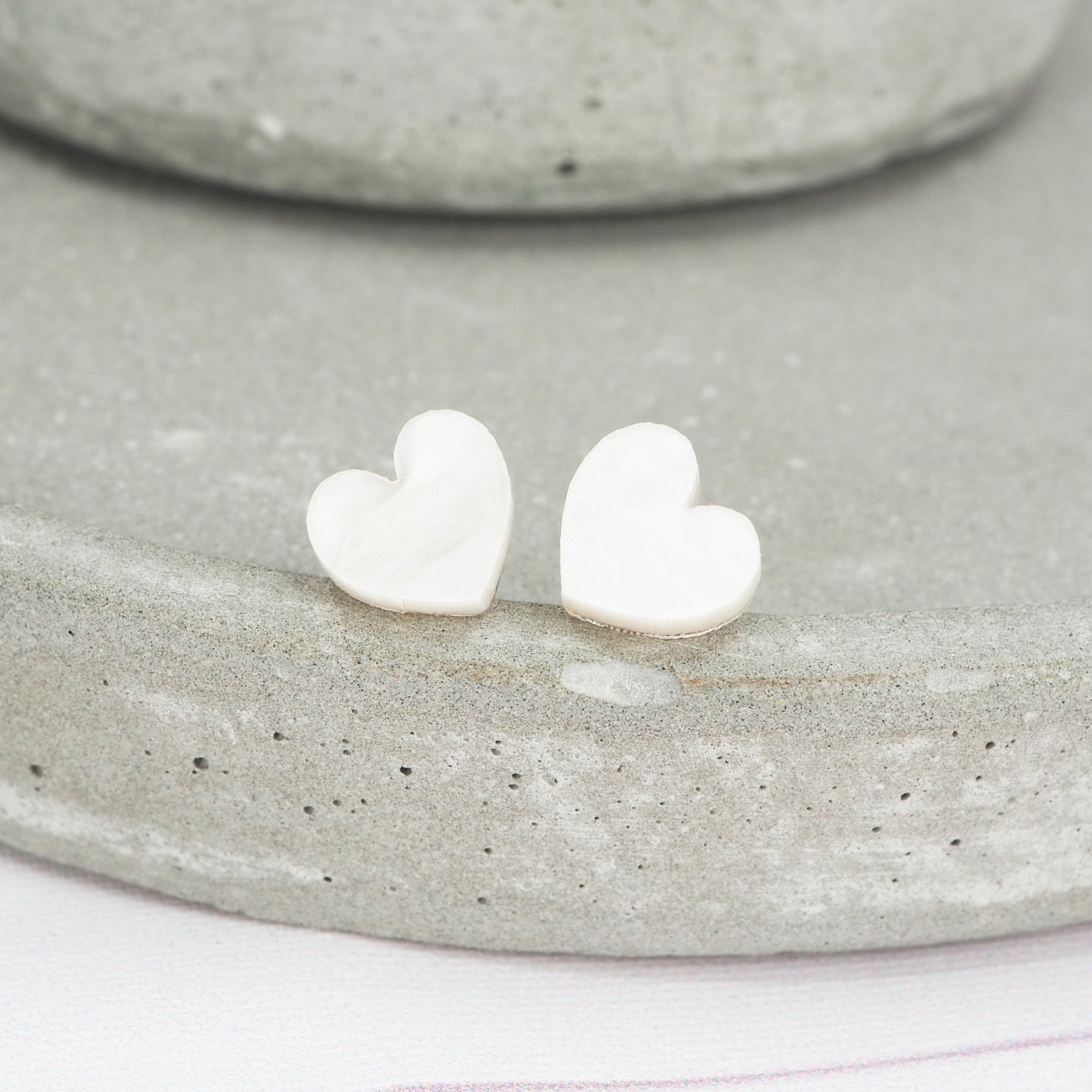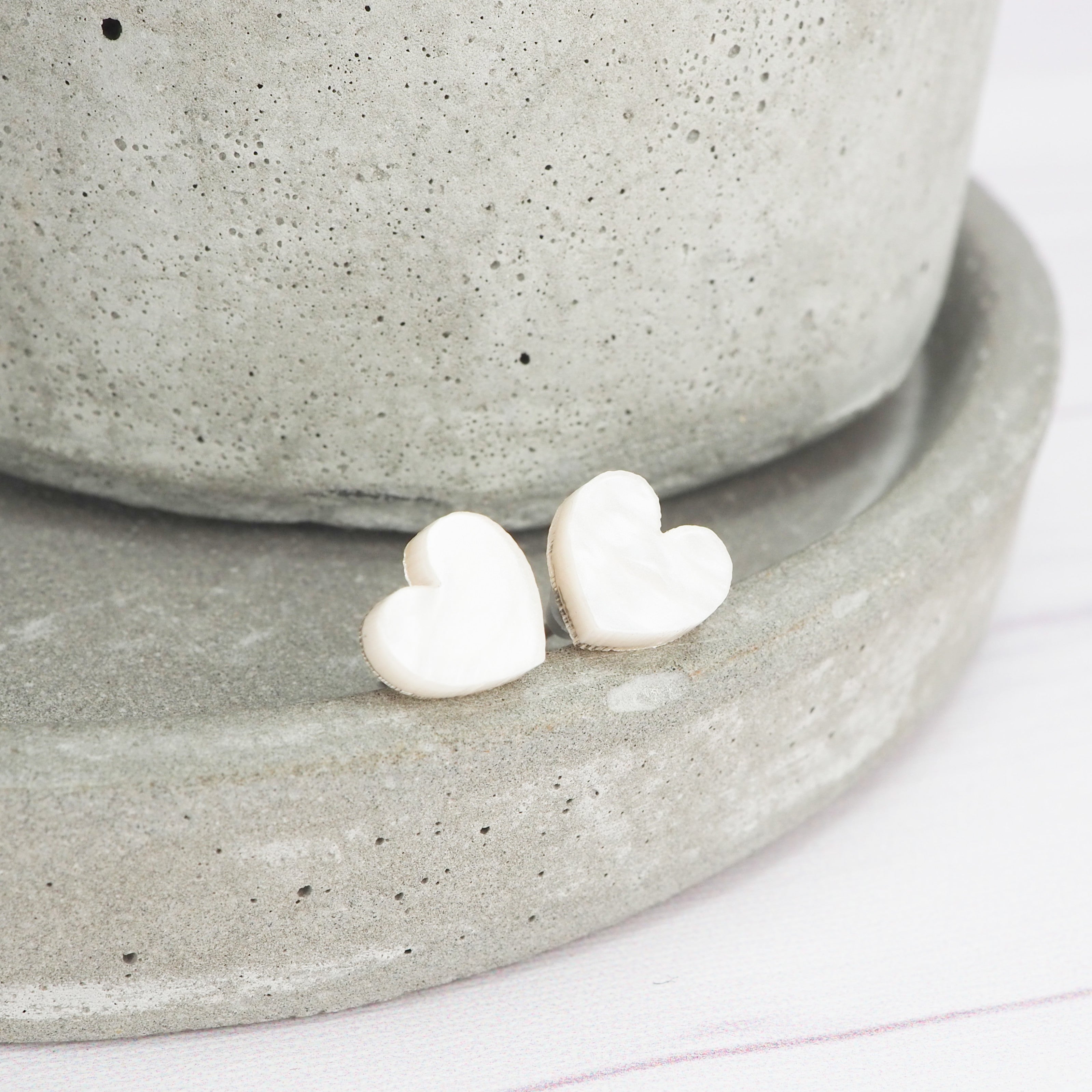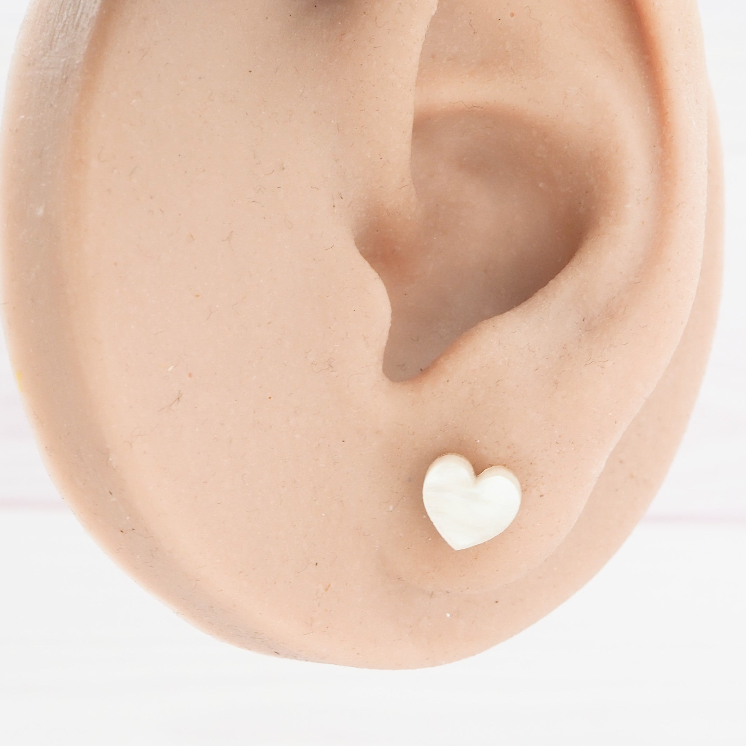 Creamy white pearly small heart acrylic studs with 0.7mm ear stems.