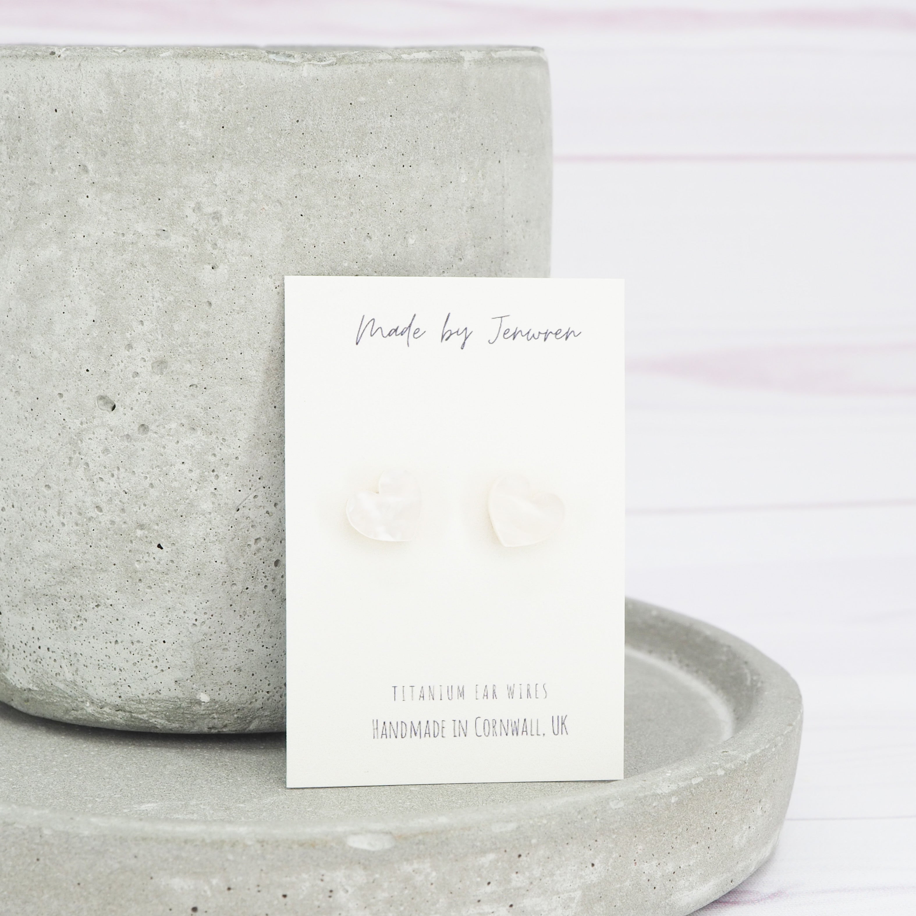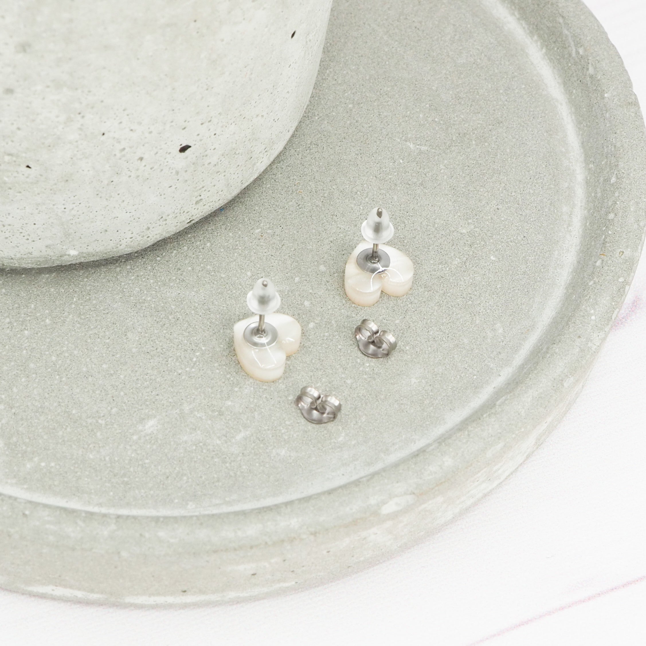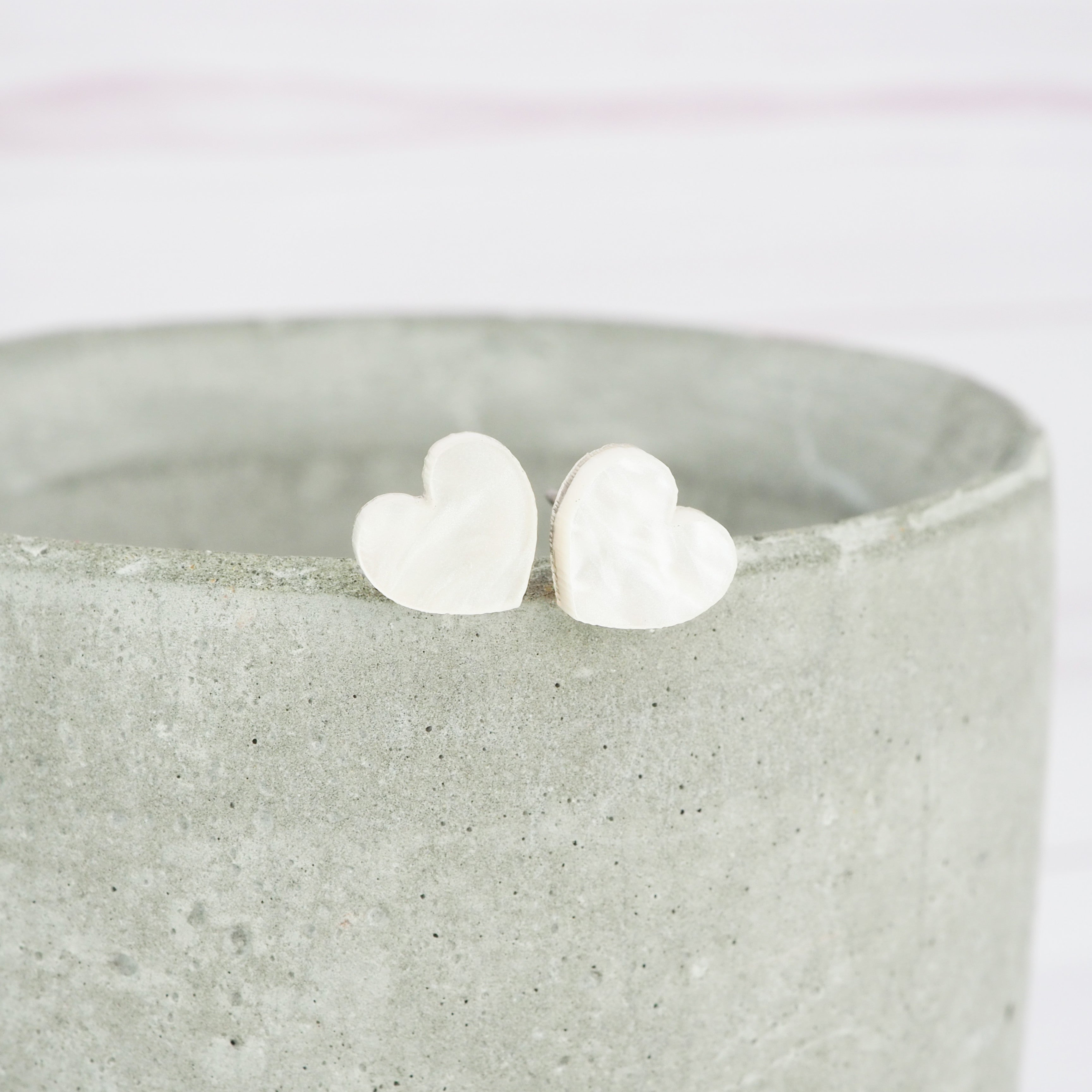 Creamy white pearly small heart acrylic studs with 0.7mm ear stems.