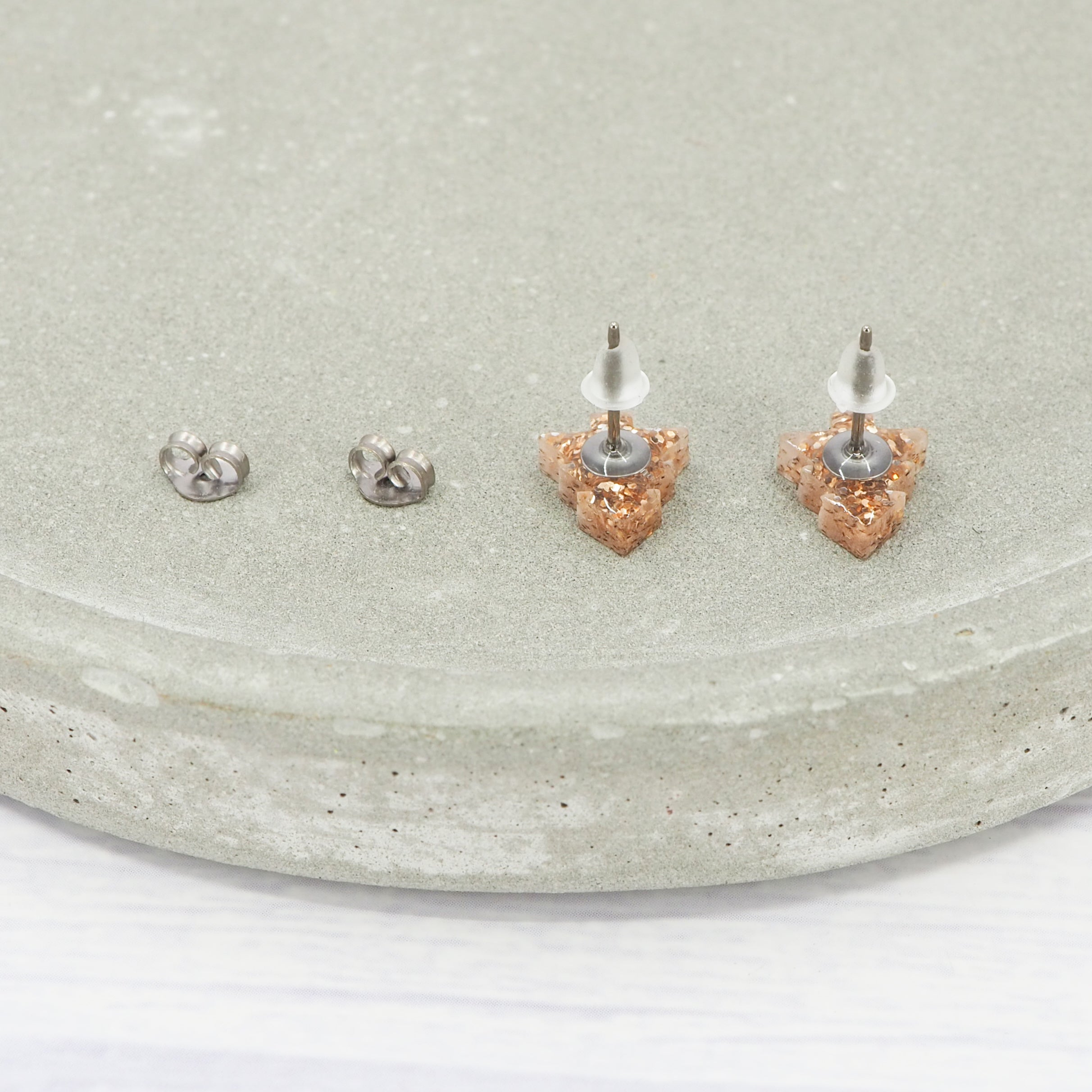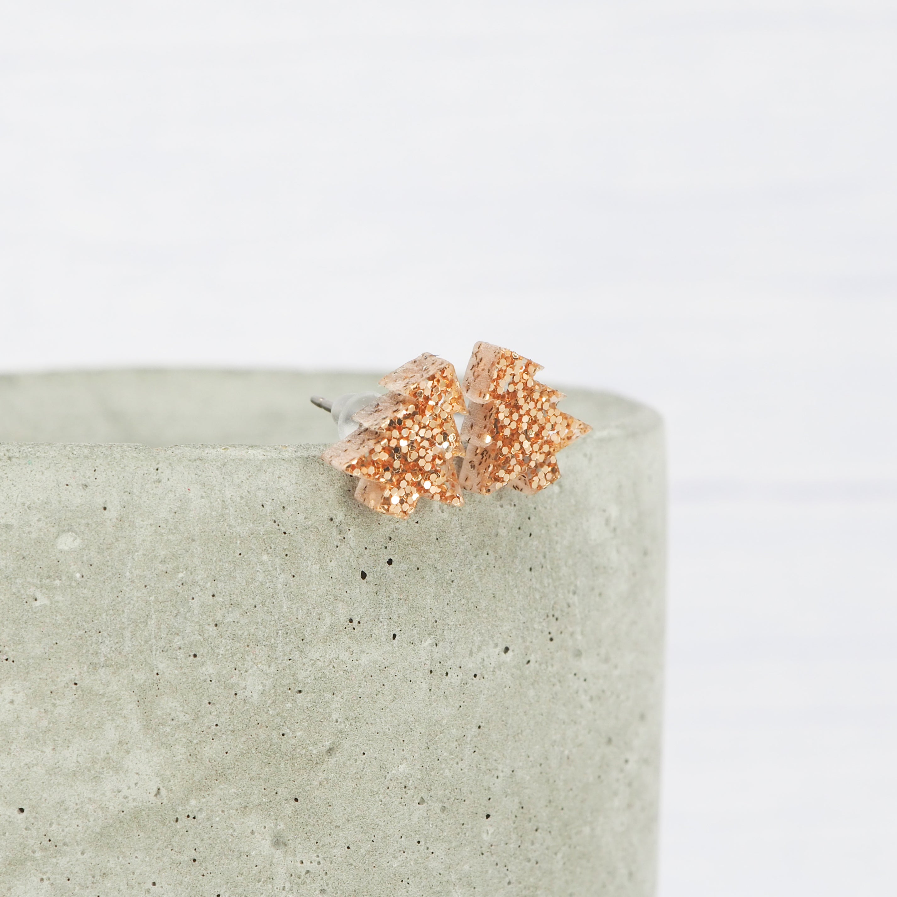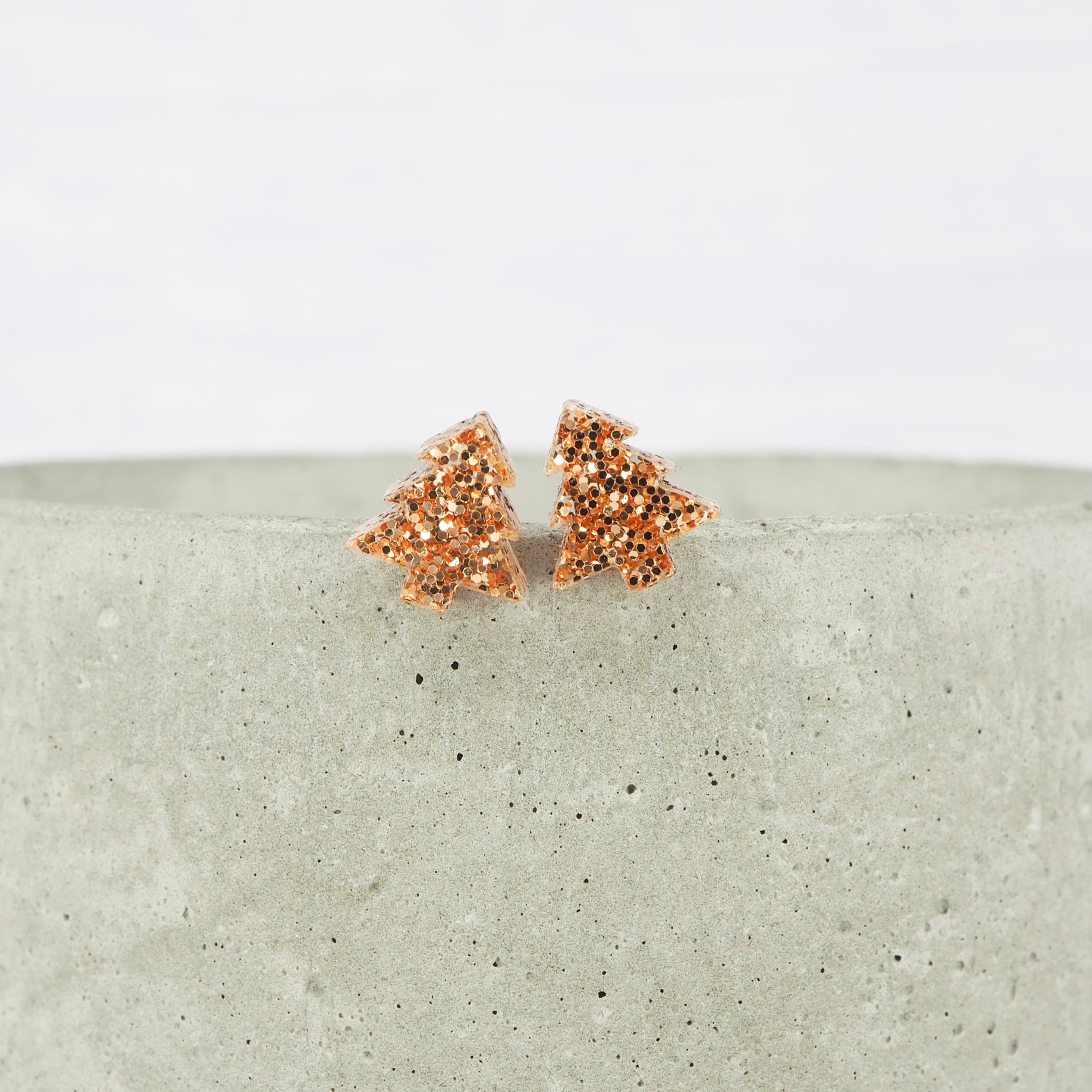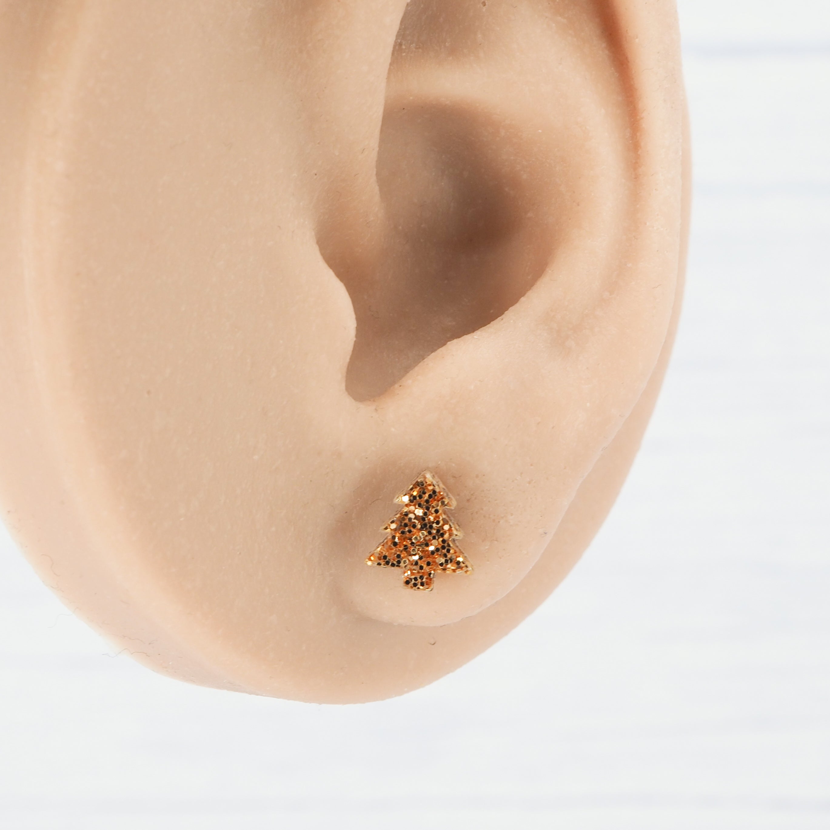 Gold glitter Christmas tree studs with 0.7mm ear stems.