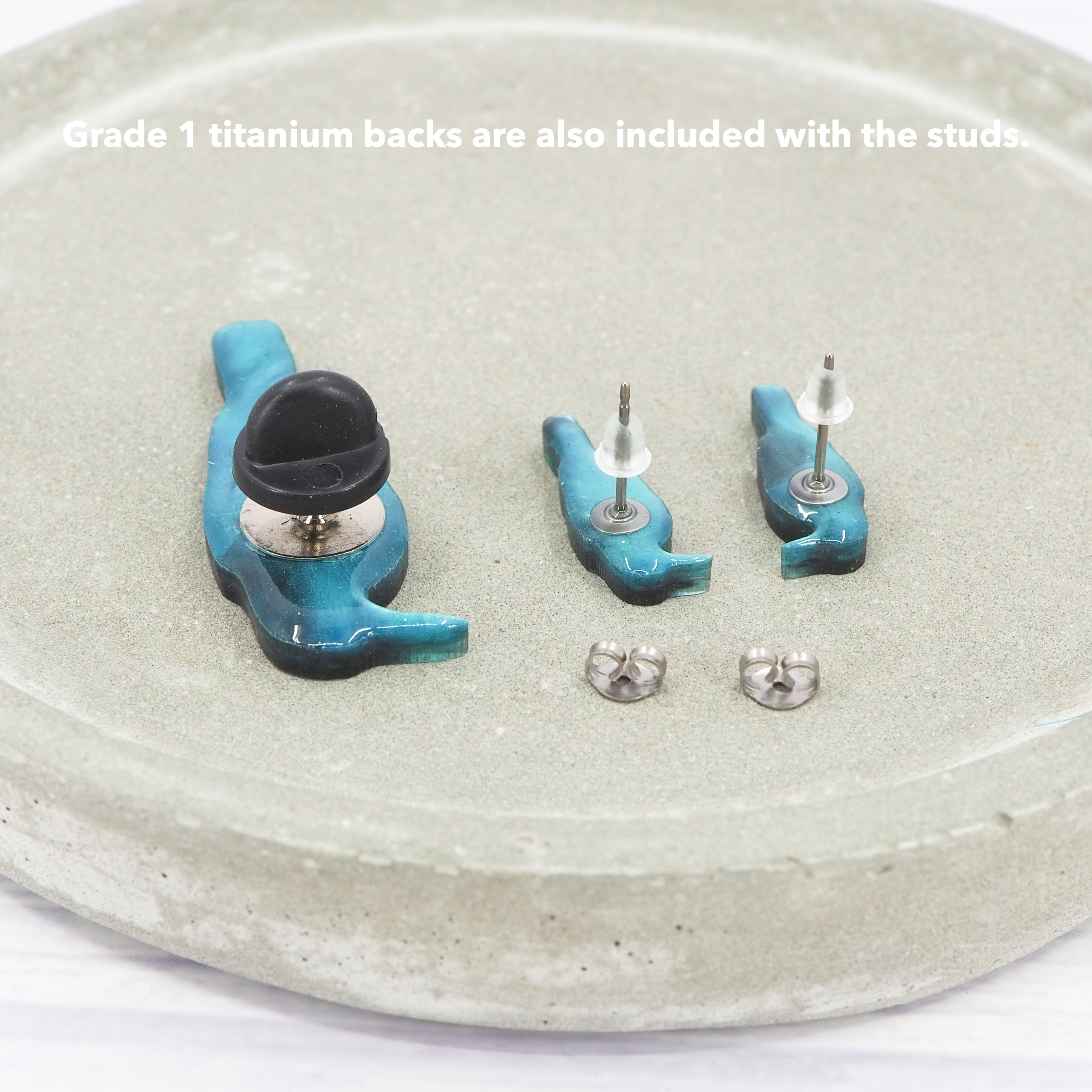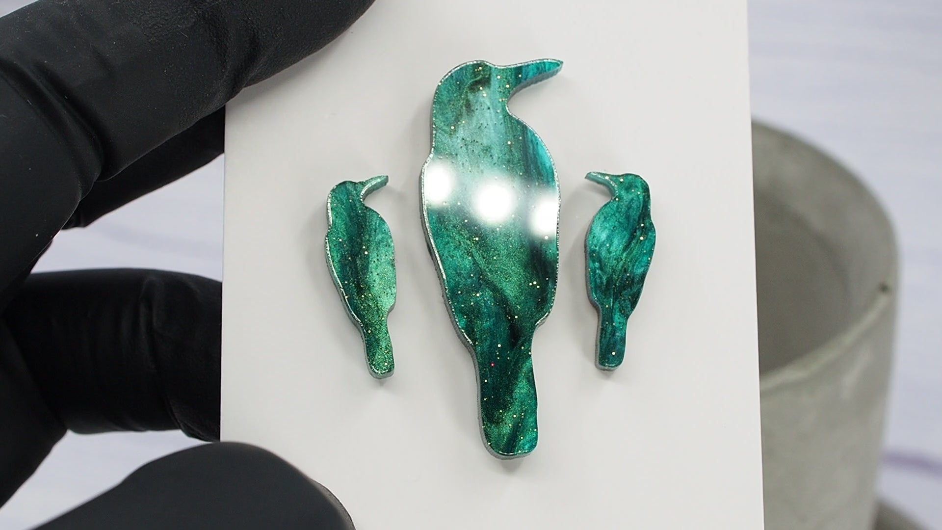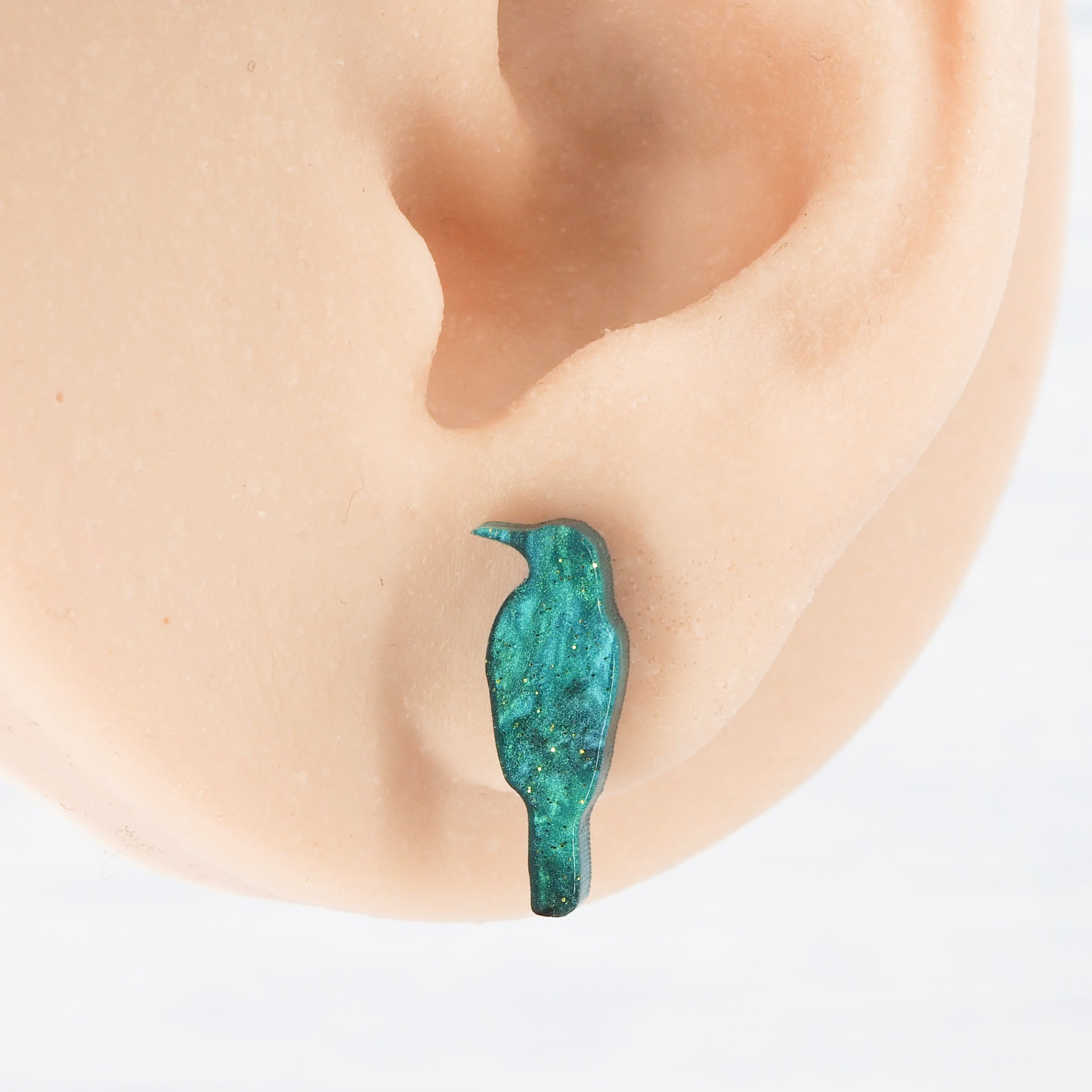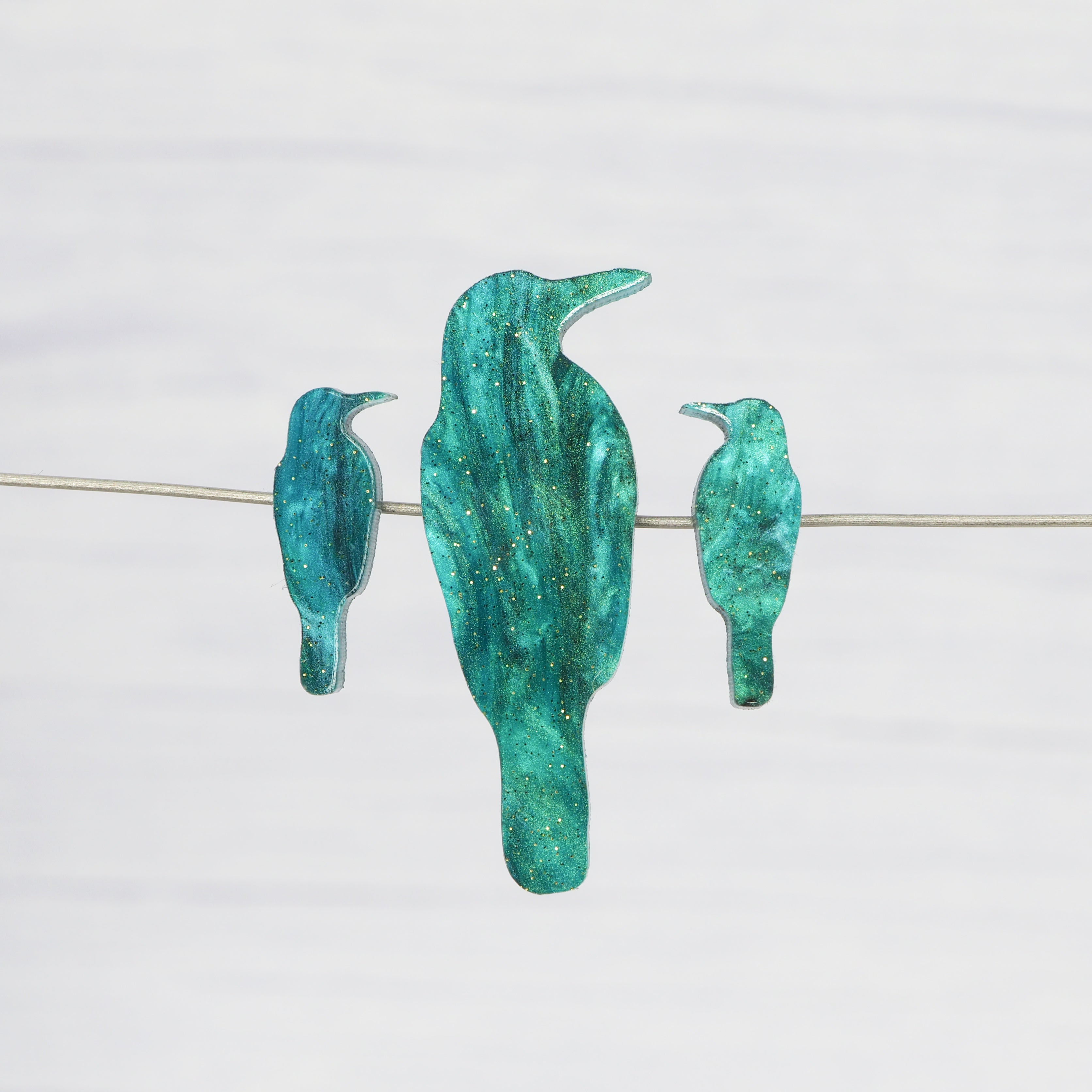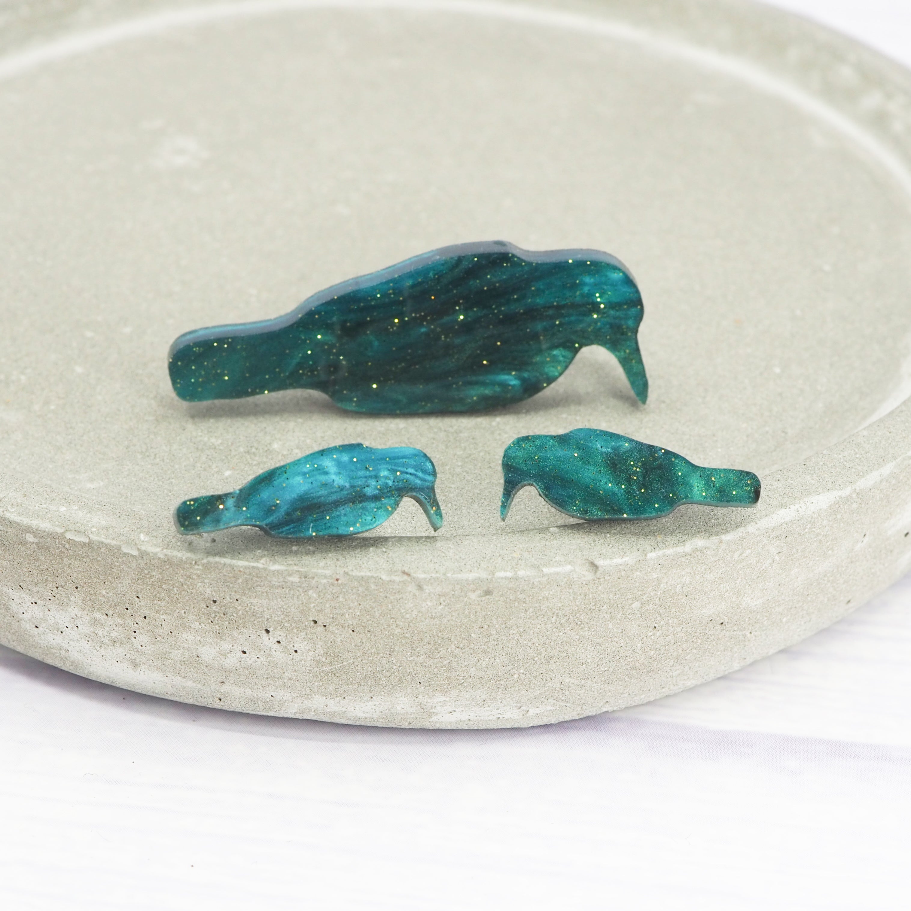 Green galaxy lustre bird stud earrings and brooch matching set. Studs with Grade 1 titanium 0.7mm ear stems and backs.