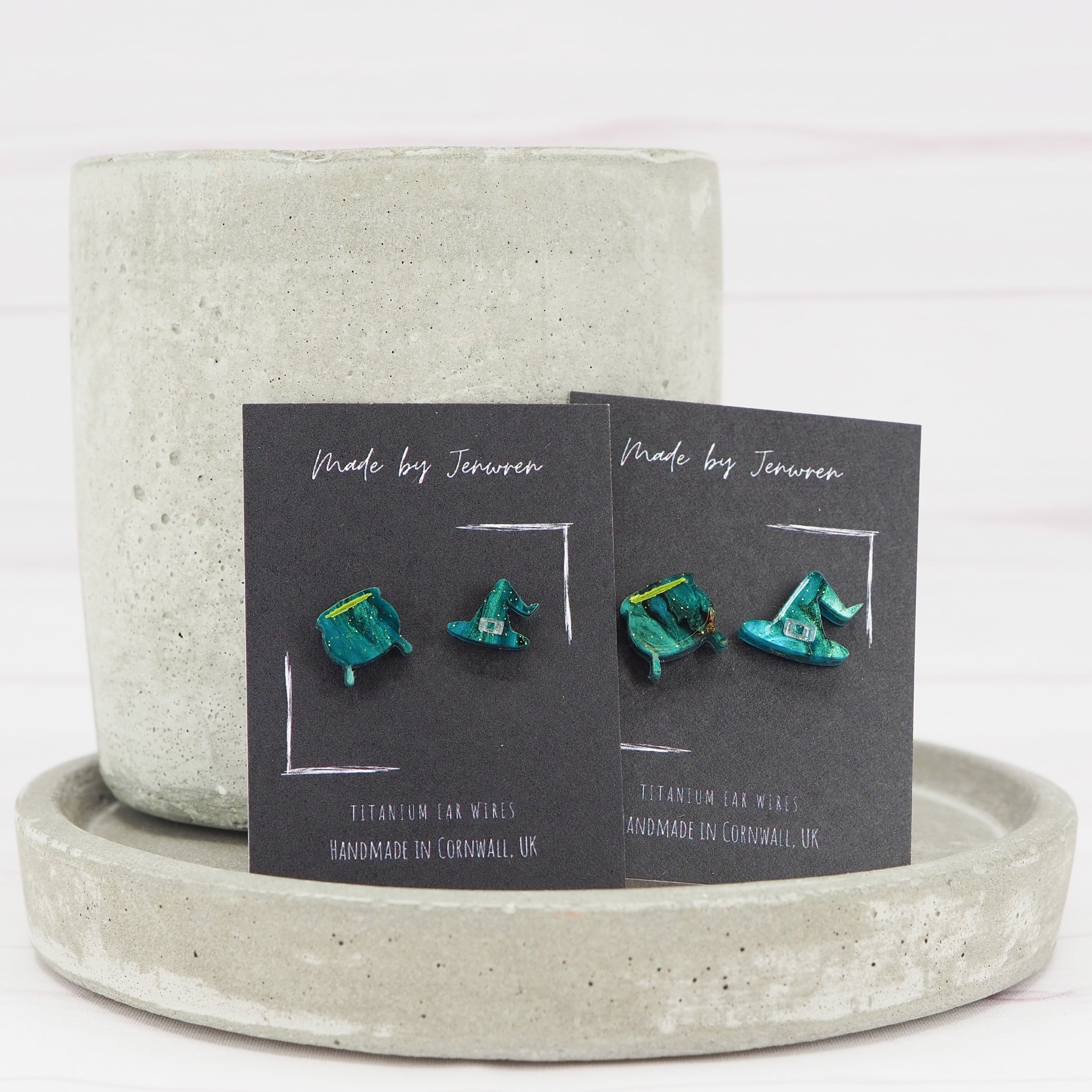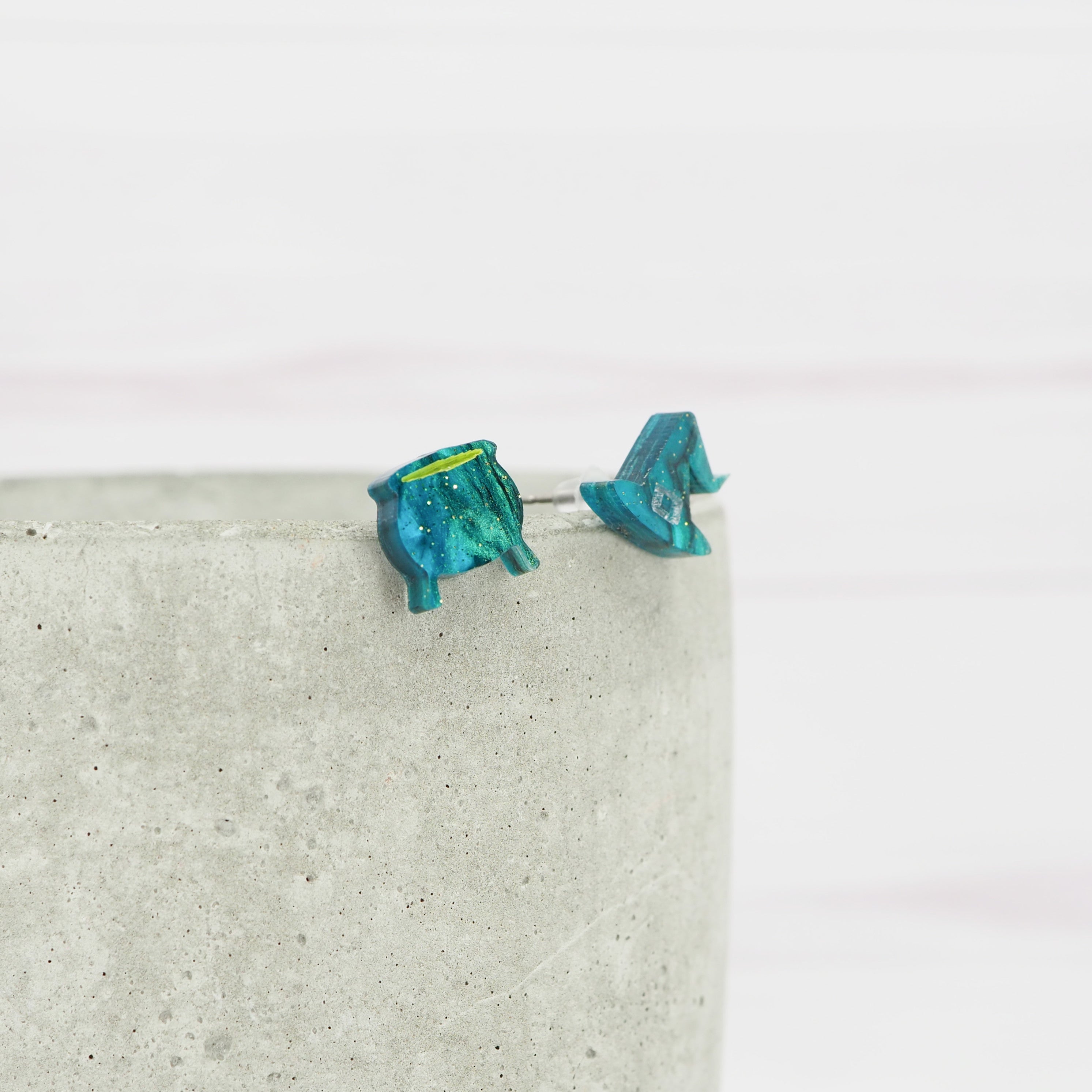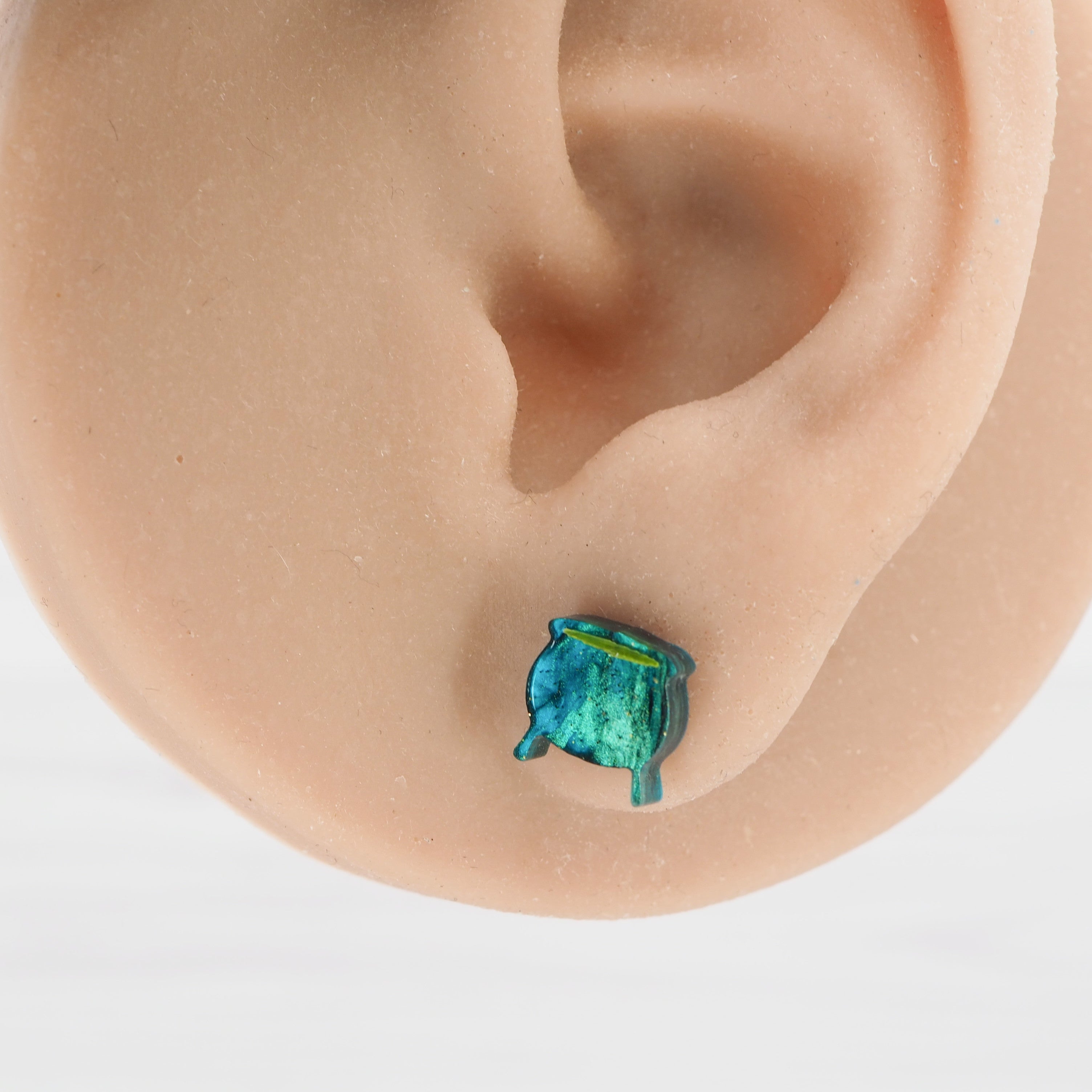 Green galaxy witches hat and cauldron studs with 0.7mm Grade 1 titanium ear stems.