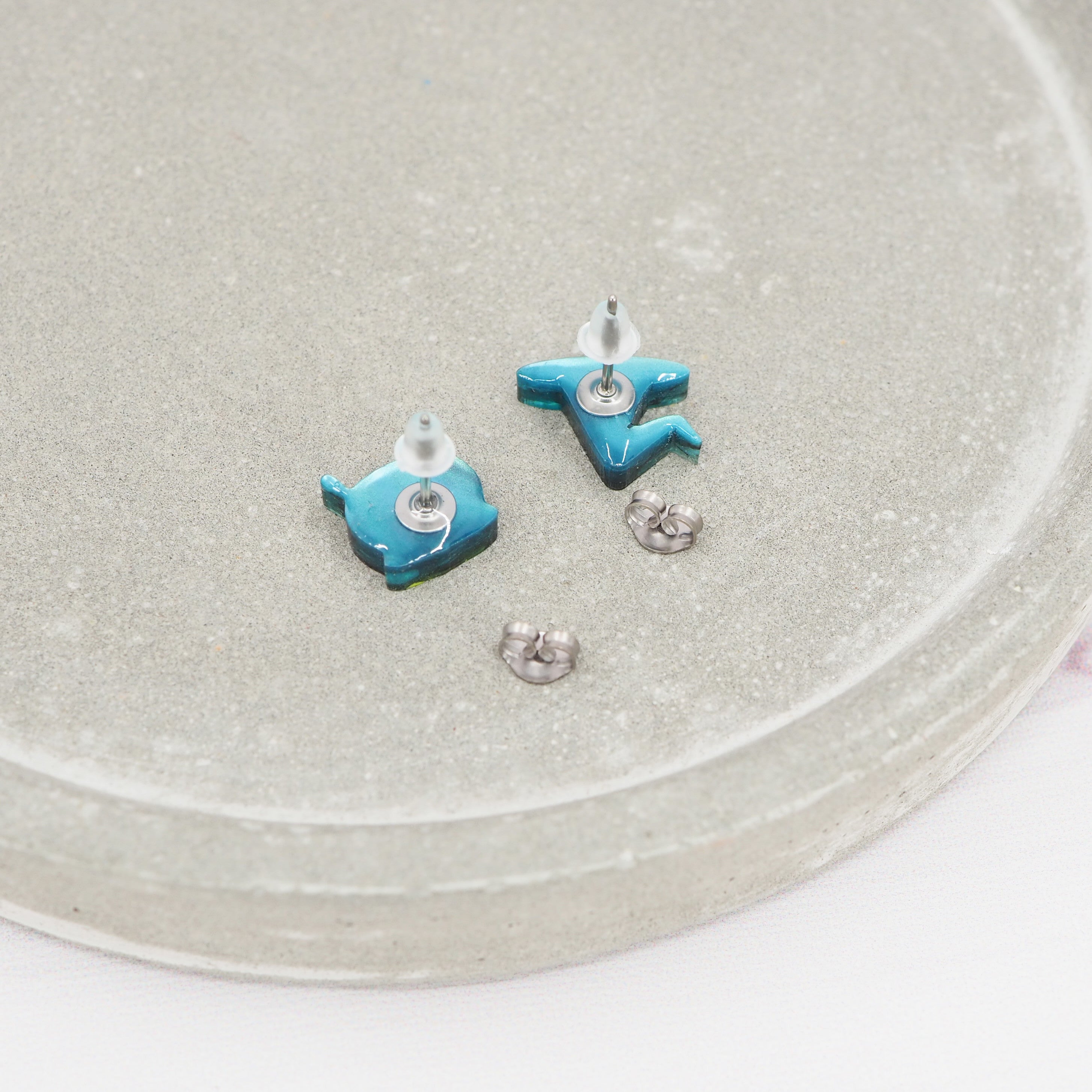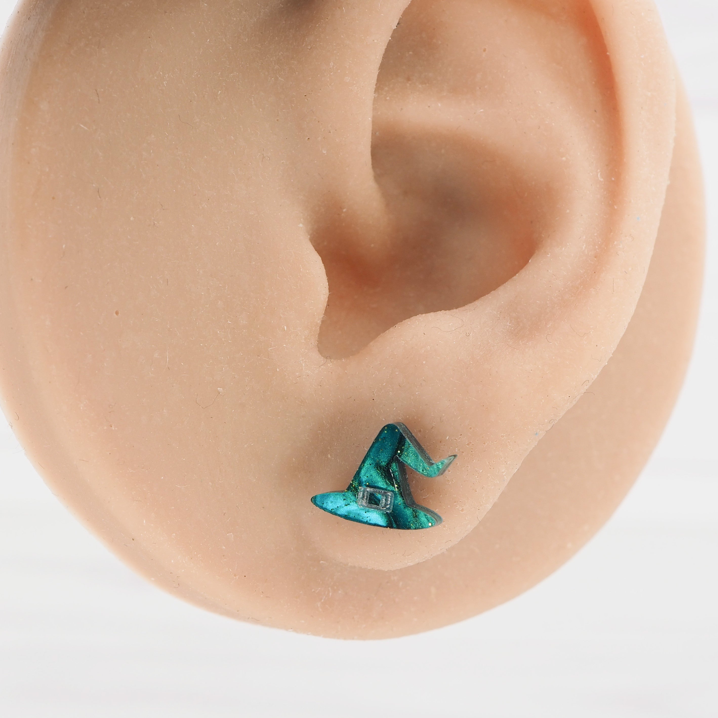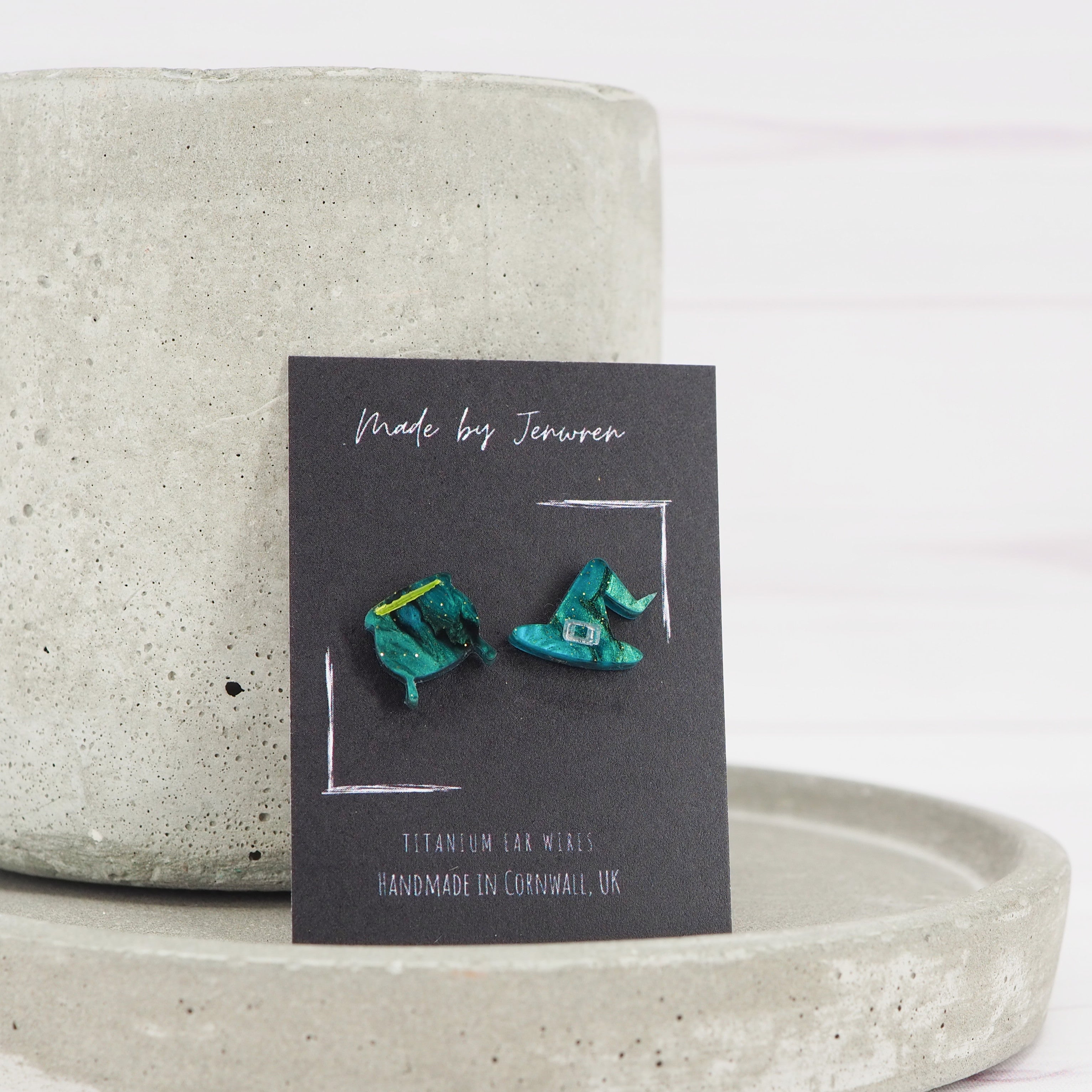 Green galaxy witches hat and cauldron studs with 0.7mm Grade 1 titanium ear stems.