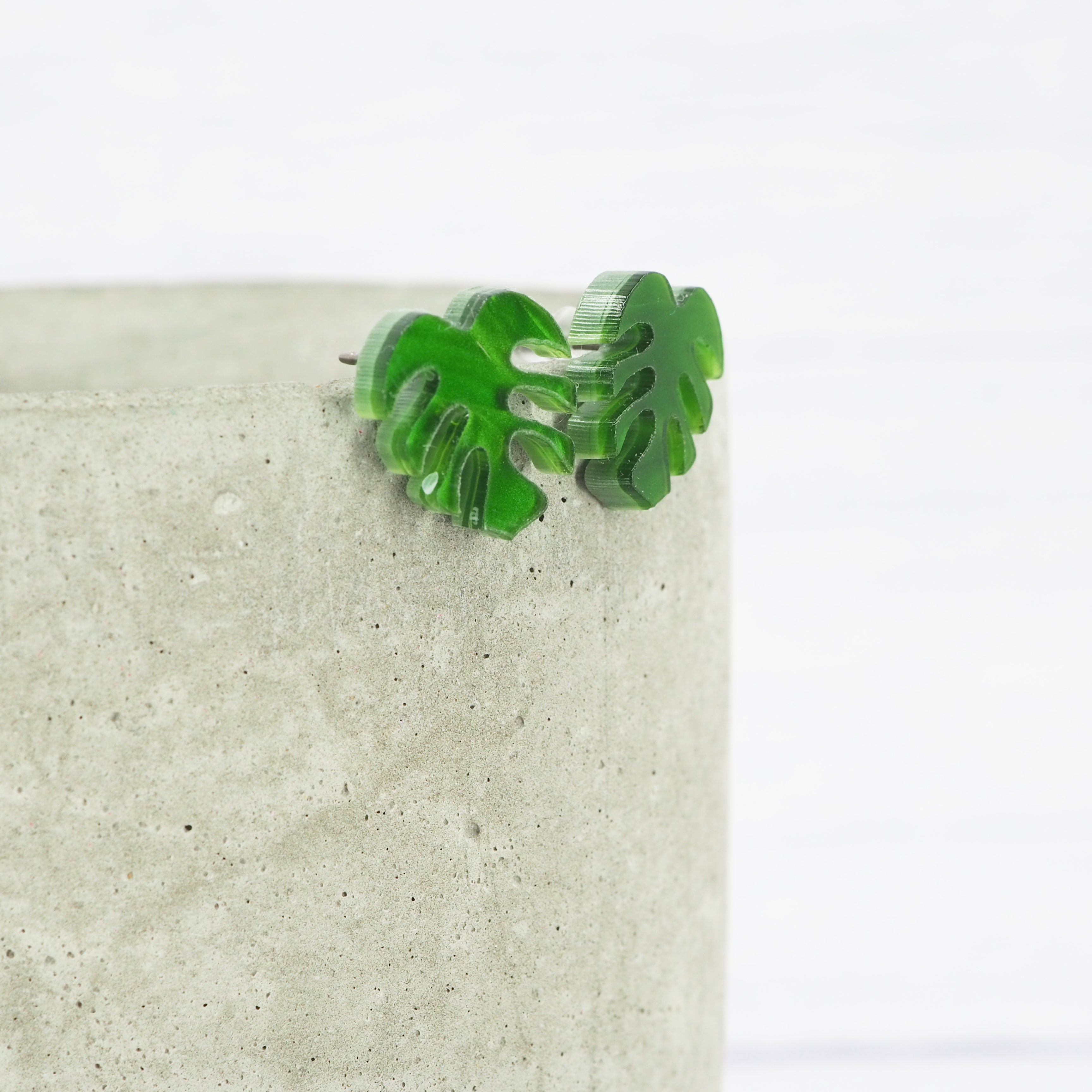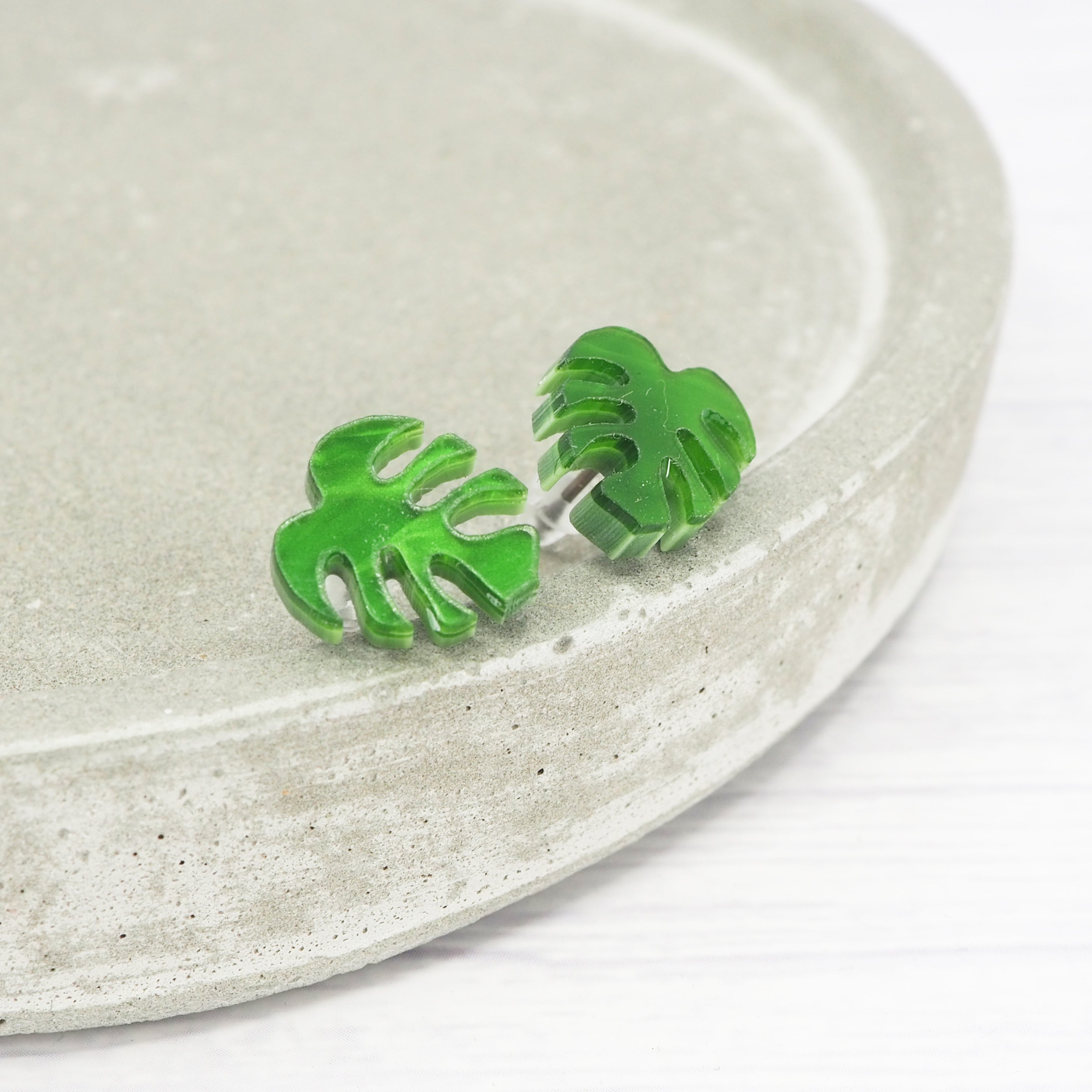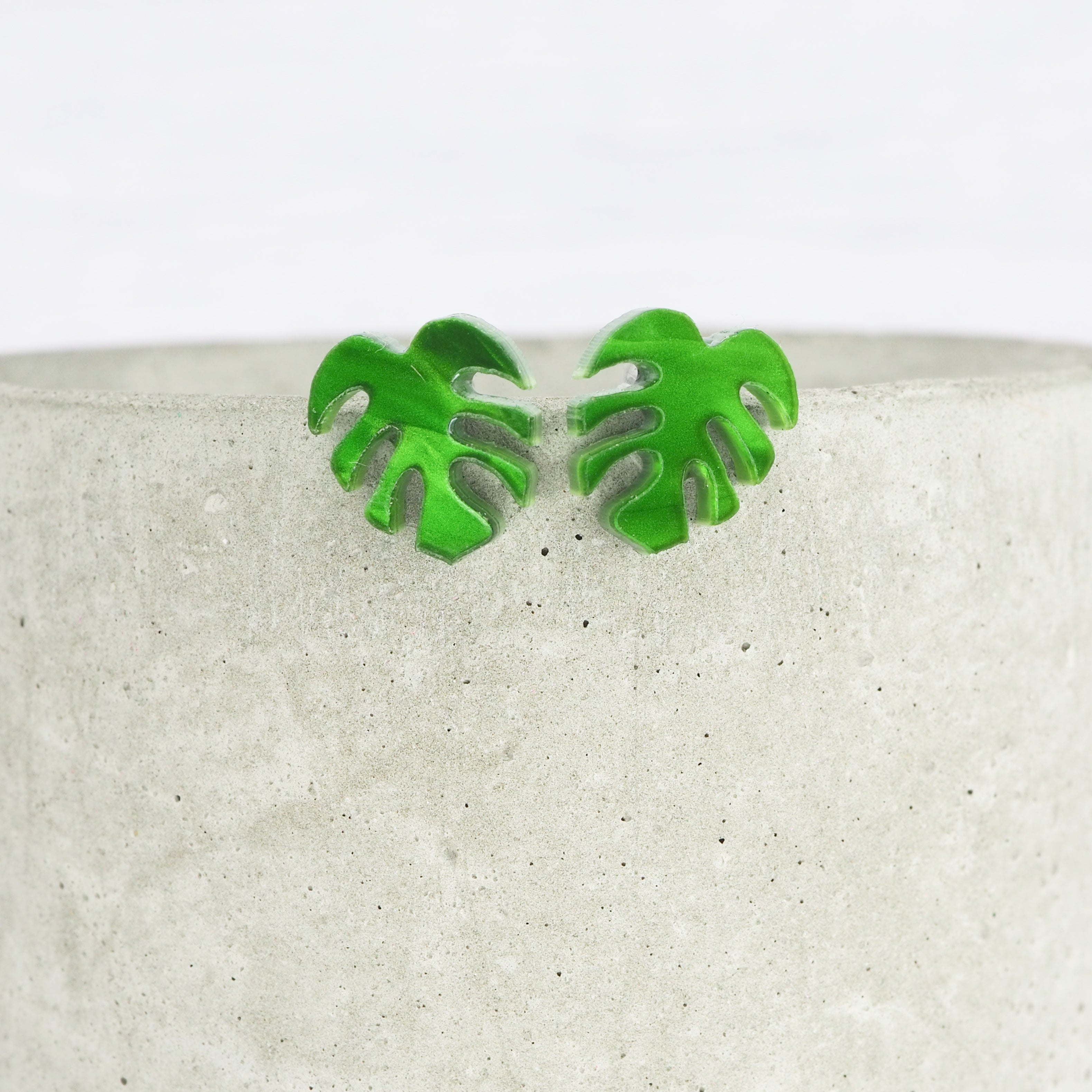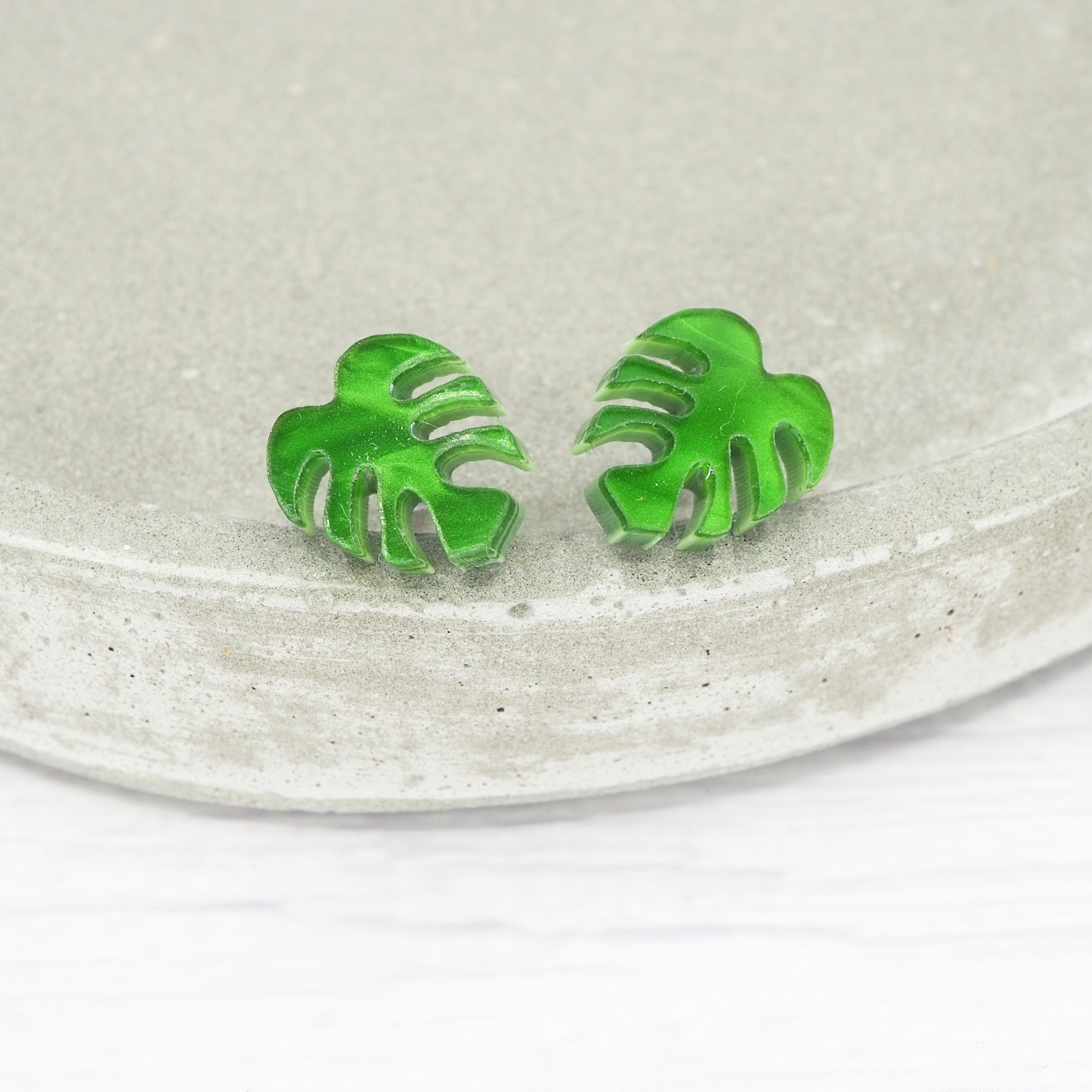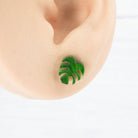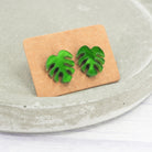 Green pearly acrylic Monstera leaf studs with 0.7mm ear stems.