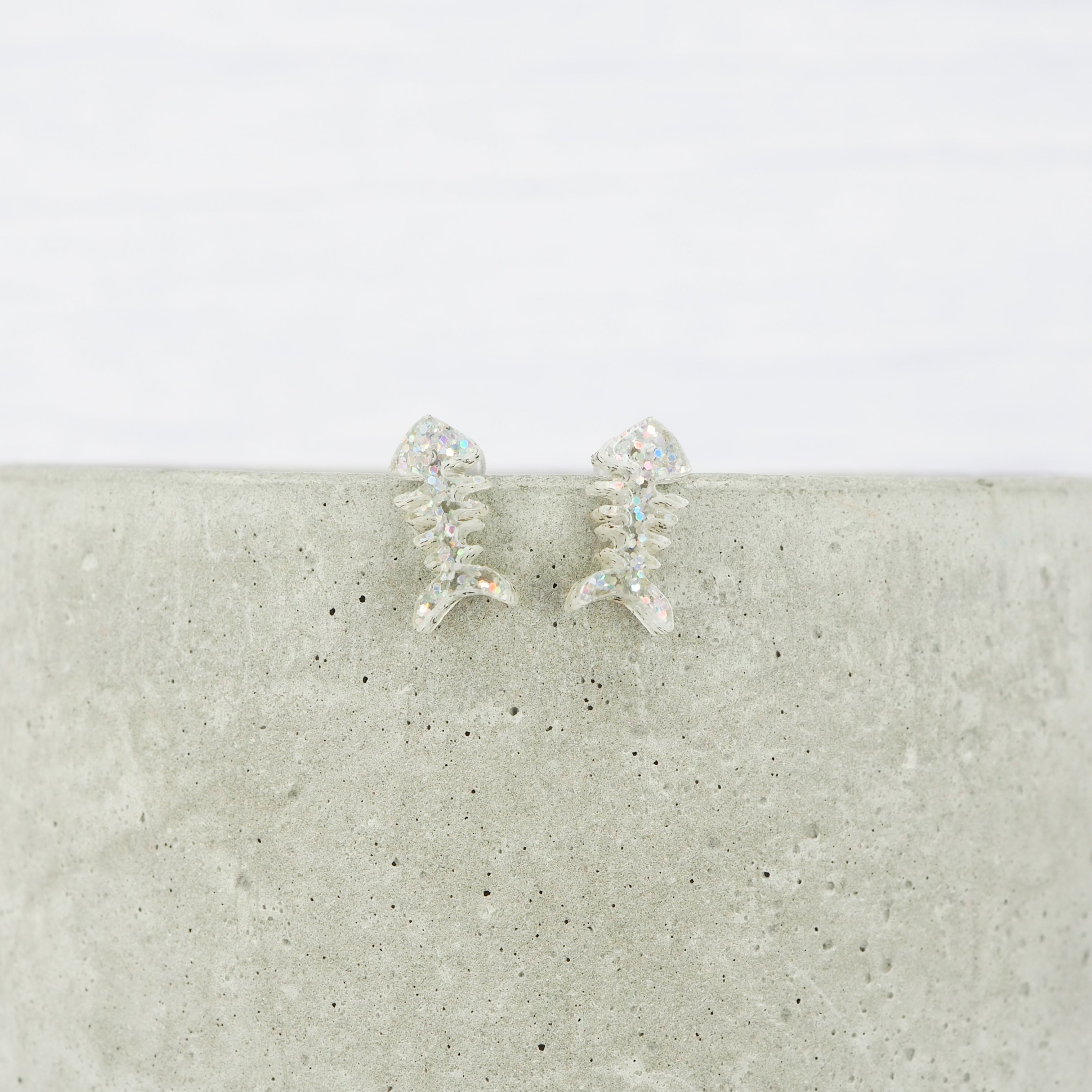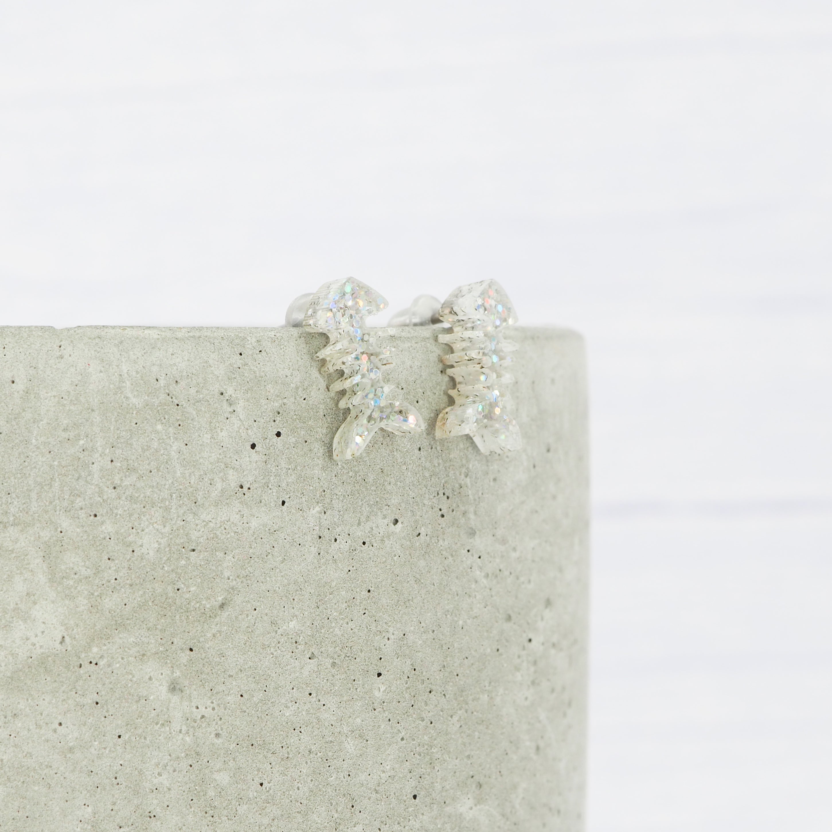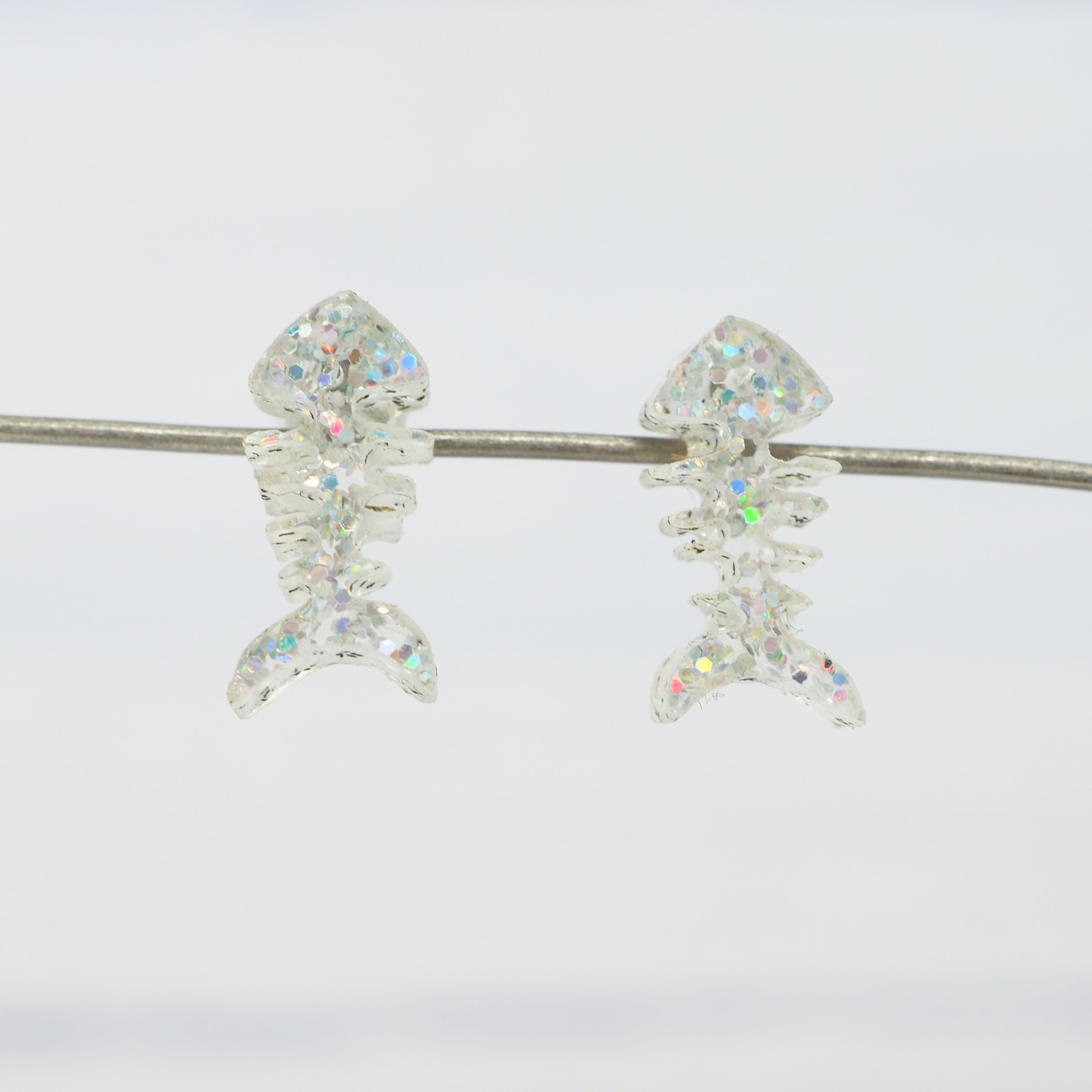 Holographic glitter acrylic fishbone studs with 0.7mm ear stems.