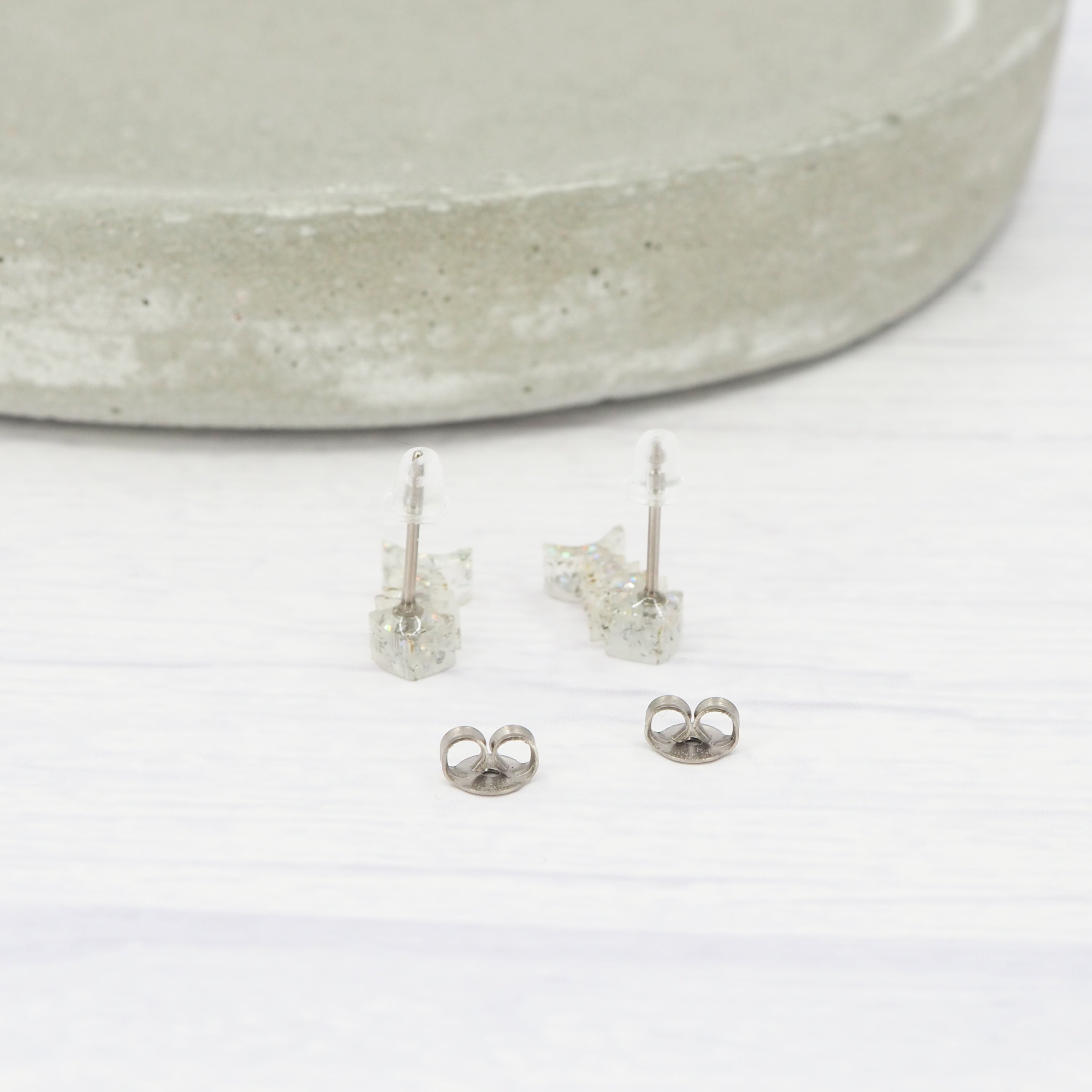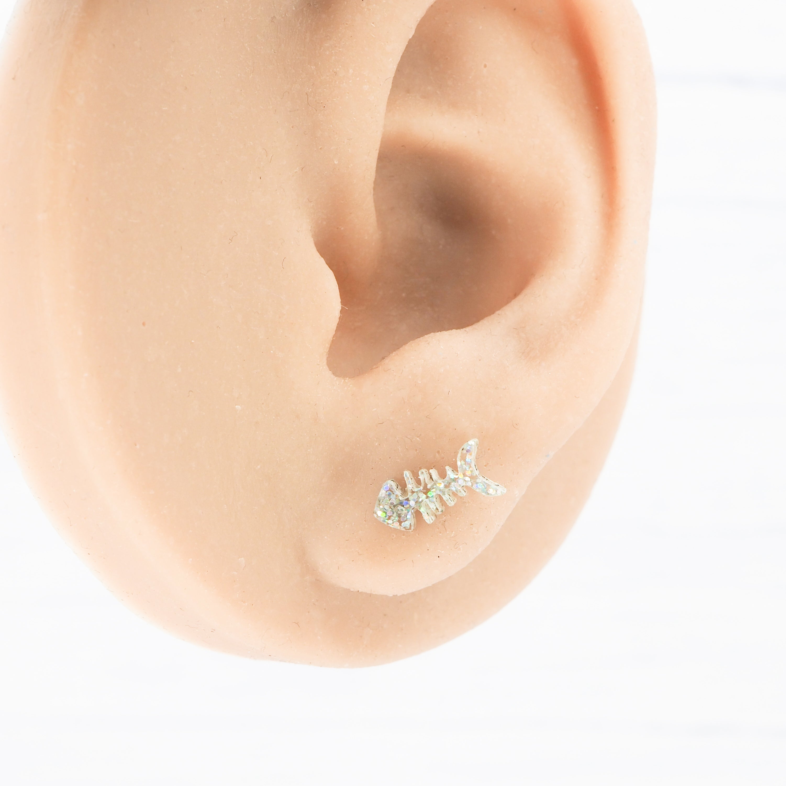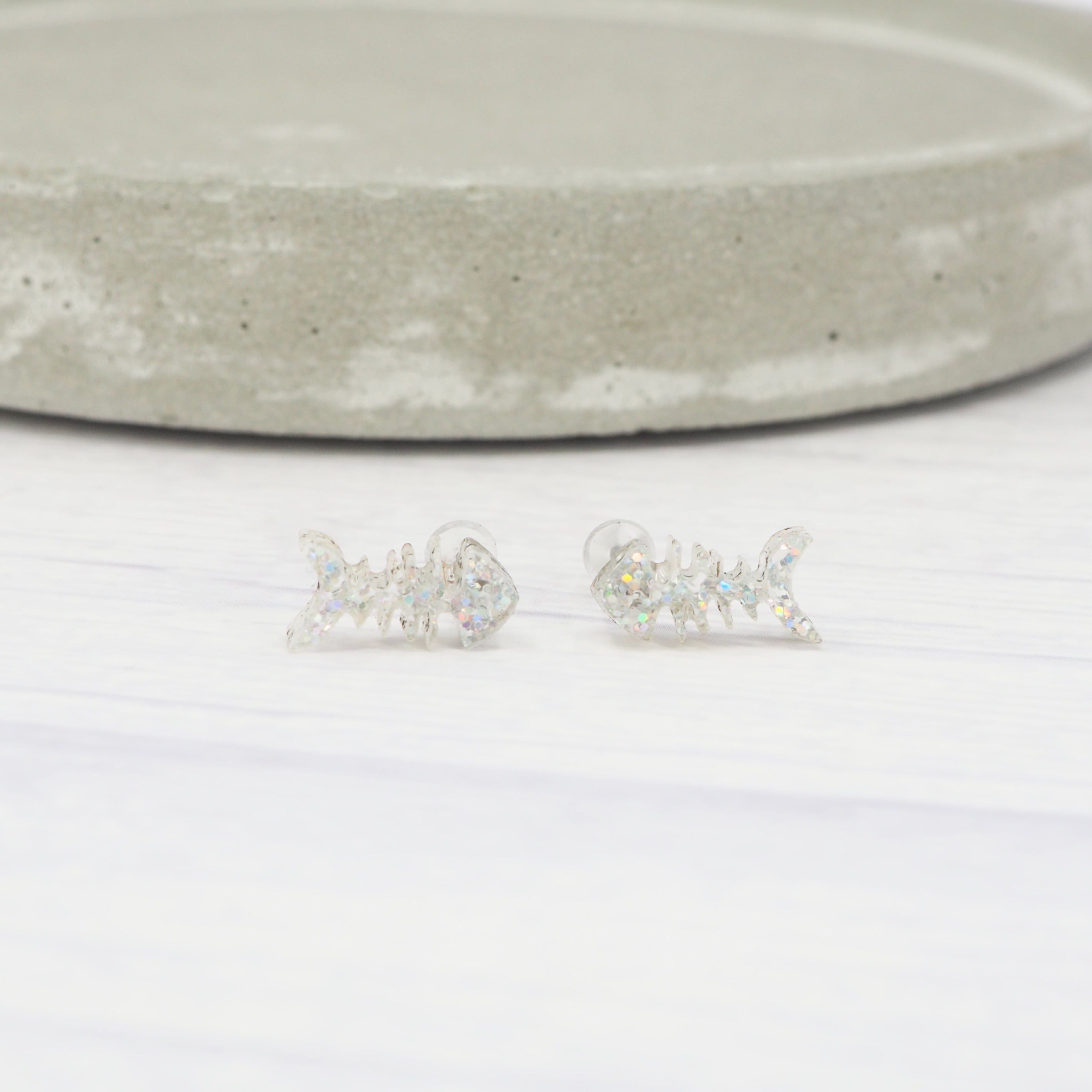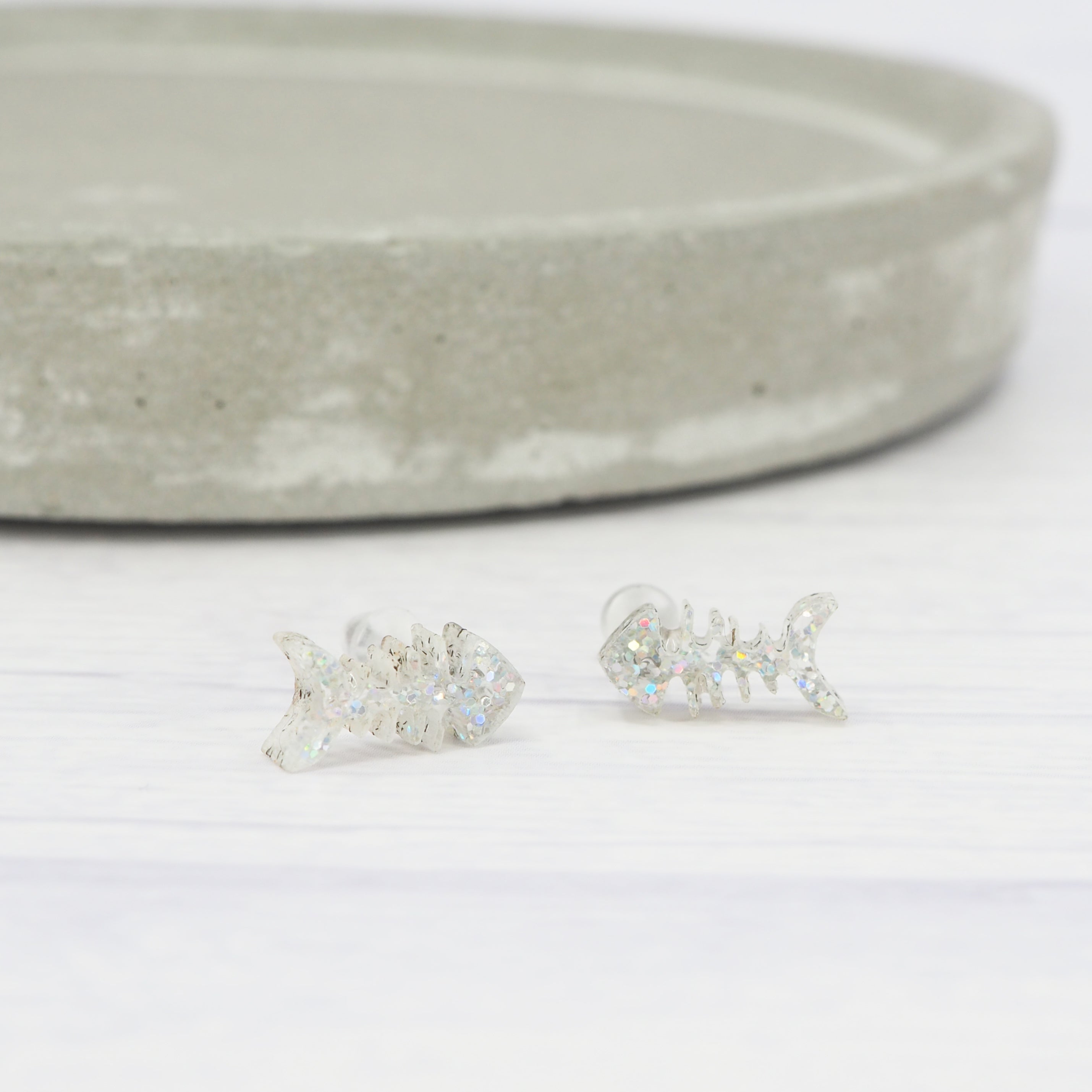 Holographic glitter acrylic fishbone studs with 0.7mm ear stems.